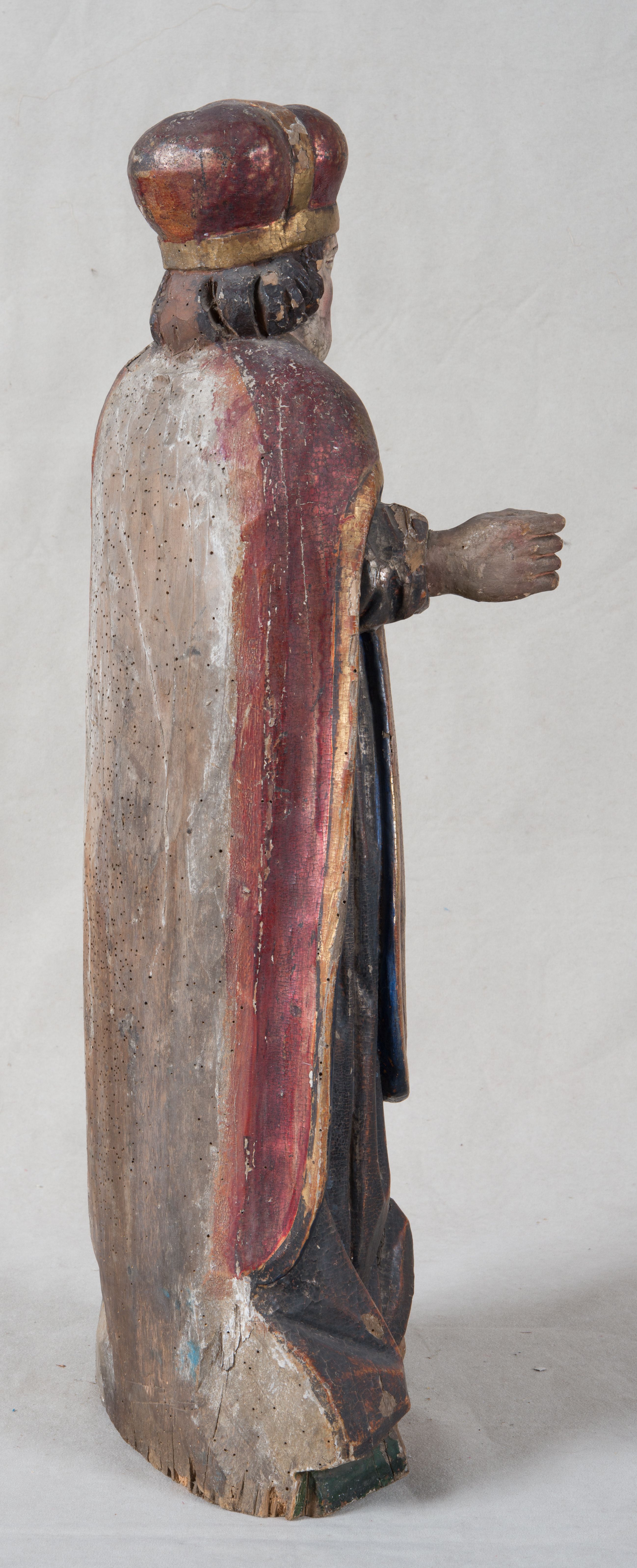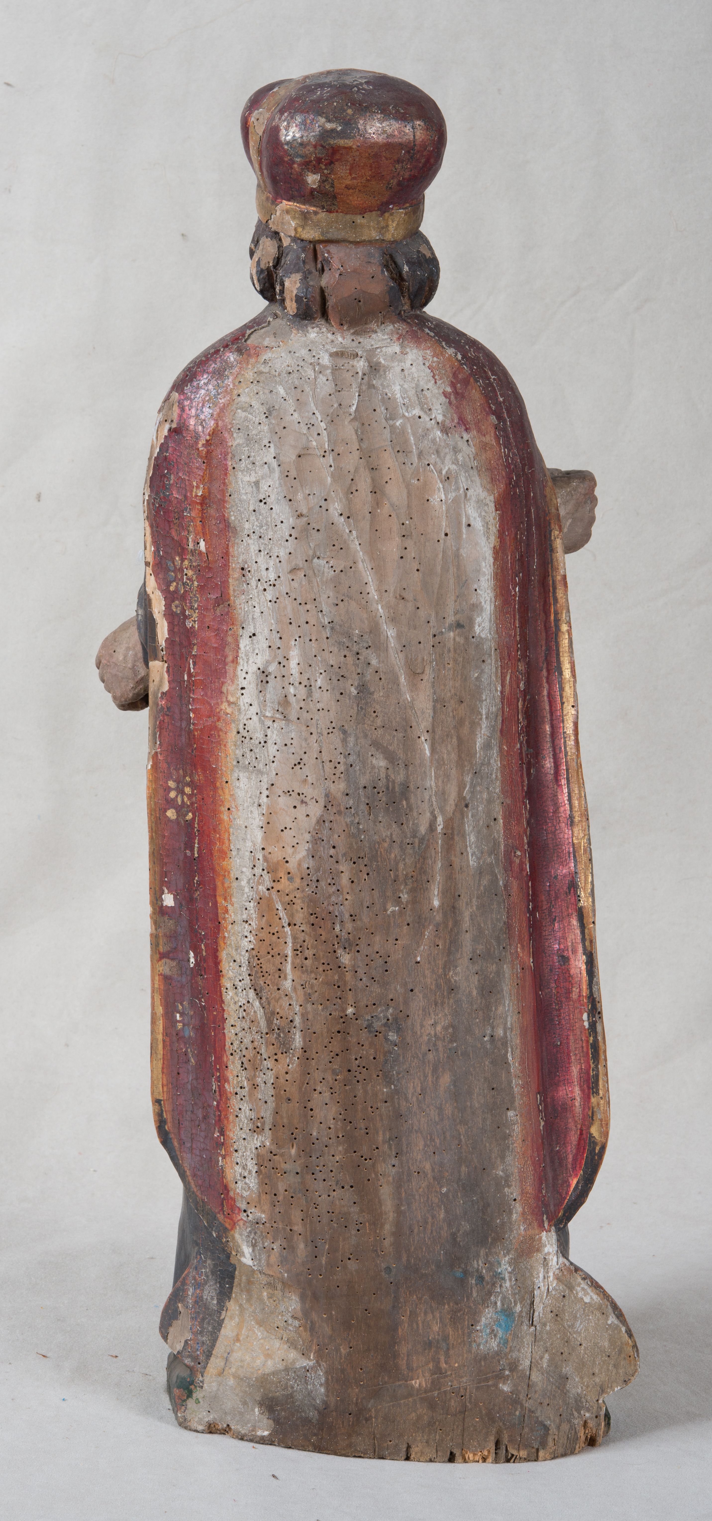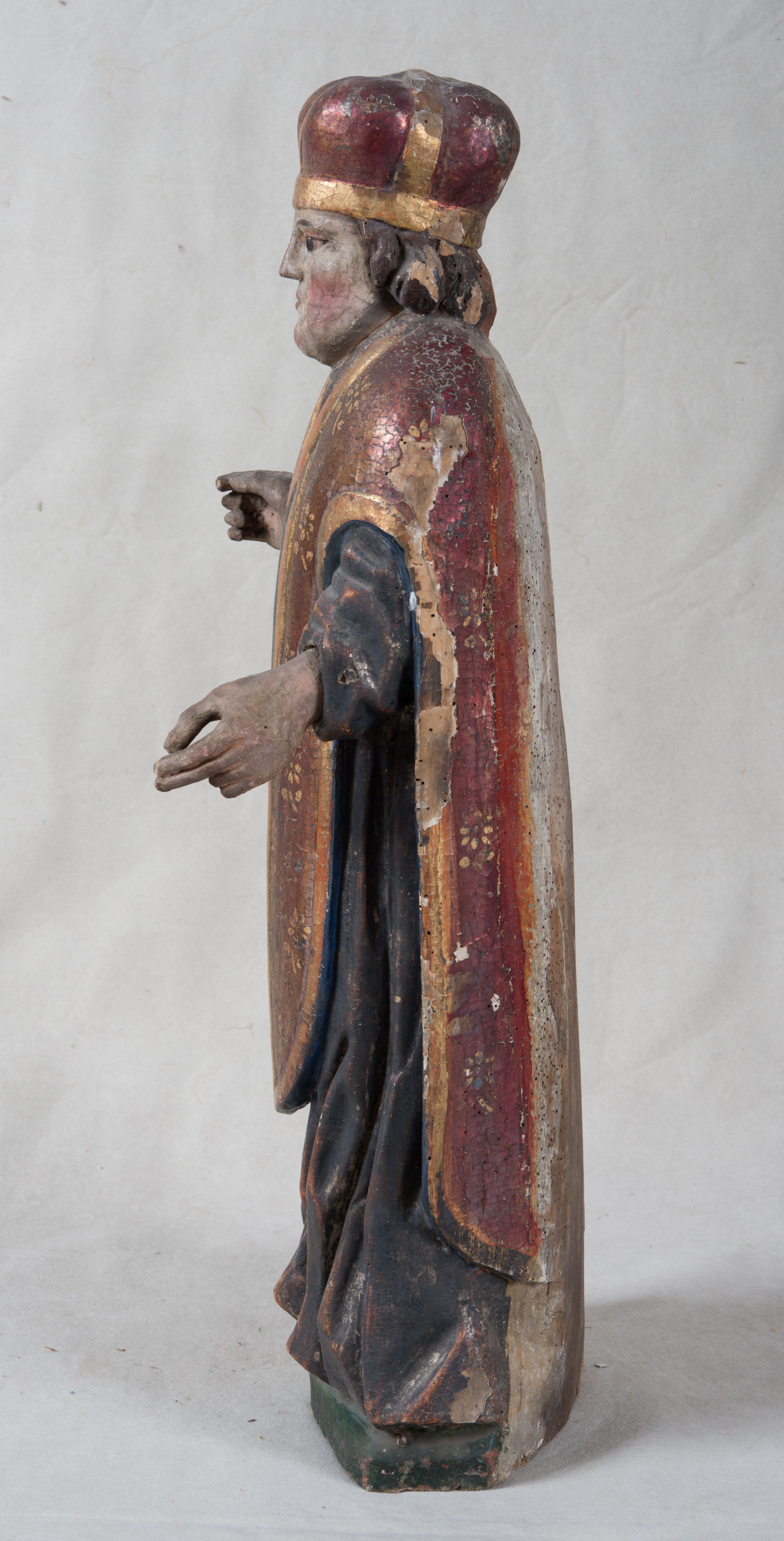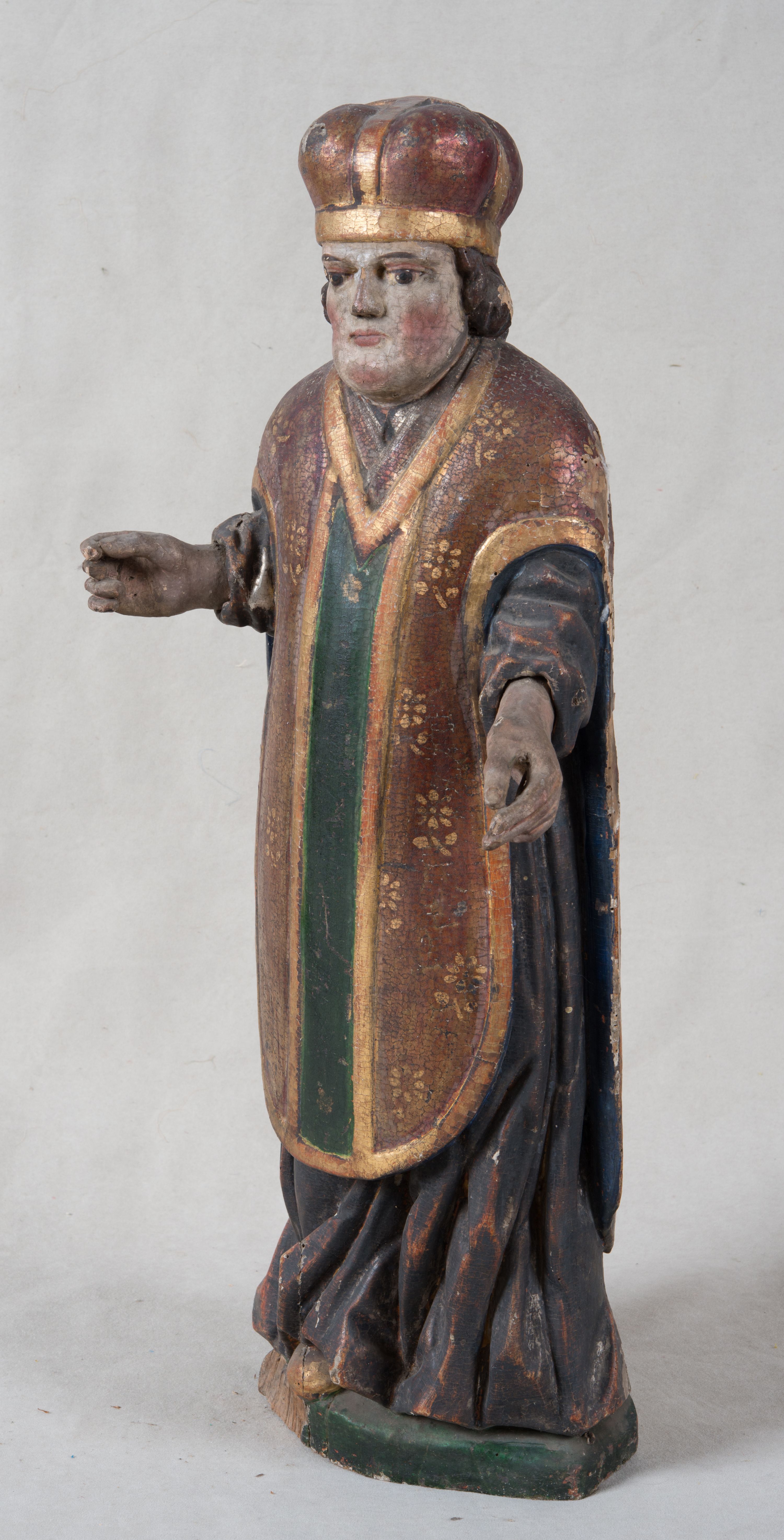 Figurę cechuje statyczność, blokowa forma z przyciągniętymi blisko ciała rękoma oraz głową pozbawioną szyi. Wydaje się, że rzeźbiona jest w sposób sumaryczny, jakkolwiek ze szczegółowym oddaniem detalu stroju, chociażby ledwie dostrzegalnym humerałem i elementami ornatu z wyodrębnioną pretekstą i galonami.