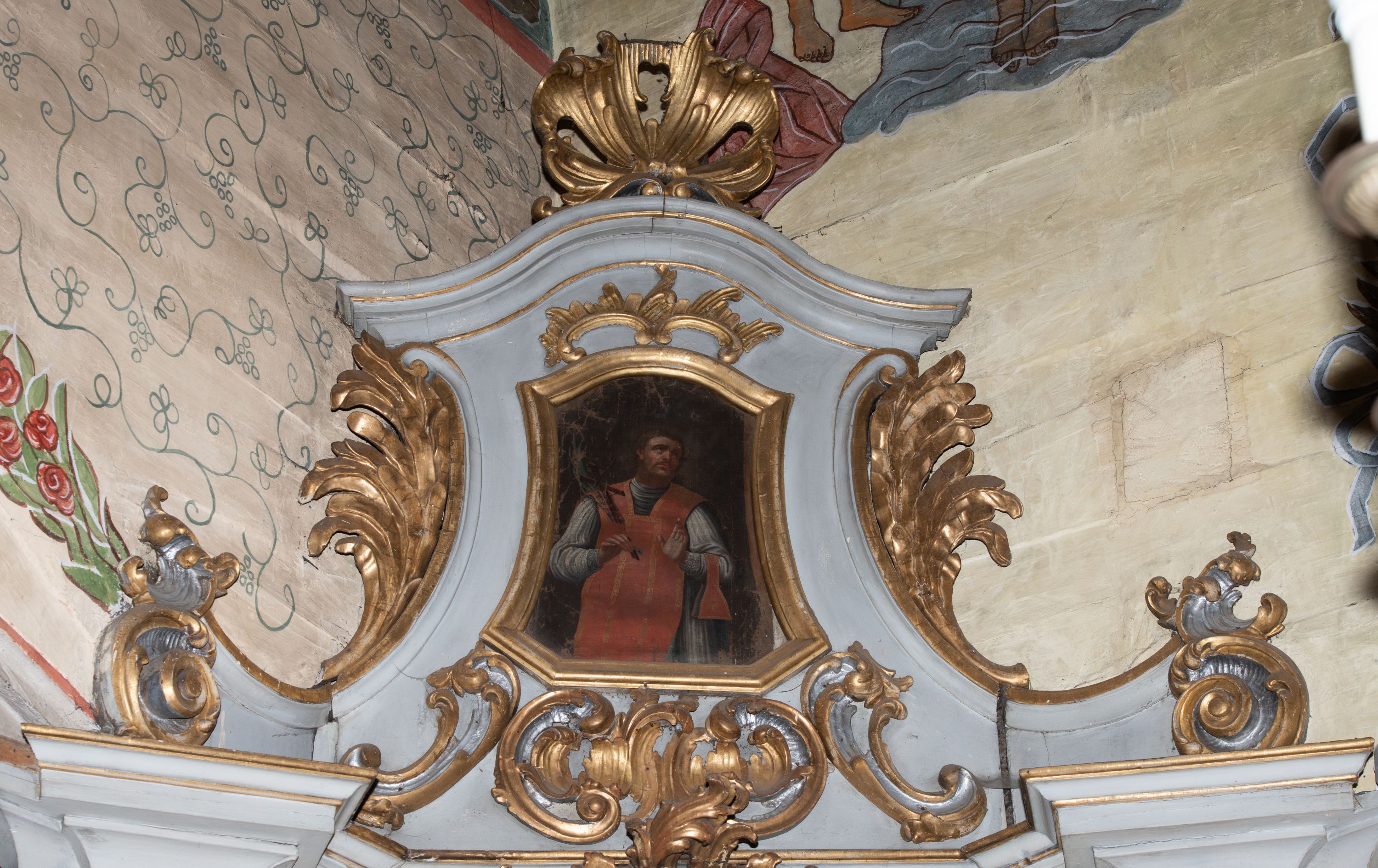Obraz w kształcie stojącego prostokąta, zamkniętego łukiem nadwieszonym o delikatnie wklęsłych bokach, przedstawiający św. Walentego. W centrum ukazany święty w postawie stojącej, w półpostaci z głową skierowaną w lewo. W prawej dłoni trzyma krucyfiks i palmę męczeństwa, a lewą ugiętą w łokciu wyciąga przed siebie. Twarz okrągła z drobnymi ustami, długim nosem, wzrokiem skierowanym ku górze i silnie zarumienionymi policzkami; okolona krótką brodą i jasnobrązowymi, krótkimi włosami. Ubrany jest w silnie drapowaną albę, czerwony ornat ze złoconą pasmanterią i zieloną podszewką oraz manipularz na lewym przedramieniu. Włosy krótkie, kędzierzawe i jasne. Tło jednolite, czarne, rozświetlone wokół głowy świętego. Rama drewniana, profilowana i złocona w kształcie stojącego prostokąta, o ściętych dolnych narożach, bokach wklęsłych i zakończona łukiem wklęsło-wypukłym.