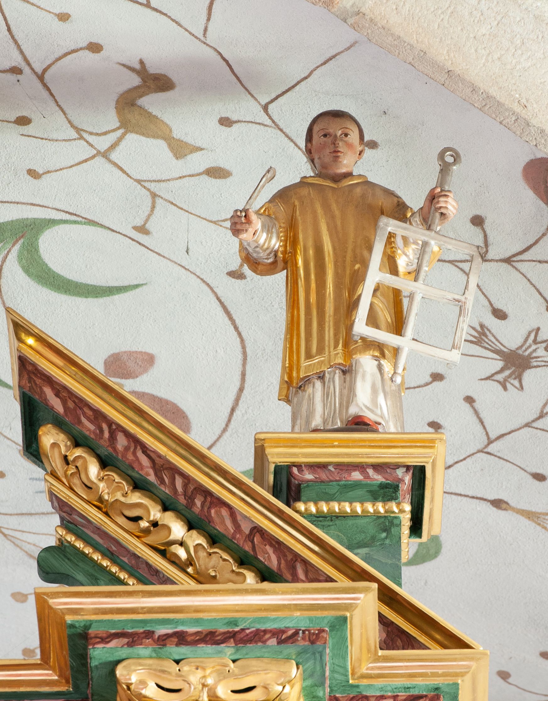 Figura św. Wawrzyńca powstała do ołtarza głównego w drugiej ćwierci XVII wieku. Święty Wawrzyniec był jednym z diakonów papieża Sykstusa II, dlatego w ikonografii przedstawiany jest w stroju odpowiadającym tej godności. Był poddany torturom przypalania na żelaznej kracie (ruszcie), dlatego stanowi ona jego atrybut.