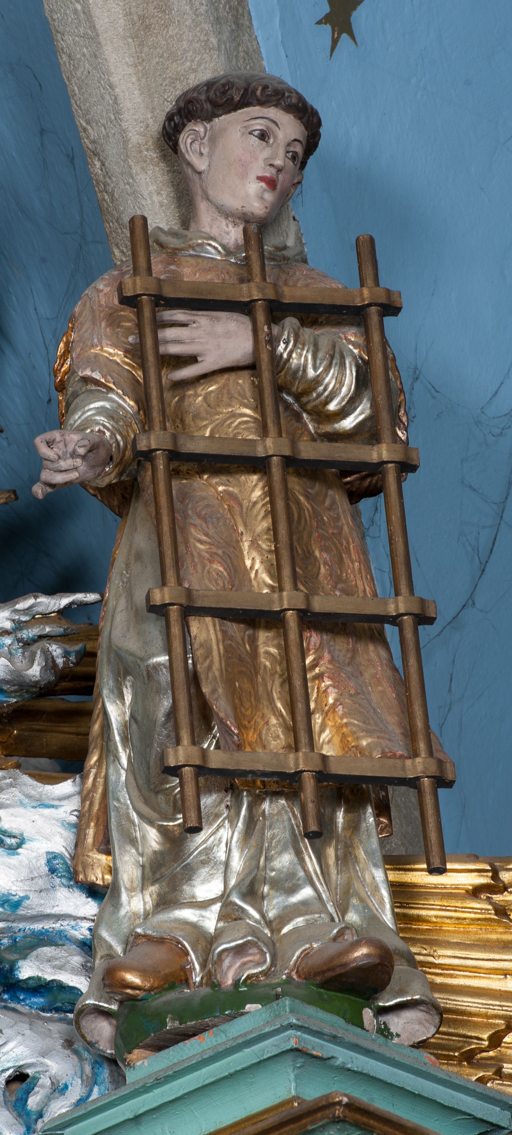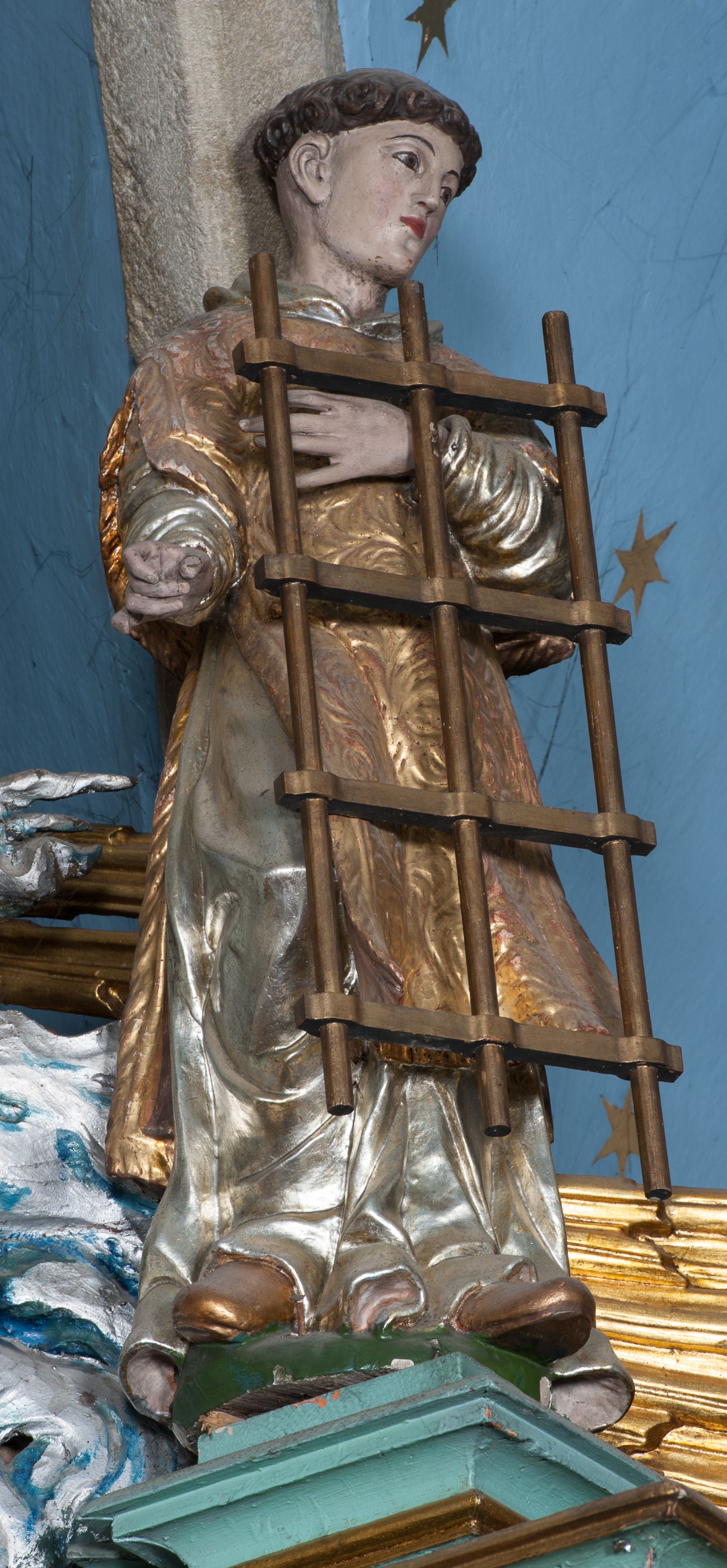 Rzeźba przedstawia św. Wawrzyńca. Święty ustawiony jest frontalnie z głową delikatnie zwróconą w swoją lewą stroną, z prawą ręką zgiętą w łokciu i wysuniętą do przodu, ułożoną do trzymania niezachowanego atrybutu (zapewne palmy męczeństwa); lewą ma złożoną na piersi, podtrzymuje nią duży ruszt w kształcie kratownicy. Twarz szeroka z małymi i delikatnie otwartymi ustami, z prostym nosem, z małymi oczami okolonymi wąskimi łukami brwiowymi. Włosy krótkie, kędzierzawe, ucięte w prostej linii wzdłuż nad uszami. Święty jest ubrany w długą, srebrzoną albę z długimi rękawami oraz złoconą dalmatykę, która zdobiona jest rzeźbioną wicią roślinną, na stopach ma złocone buty. Polichromia w odsłoniętych partiach ciała naturalistyczna, jasna, szaty złocone i srebrzone.