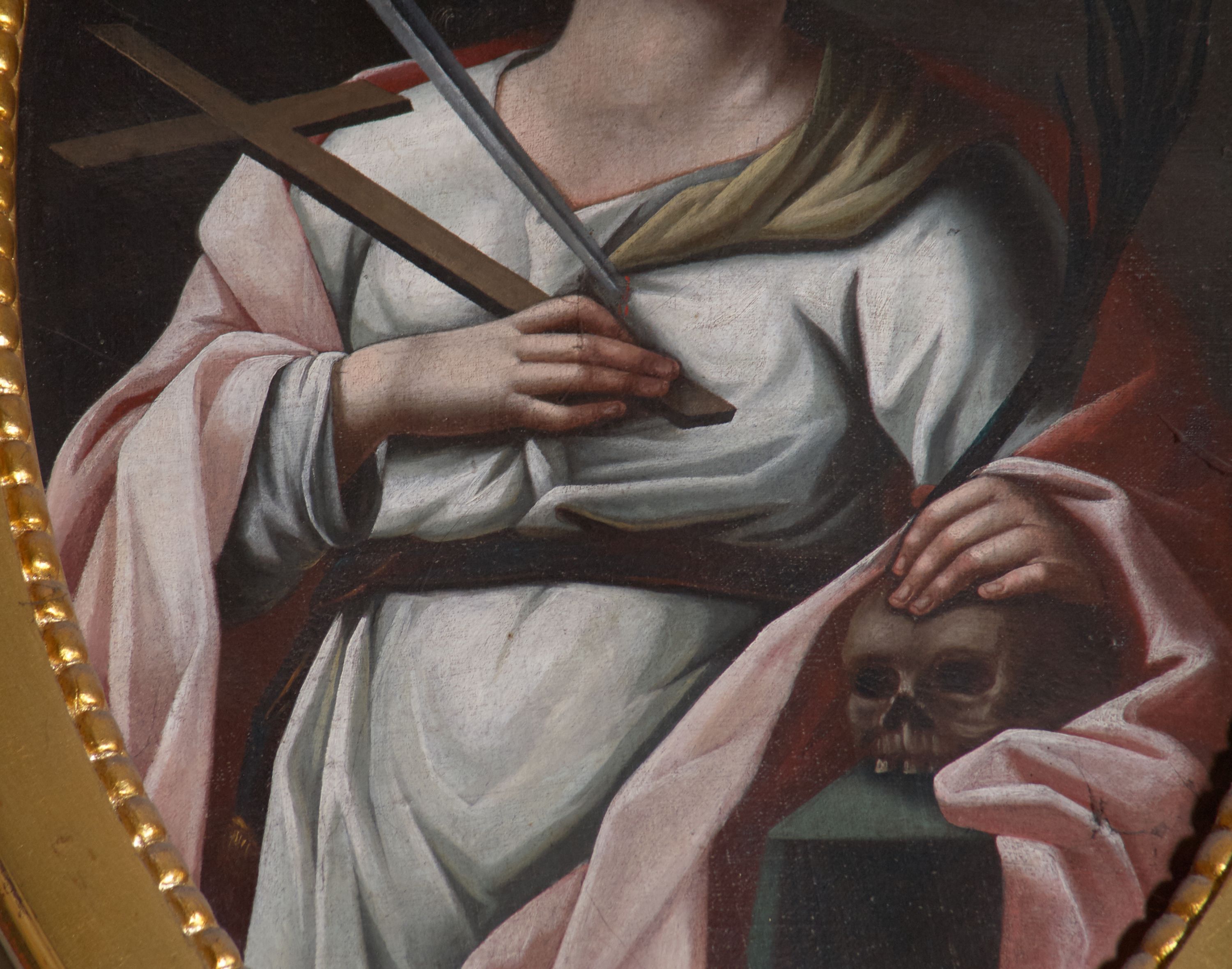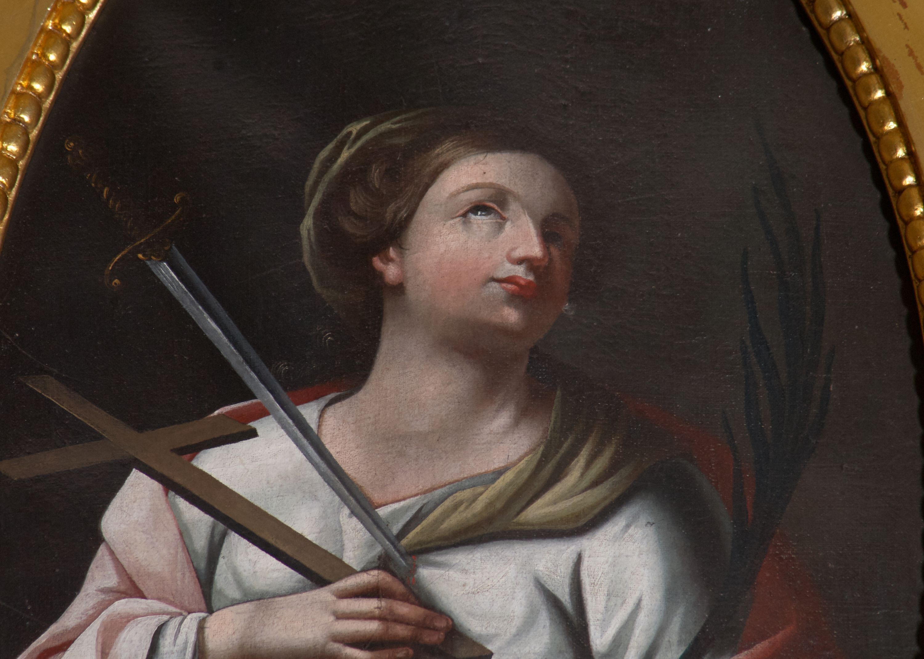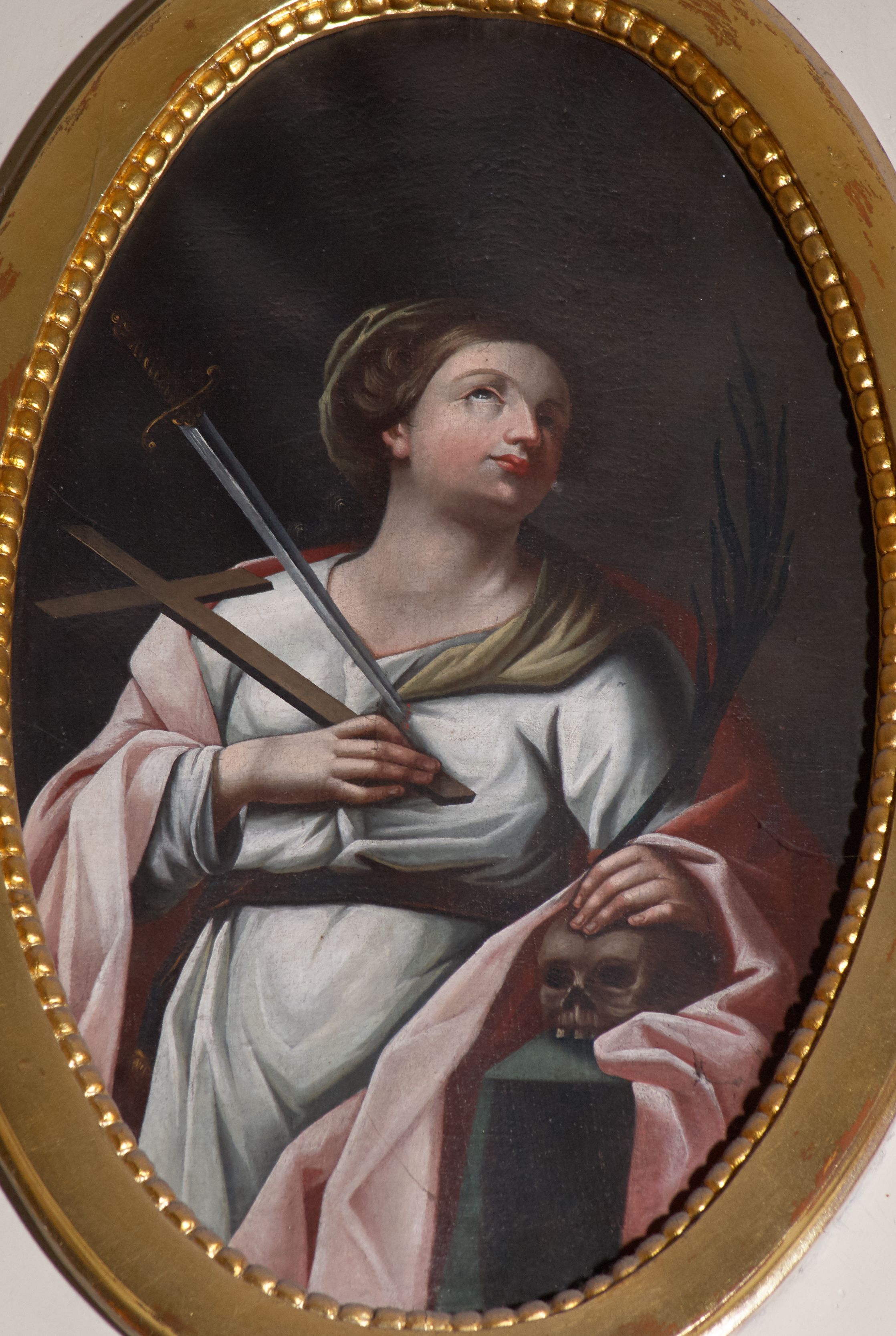Obraz w kształcie owalu. W centrum kompozycji ukazana św. Wiktoria, w postawie stojącej, w trzech czwartych, z głową zwróconą w swoją lewą stronę i uniesioną delikatnie do góry. Lewa ręka świętej wsparta na leżącej na stoliku czaszce, podtrzymuje palmę męczeństwa w dłoni, a prawa trzyma przy piersi krzyż. Twarz o delikatnych rysach, długim i wąskim nosie, wzroku skierowanym do góry. Włosy ciemnobrązowe, upięte do tyłu, za nałożonym welonem na upięcie, spływającym na lewe ramię. Święta ubrana w długą białą suknię z długimi rękawami, przewiązaną w talii brązowym paskiem oraz jasnoróżowy płaszcz swobodnie założony na plecy. Z lewej strony obrazu serce św. Wiktorii przeszywa miecz. Stół zasłany jest zielonym obrusem. Tło jednolite, ciemnobrązowe.