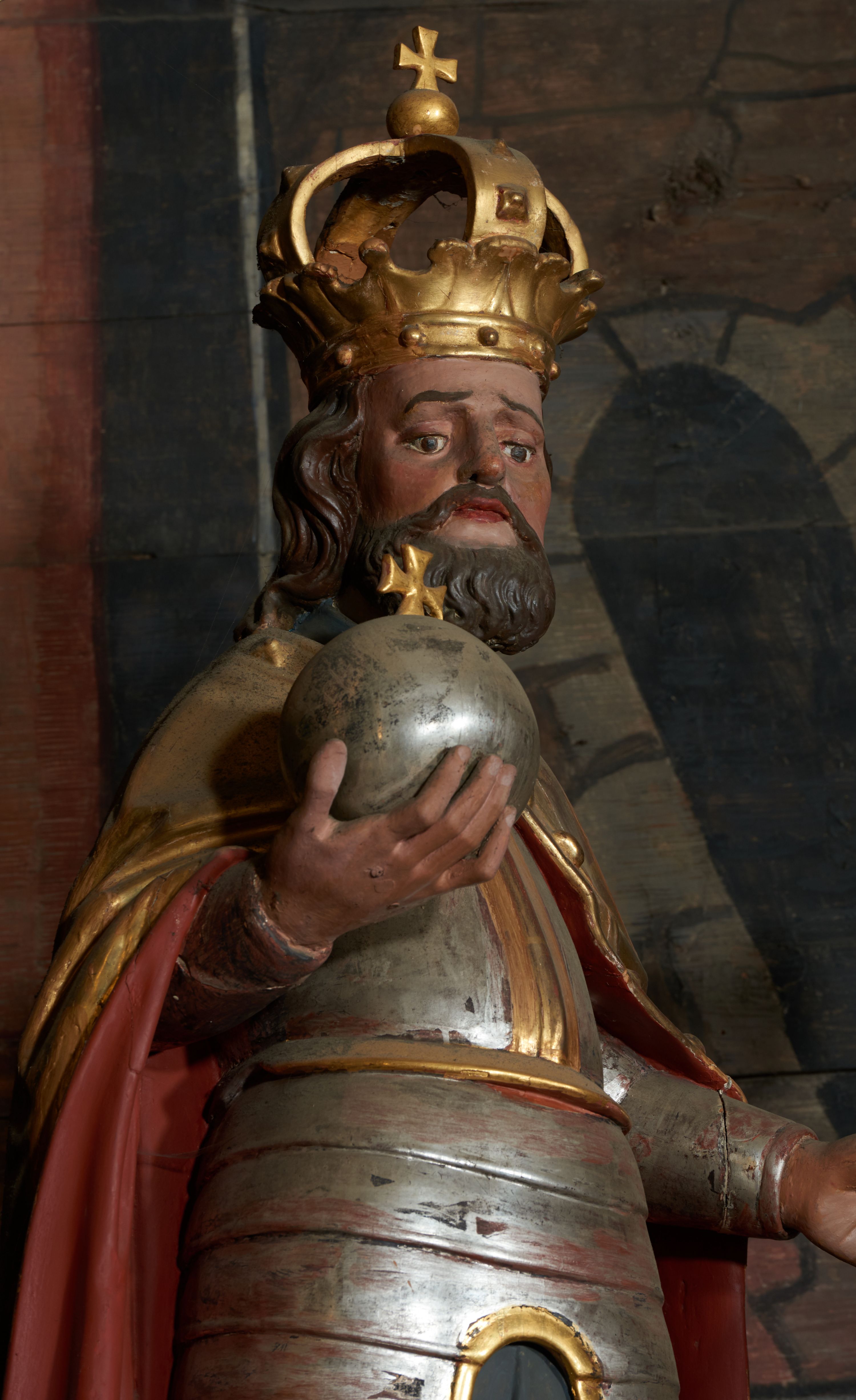 Rzeźba ścięta z tyłu, przedstawiająca św. Władysława. Święty ukazany frontalnie z jabłkiem królewskim w prawej dłoni i toporem w lewej. Twarz podłużna o głęboko osadzonych oczach i krótkim nosie, okolona brodą. Włosy półdługie, falowane. Święty ubrany jest w pełną, srebrną zbroję płytową, niebieską tunikę lamowaną złotem oraz złoty płaszcz spięty klamrą, podbity czerwienią, obficie drapowany w dolnej partii, w górnej zdobiony rautami i kaboszonami, na głowie ma założoną koronę zamkniętą. Polichromia naturalistyczna w partiach ciała, strój i atrybuty złocone i srebrzone.