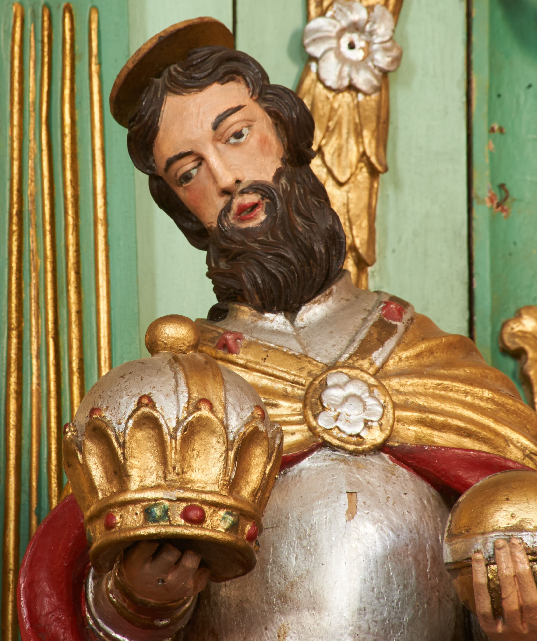Święty ukazany frontalnie, z głową lekko przechyloną w prawo, w kontrapoście. Obie ręce ma ugięte, wyciągnięte przed siebie, w lewej dłoni trzyma jabłko królewskie, w prawej zamkniętą koronę. Twarz ma pociągłą, o wąskich oczach, prostym nosie i małych, otwartych ustach, okoloną gęstą brodą i ciemnymi, krótkimi włosami. Nad głową ma nimb. Ubrany jest w srebrzoną zbroję, ze złoconymi detalami oraz złocony płaszcz z czerwoną podszewką, zapięty na piersi ozdobną klamrą. Polichromia ciała naturalistyczna.