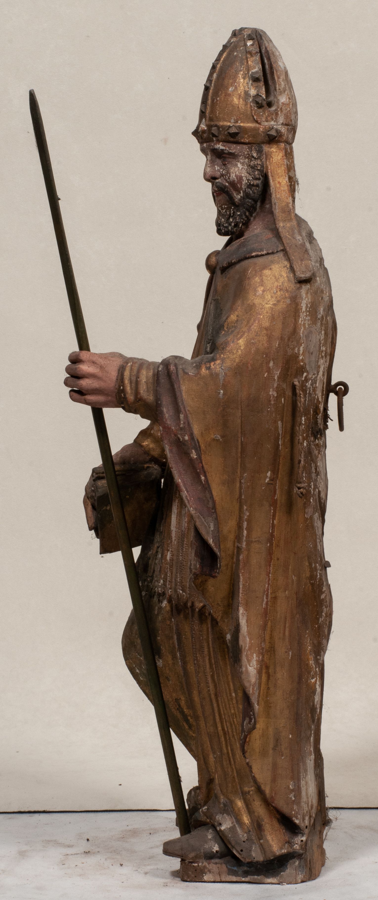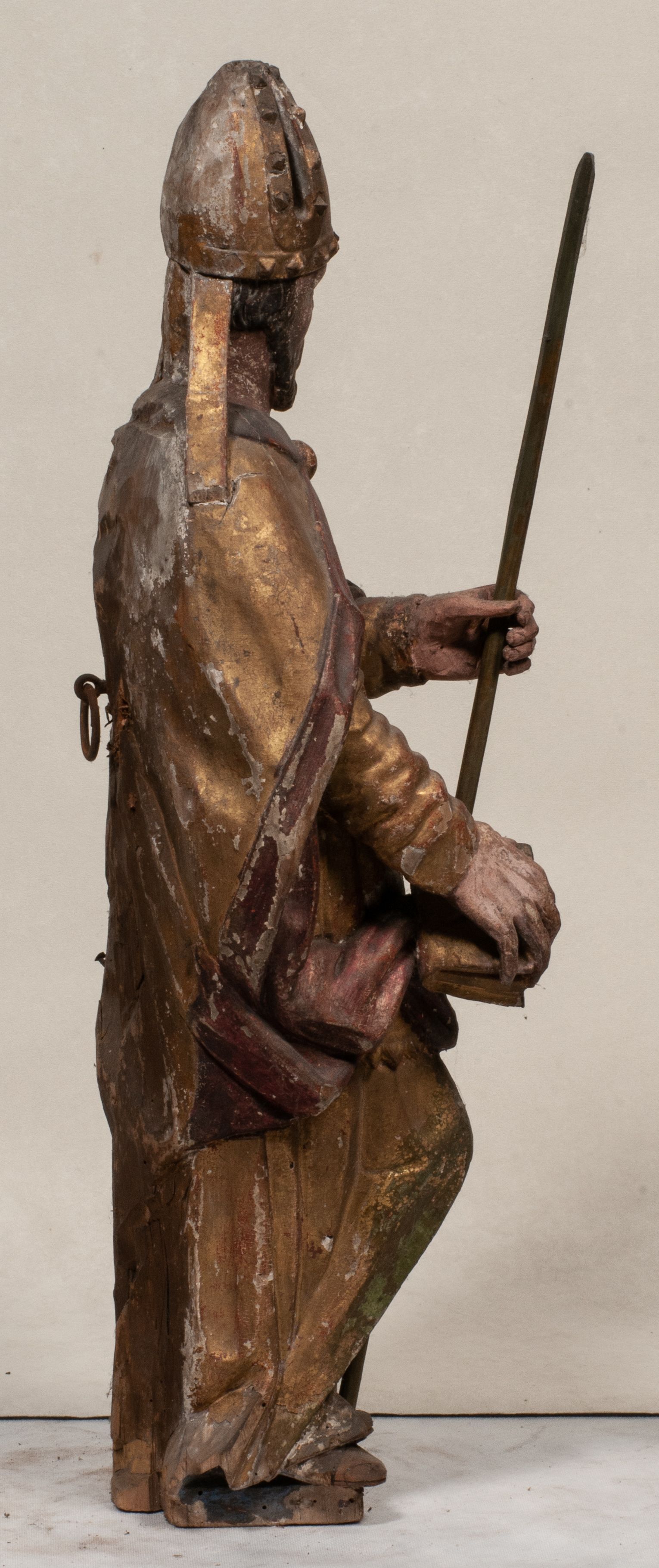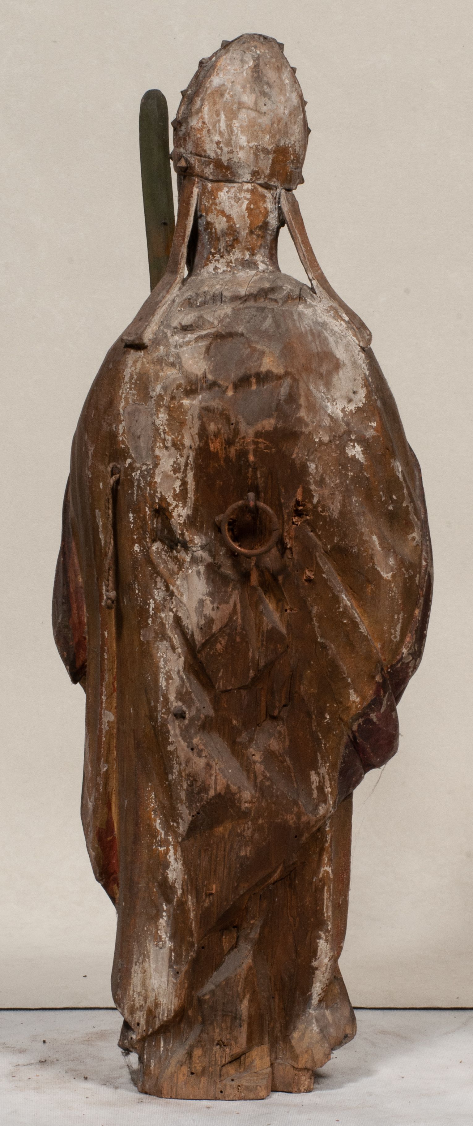 Figura nieopracowana z tyłu, ustawiona na niewielkiej podstawie. Święty ukazany jest w całej postaci, frontalnie, w kontrapoście, z pochyloną głową skierowaną w lewo. W prawej, opuszczonej wzdłuż ciała ręce trzyma zamkniętą księgę, w lewej, uniesionej przed sobą na wysokości piersi – wiosło. Jego twarz jest trójkątna o migdałowatych oczach, krótkim nosie i wąskich ustach, okolona brodą. Ubrany jest w albę, rokietę oraz płaszcz z kołnierzem zapięty pod szyją, na głowie ma infułę. Polichromia naturalistyczna w partiach ciała, strój i atrybuty złocone.