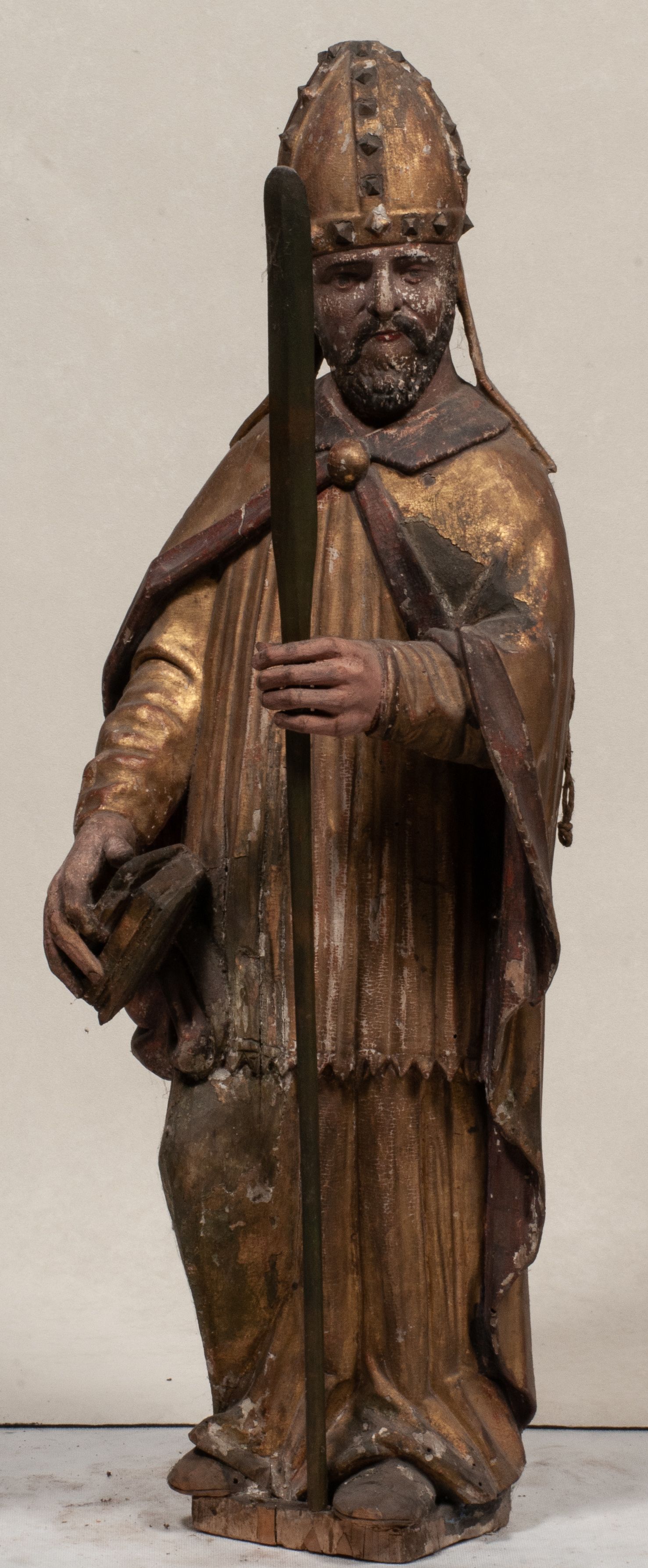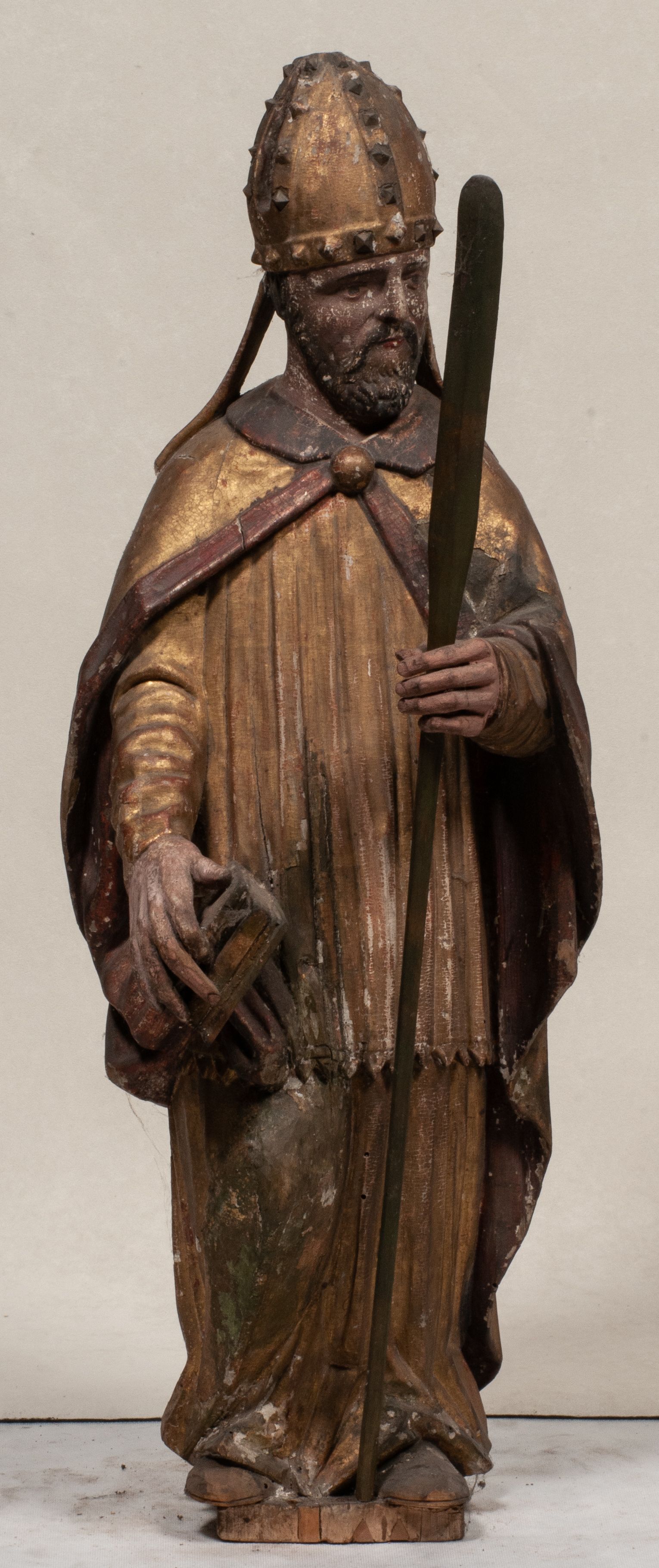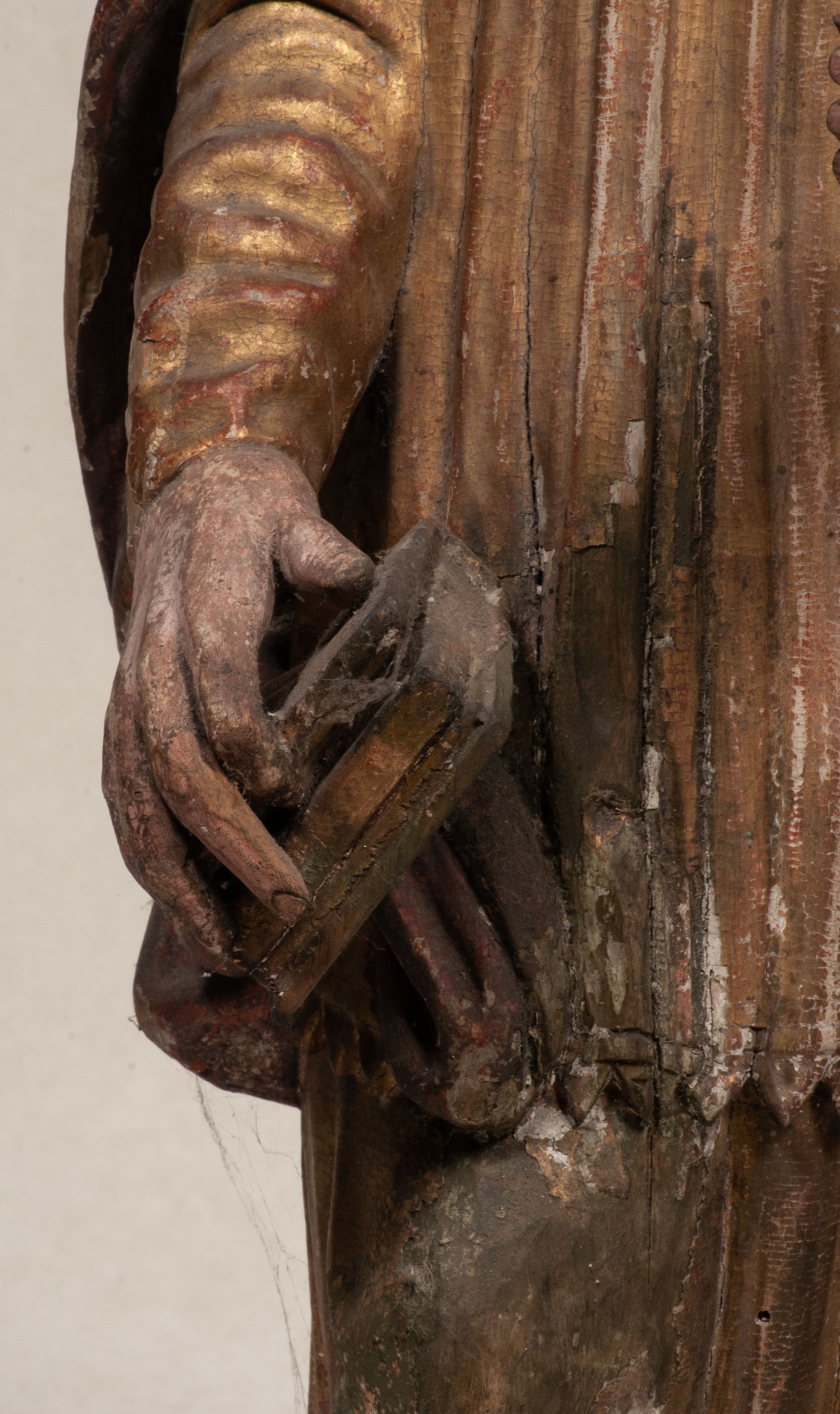 Liczne spękania, odspojenia i ubytki warstwy malarskiej i warstwy złoceń. Silne zabrudzenia całej figury.