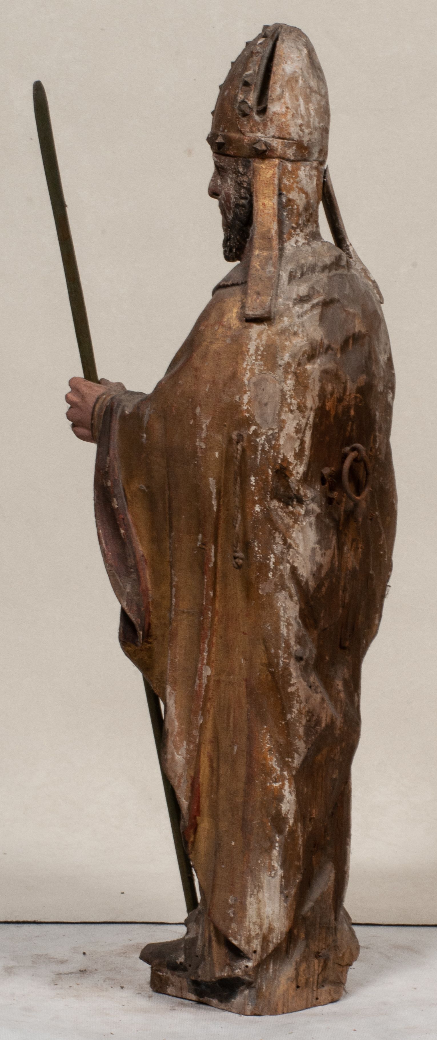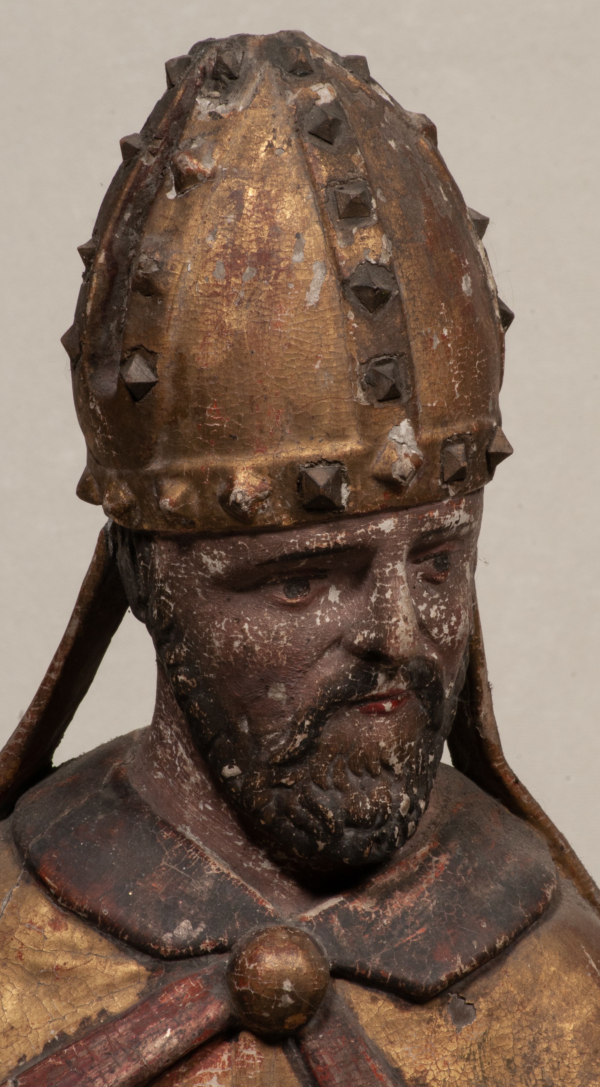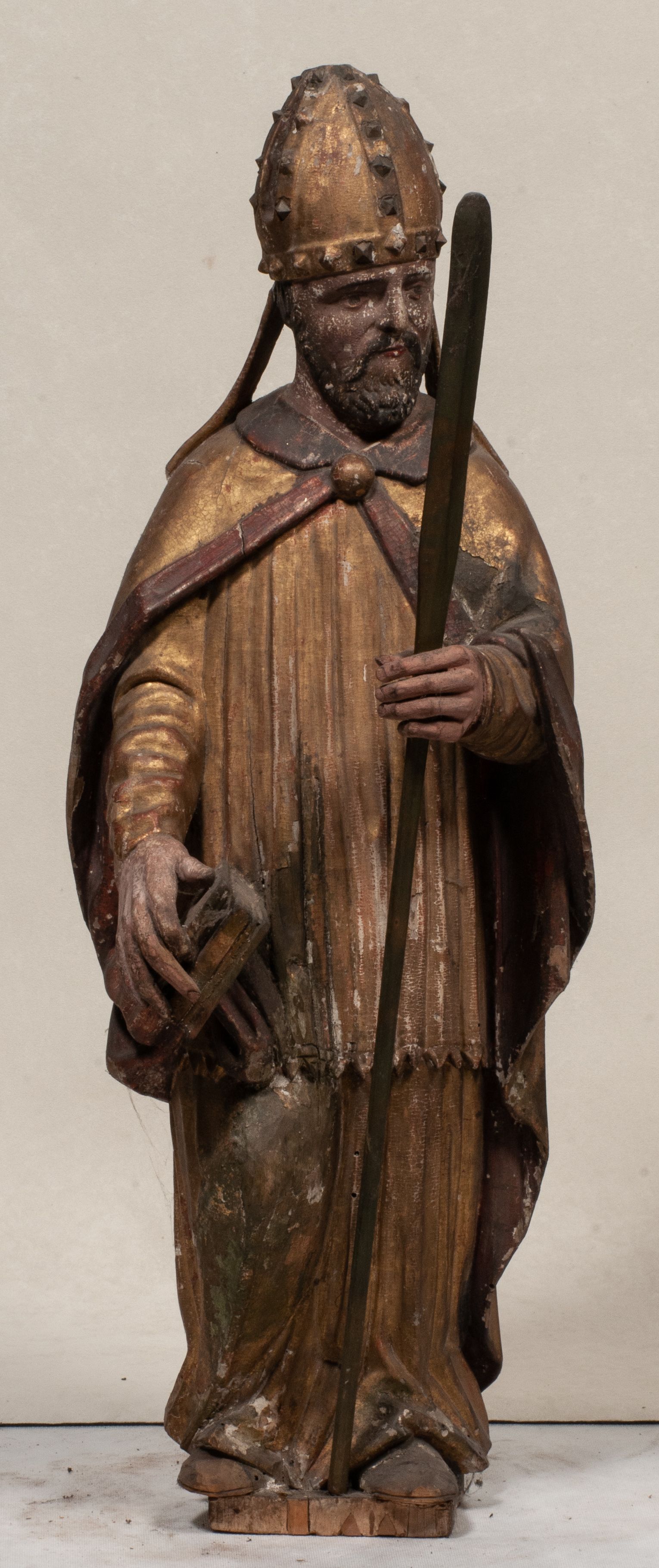 Liczne spękania, odspojenia i ubytki warstwy malarskiej i warstwy złoceń. Silne zabrudzenia całej figury.