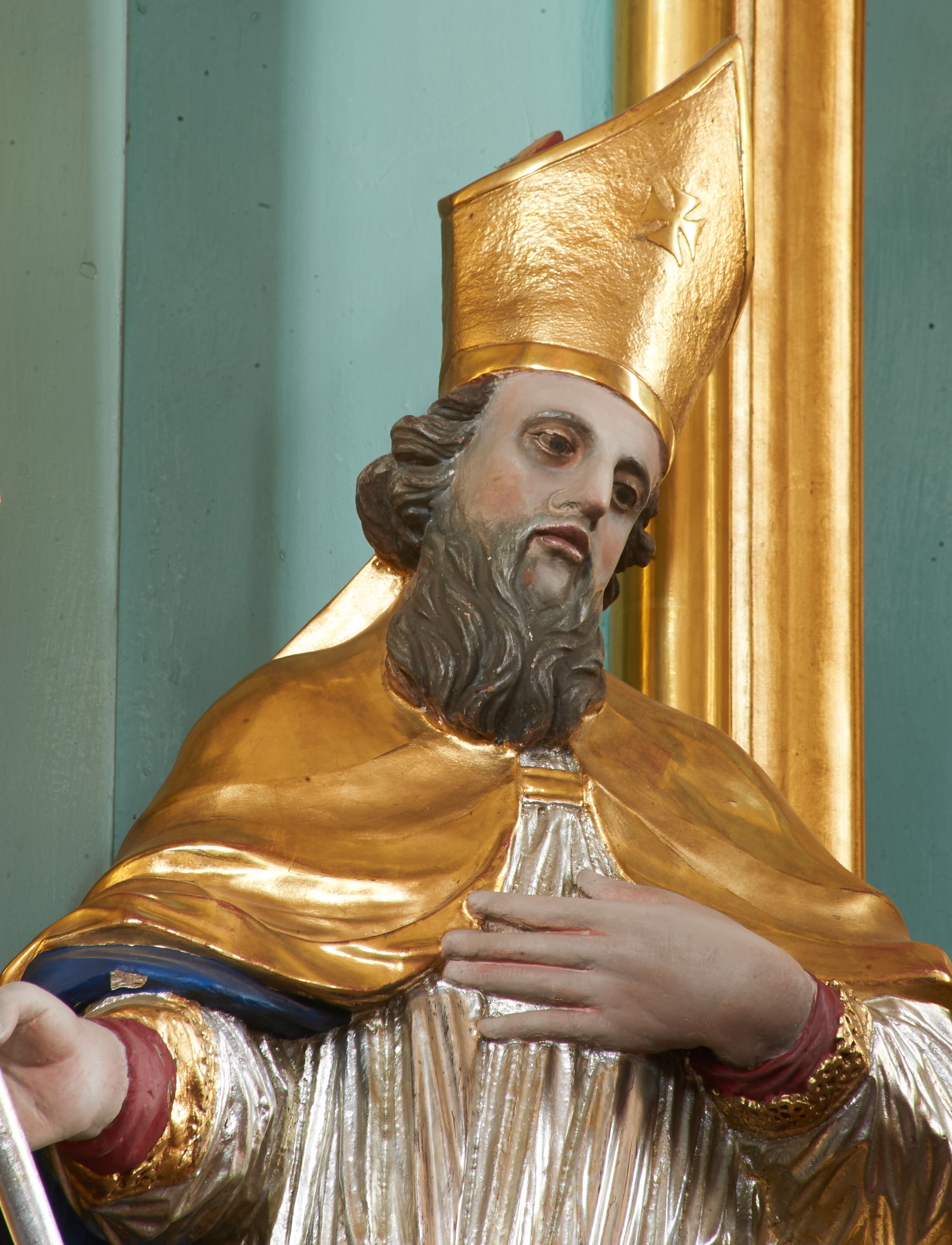 Rzeźba pełna, ustawiona na nieregularnej podstawie. Święty ukazany frontalnie, z głową przechyloną w lewo, w kontrapoście, o delikatnie przegiętej sylwetce. Lewą rękę ma ugiętą, uniesioną na wysokość piersi, w prawej trzyma laskę zakończoną krzyżem. Twarz ma pociągłą, o migdałowatych oczach, małym nosie i pełnych utach, okoloną brązową brodą i skręconymi, krótkimi włosami. Postać ubrana jest w długą, czerwoną albę, srebrzoną rokietę ze złoconym brzegiem oraz złoconą kapę z granatową podszewką, zapiętą klamrą na piersi i zawiniętą na lewej nodze. Na głowie ma złoconą infułę. Polichromia naturalistyczna w partiach ciała.