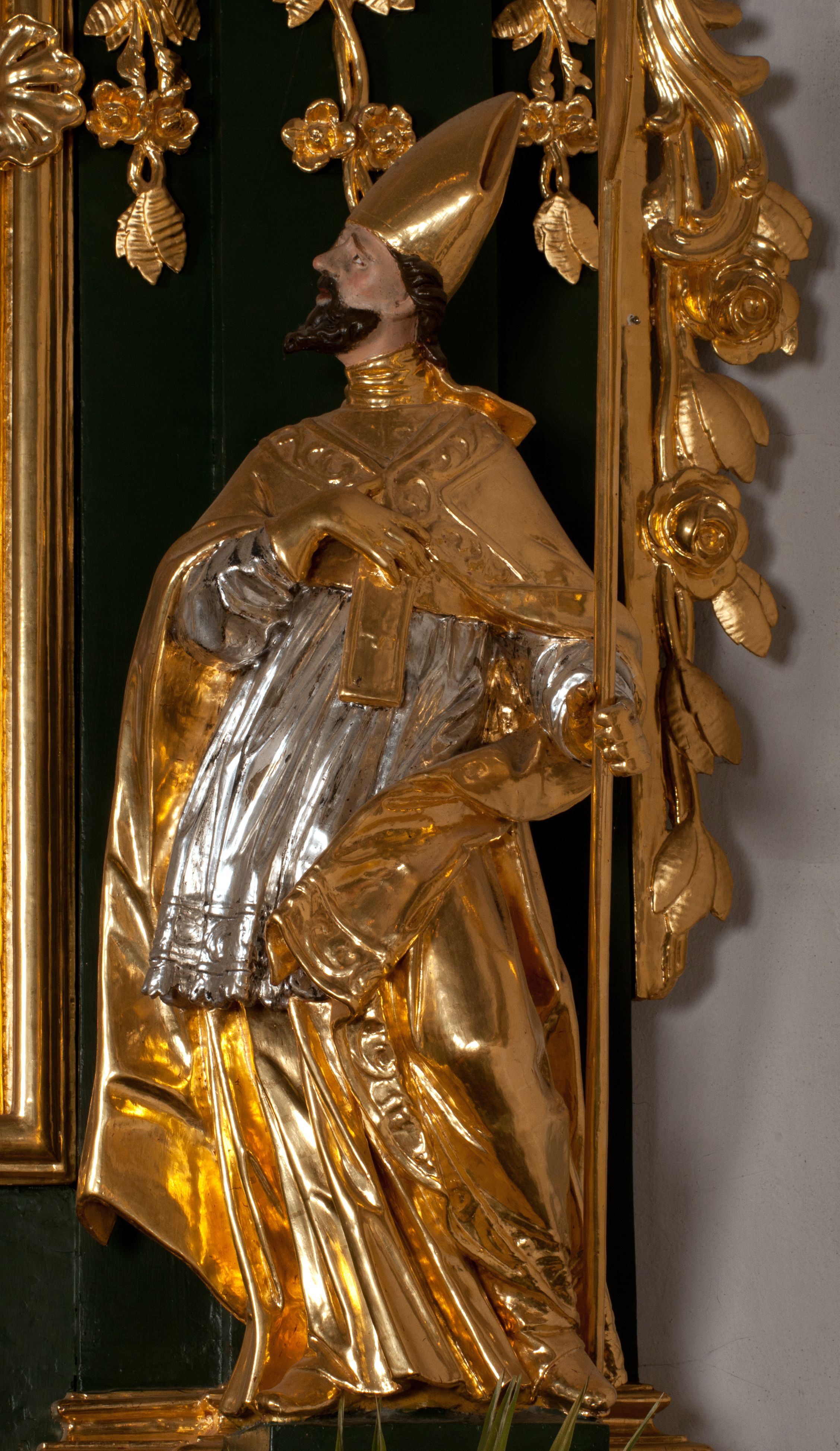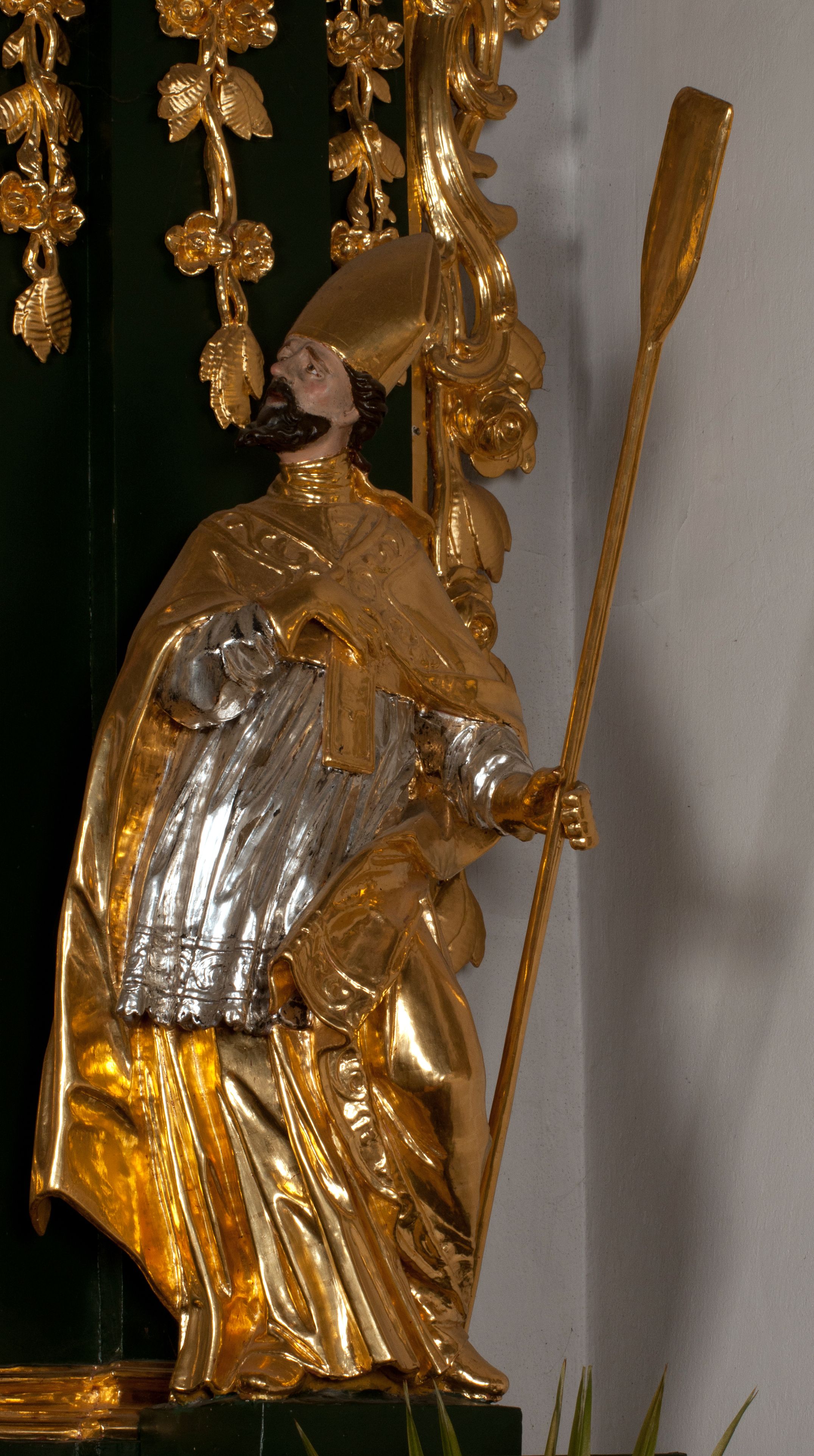 Pełnoplastyczna rzeźba drewniana przedstawiająca św. Wojciecha, przyścienna, polichromowana, złocona i srebrzona, wydrążona z tyłu. Ustawiona na niskiej prostokątnej podstawie. Święty ukazany całopostaciowo, w pozycji stojącej w kontrapoście, z lewą nogą ugiętą w kolanie i odstawioną w bok, z wyraźnym przegięciem ciała w prawo i skręceniem korpusu w lewo. Prawa ręka zgięta w łokciu i nadgarstku spoczywa na piersi, lewa ręka odwiedziona od ciała, ugięta w łokciu i wyciągnięta do przodu, na wysokości pasa trzyma wysokie wiosło. Głowa mała, osadzona na długiej szyi, uniesiona w górę, zwrócona w prawo. Twarz trójkątna, szczupła, podbródek okolony brodą z pofalowanymi i skręconymi pasmami włosów układającymi się w szpic. Wzniesione wyraźnie brwi podkreślają kierunek spojrzenia, nos duży, spiczasty, usta lekko rozchylone, okolone długimi wąsami. Głowę po bokach okalają krótkie włosy, na głowie infuła, ze wstęgą uniesioną nad ramieniem. Święty ubrany jest w albę, rokietę z szeroką, dekoracyjną koronką i mucet. Na ramiona narzucona kapa z galonem ozdobionym stylizowanym motywem roślinnym. Na piersi spod kapy widoczny paliusz, na szyi humerał, na dłoniach rękawiczki. Spod szaty wystają buty. Szaty świętego ukształtowane ekspresyjnie, o ostro ciętych, skośnych fałdach. Poły płaszcza wywinięte na zewnątrz. Odwinięta poła płaszcza pod lewą ręką mocno uniesiona. Cały strój świętego, z wyjątkiem srebrzonej rokiety, złocony. Twarz i włosy polichromowane.