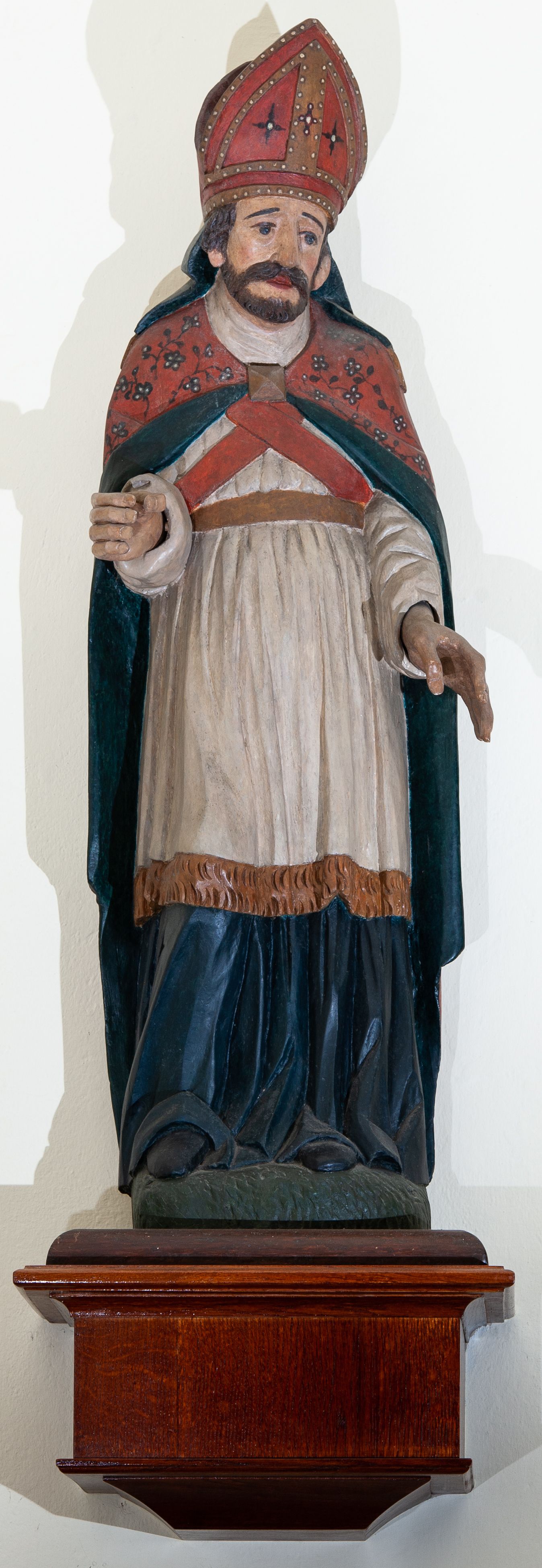 Rzeźba pełnoplastyczna, przyścienna, polichromowana; wyobrażenie św. Wojciecha Biskupa i Męczennika, w całej postaci, stojącego frontalnie, w stroju pontyfikalnym.