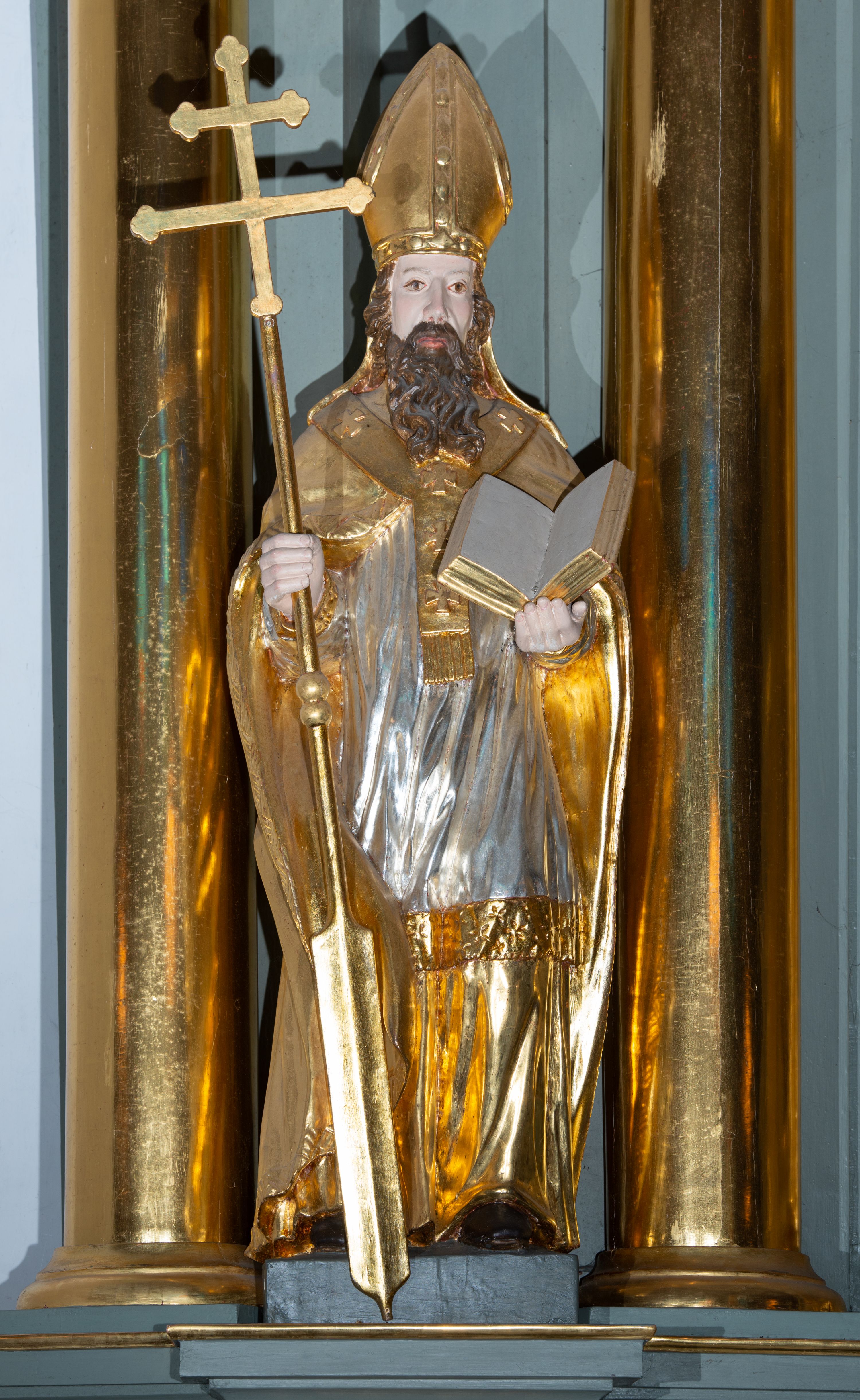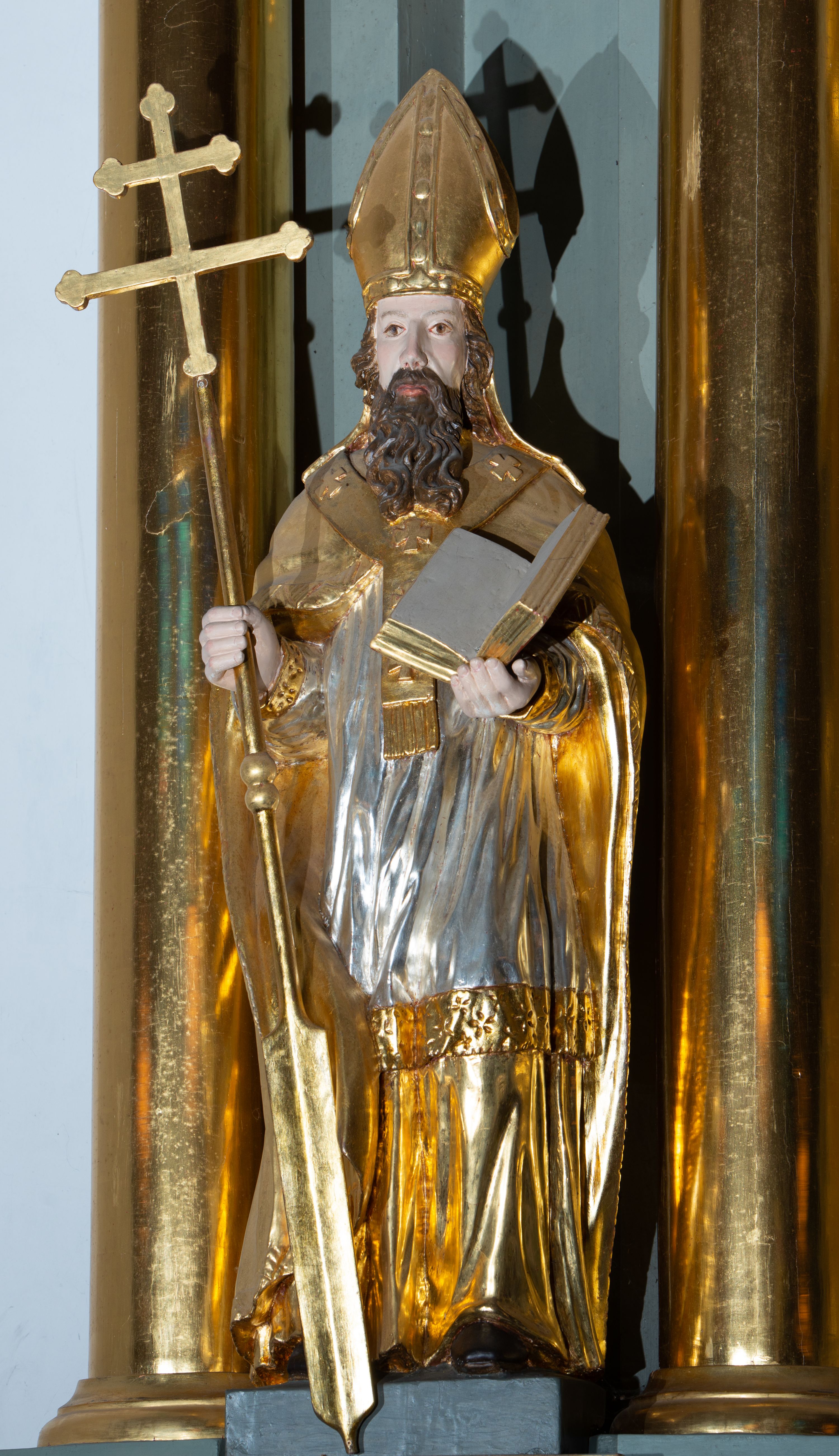 Rzeźba pełnoplastyczna, przyścienna, z tyłu drążona, ustawiona na niskim, prostopadłościennym postumencie. Święty ukazany en face, w kontrapoście, obie ręce ugięte w łokciach, wyciągnięte przed siebie, w lewej trzyma otwartą księgę, w prawej drzewce u dołu zakończone piórem wiosła, zwieńczone krzyżem arcybiskupim. Twarz pociągła, o płytko rzeźbionych rysach i dużym, spiczastym nosie, okolona długą brodą rozdzieloną na dwie części oraz krótkimi falowanymi włosami. Ubrany w długą albę, komżę z koronką na brzegach, kapę spiętą na piersi i opadającą na ramiona i plecy, z fragmentem tkaniny zawiniętym przy prawym boku; na piersi paliusz, na głowie infuła. Figura polichromowana naturalistycznie w odsłoniętych partiach ciała, szaty i atrybuty złocone, komża srebrzona.
