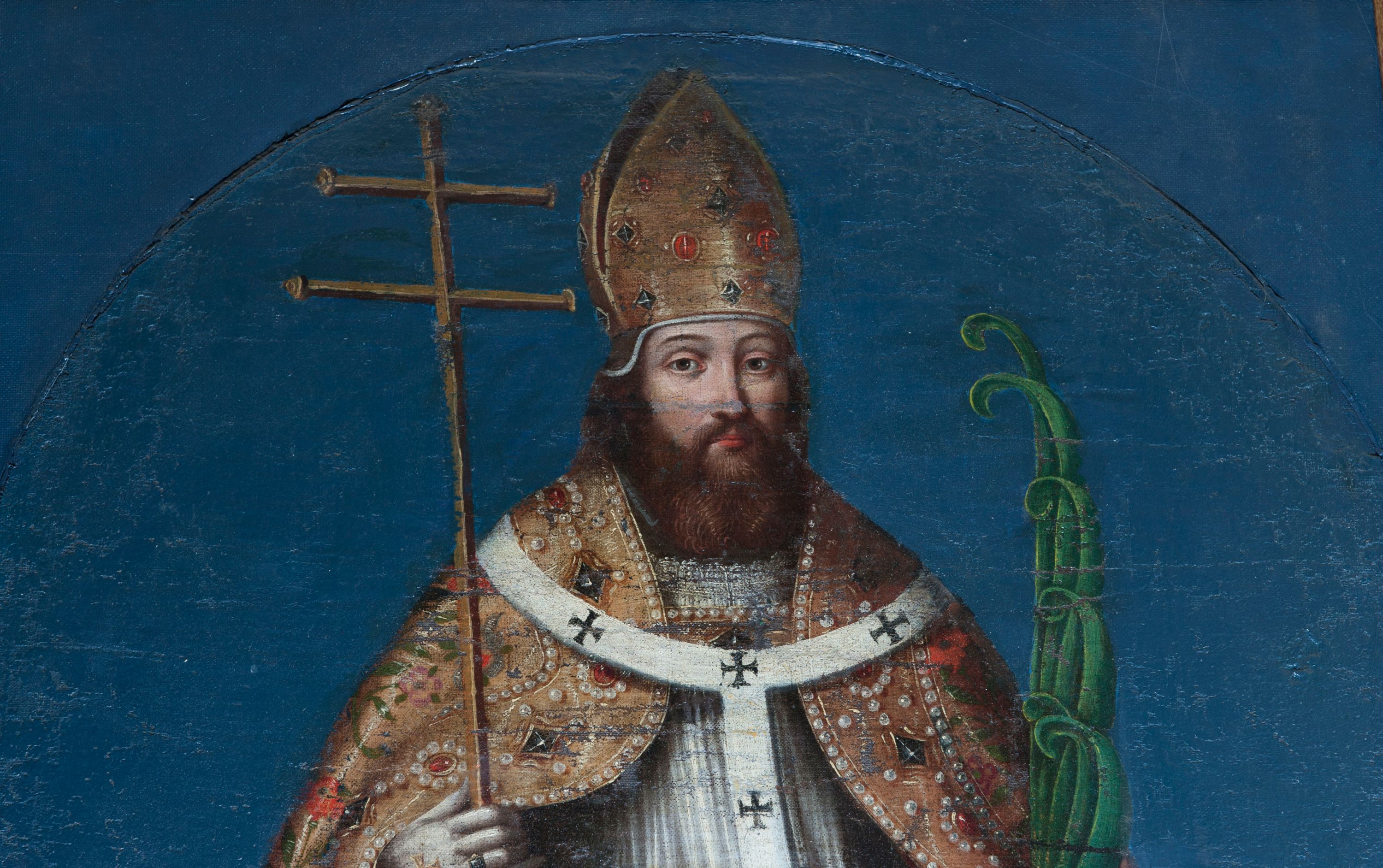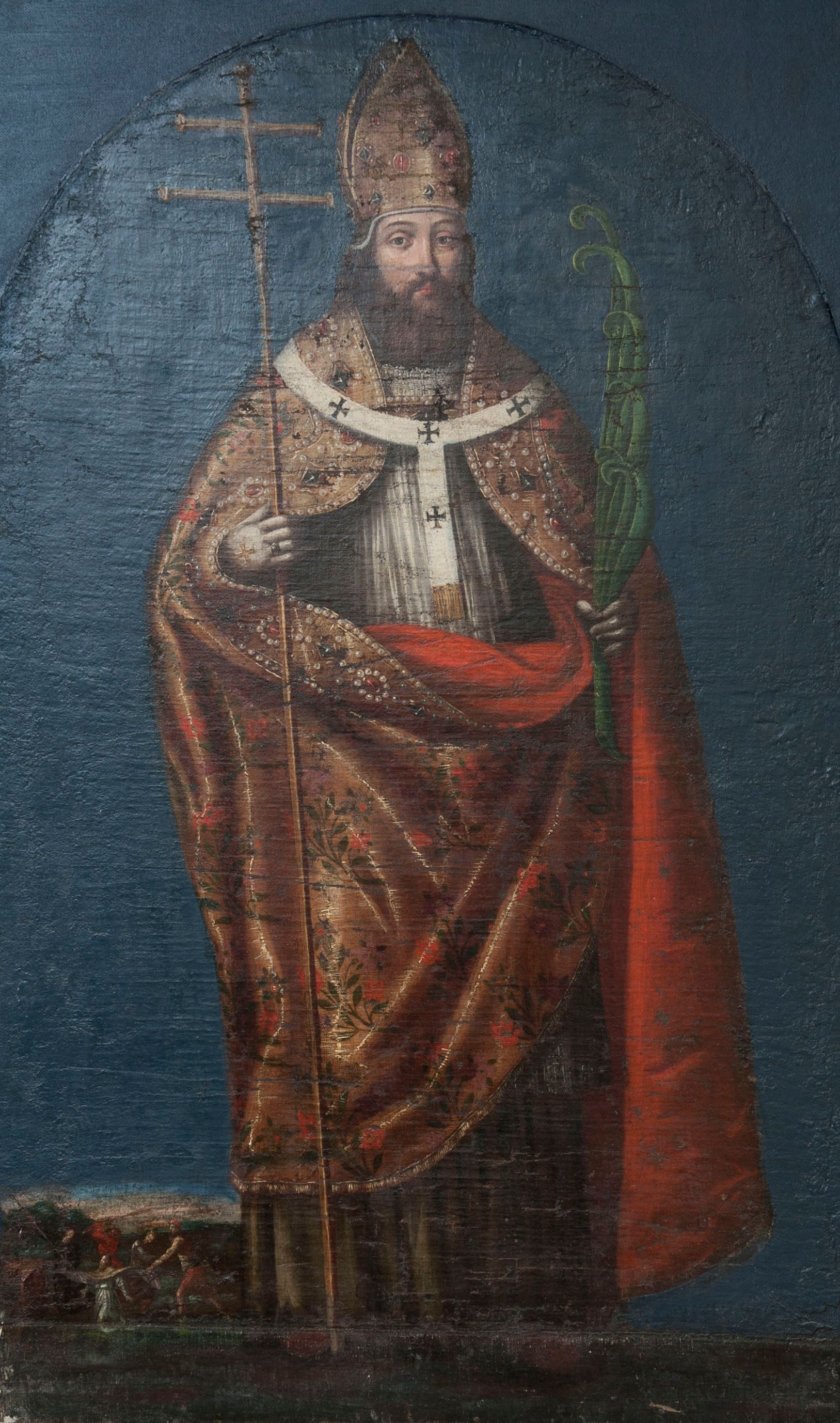 Święty został ukazany frontalnie, w konwencjonalny sposób, trzymając atrybuty, które pozwalają go zidentyfikować. Zamaskowane, półokrągłe wycięcie widoczne w partii nieba, w górnej części kompozycji może świadczyć, że obraz był kiedyś eksponowany w ołtarzu, którego główne pole było ujęte w ramę w kształcie stojącego prostokąta zamkniętego od góry półkoliście. Prawdopodobnie było to jedno z wymiennie pokazywanych płócien. Po wyjęciu z ołtarza dopasowano go do nowej ramy, uzupełniając górną część i dosztukowując pas od dołu. Obraz został namalowany zgodnie z konwencją siedemnastowiecznego malarstwa religijnego – postać o charakterystycznych wydłużonych proporcjach, z postawnym ciałem, lecz drobną głową oraz dłońmi ustawiono w centrum kompozycji i na ponadczasowym tle.