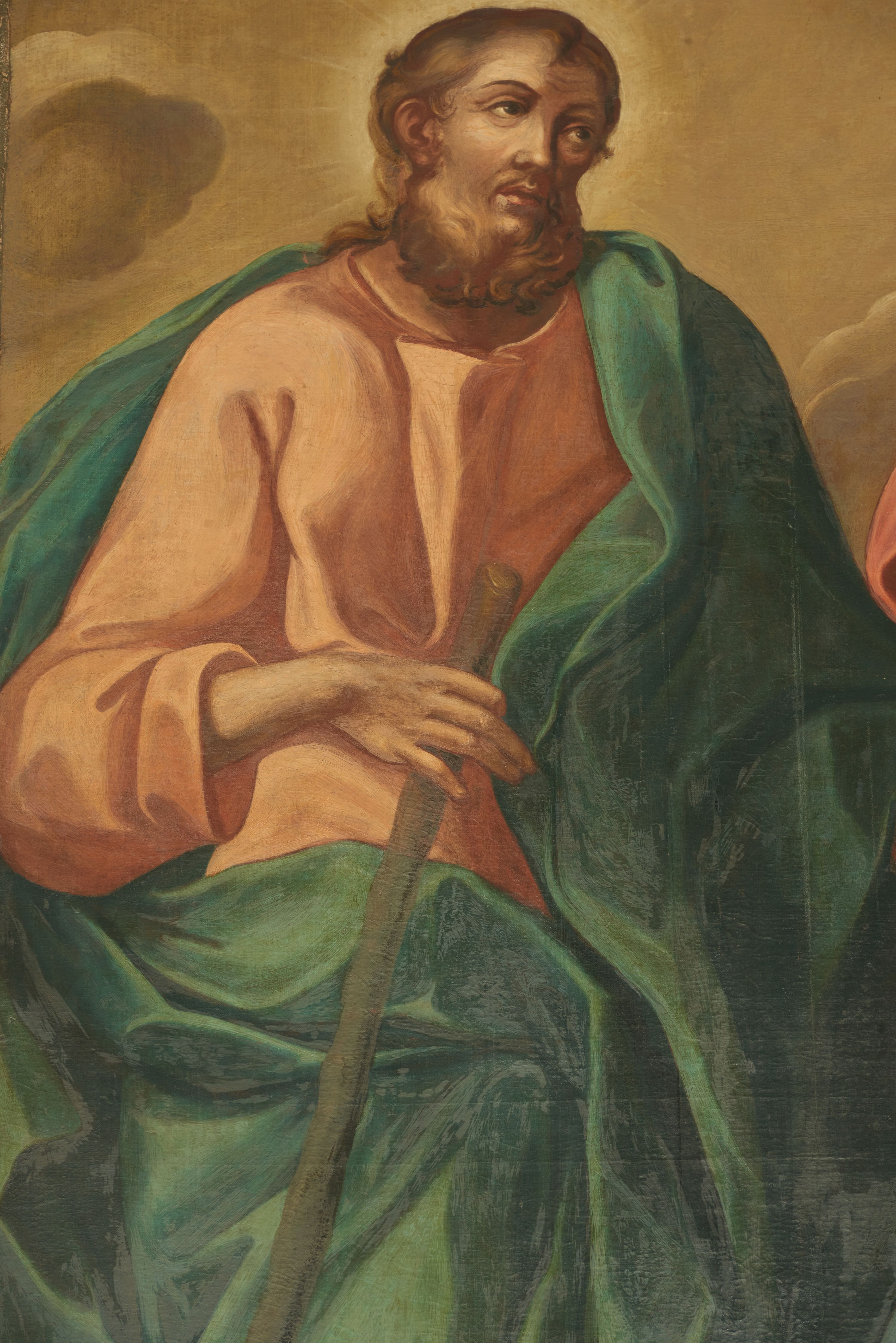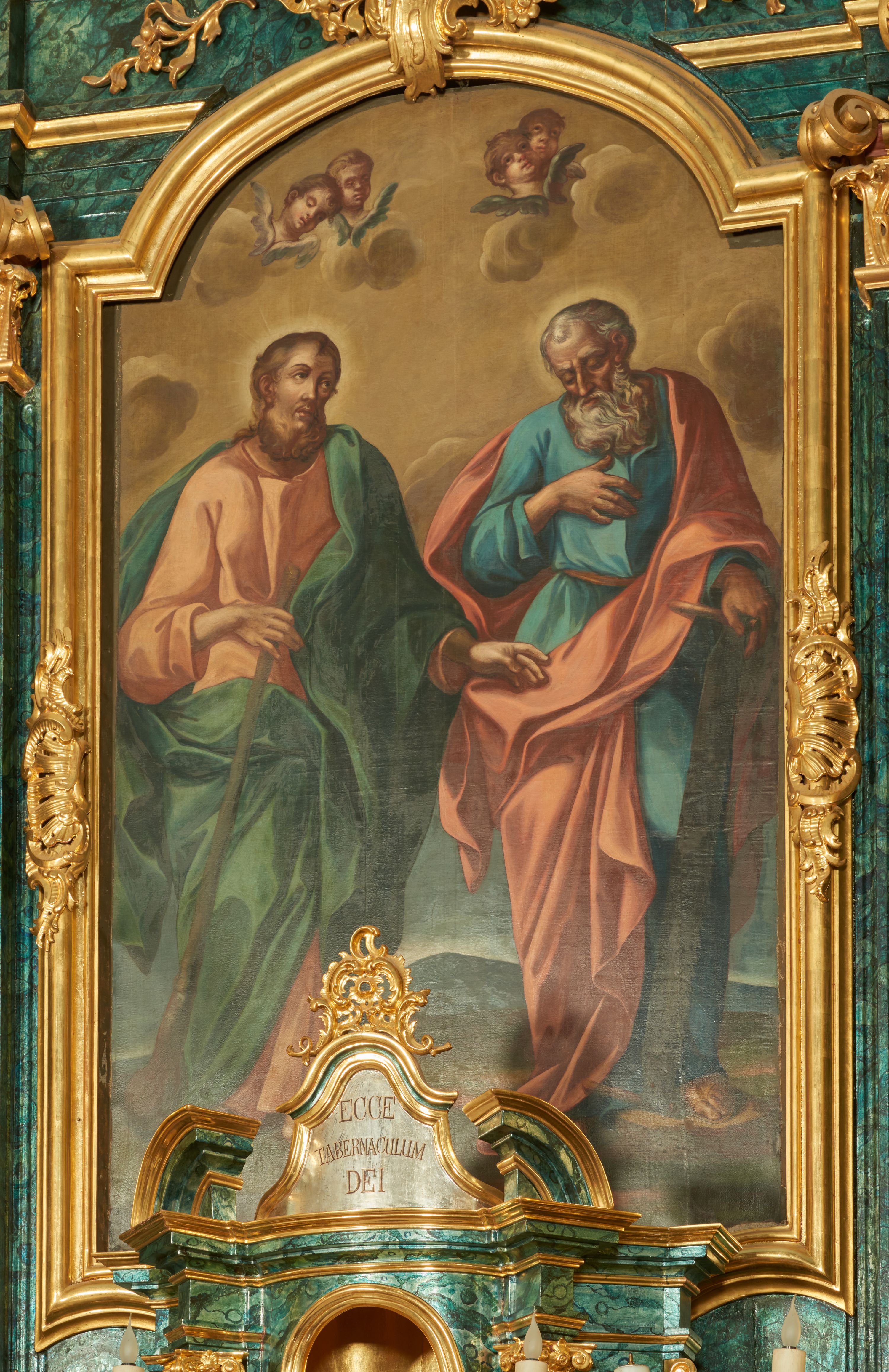 Święci Szymon i Judy Tadeusz ukazani na omawianym obrazie według tradycji byli braćmi. Po rozesłaniu apostołów wspólnie głosili ewangelię nad Morzem Czerwonym i w Egipcie lub w Babilonii i Palestynie. Mieli razem ponieść śmierć męczeńską, dlatego często przedstawiani są wspólnie. Szymon zginął przecięty piłą, zaś Juda poniósł śmierć od ciosów pałką lub włócznią. Narzędzia ich męki stanowią ich atrybuty.