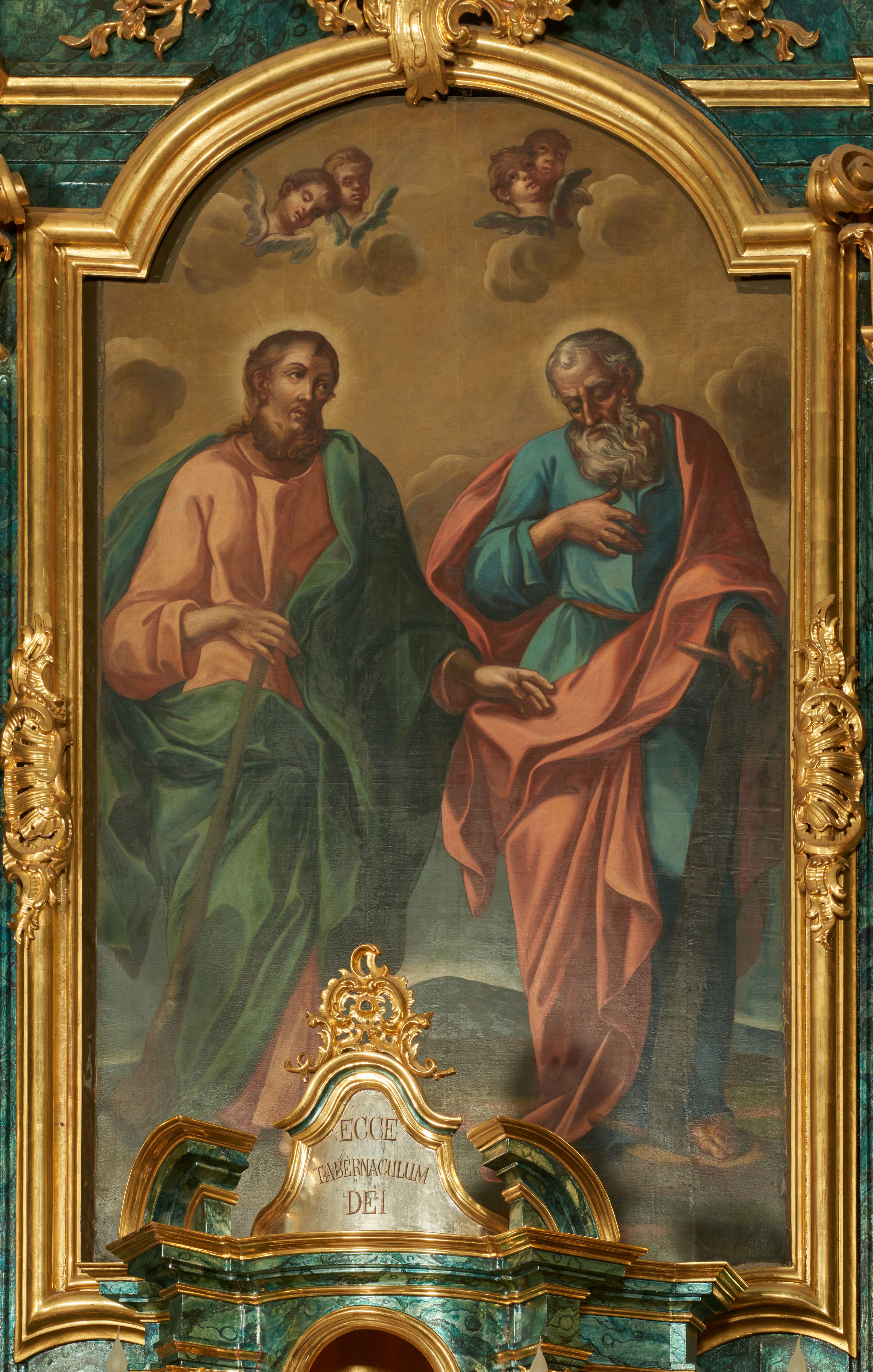 Obraz w formie stojącego prostokąta zamkniętego łukiem odcinkowym nadwieszonym z przedstawieniem świętych apostołów Szymona i Judy Tadeusza w całej postaci. Po lewej stronie obrazu św. Juda Tadeusz, zwrócony w trzech czwartych w lewo, w kontrapoście, w prawej ugiętej ręce trzyma pałkę opartą o ziemię, lewą wyciąga przed siebie. Twarz ma pociągłą, szczupłą, niskim czole, dużych, okrągłych oczach, wąskim nosie i pełnych ustach; okoloną gęstymi i kręconymi, brązowymi włosami i brodą. Ubrany jest w jasnoczerwoną tunikę oraz obfity niebieski płaszcz przewiązany diagonalnie przez lewe ramię. Po prawej stronie obrazu św. Szymon ukazany frontalnie, w kontrapoście, z pochyloną głową, prawą rękę kładzie na piersi, lewą, ugiętą kładzie na pile opartej o ziemie. Twarz ma pociągłą, szczupłą, o starczych rysach, niskim czole, dużych, okrągłych oczach skierowanych w dół, garbatym nosie i pełnych ustach; okoloną gęstymi i kręconymi, siwymi włosami i brodą. Ubrany jest w niebieska tunikę przepasaną w talii oraz czerwony płaszcz przewiązany diagonalnie przez lewe ramię. Postacie ukazane na tle górzystego pejzażu z obniżonym horyzontem, z niebiesko-żółtym niebem wypełnionym obłokami z czterema uskrzydlonymi główkami anielskimi.