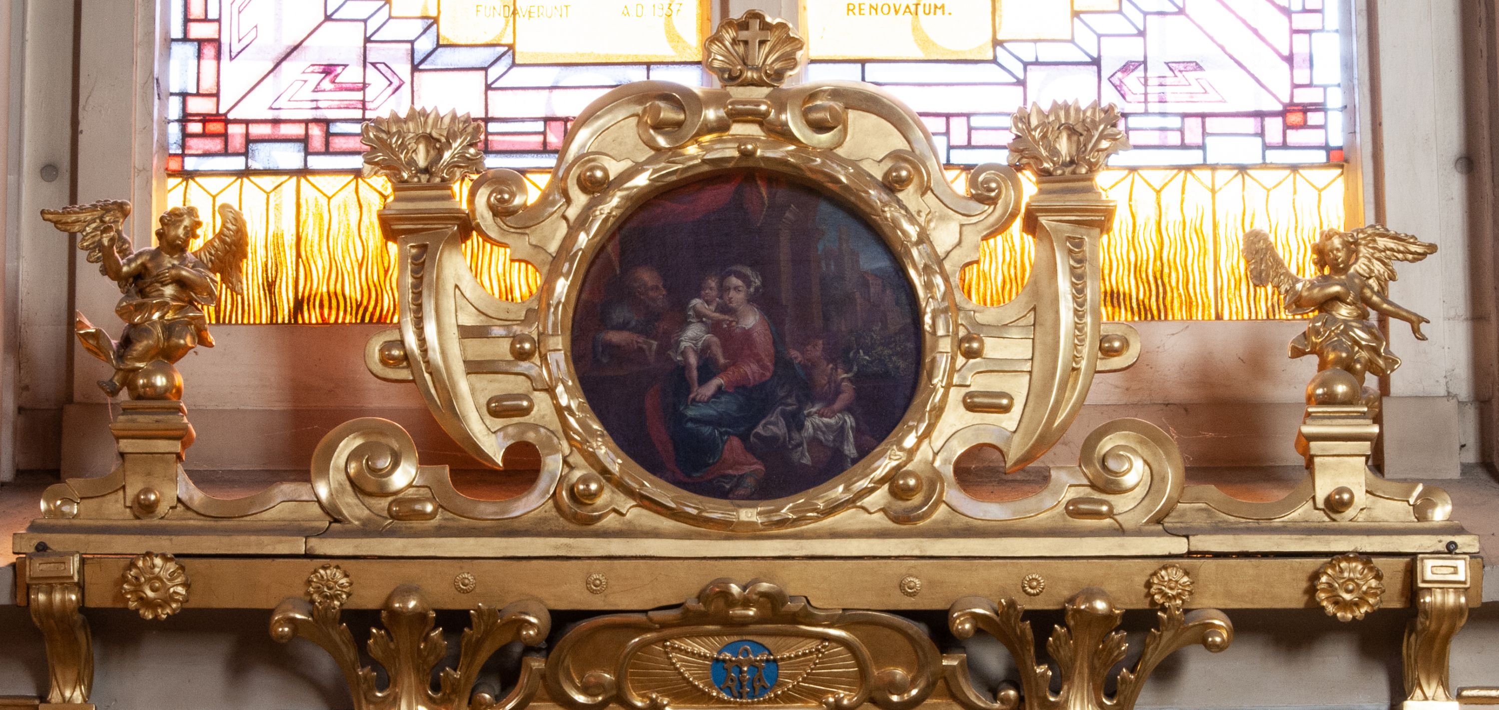 Obraz w kształcie koła (tondo) z przedstawieniem Świętej Rodziny. Pośrodku kompozycji ukazana Matka Boska w pozycji siedzącej, która podtrzymuje stojące na jej kolanach Dzieciątko, lewą ręką ujmując go za nóżkę. Ubrana w szeroką, czerwoną suknię z białym kołnierzem oraz szafirowy płaszcz. Dzieciątko, przewiązane w pasie białą pieluszką, obejmuje Marię za szyję. Po lewej siedzi święty Józef zwrócony ku scenie środkowej. Święty odziany w niebieską suknię i czerwony płaszcz. Po drugiej stronie, obok Marii, aniołek. Ponad postaciami podwieszona czerwona draperia. W tle pejzaż z widokiem Jerozolimy i niebieskie niebo. Obraz ujęty w ramę z wieńca laurowego, otoczonego ażurowym ornamentem o motywie okuciowym, z kwiatonami po bokach i krzyżem w muszli na szczycie.