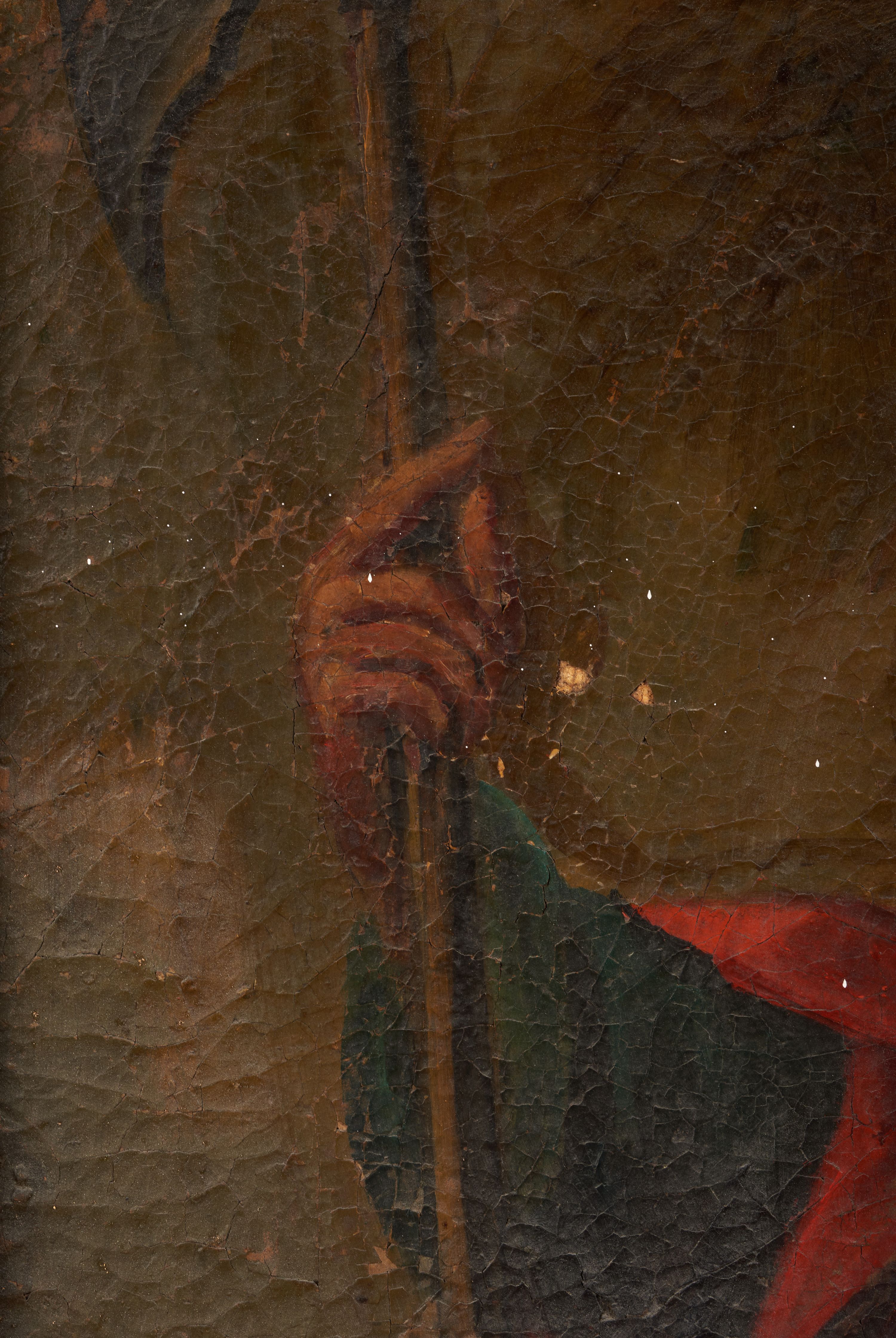 Obraz o kształcie stojącego prostokąta. Cało postaciowe przedstawienie św. Jakuba młodszego ujętego frontalnie, z głową zwróconą w prawą stronę. Twarz starszego mężczyzny, pociągła, z długim nosem, okolona średniej długości, kręconymi włosami i zarostem w kolorze brązowym. W lewej, wspartej na biodrze ręce trzyma zamkniętą księgę, a prawą, uniesioną do góry wspiera się na kiju. Ubrany jest w ciemnozieloną szatę oraz czerwony okrywający ramiona, spięty pod szyją płaszcz. Spod sukni wystają bose stopy. Tło stanowi pejzaż w odcieniu oliwkowym.