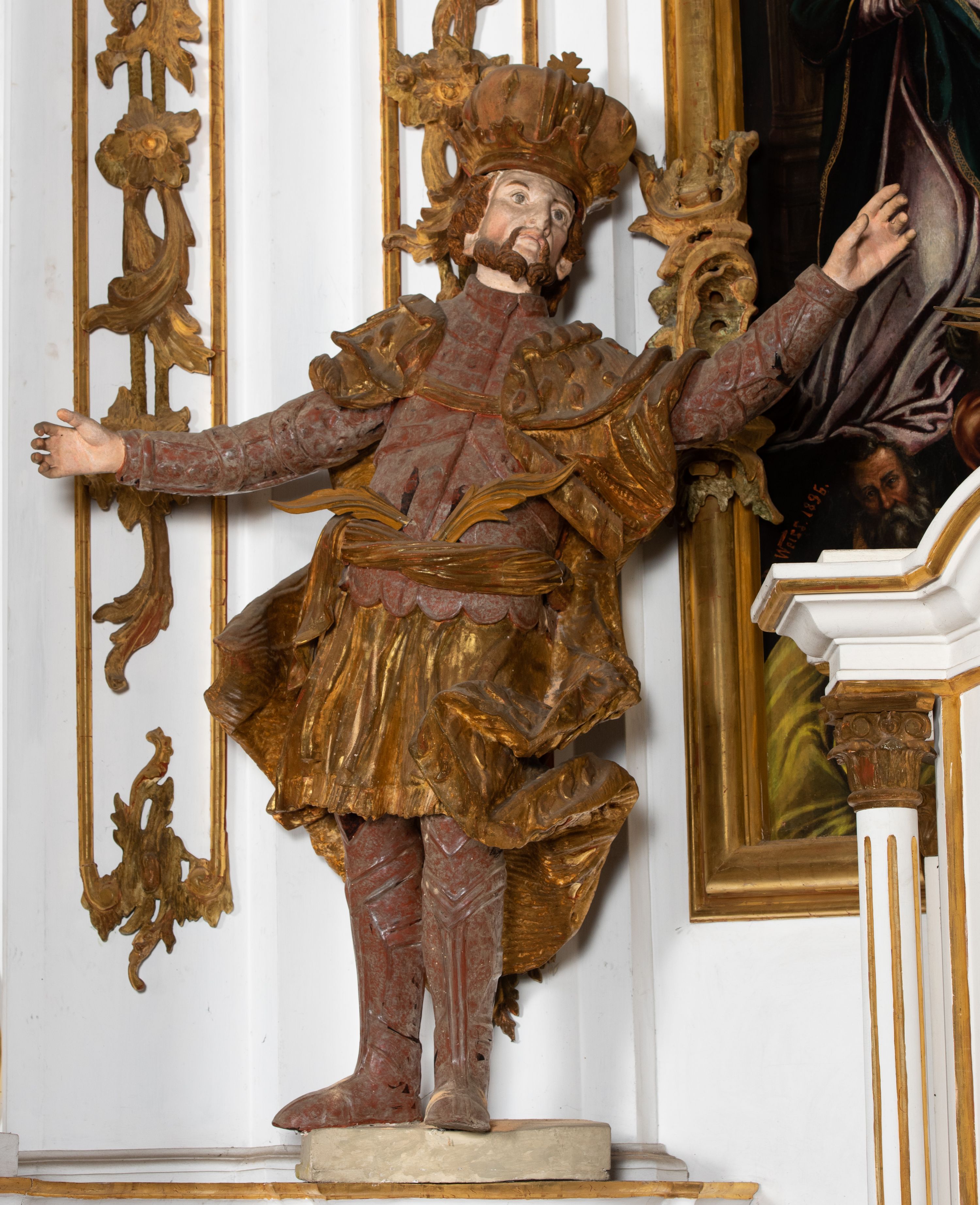 Rzeźba anonimowego świętego króla stanowi część ołtarz głównego powstałego w kręgu działającego w Krakowie i w Małopolsce Johanna Georga Lehnera (ok. 1703-1776). Nastawa z około połowy XVIII wieku jest przypisywana utalentowanemu, lecz nadal anonimowemu "pomocnikowi Lehnera", który inspirował się rzeźbą morawską pierwszej połowy XVIII wieku.