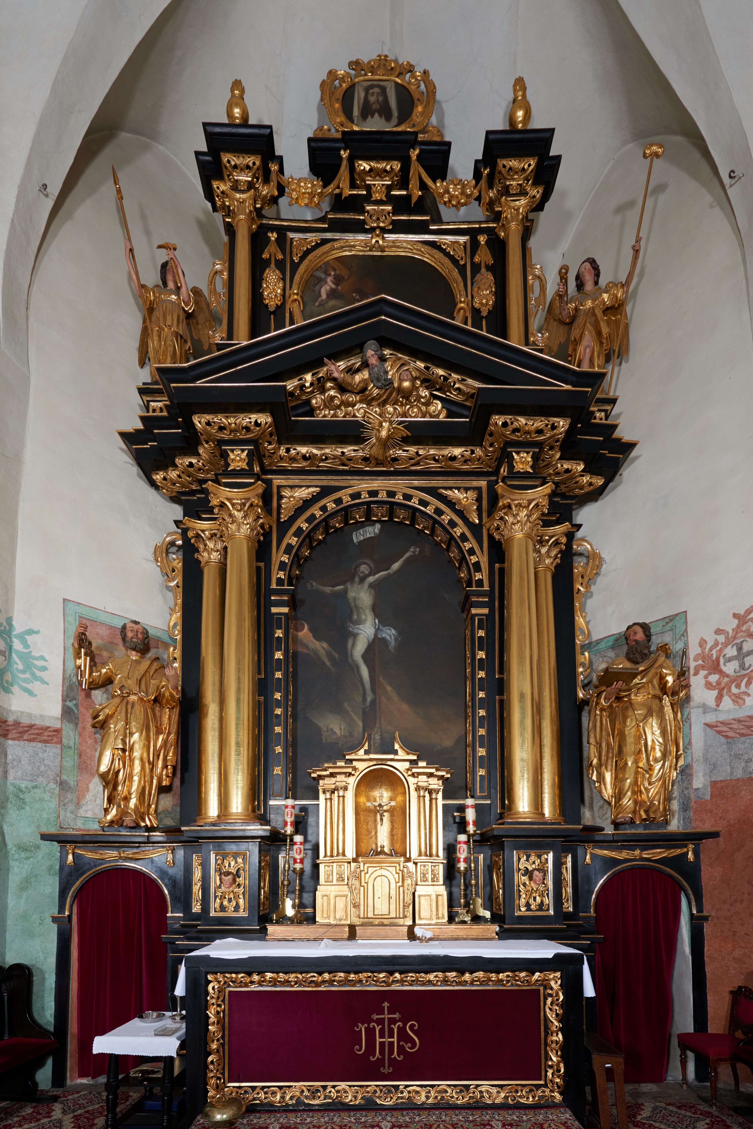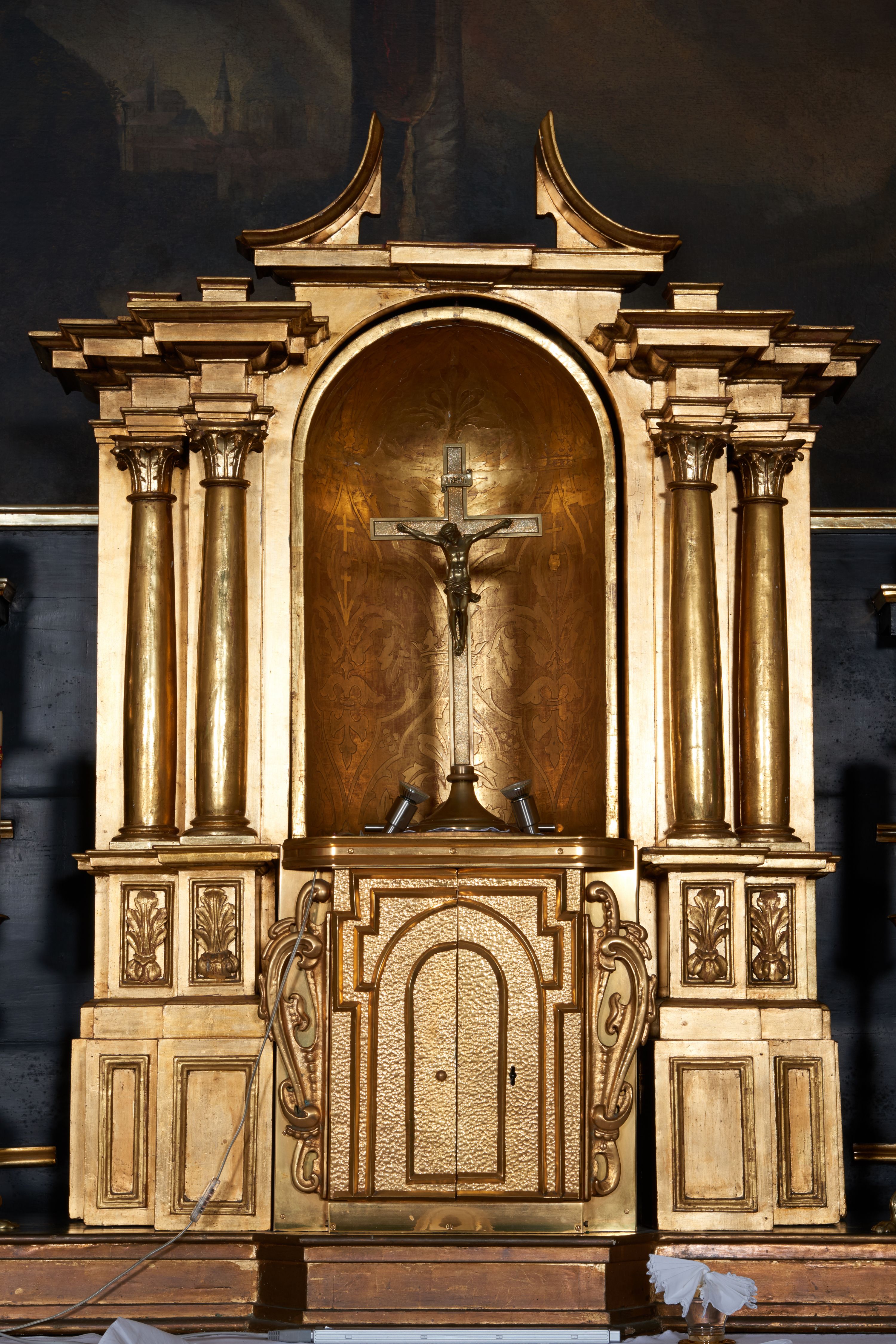 Warto zauważyć, że tabernakulum niemal odwzorowuje ołtarz w mniejszej skali. Oba w centrum mieszczą przedstawienie ukrzyżowanego Chrystusa. Struktura tabernakulum powtarza m.in. podziały pierwszej kondygnacji ołtarza wraz z układem kolumn posadowionych na wysokich cokołach, jedynie przyczółek, zamknięty w ołtarzu głównym, w tabernakulum został rozerwany i wygięty do góry.