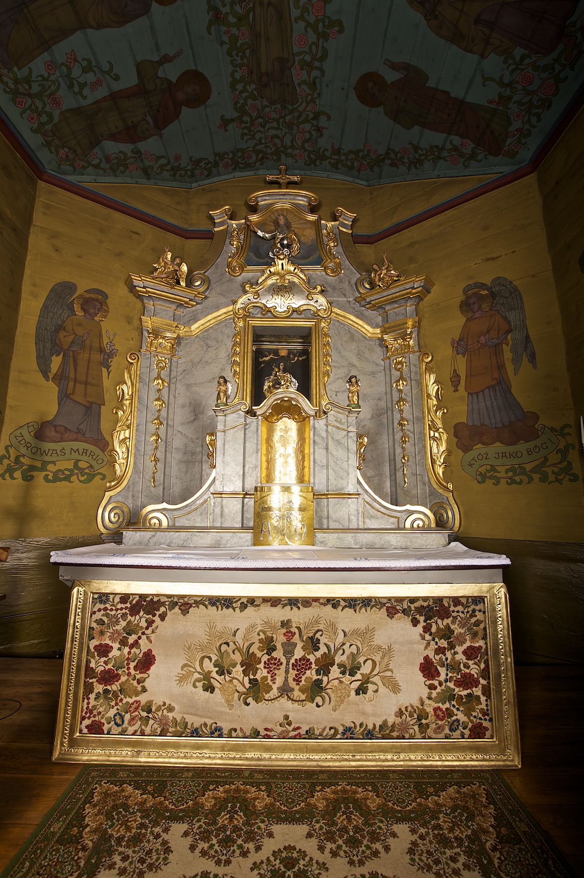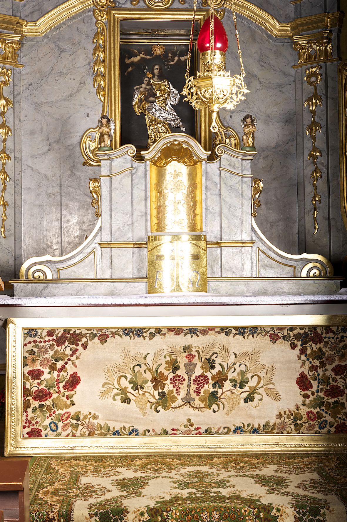 Tabernakulum w formie zbliżonej do prostopadłościennej skrzynki o wypukłej ściance frontowej ustawione na tle ścianki z tronem wystawienia ustawionej na cokole i ujętej spływami wolutowymi. Drzwiczki tabernakulum dekorowane krzyżem z glorią między literami „Α” i „Ω”. Tron wystawienia złocony, dekorowany kwiatem między stylizowanymi liśćmi i zamknięty od góry muszlą palmetową. Tron ujmują lizeny przedzielone i zwieńczone gzymsem ustawionym skośnie i zakończonym od wewnętrznej strony wolutami. Gzyms nad tronem wystawienia wyniesiony, w formie łuku nadwieszonego. Na jego zewnętrznych częściach posadowiono figurki klęczących i modlących się aniołków. Tabernakulum polichromowane na kolor jasnoszary, marmoryzowane, profile złocone.
