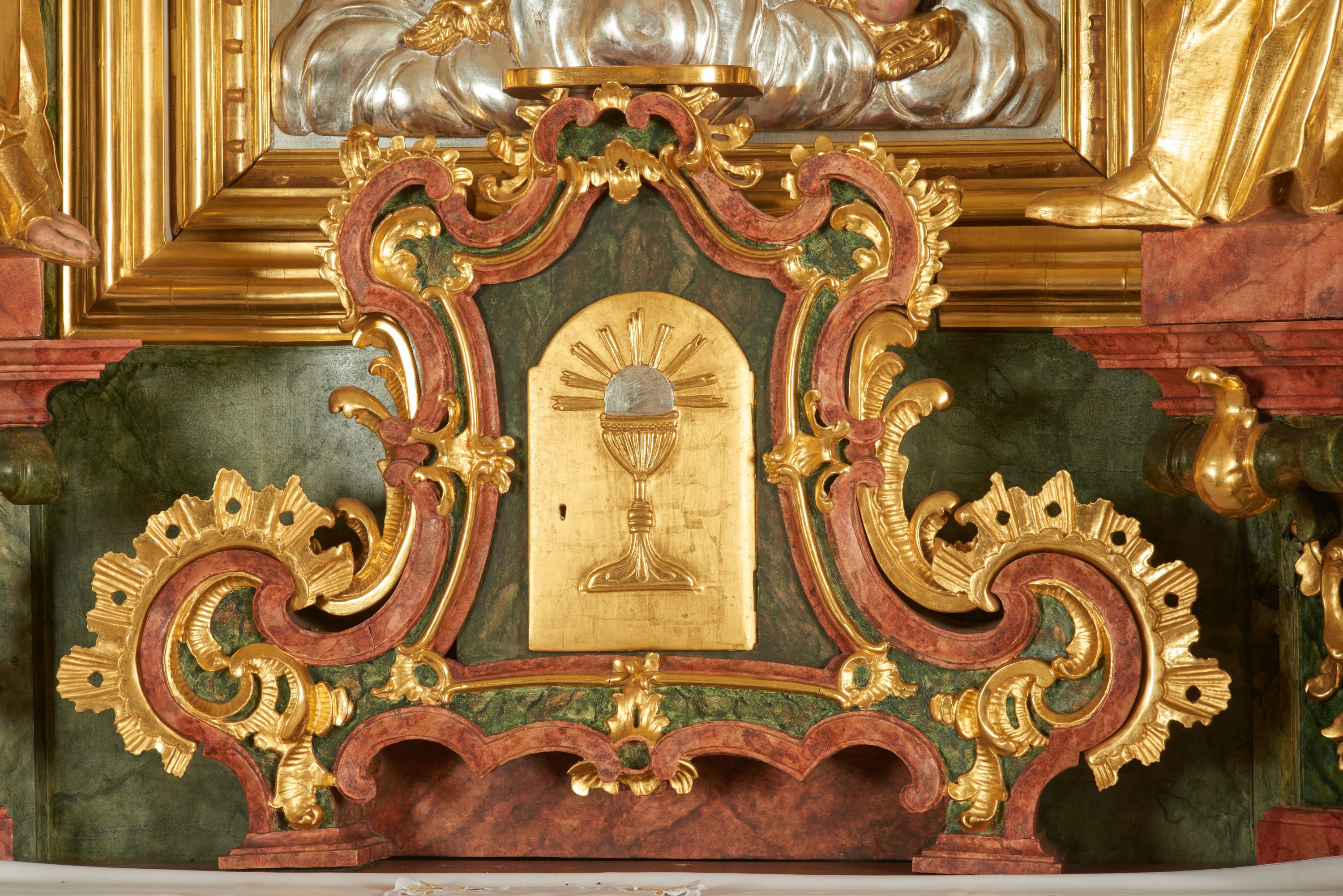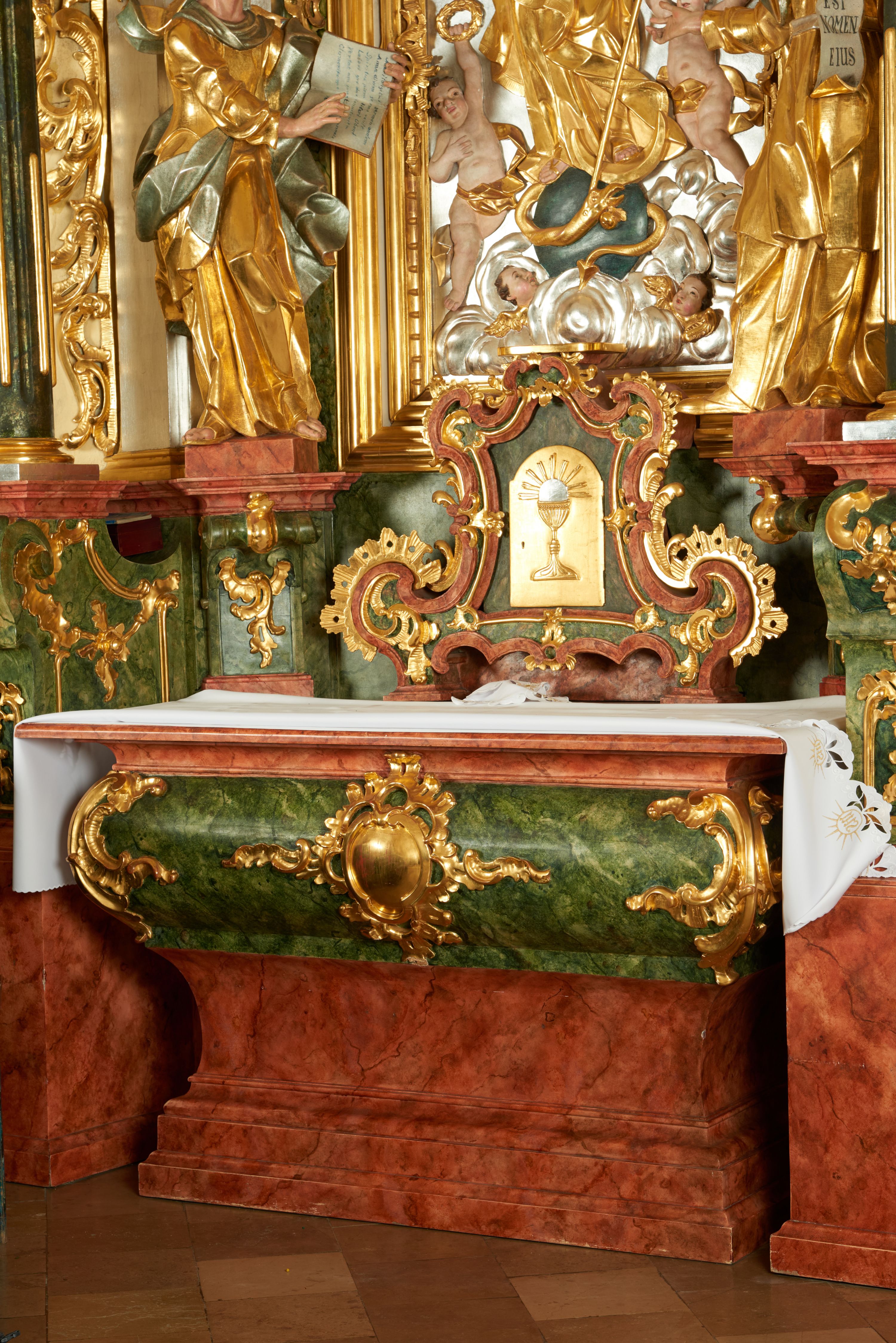 Tabernakulum w bogatej ornamentalnej oprawie, ustawione na niskim cokole. Obramienie tabernakulum utworzone z połączonych ze sobą wolut, zwężające się ku górze, bogato dekorowane ornamentem rocaille’owym. W zwieńczeniu niska podstawa służąca jako tron wystawienia. W polu głównym płycina w kształcie stojącego prostokąta o wklęsłych bokach, zamknięta łukiem wklęsło-wypukłym. Drzwiczki przyjmują kształt stojącego prostokąta zamkniętego łukiem półkolistym nadwieszonym; w polu płaskorzeźbione przedstawienie kielicha z hostią w glorii na gładkim tle. Struktura marmoryzowana w kolorze ciemnozielonym, profilowania na czerwono, ornamentyka złocona.