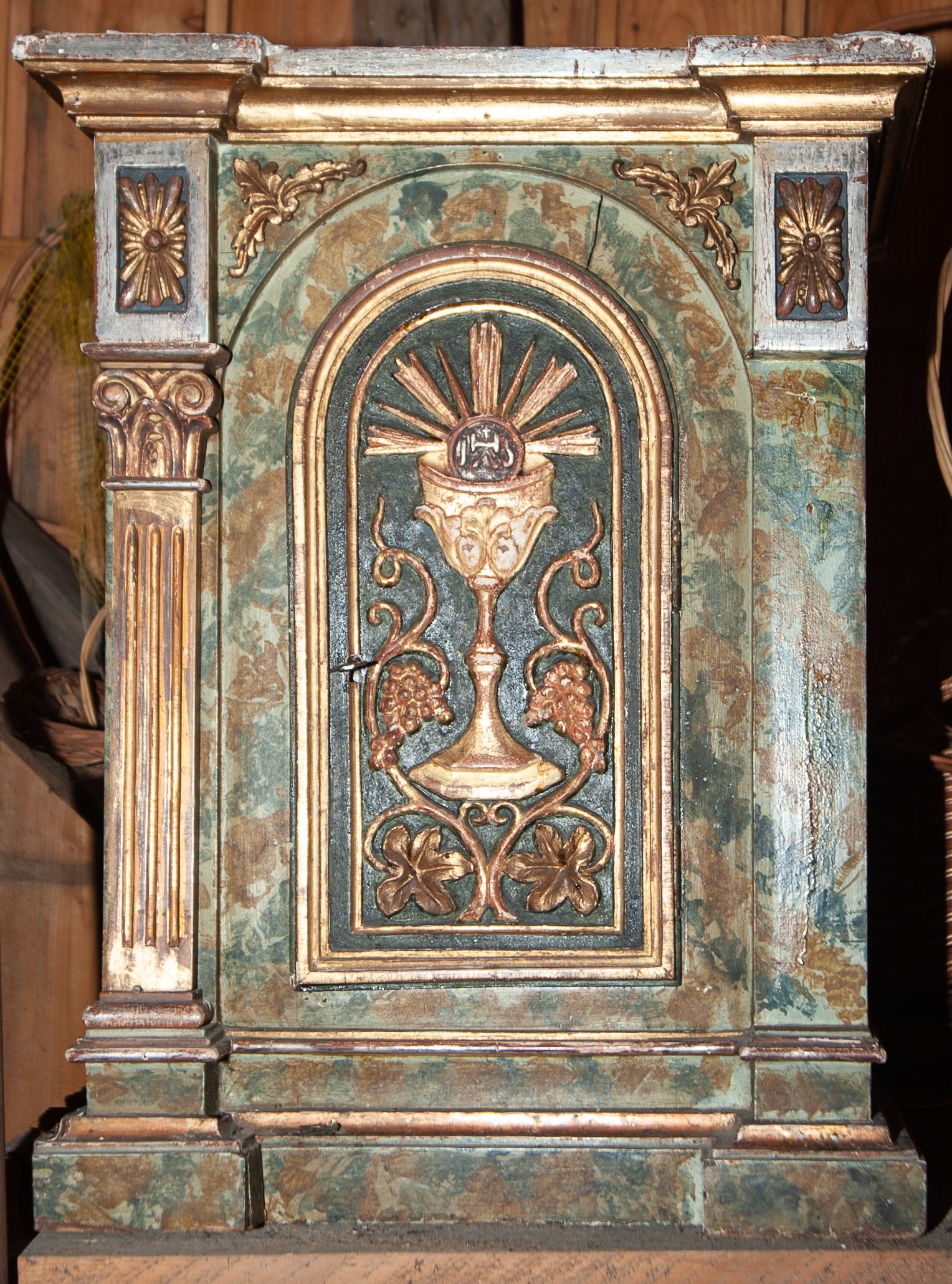 Tabernakulum w formie prostopadłościennej skrzynki, ustawione na niskim cokole, flankowane parą pilastrów podtrzymujących wyłamany gzyms. Drzwiczki w kształcie stojącego prostokąta zamkniętego łukiem półkolistym. W polu płaskorzeźbiony kielich z hostią oraz winna latorośl. W przyłuczach ścianki frontowej dekoracja ze stylizowanego akantu. Pilastry ustawione na bazach o kanelowanych trzonach i kompozytowych kapitelach. Imposty wypełnione płyciną, w polu której stylizowana i bujna rozeta. Struktura marmoryzowana w kolorze zielono-brązowym, ornamentyka i profilowania złocone.