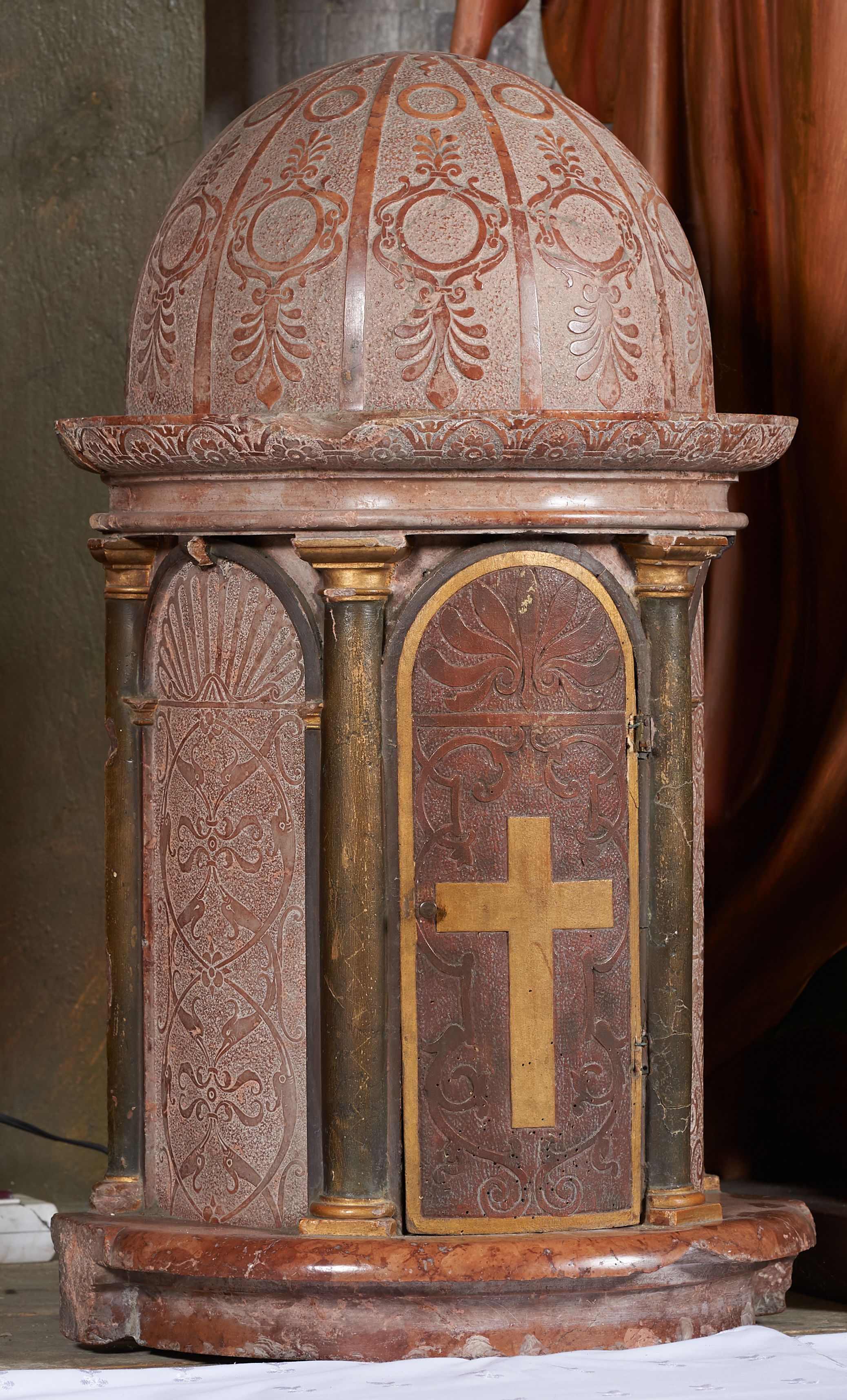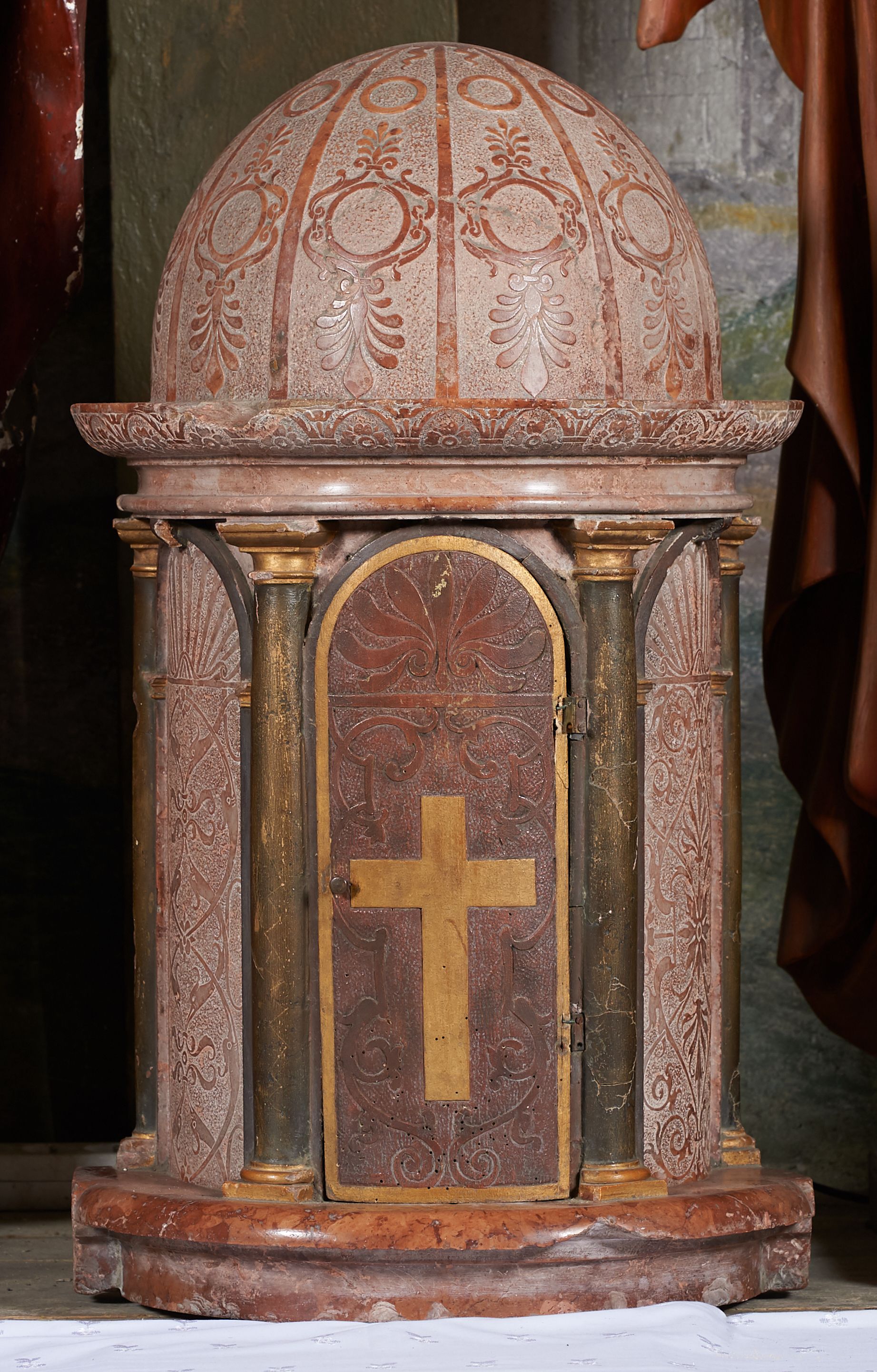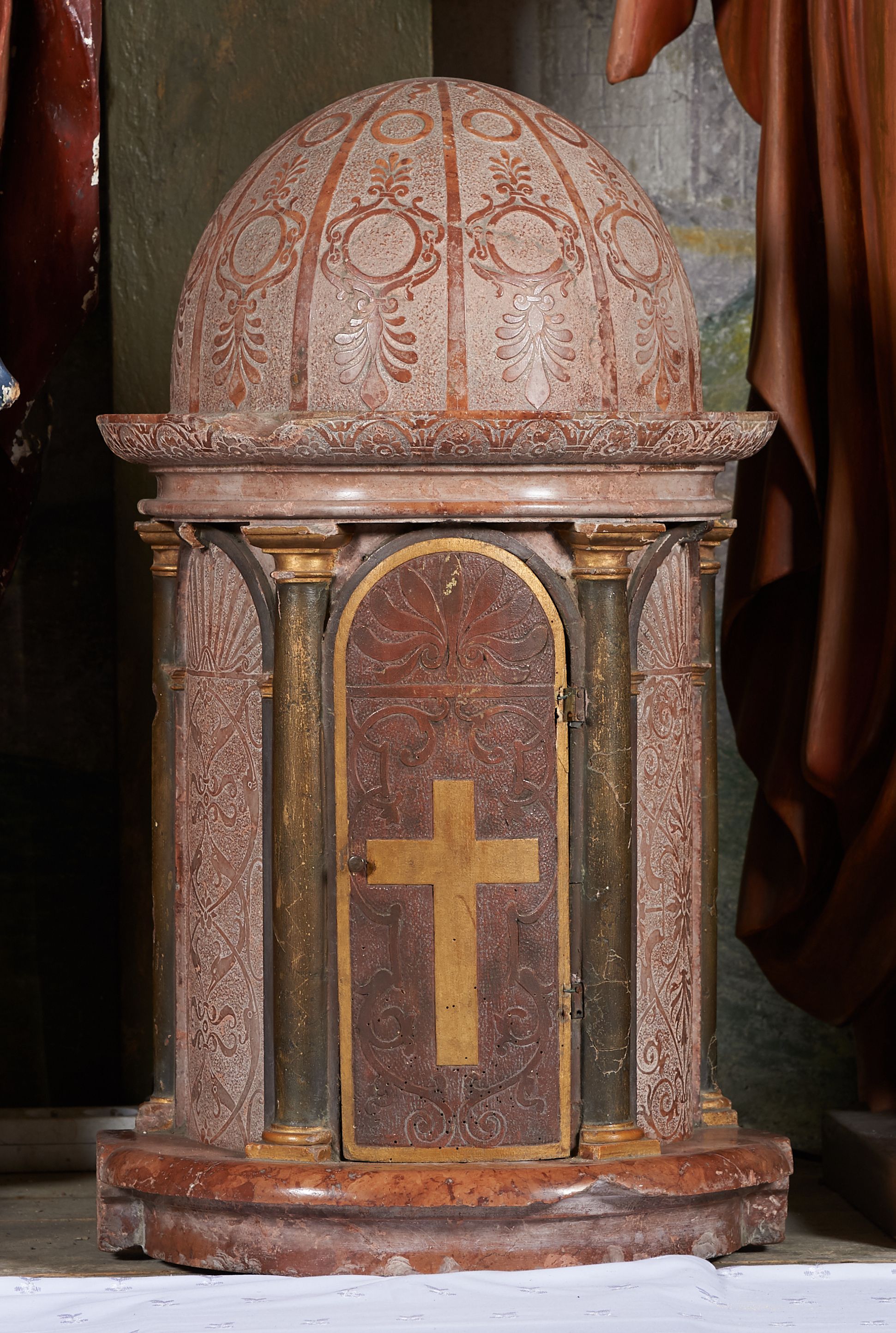 Tabernakulum na rzucie półkoła, na profilowanej podstawie, na której drewniane toskańskie kolumny podtrzymujące belkowanie z wydatnym gzymsem ozdobionym gładkimi arkadkami wypełnionymi rozetkami. Między kolumnami półkoliście zakończone drewniane arkady wypełnione ściankami. W środkowej, drewnianej, imitującej marmur, pełniącej funkcję drzwiczek, intarsjowany krzyż z jasnego drewna, otoczony symetryczną dekoracją z gładką wicią roślinną i palmetą w podłuczu.Ścianki boczne marmurowe z dekoracją groteskową (wicie arabeski przechodzące w abstrakcyjne głowy ptaków) i stylizowaną muszlą palmetową w podłuczu. Kopuła pokryta gładkimi żebrami prowadzonymi dośrodkowo, między którymi dekoracja roślinno-geometryczna.