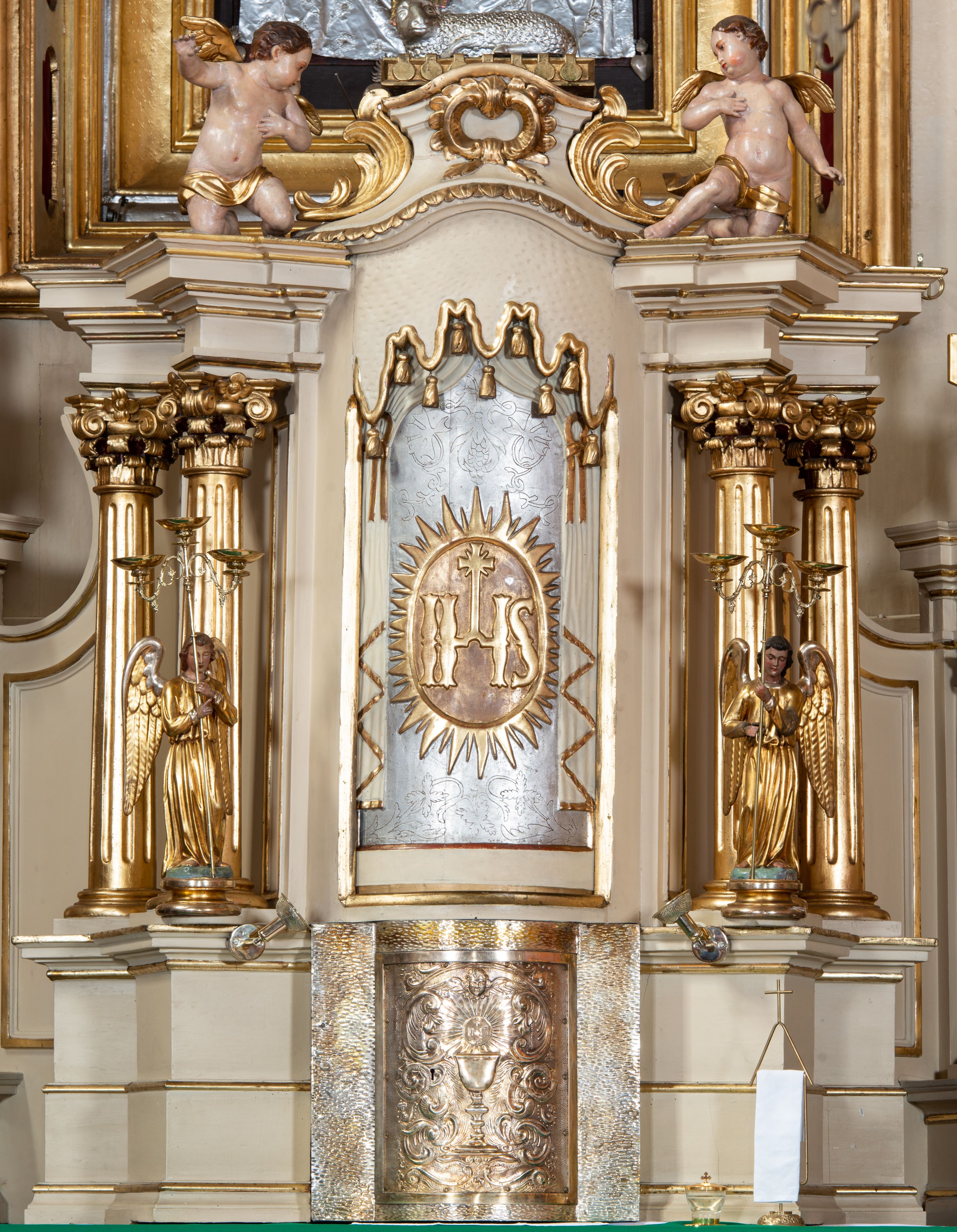 Tabernakulum w formie drewnianej, prostopadłościennej skrzynki, obitej blachą, z wypukłym frontem. Drzwiczki w kształcie stojącego prostokąta, w ramie, dekorowane przedstawieniem kielicha z hostią w glorii, ornamentem roślinnym i uskrzydloną główką anielską. Tron wystawienia ustawiony na dwustrefowym cokole, w którego partii zamontowane jest tabernakulum. Przyjmuje formę drewnianej, prostopadłościennej skrzynki z obrotową niszą, flankowaną dwiema parami kolumienek o kanelowanych trzonach, podtrzymujących fragmenty belkowania, nad niszą przyjmującego kształt falistego gzymsu, na którym znajduje się cokół dekorowany ornamentem roślinnym, z leżącym na księdze barankiem, flankowany dwoma aniołkami, Otwór niszy w formie stojącego prostokąta zamkniętego łukiem półkolistym zdobionym lambrekinem. Przed kolumienkami dwie figurki aniołów trzymających świeczniki.