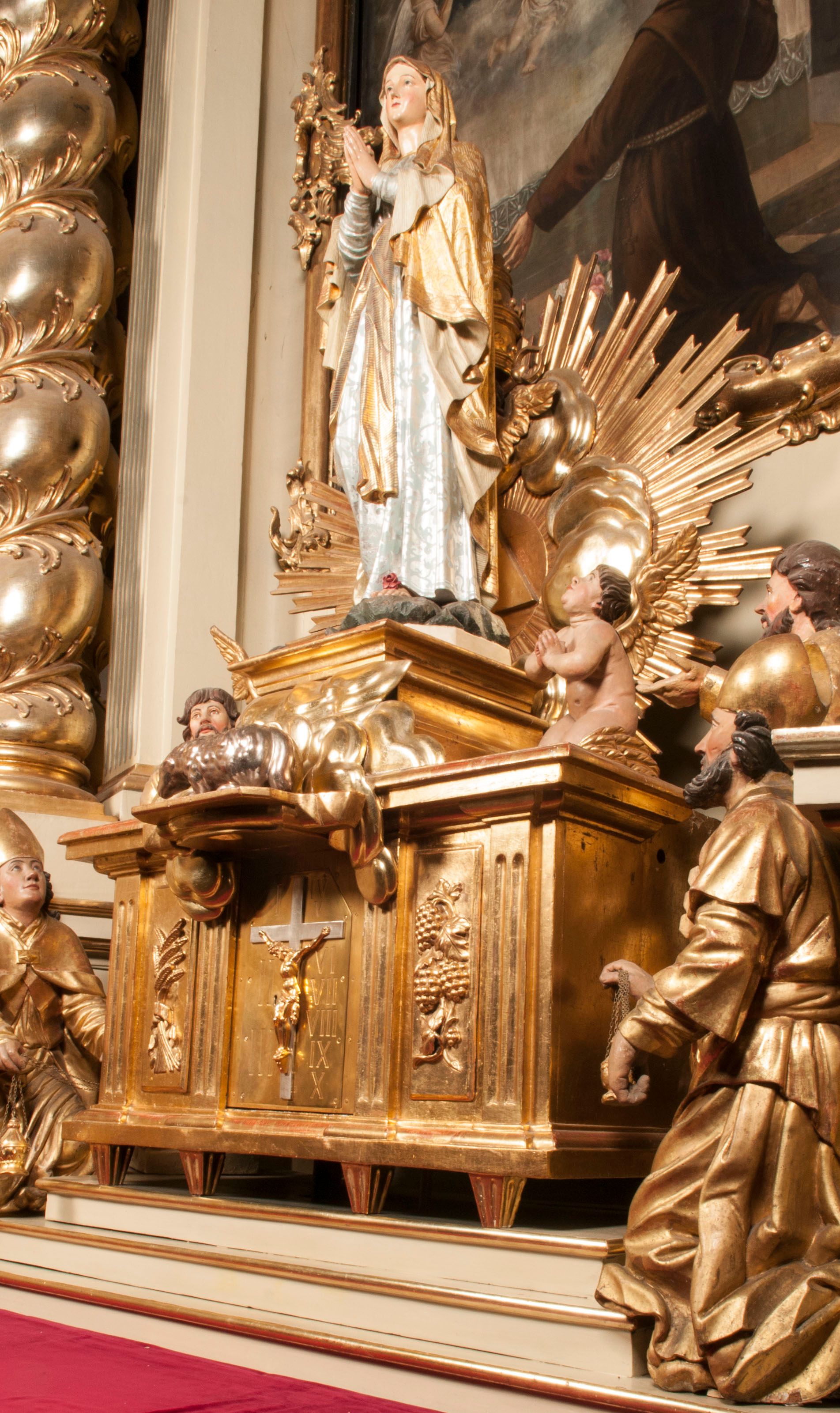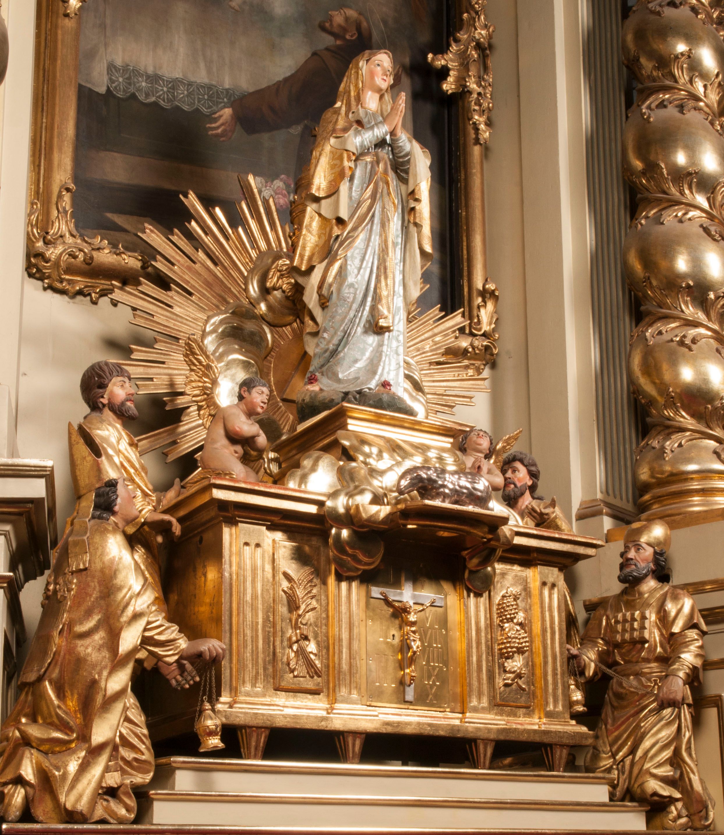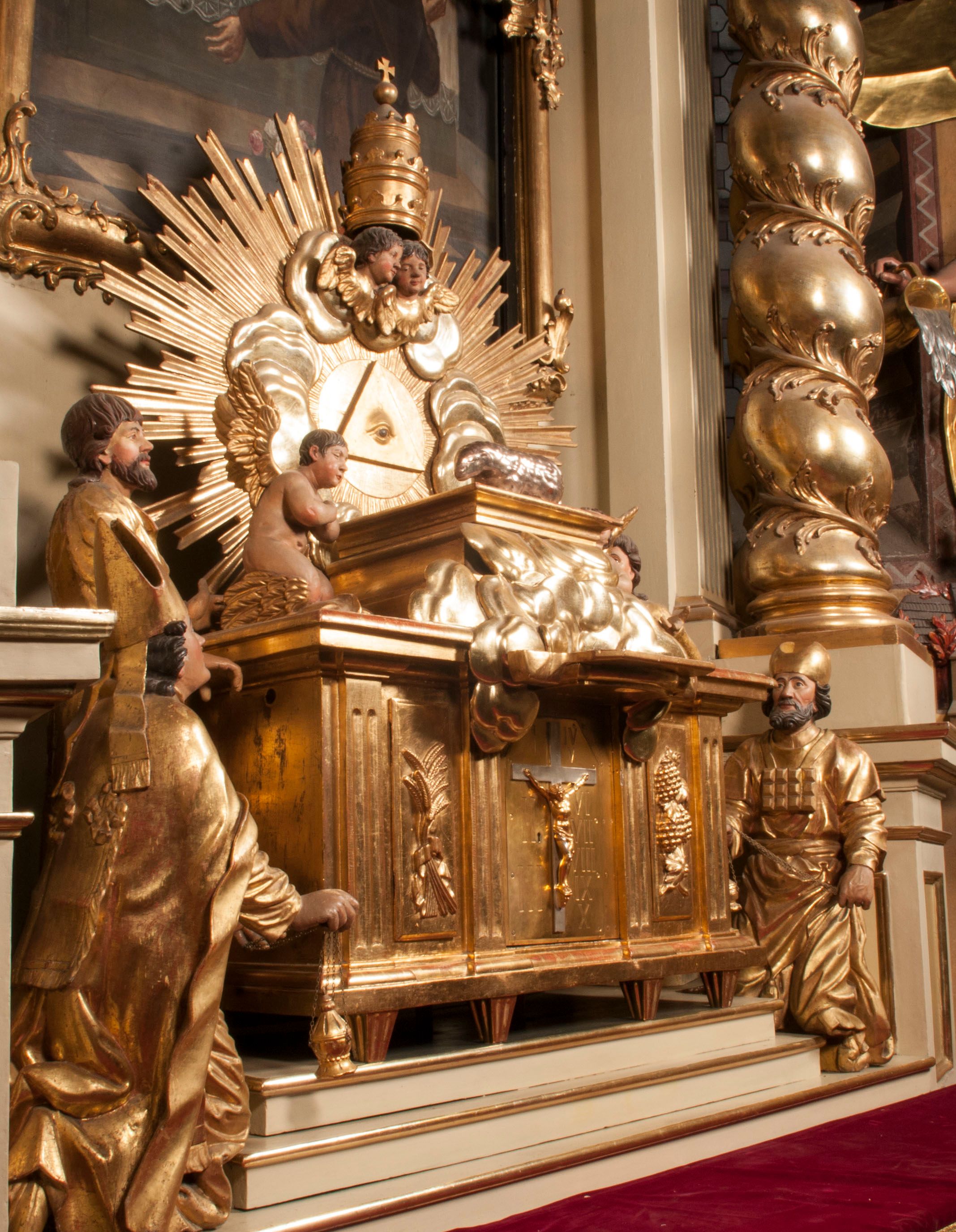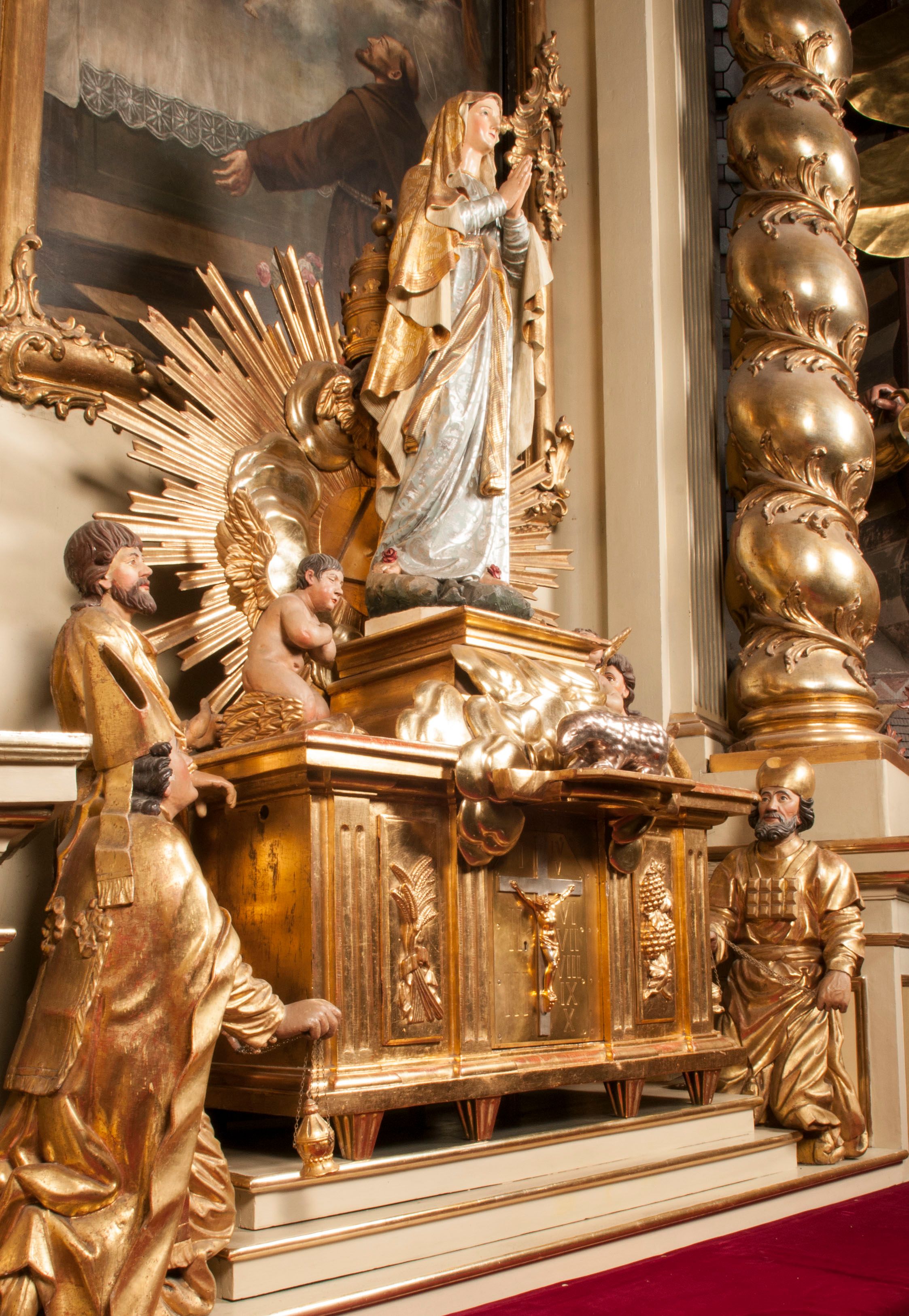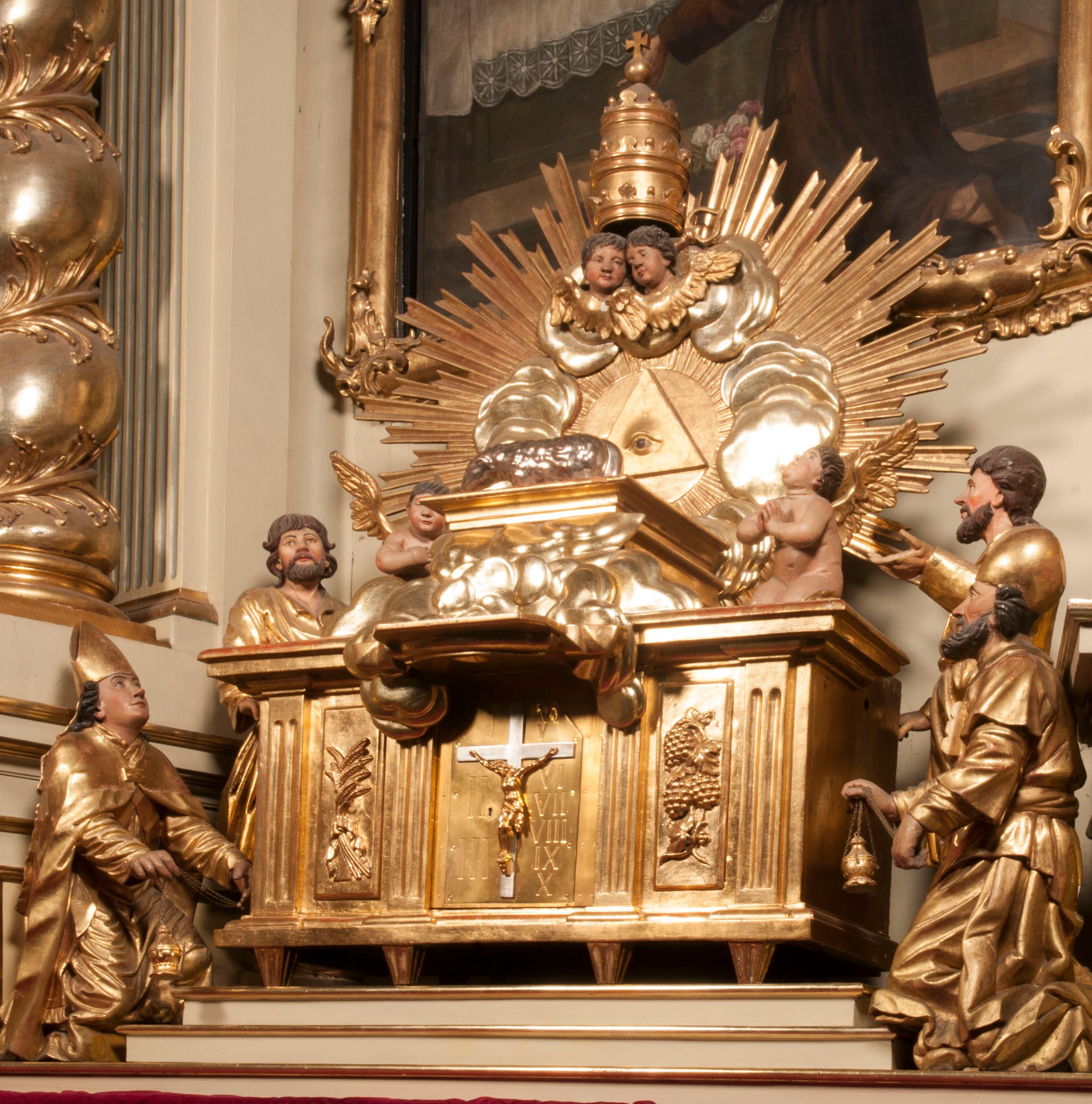 Tabernakulum w formie Arki Przymierza, adorowanej przez dwie klęczące figury starotestamentowego arcykapłana i biskupa oraz dwie stojące postacie lewitów oraz klęczące aniołów, zwieńczonej glorią promienistą z okiem Opatrzności. Wsparte na ośmiu cylindrycznych nóżkach prostopadłościenne tabernakulum jest od frontu podzielone na trzy pola wyznaczone kanelowanymi listwami. Pole środkowe stanowią drzwiczki z rytymi cyframi Dekalogu z ukrzyżowanym Chrystusem, pola boczne z wiązką pałek wodnych z jednej i winnym gronem z drugiej strony. Na skłębionych chmurach z podestem leży Baranek (obecnie w jego miejscu znajduje się figura Matki Boskiej). W tle znacznej wielkości gloria promienista z wieńcem chmur i umieszczonym w nim okiem Opatrzności oraz dwie uskrzydlone główki, nad którymi papieska tiara ze skrzyżowanymi kluczami. Po bokach Baranka dwa klęczące, uskrzydlone nagie aniołki. Obok tabernakulum dwie klęczące postacie z kadzielnicami w rękach. Postać po lewej w stroju biskupim, w albie, stule i kapie oraz infule z dwiema taśmami. Postać po prawej stronie jest ubrany w tradycyjny starotestamentowy strój – efod czyli tunikę i płaszcz wierzchni przepasany na biodrach, pektorał na piersi i zawój na głowie. Za nimi dwaj stojący lewici w tunikach przepasanych na biodrach i wysokich butach. Adorujące Baranka anioły w pozycji klęczącej z rękami skrzyżowanymi na piersi, ze skrzydłami na plecach i nogami w połowie utworzonymi ze skrzydeł.