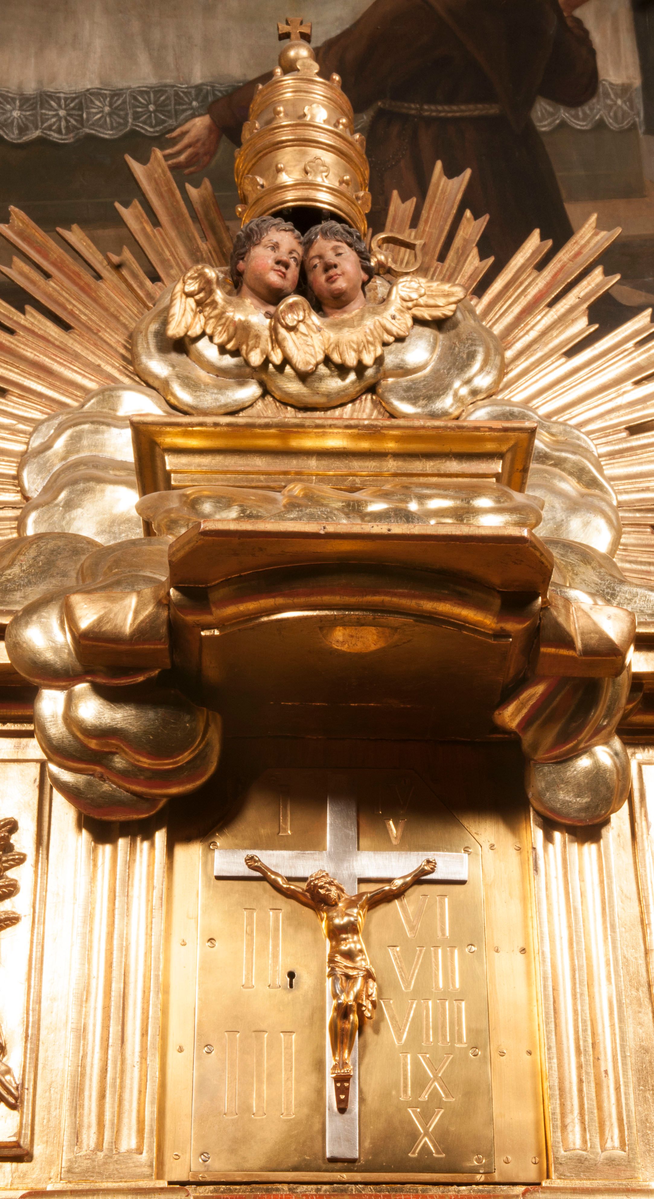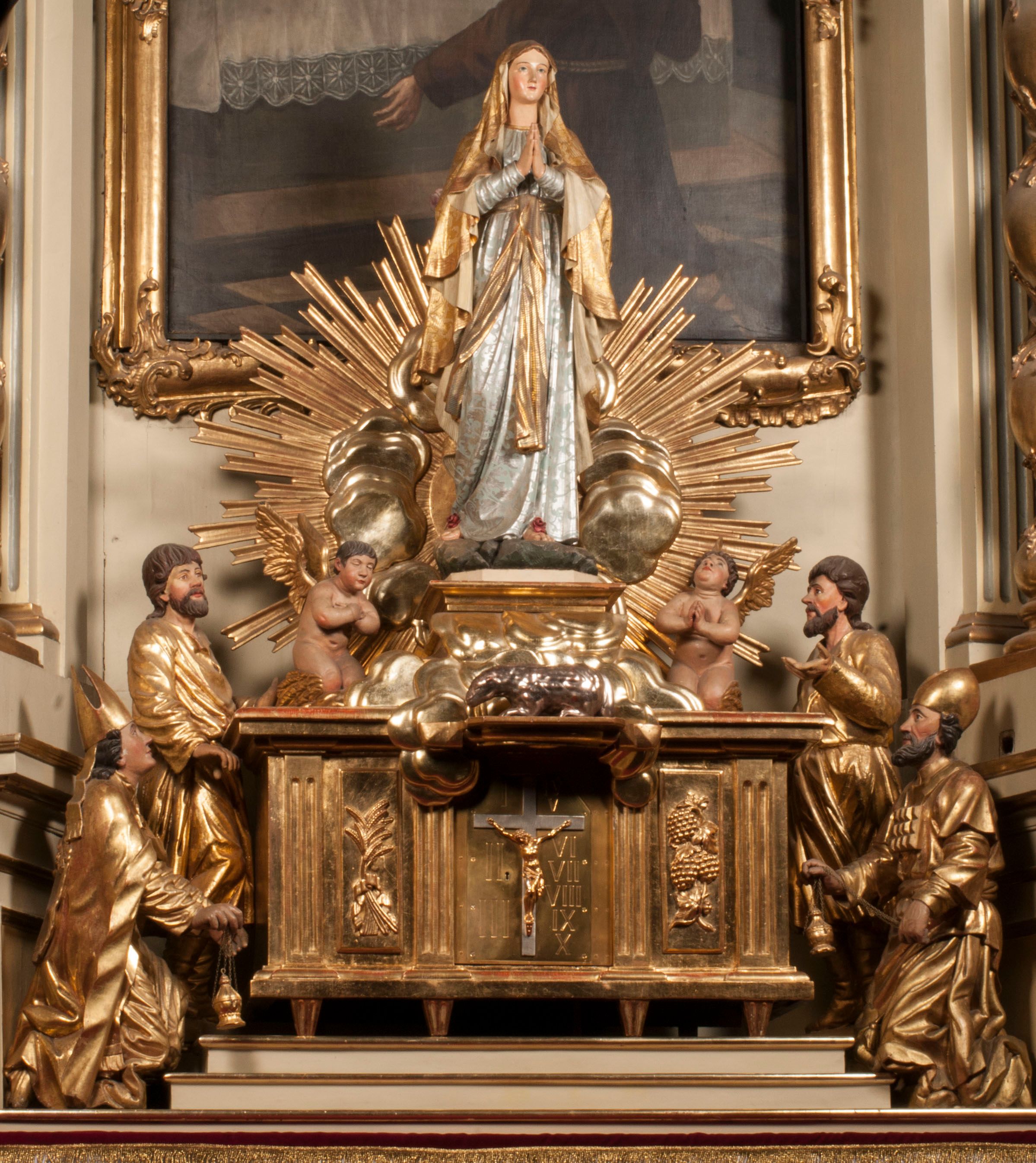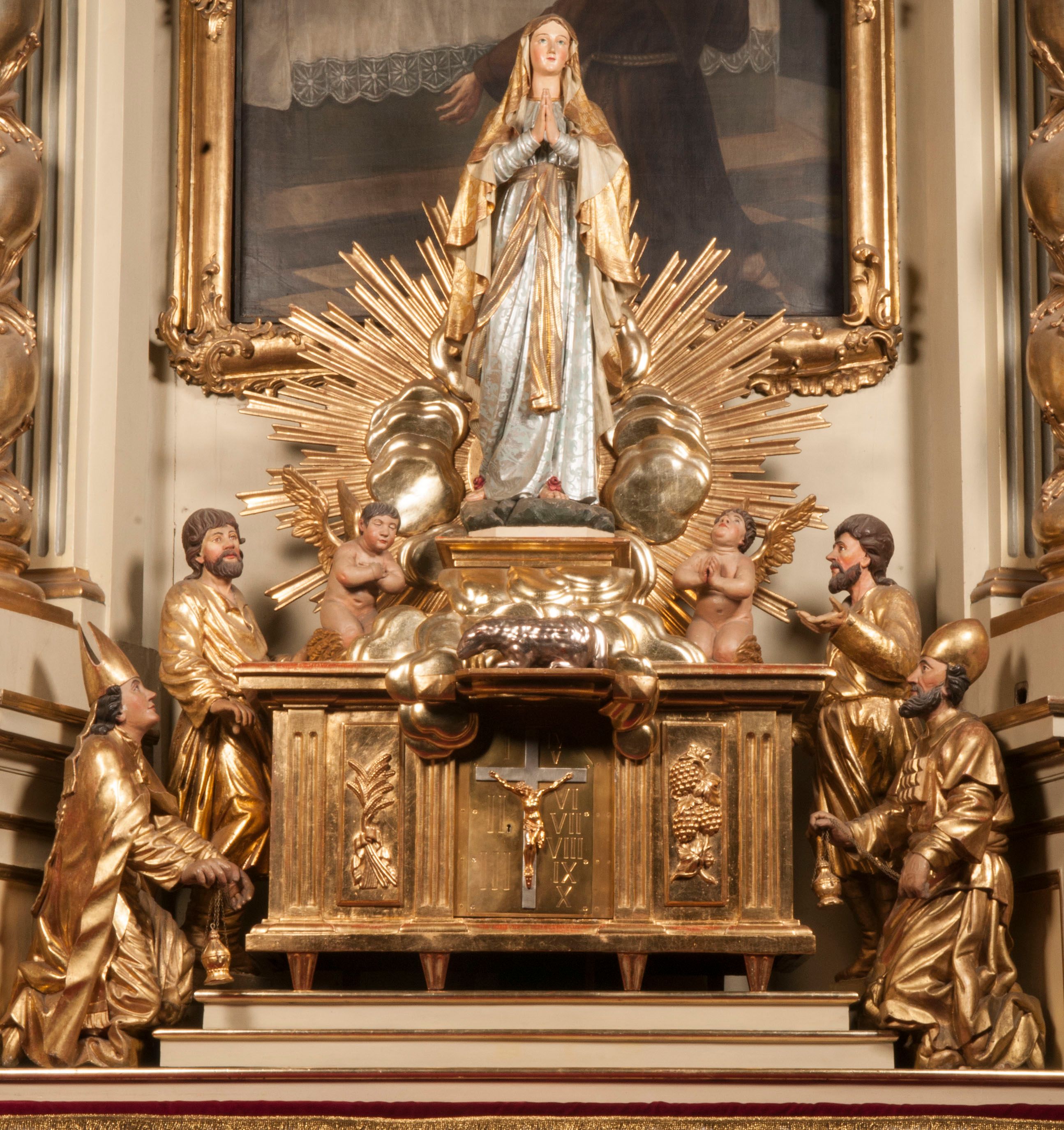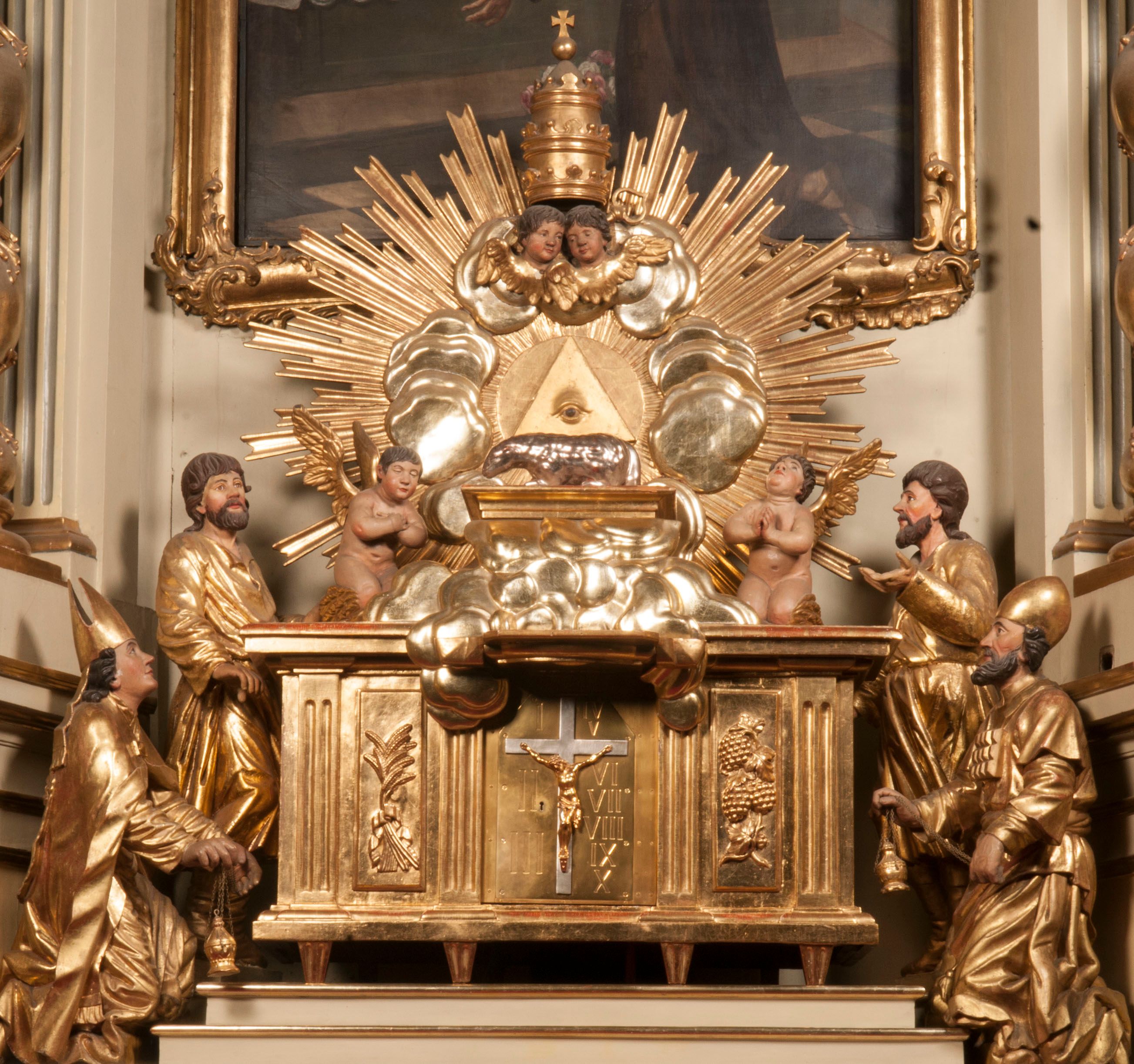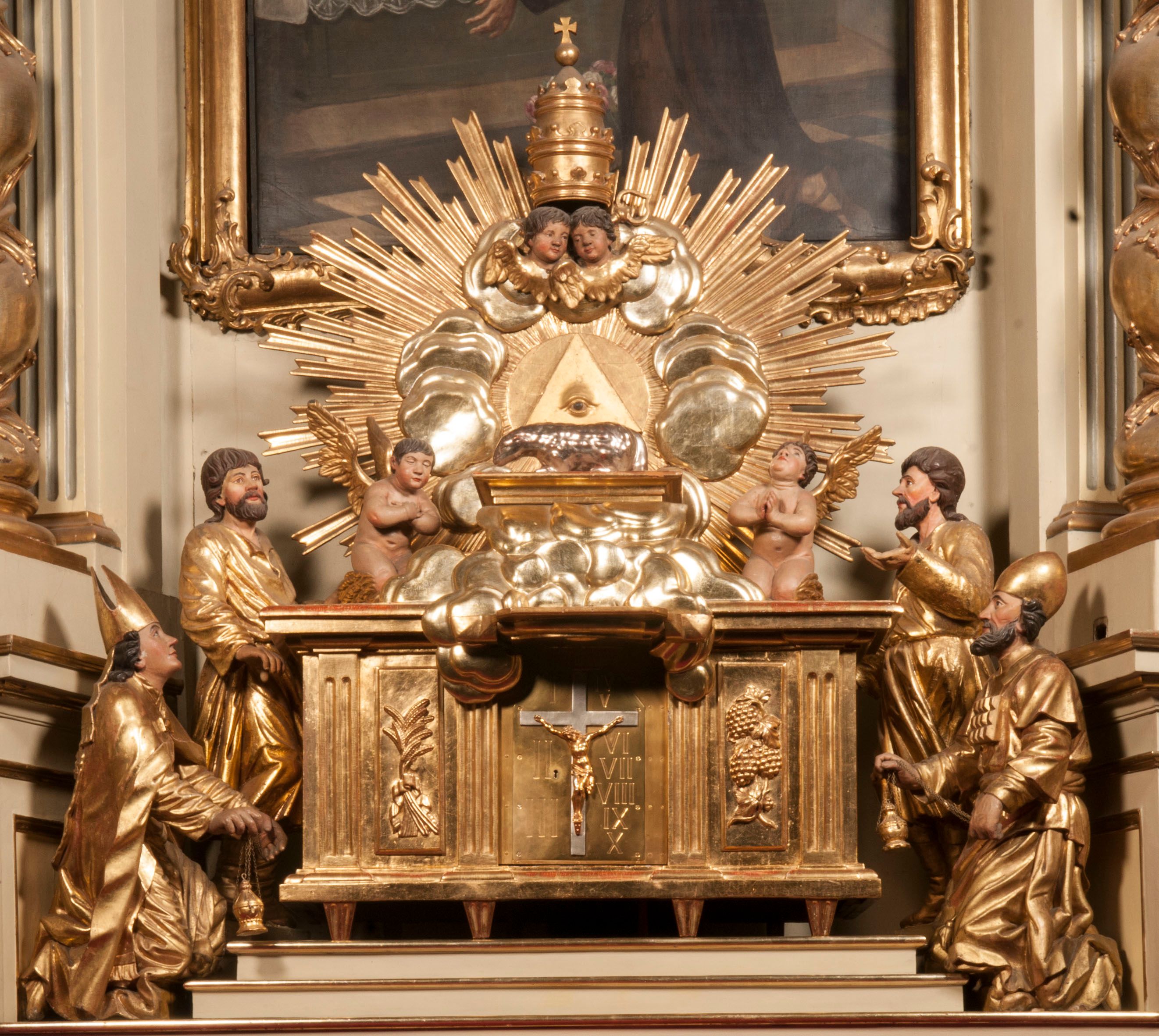 Tabernakulum w formie Arki Przymierza, adorowanej przez dwie klęczące figury starotestamentowego arcykapłana i biskupa oraz dwie stojące postacie lewitów oraz klęczące aniołów, zwieńczonej glorią promienistą z okiem Opatrzności. Wsparte na ośmiu cylindrycznych nóżkach prostopadłościenne tabernakulum jest od frontu podzielone na trzy pola wyznaczone kanelowanymi listwami. Pole środkowe stanowią drzwiczki z rytymi cyframi Dekalogu z ukrzyżowanym Chrystusem, pola boczne z wiązką pałek wodnych z jednej i winnym gronem z drugiej strony. Na skłębionych chmurach z podestem leży Baranek (obecnie w jego miejscu znajduje się figura Matki Boskiej). W tle znacznej wielkości gloria promienista z wieńcem chmur i umieszczonym w nim okiem Opatrzności oraz dwie uskrzydlone główki, nad którymi papieska tiara ze skrzyżowanymi kluczami. Po bokach Baranka dwa klęczące, uskrzydlone nagie aniołki. Obok tabernakulum dwie klęczące postacie z kadzielnicami w rękach. Postać po lewej w stroju biskupim, w albie, stule i kapie oraz infule z dwiema taśmami. Postać po prawej stronie jest ubrany w tradycyjny starotestamentowy strój – efod czyli tunikę i płaszcz wierzchni przepasany na biodrach, pektorał na piersi i zawój na głowie. Za nimi dwaj stojący lewici w tunikach przepasanych na biodrach i wysokich butach. Adorujące Baranka anioły w pozycji klęczącej z rękami skrzyżowanymi na piersi, ze skrzydłami na plecach i nogami w połowie utworzonymi ze skrzydeł.