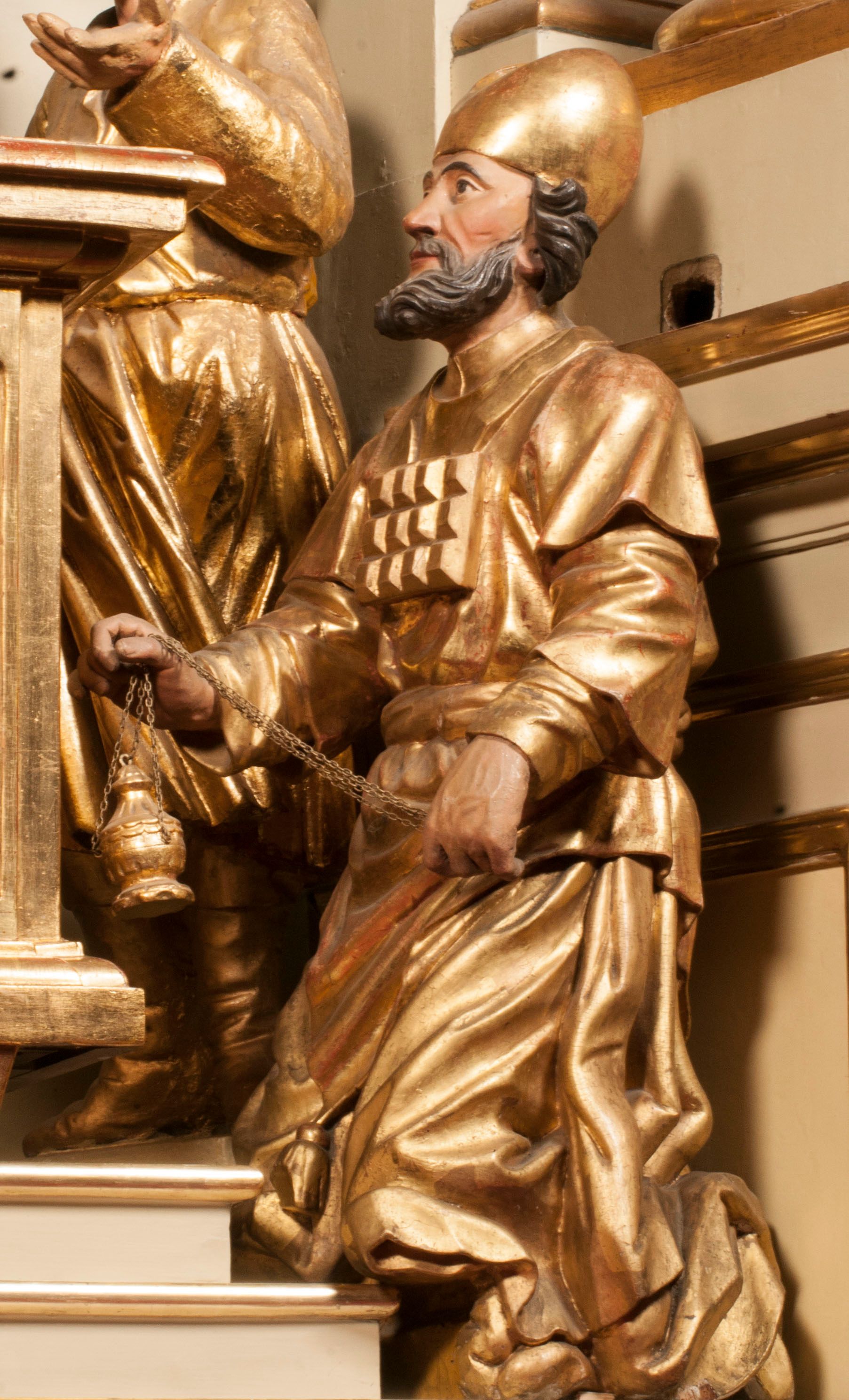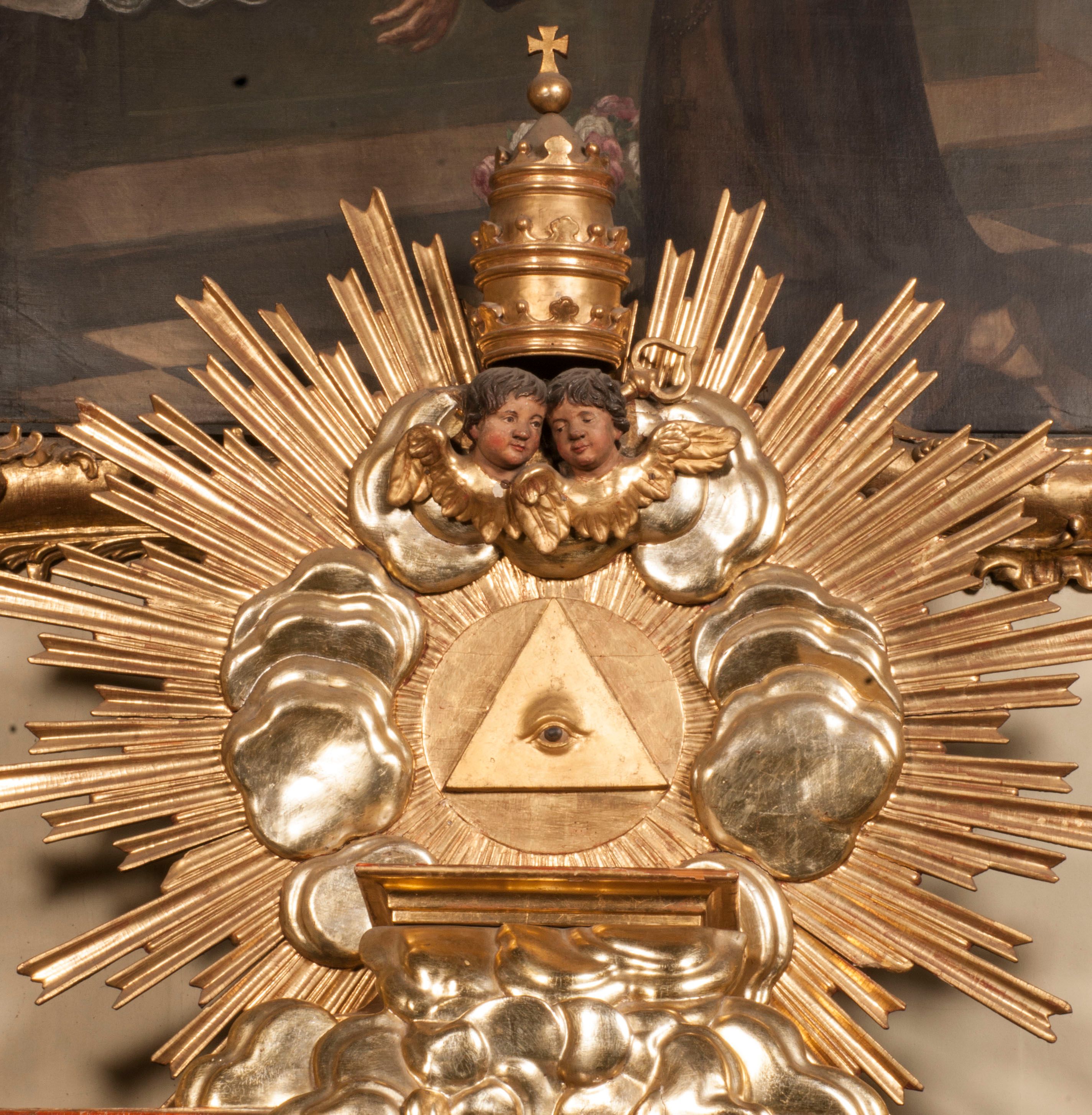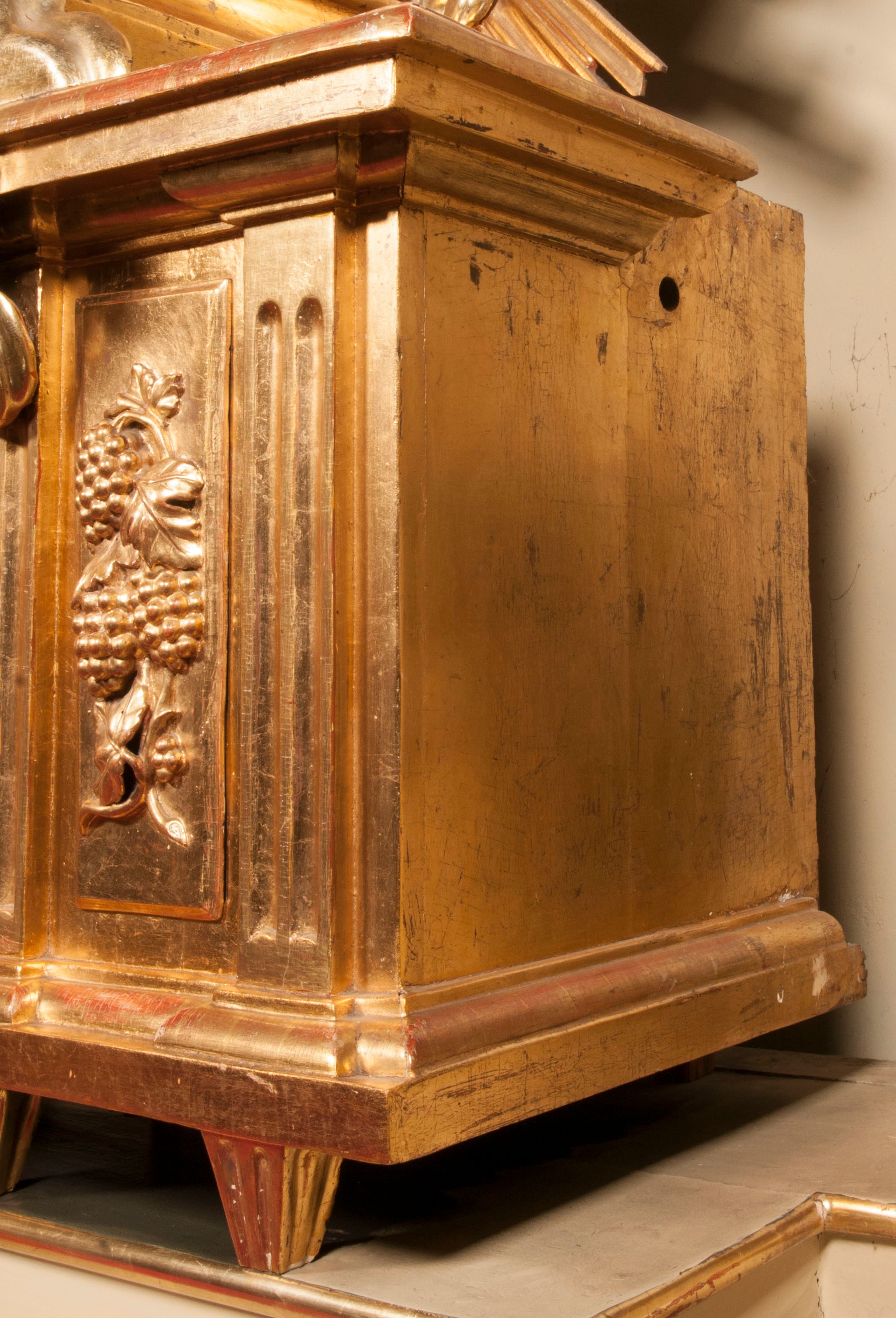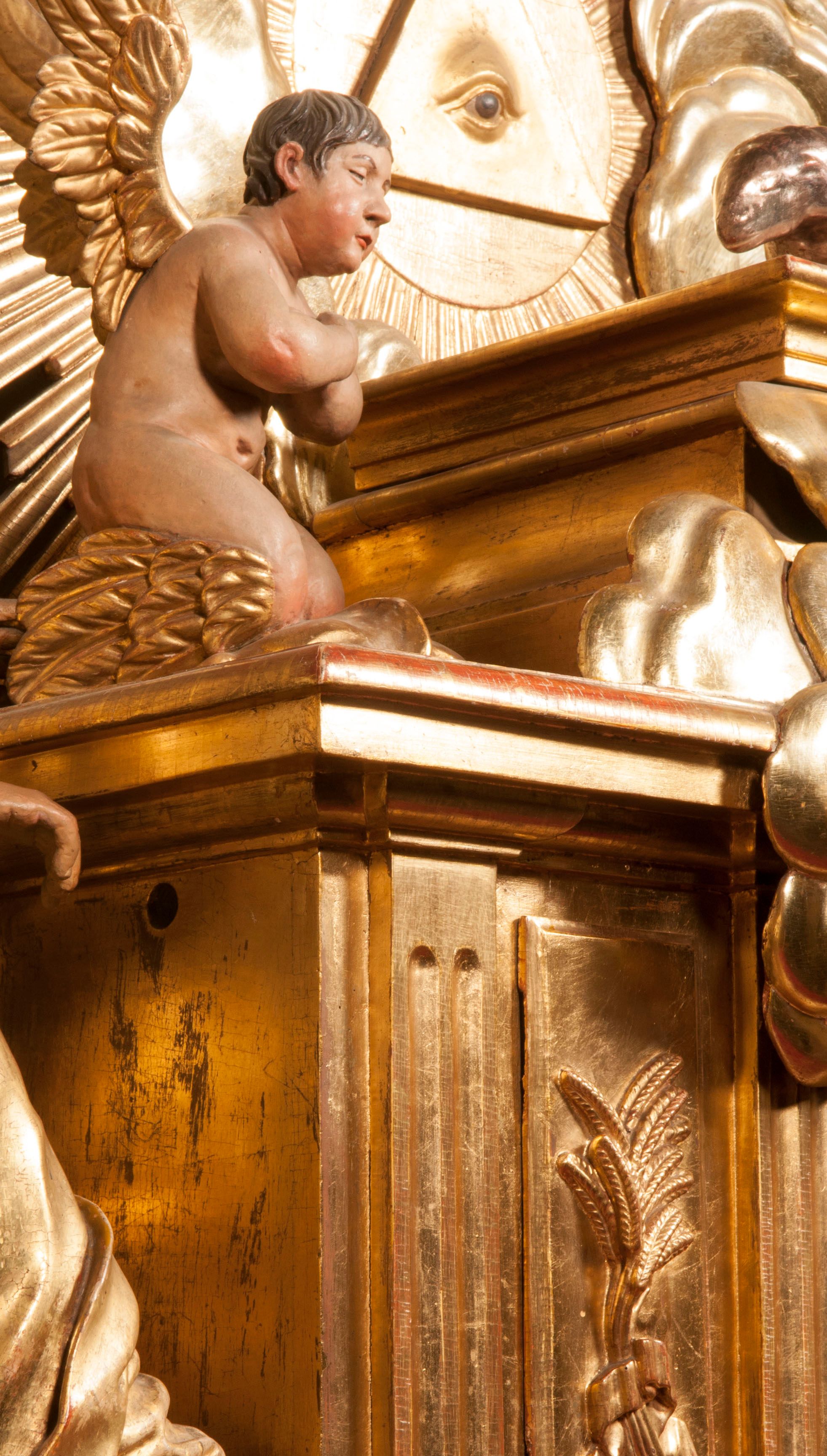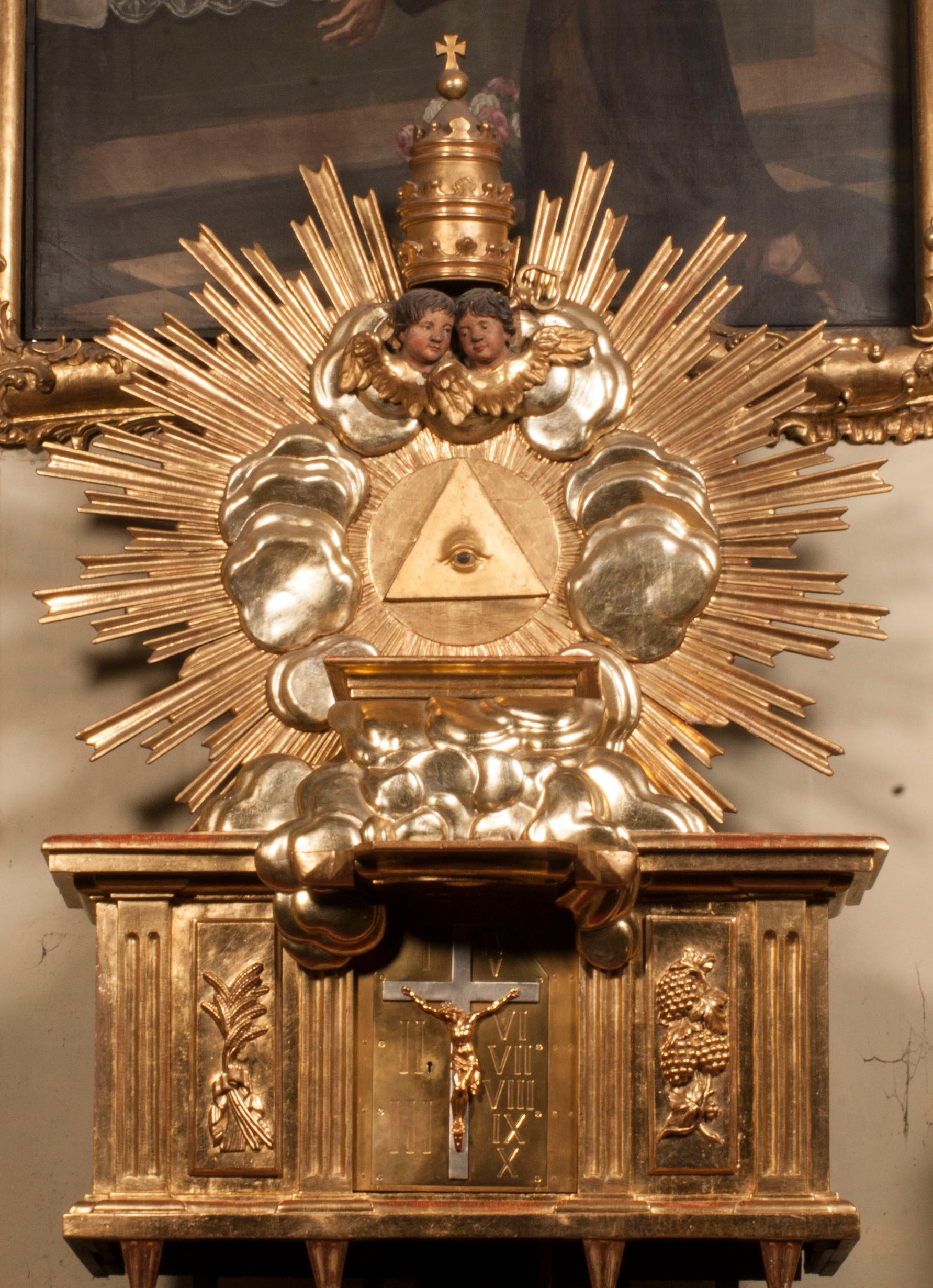 Tabernakulum w formie Arki Przymierza, adorowanej przez dwie klęczące figury starotestamentowego arcykapłana i biskupa oraz dwie stojące postacie lewitów oraz klęczące aniołów, zwieńczonej glorią promienistą z okiem Opatrzności. Wsparte na ośmiu cylindrycznych nóżkach prostopadłościenne tabernakulum jest od frontu podzielone na trzy pola wyznaczone kanelowanymi listwami. Pole środkowe stanowią drzwiczki z rytymi cyframi Dekalogu z ukrzyżowanym Chrystusem, pola boczne z wiązką pałek wodnych z jednej i winnym gronem z drugiej strony. Na skłębionych chmurach z podestem leży Baranek (obecnie w jego miejscu znajduje się figura Matki Boskiej). W tle znacznej wielkości gloria promienista z wieńcem chmur i umieszczonym w nim okiem Opatrzności oraz dwie uskrzydlone główki, nad którymi papieska tiara ze skrzyżowanymi kluczami. Po bokach Baranka dwa klęczące, uskrzydlone nagie aniołki. Obok tabernakulum dwie klęczące postacie z kadzielnicami w rękach. Postać po lewej w stroju biskupim, w albie, stule i kapie oraz infule z dwiema taśmami. Postać po prawej stronie jest ubrany w tradycyjny starotestamentowy strój – efod czyli tunikę i płaszcz wierzchni przepasany na biodrach, pektorał na piersi i zawój na głowie. Za nimi dwaj stojący lewici w tunikach przepasanych na biodrach i wysokich butach. Adorujące Baranka anioły w pozycji klęczącej z rękami skrzyżowanymi na piersi, ze skrzydłami na plecach i nogami w połowie utworzonymi ze skrzydeł.