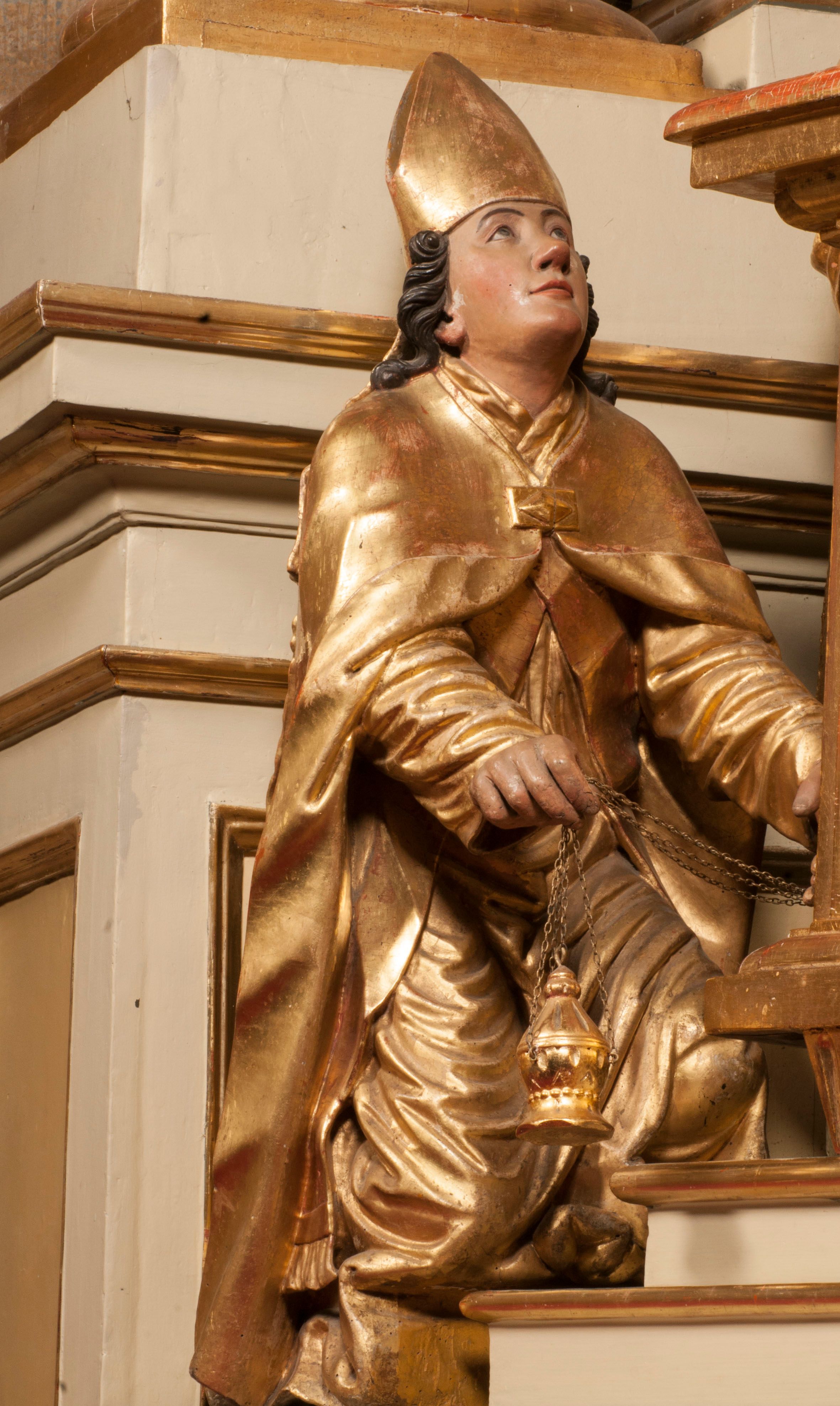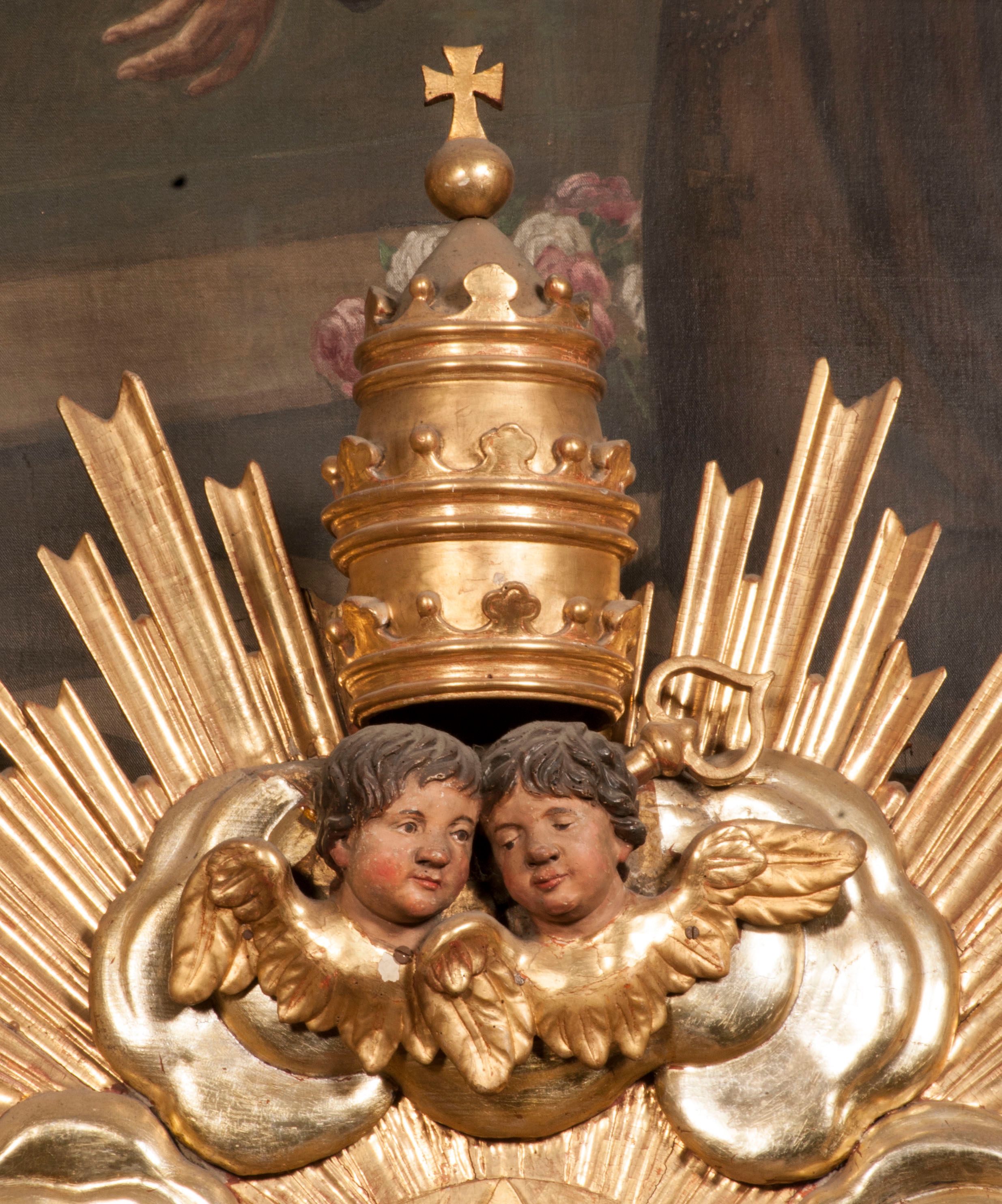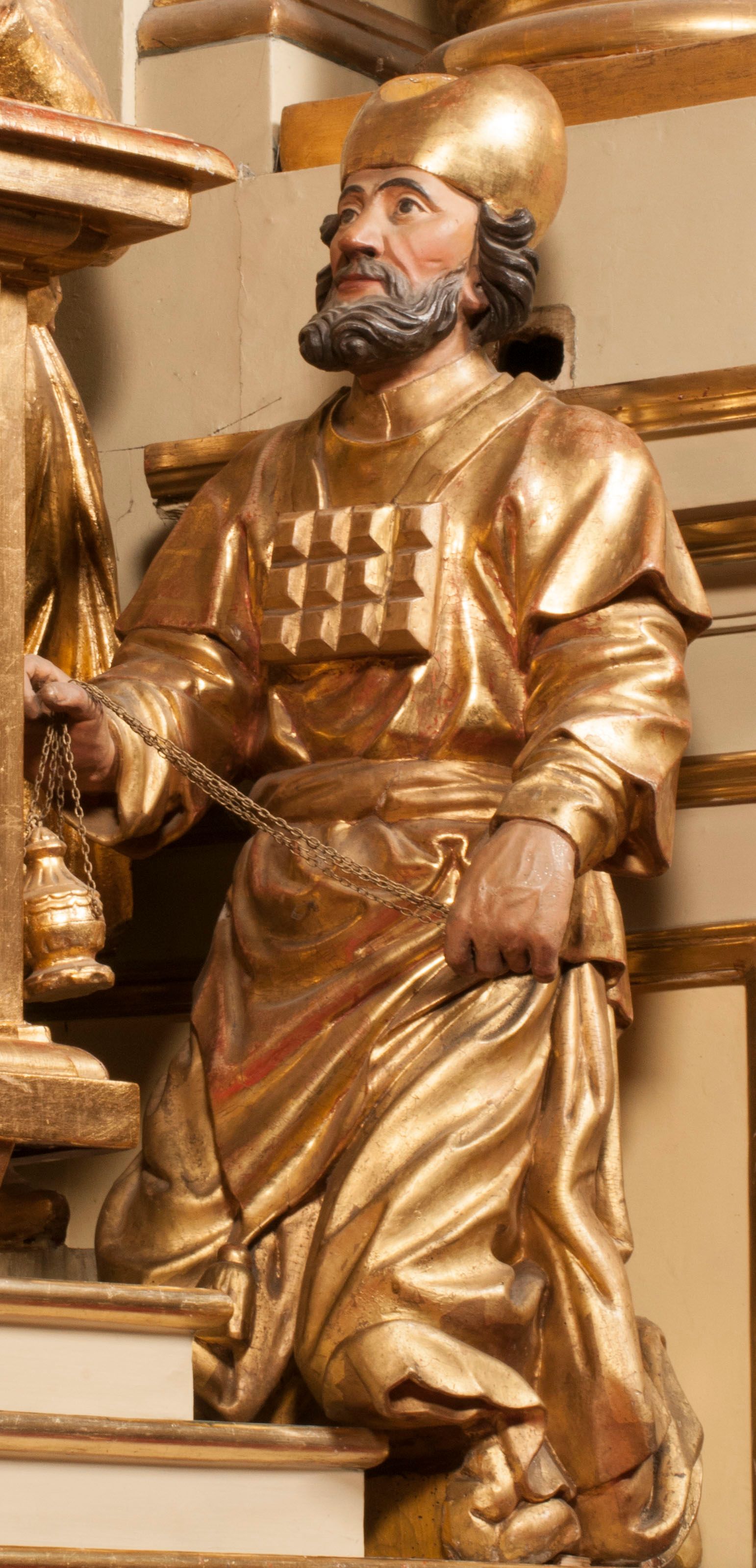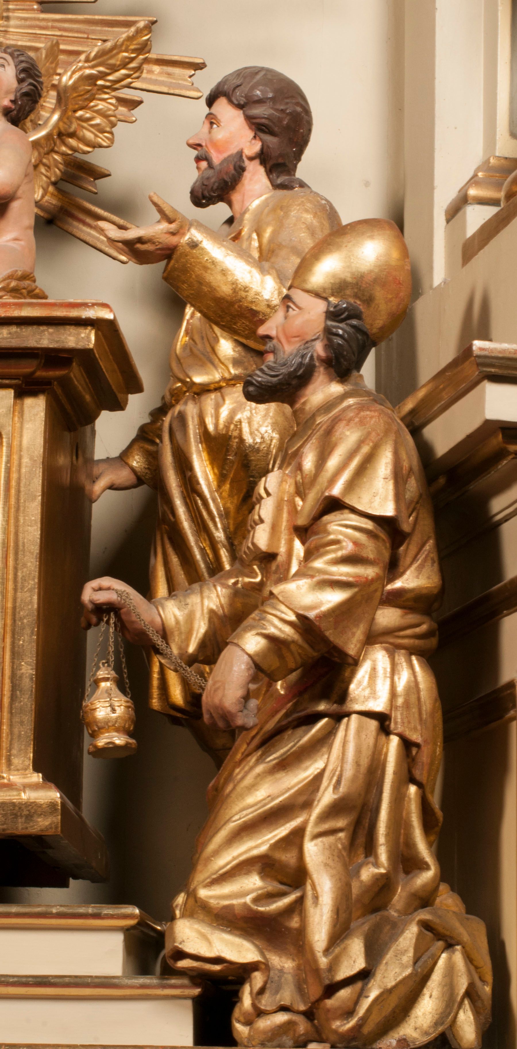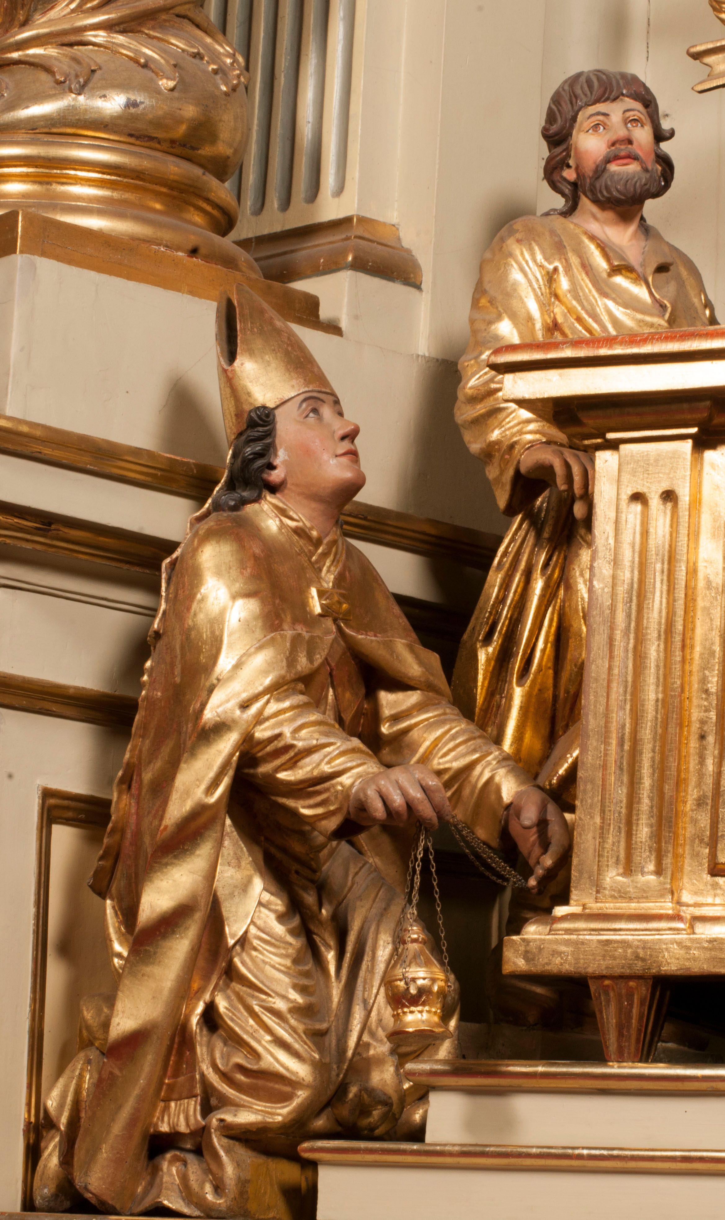 Tabernakulum w formie Arki Przymierza, adorowanej przez dwie klęczące figury starotestamentowego arcykapłana i biskupa oraz dwie stojące postacie lewitów oraz klęczące aniołów, zwieńczonej glorią promienistą z okiem Opatrzności. Wsparte na ośmiu cylindrycznych nóżkach prostopadłościenne tabernakulum jest od frontu podzielone na trzy pola wyznaczone kanelowanymi listwami. Pole środkowe stanowią drzwiczki z rytymi cyframi Dekalogu z ukrzyżowanym Chrystusem, pola boczne z wiązką pałek wodnych z jednej i winnym gronem z drugiej strony. Na skłębionych chmurach z podestem leży Baranek (obecnie w jego miejscu znajduje się figura Matki Boskiej). W tle znacznej wielkości gloria promienista z wieńcem chmur i umieszczonym w nim okiem Opatrzności oraz dwie uskrzydlone główki, nad którymi papieska tiara ze skrzyżowanymi kluczami. Po bokach Baranka dwa klęczące, uskrzydlone nagie aniołki. Obok tabernakulum dwie klęczące postacie z kadzielnicami w rękach. Postać po lewej w stroju biskupim, w albie, stule i kapie oraz infule z dwiema taśmami. Postać po prawej stronie jest ubrany w tradycyjny starotestamentowy strój – efod czyli tunikę i płaszcz wierzchni przepasany na biodrach, pektorał na piersi i zawój na głowie. Za nimi dwaj stojący lewici w tunikach przepasanych na biodrach i wysokich butach. Adorujące Baranka anioły w pozycji klęczącej z rękami skrzyżowanymi na piersi, ze skrzydłami na plecach i nogami w połowie utworzonymi ze skrzydeł.