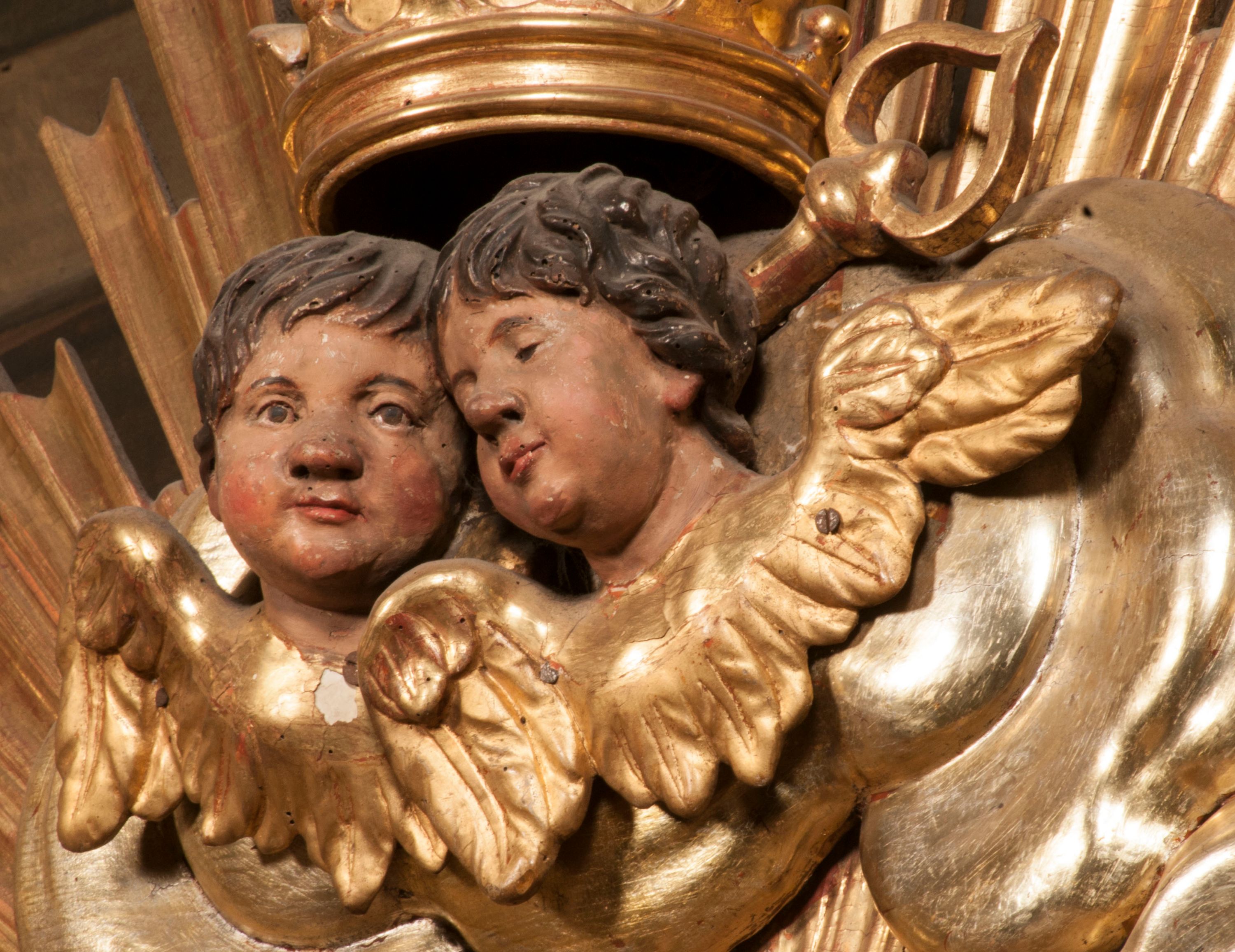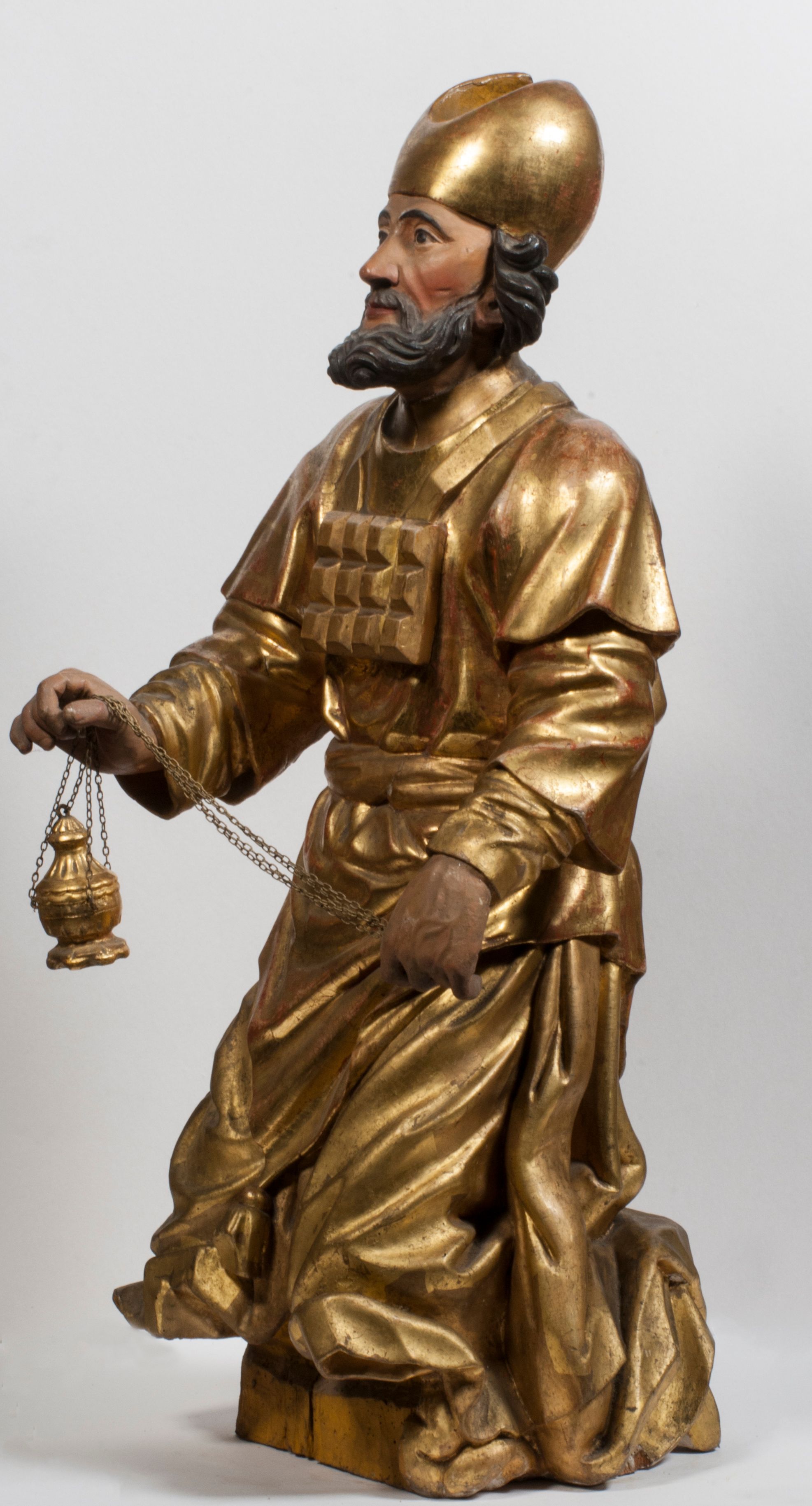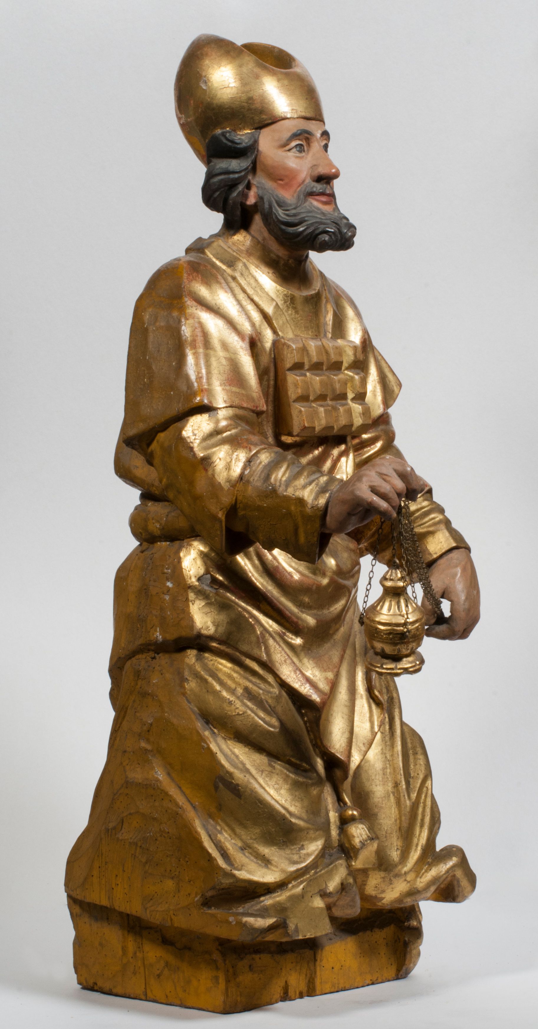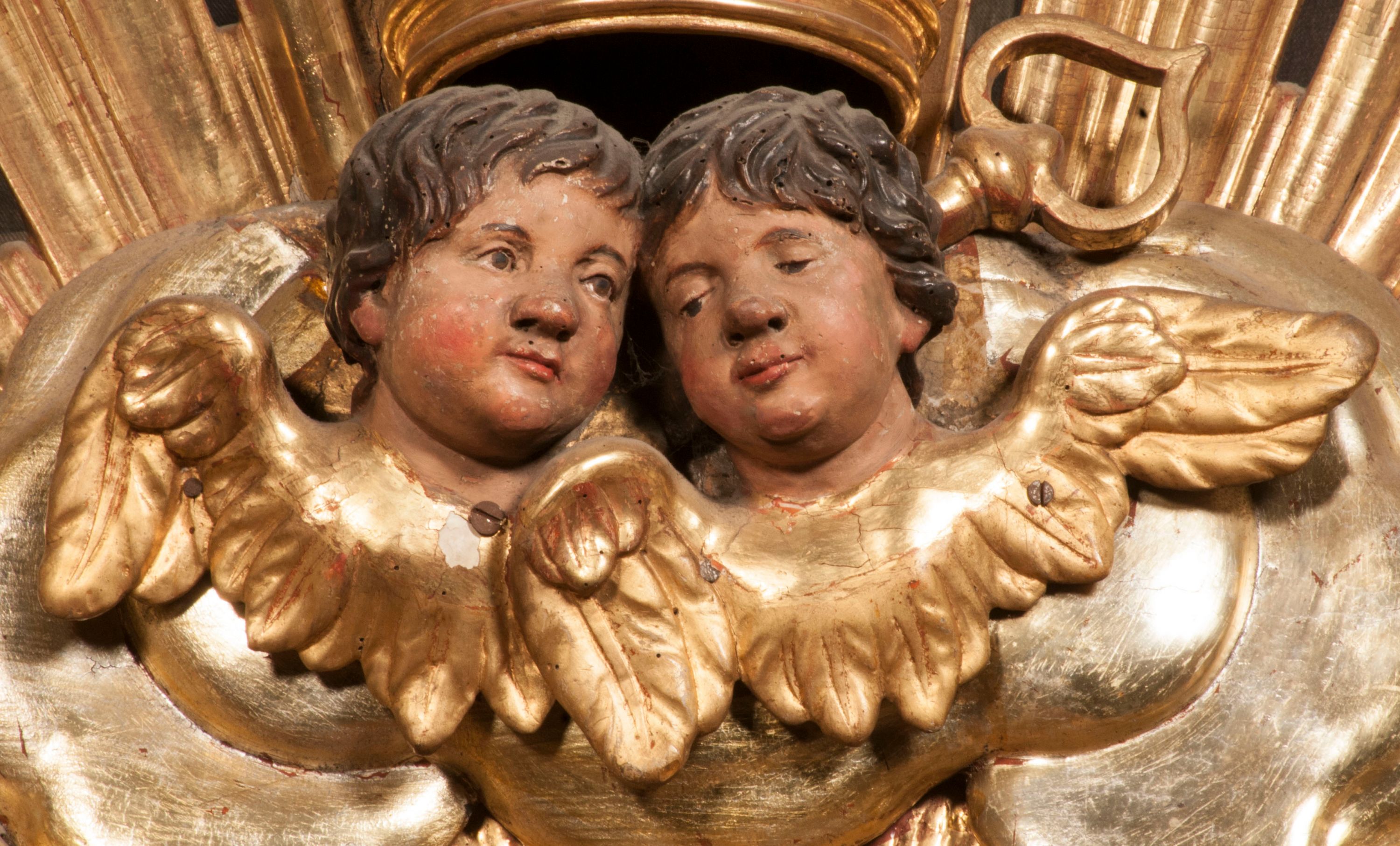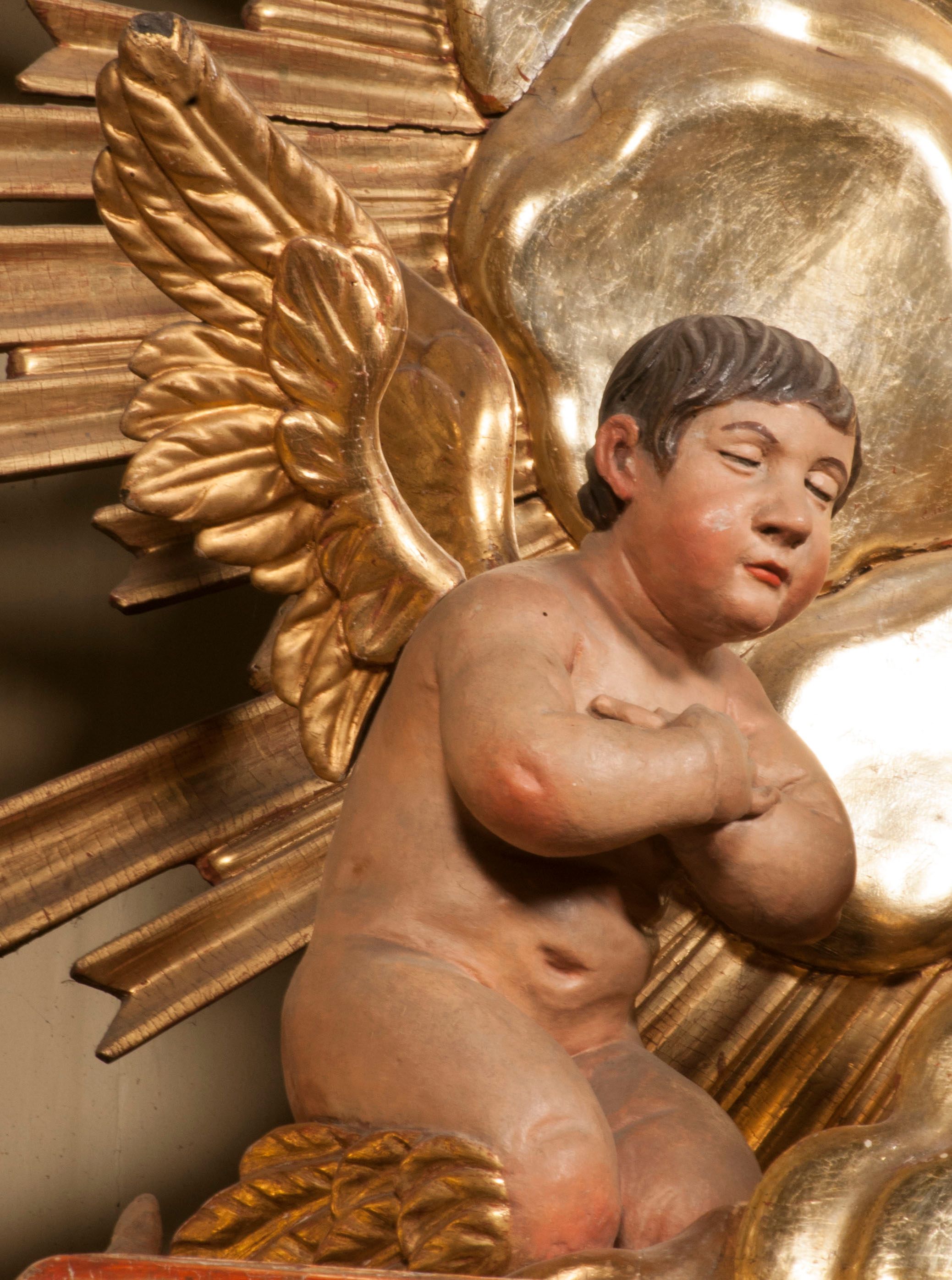 Tabernakulum w formie Arki Przymierza, adorowanej przez dwie klęczące figury starotestamentowego arcykapłana i biskupa oraz dwie stojące postacie lewitów oraz klęczące aniołów, zwieńczonej glorią promienistą z okiem Opatrzności. Wsparte na ośmiu cylindrycznych nóżkach prostopadłościenne tabernakulum jest od frontu podzielone na trzy pola wyznaczone kanelowanymi listwami. Pole środkowe stanowią drzwiczki z rytymi cyframi Dekalogu z ukrzyżowanym Chrystusem, pola boczne z wiązką pałek wodnych z jednej i winnym gronem z drugiej strony. Na skłębionych chmurach z podestem leży Baranek (obecnie w jego miejscu znajduje się figura Matki Boskiej). W tle znacznej wielkości gloria promienista z wieńcem chmur i umieszczonym w nim okiem Opatrzności oraz dwie uskrzydlone główki, nad którymi papieska tiara ze skrzyżowanymi kluczami. Po bokach Baranka dwa klęczące, uskrzydlone nagie aniołki. Obok tabernakulum dwie klęczące postacie z kadzielnicami w rękach. Postać po lewej w stroju biskupim, w albie, stule i kapie oraz infule z dwiema taśmami. Postać po prawej stronie jest ubrany w tradycyjny starotestamentowy strój – efod czyli tunikę i płaszcz wierzchni przepasany na biodrach, pektorał na piersi i zawój na głowie. Za nimi dwaj stojący lewici w tunikach przepasanych na biodrach i wysokich butach. Adorujące Baranka anioły w pozycji klęczącej z rękami skrzyżowanymi na piersi, ze skrzydłami na plecach i nogami w połowie utworzonymi ze skrzydeł.