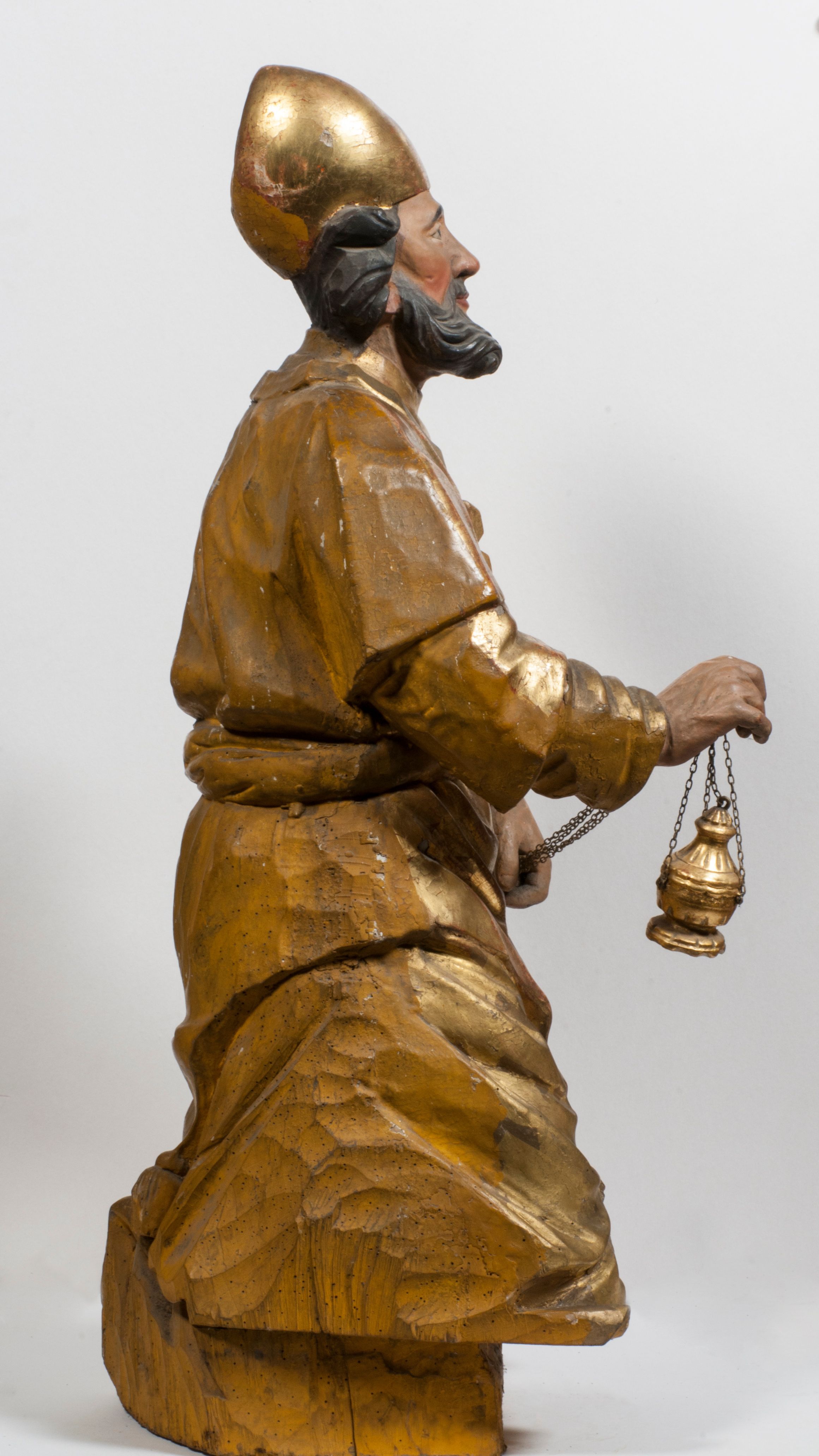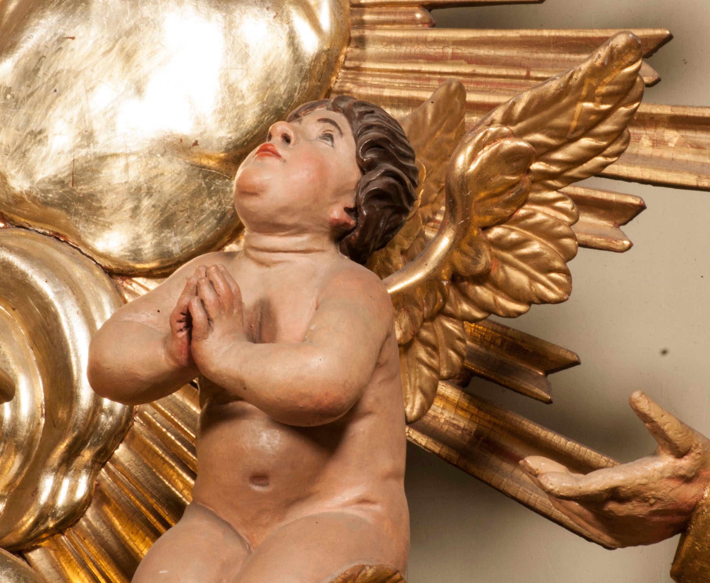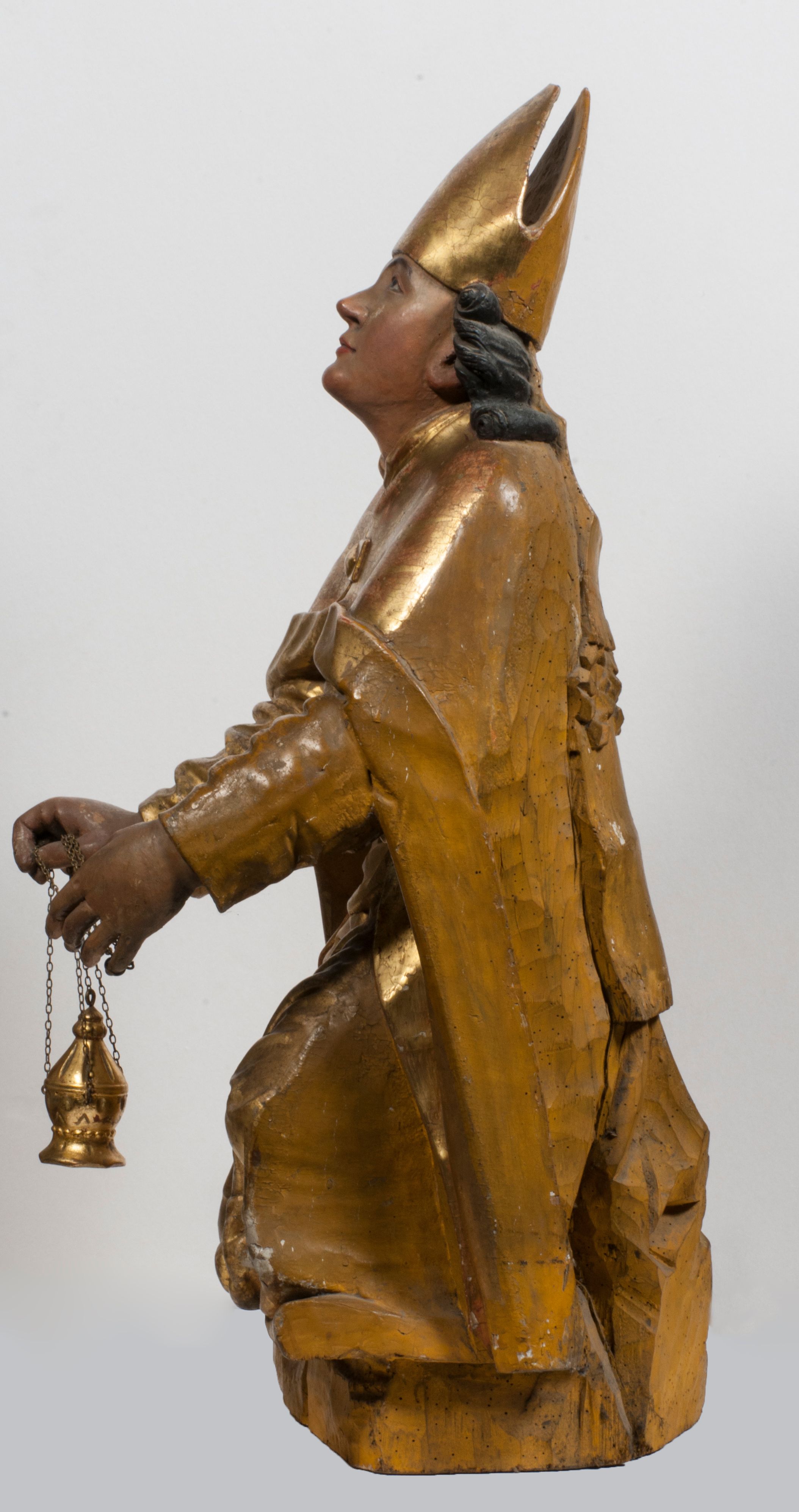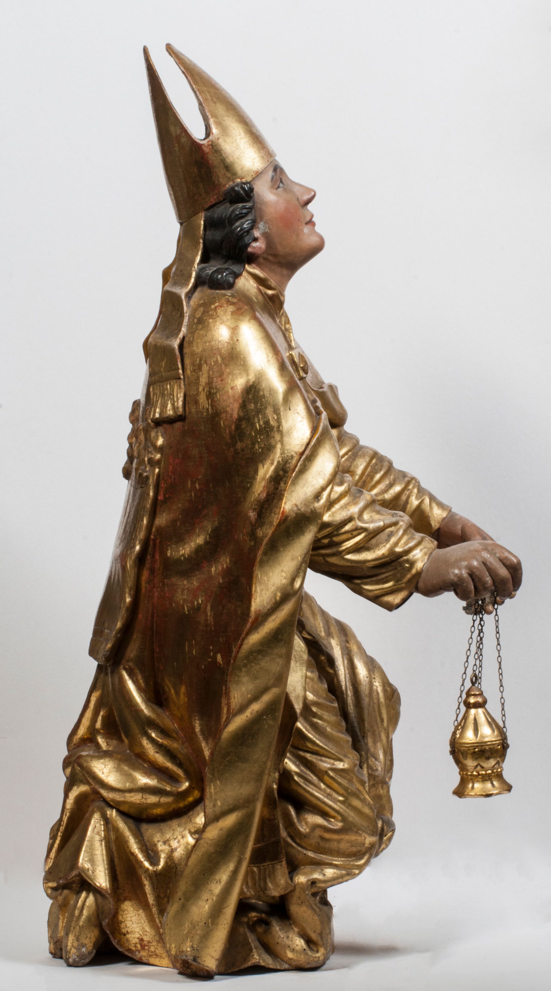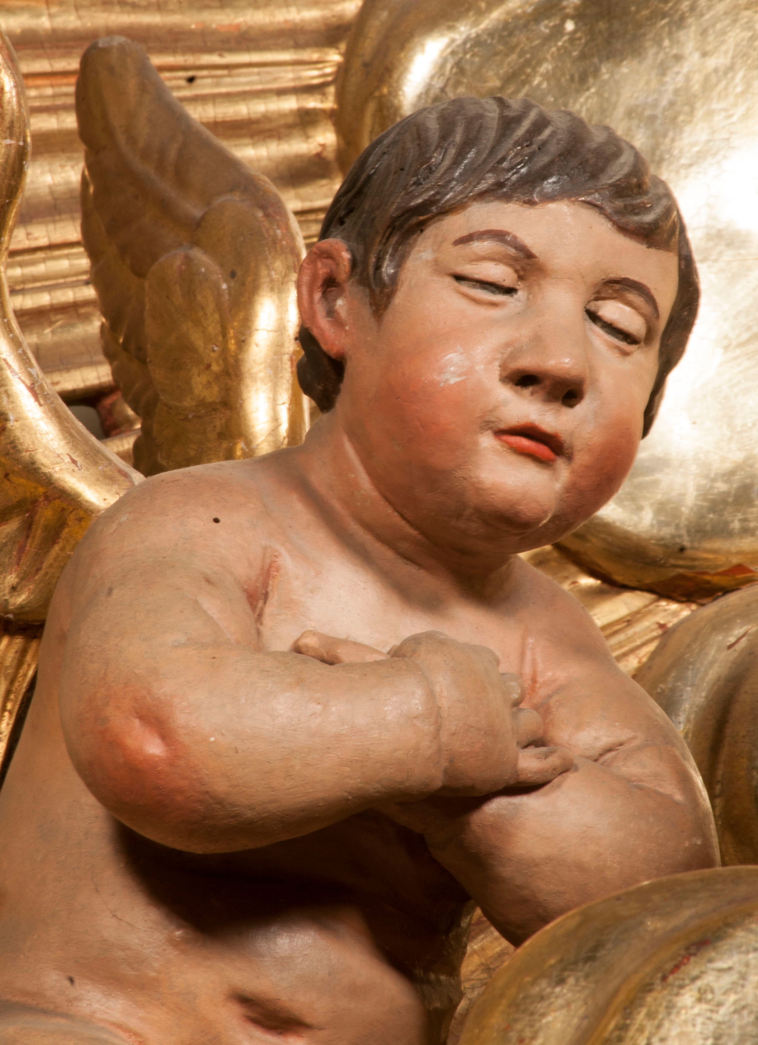 Tabernakulum w formie Arki Przymierza, adorowanej przez dwie klęczące figury starotestamentowego arcykapłana i biskupa oraz dwie stojące postacie lewitów oraz klęczące aniołów, zwieńczonej glorią promienistą z okiem Opatrzności. Wsparte na ośmiu cylindrycznych nóżkach prostopadłościenne tabernakulum jest od frontu podzielone na trzy pola wyznaczone kanelowanymi listwami. Pole środkowe stanowią drzwiczki z rytymi cyframi Dekalogu z ukrzyżowanym Chrystusem, pola boczne z wiązką pałek wodnych z jednej i winnym gronem z drugiej strony. Na skłębionych chmurach z podestem leży Baranek (obecnie w jego miejscu znajduje się figura Matki Boskiej). W tle znacznej wielkości gloria promienista z wieńcem chmur i umieszczonym w nim okiem Opatrzności oraz dwie uskrzydlone główki, nad którymi papieska tiara ze skrzyżowanymi kluczami. Po bokach Baranka dwa klęczące, uskrzydlone nagie aniołki. Obok tabernakulum dwie klęczące postacie z kadzielnicami w rękach. Postać po lewej w stroju biskupim, w albie, stule i kapie oraz infule z dwiema taśmami. Postać po prawej stronie jest ubrany w tradycyjny starotestamentowy strój – efod czyli tunikę i płaszcz wierzchni przepasany na biodrach, pektorał na piersi i zawój na głowie. Za nimi dwaj stojący lewici w tunikach przepasanych na biodrach i wysokich butach. Adorujące Baranka anioły w pozycji klęczącej z rękami skrzyżowanymi na piersi, ze skrzydłami na plecach i nogami w połowie utworzonymi ze skrzydeł.