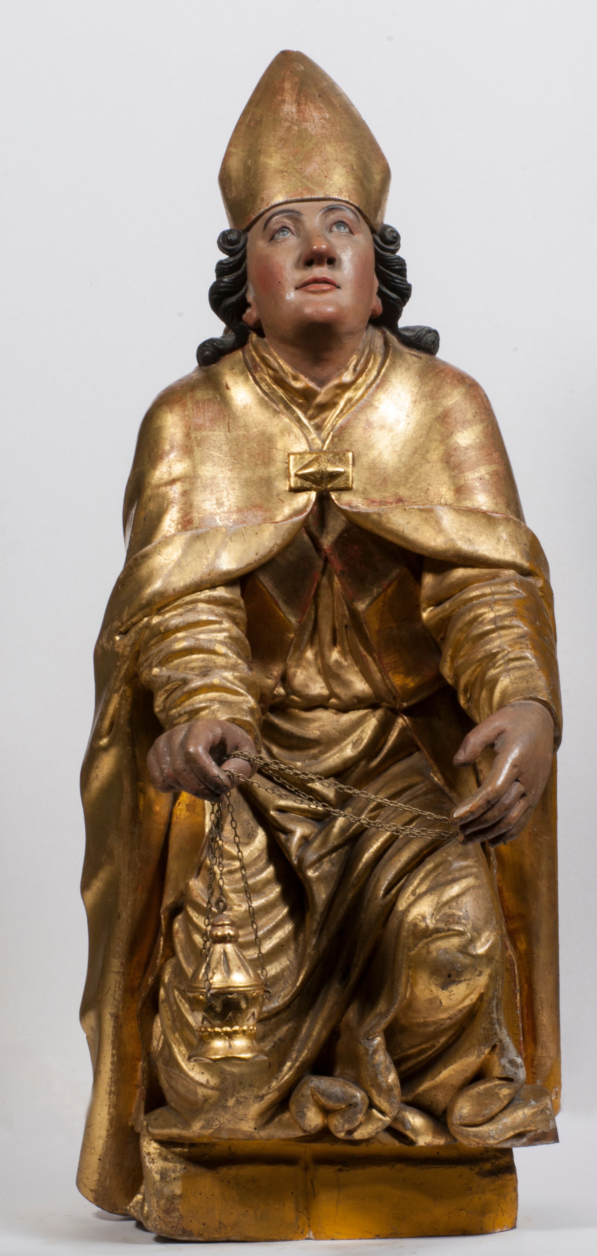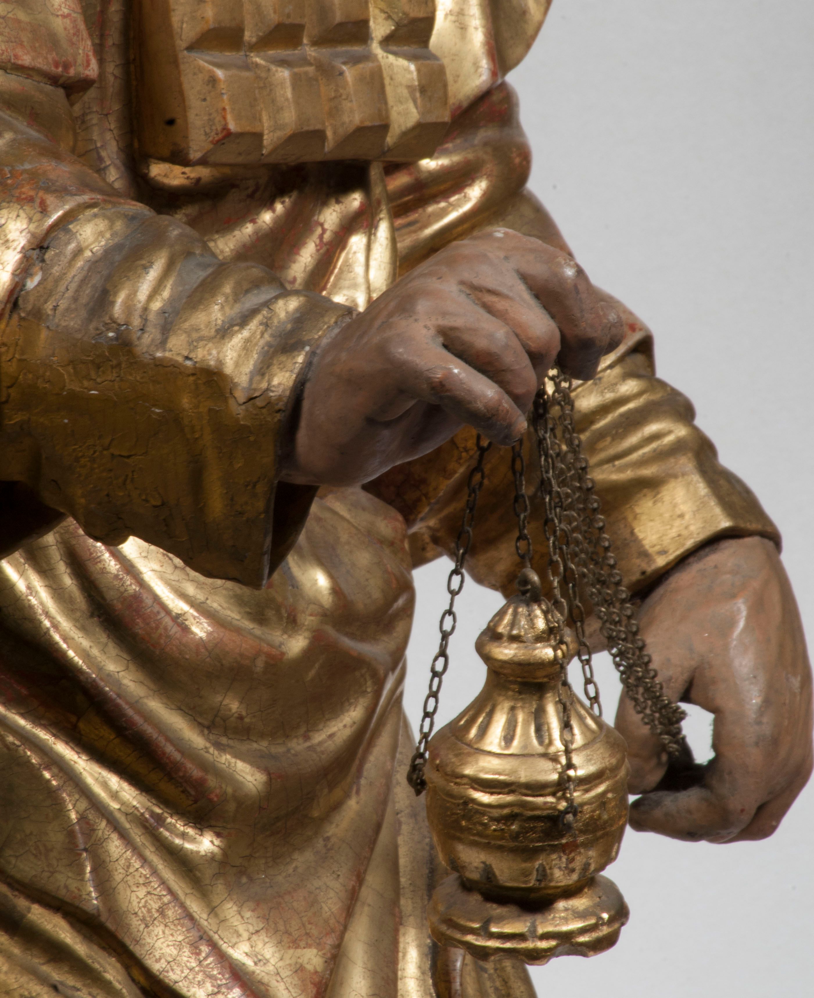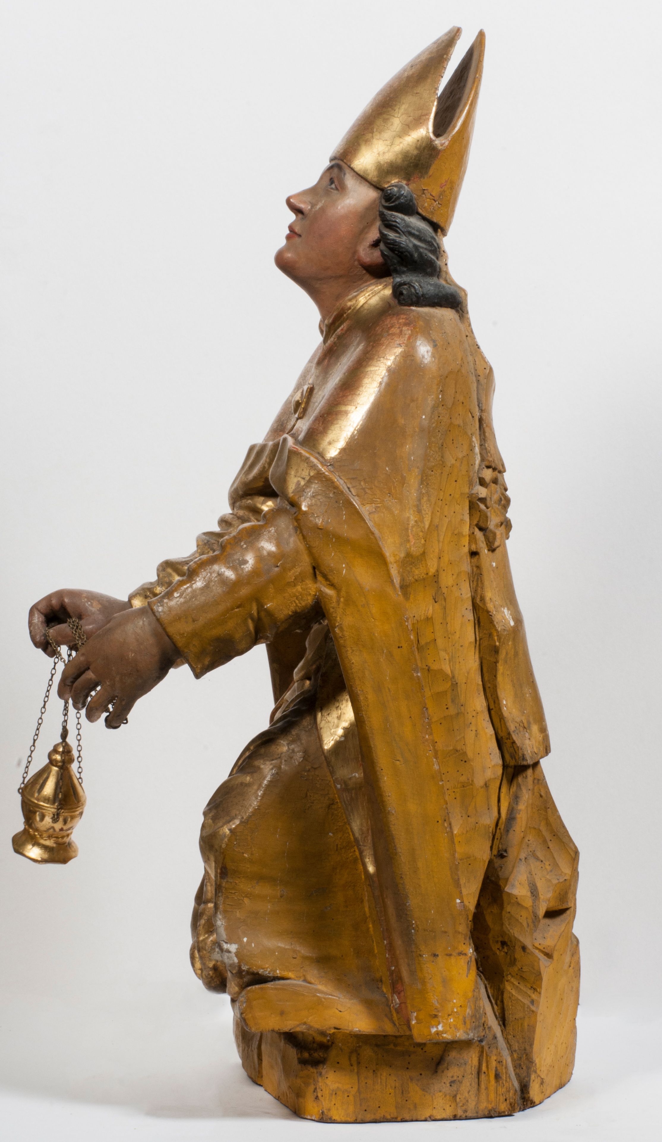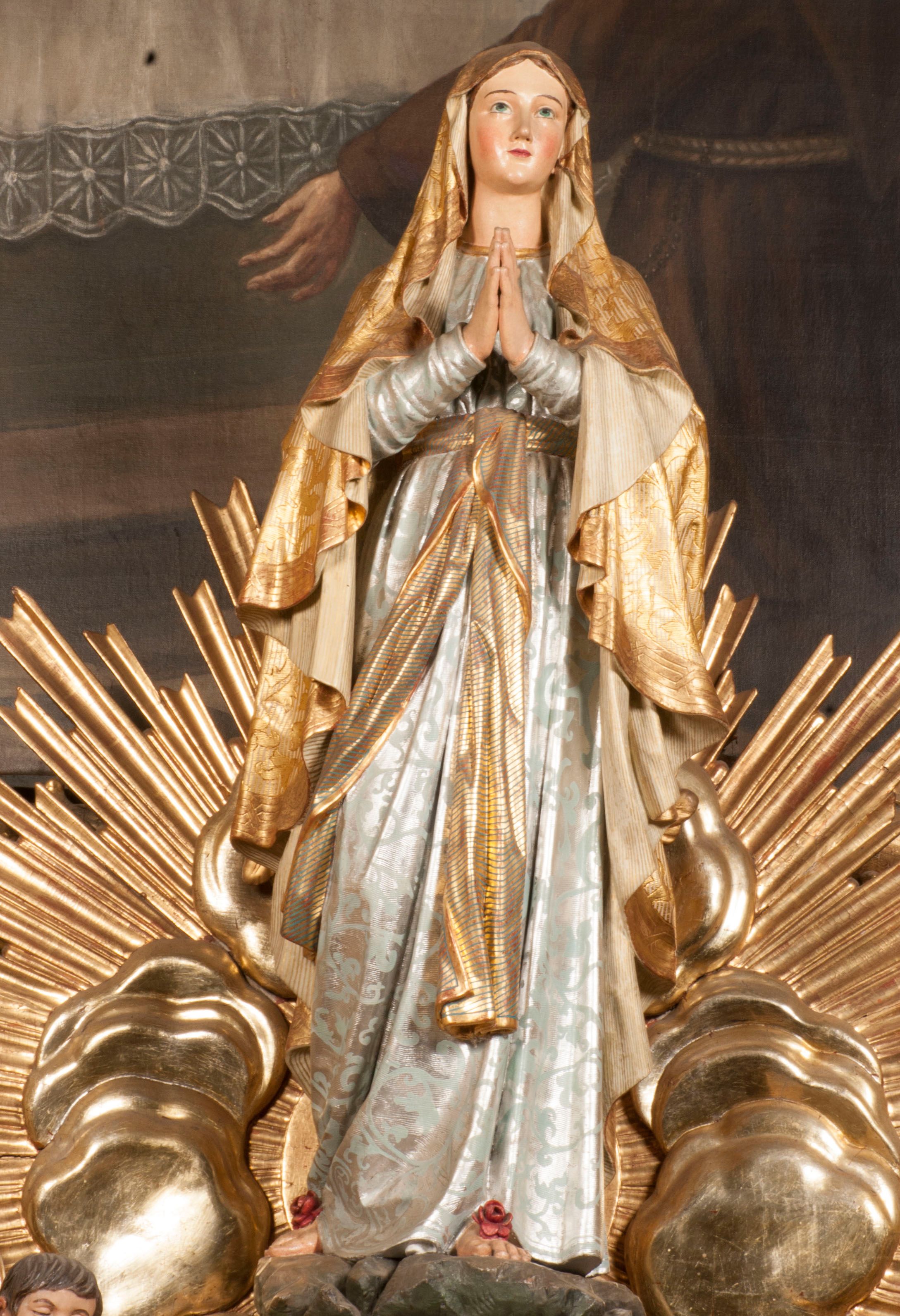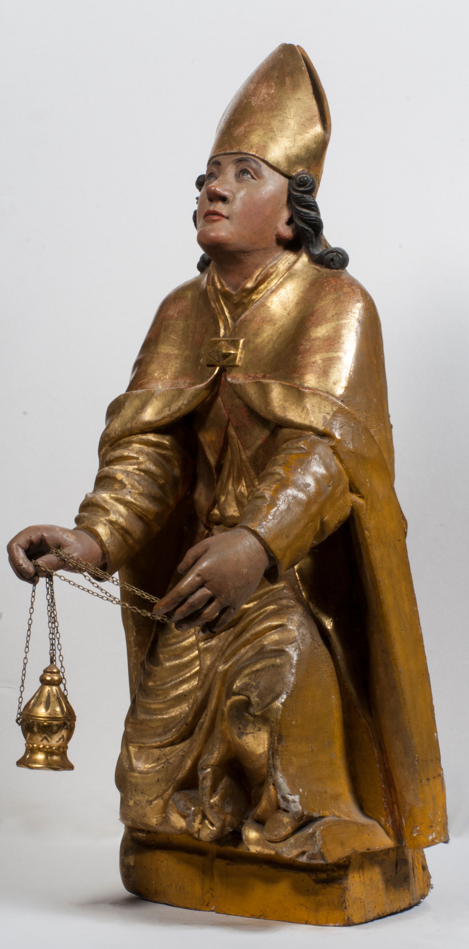 Tabernakulum w formie Arki Przymierza, adorowanej przez dwie klęczące figury starotestamentowego arcykapłana i biskupa oraz dwie stojące postacie lewitów oraz klęczące aniołów, zwieńczonej glorią promienistą z okiem Opatrzności. Wsparte na ośmiu cylindrycznych nóżkach prostopadłościenne tabernakulum jest od frontu podzielone na trzy pola wyznaczone kanelowanymi listwami. Pole środkowe stanowią drzwiczki z rytymi cyframi Dekalogu z ukrzyżowanym Chrystusem, pola boczne z wiązką pałek wodnych z jednej i winnym gronem z drugiej strony. Na skłębionych chmurach z podestem leży Baranek (obecnie w jego miejscu znajduje się figura Matki Boskiej). W tle znacznej wielkości gloria promienista z wieńcem chmur i umieszczonym w nim okiem Opatrzności oraz dwie uskrzydlone główki, nad którymi papieska tiara ze skrzyżowanymi kluczami. Po bokach Baranka dwa klęczące, uskrzydlone nagie aniołki. Obok tabernakulum dwie klęczące postacie z kadzielnicami w rękach. Postać po lewej w stroju biskupim, w albie, stule i kapie oraz infule z dwiema taśmami. Postać po prawej stronie jest ubrany w tradycyjny starotestamentowy strój – efod czyli tunikę i płaszcz wierzchni przepasany na biodrach, pektorał na piersi i zawój na głowie. Za nimi dwaj stojący lewici w tunikach przepasanych na biodrach i wysokich butach. Adorujące Baranka anioły w pozycji klęczącej z rękami skrzyżowanymi na piersi, ze skrzydłami na plecach i nogami w połowie utworzonymi ze skrzydeł.