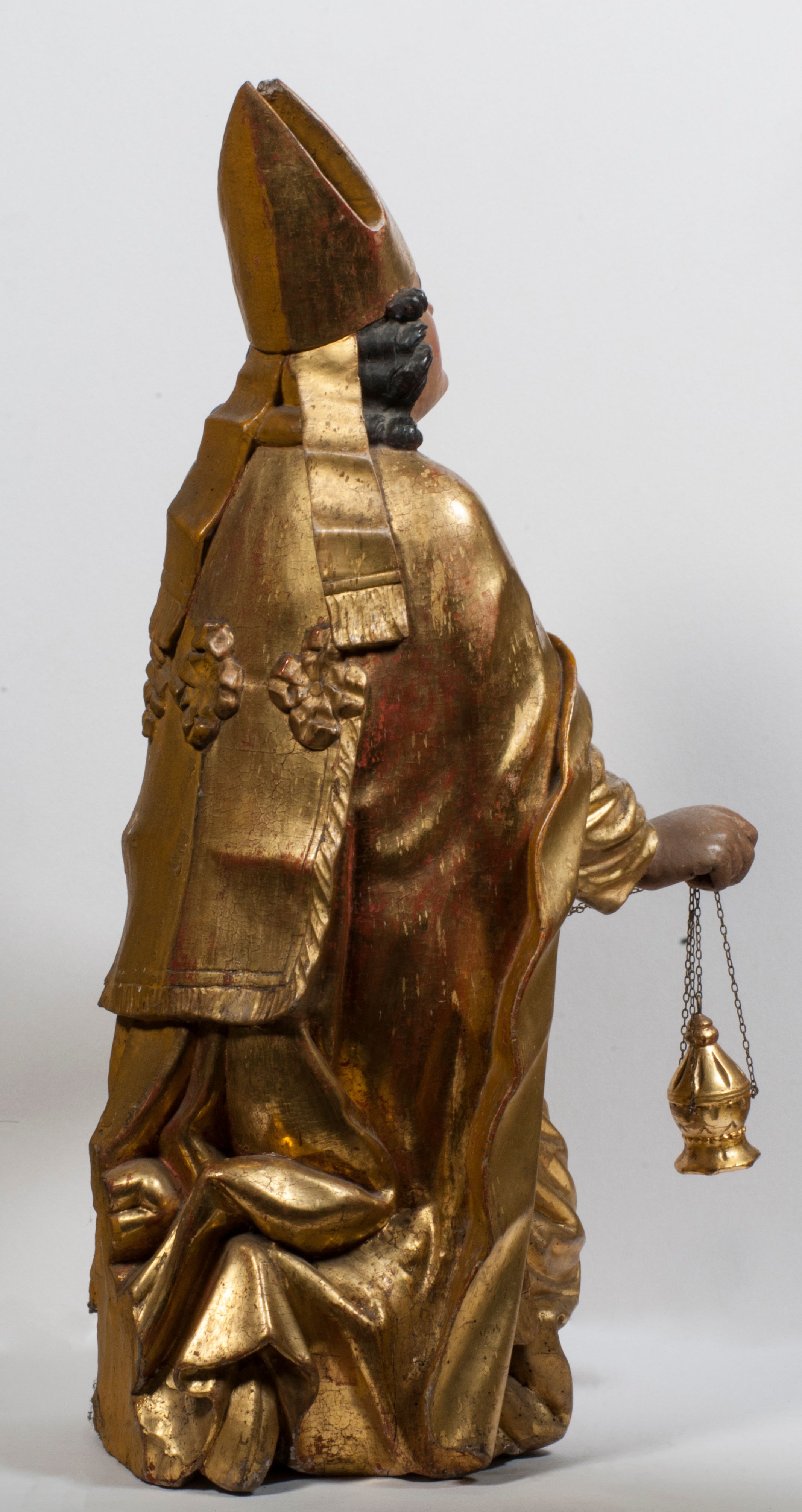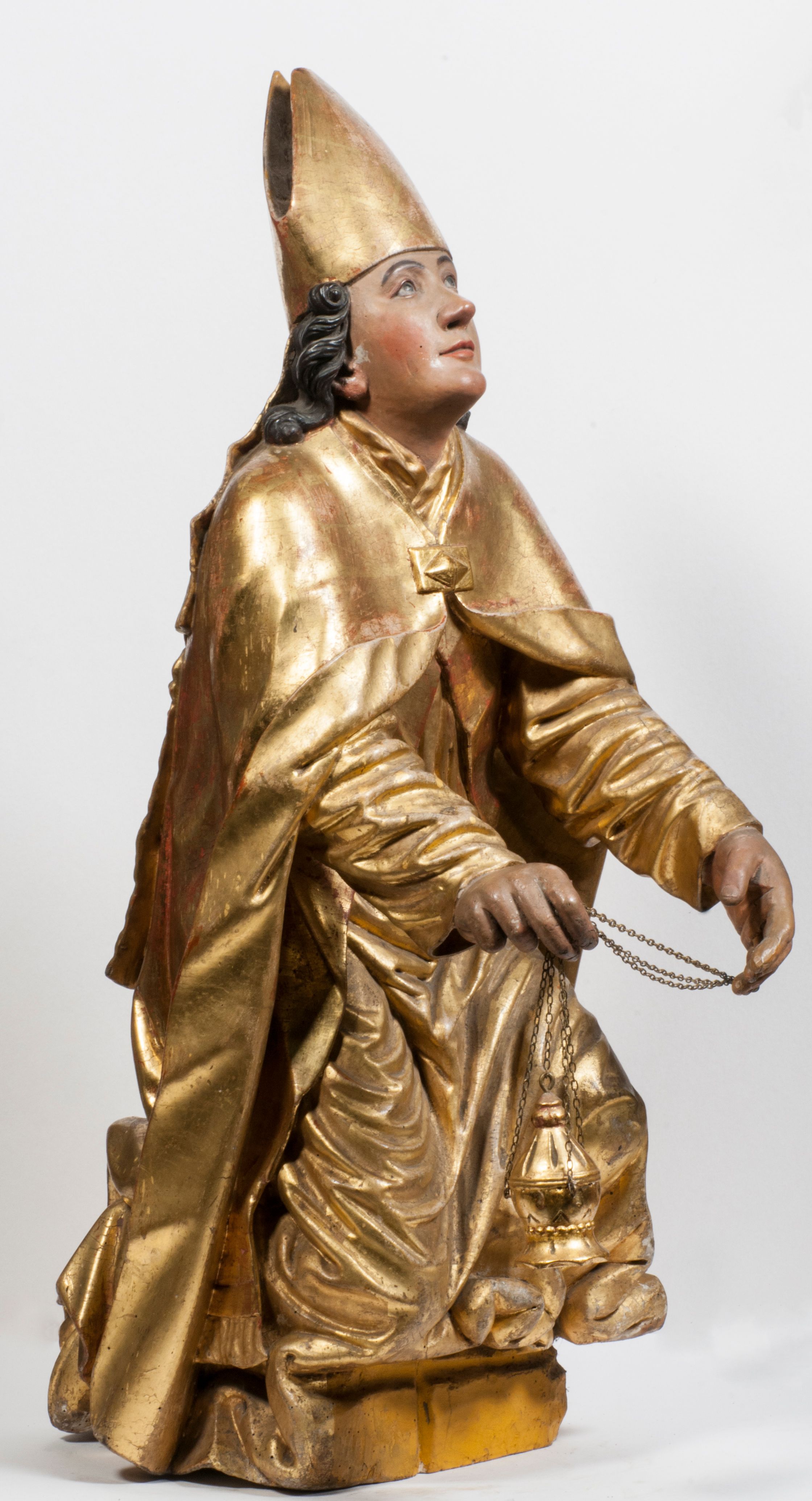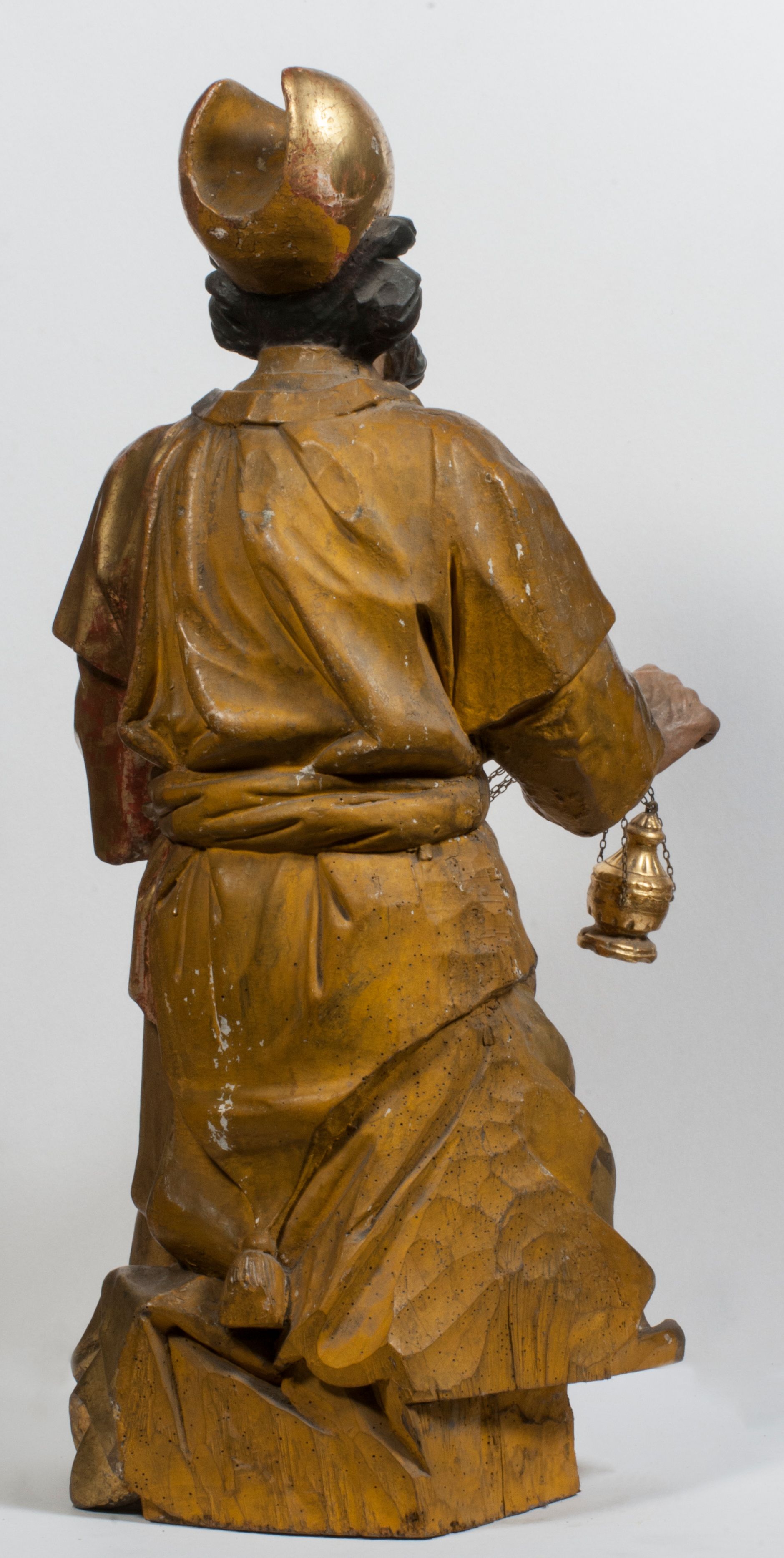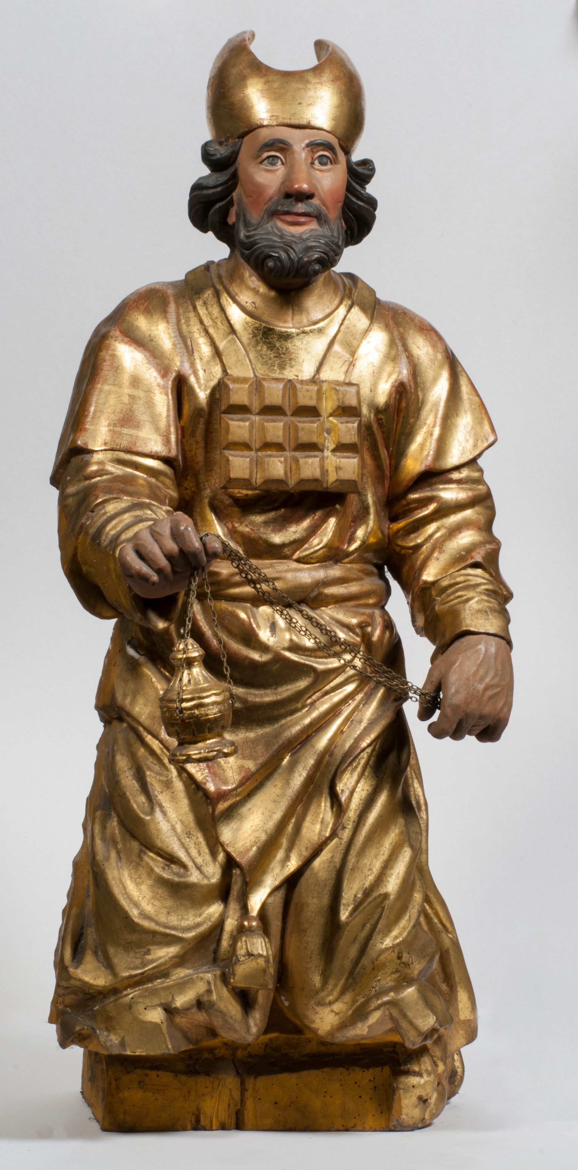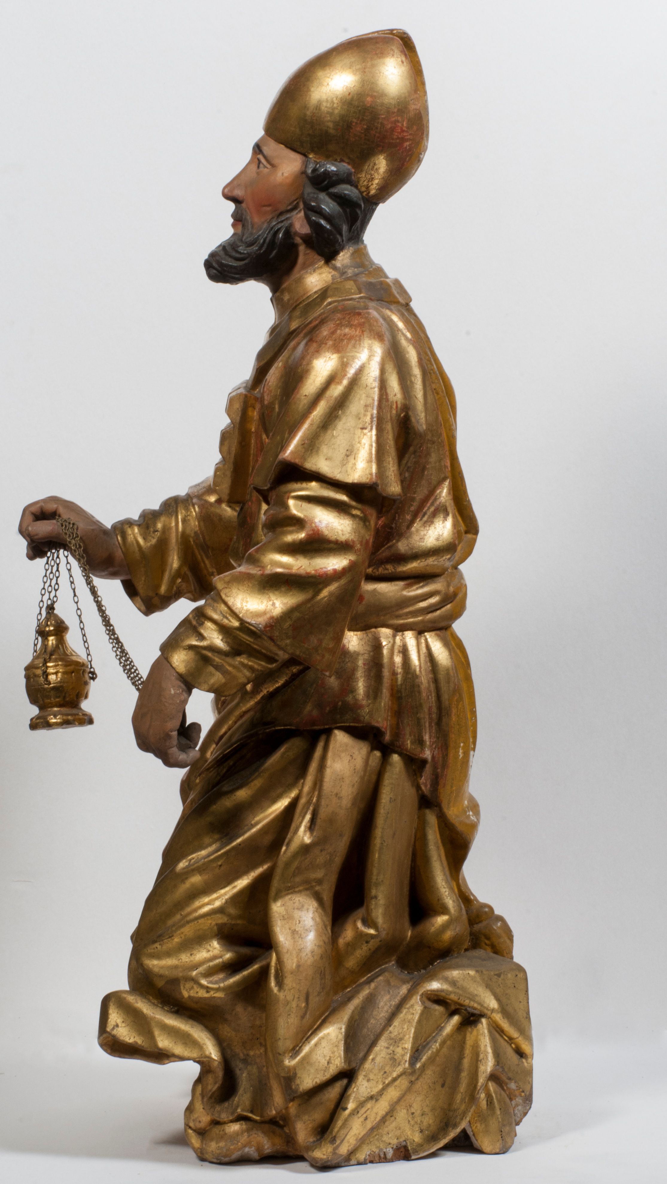 Tabernakulum w formie Arki Przymierza, adorowanej przez dwie klęczące figury starotestamentowego arcykapłana i biskupa oraz dwie stojące postacie lewitów oraz klęczące aniołów, zwieńczonej glorią promienistą z okiem Opatrzności. Wsparte na ośmiu cylindrycznych nóżkach prostopadłościenne tabernakulum jest od frontu podzielone na trzy pola wyznaczone kanelowanymi listwami. Pole środkowe stanowią drzwiczki z rytymi cyframi Dekalogu z ukrzyżowanym Chrystusem, pola boczne z wiązką pałek wodnych z jednej i winnym gronem z drugiej strony. Na skłębionych chmurach z podestem leży Baranek (obecnie w jego miejscu znajduje się figura Matki Boskiej). W tle znacznej wielkości gloria promienista z wieńcem chmur i umieszczonym w nim okiem Opatrzności oraz dwie uskrzydlone główki, nad którymi papieska tiara ze skrzyżowanymi kluczami. Po bokach Baranka dwa klęczące, uskrzydlone nagie aniołki. Obok tabernakulum dwie klęczące postacie z kadzielnicami w rękach. Postać po lewej w stroju biskupim, w albie, stule i kapie oraz infule z dwiema taśmami. Postać po prawej stronie jest ubrany w tradycyjny starotestamentowy strój – efod czyli tunikę i płaszcz wierzchni przepasany na biodrach, pektorał na piersi i zawój na głowie. Za nimi dwaj stojący lewici w tunikach przepasanych na biodrach i wysokich butach. Adorujące Baranka anioły w pozycji klęczącej z rękami skrzyżowanymi na piersi, ze skrzydłami na plecach i nogami w połowie utworzonymi ze skrzydeł.