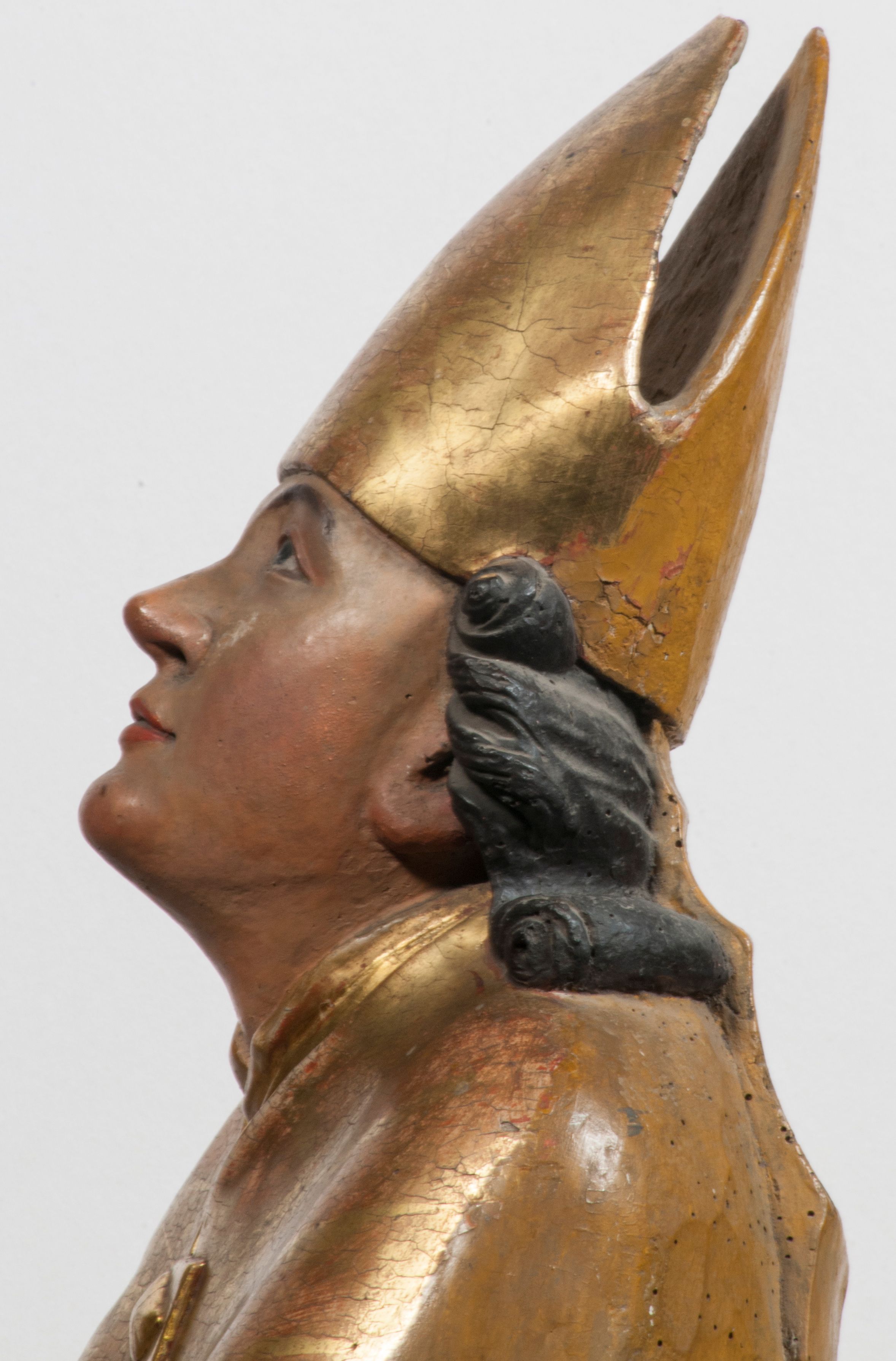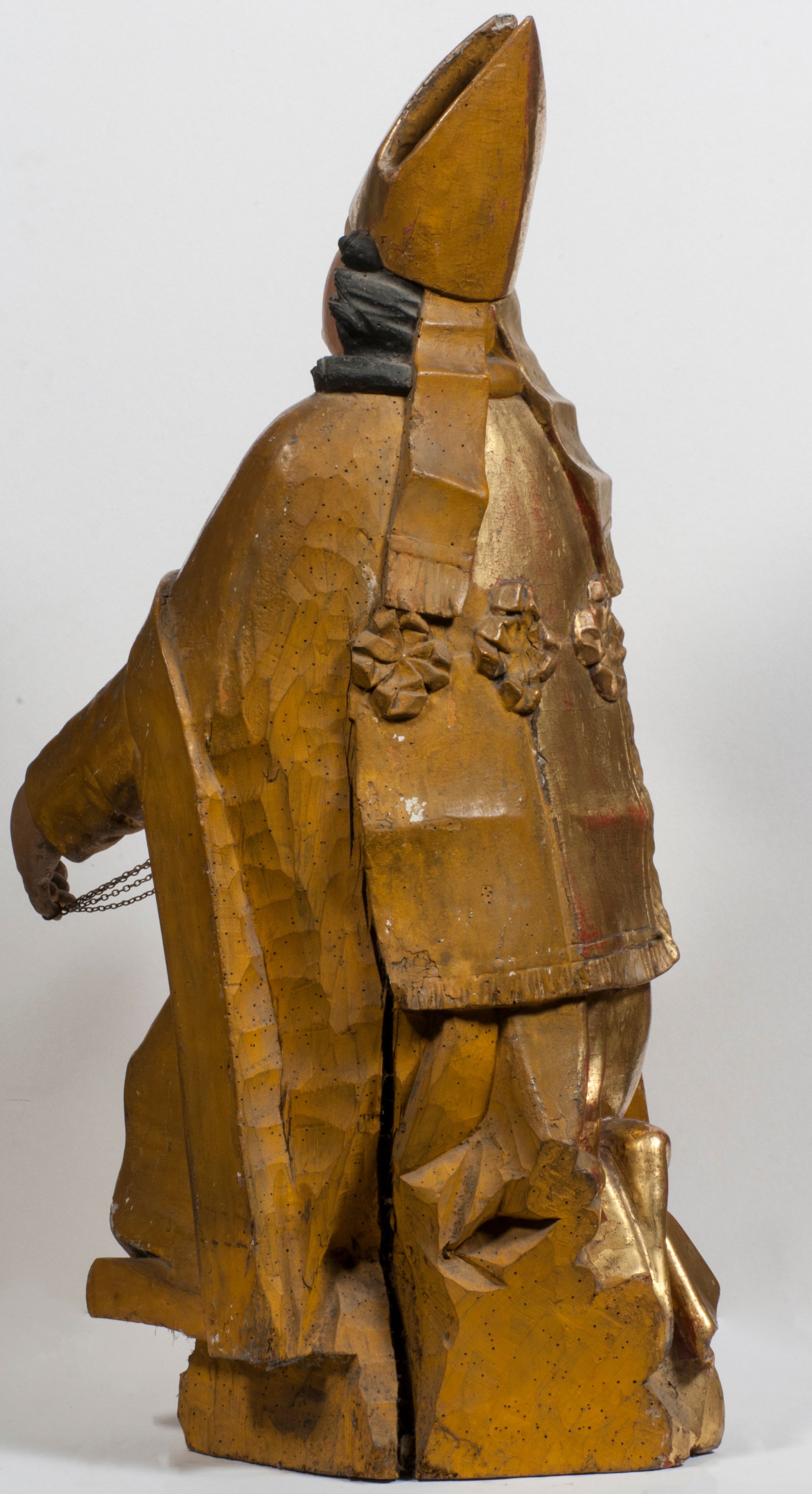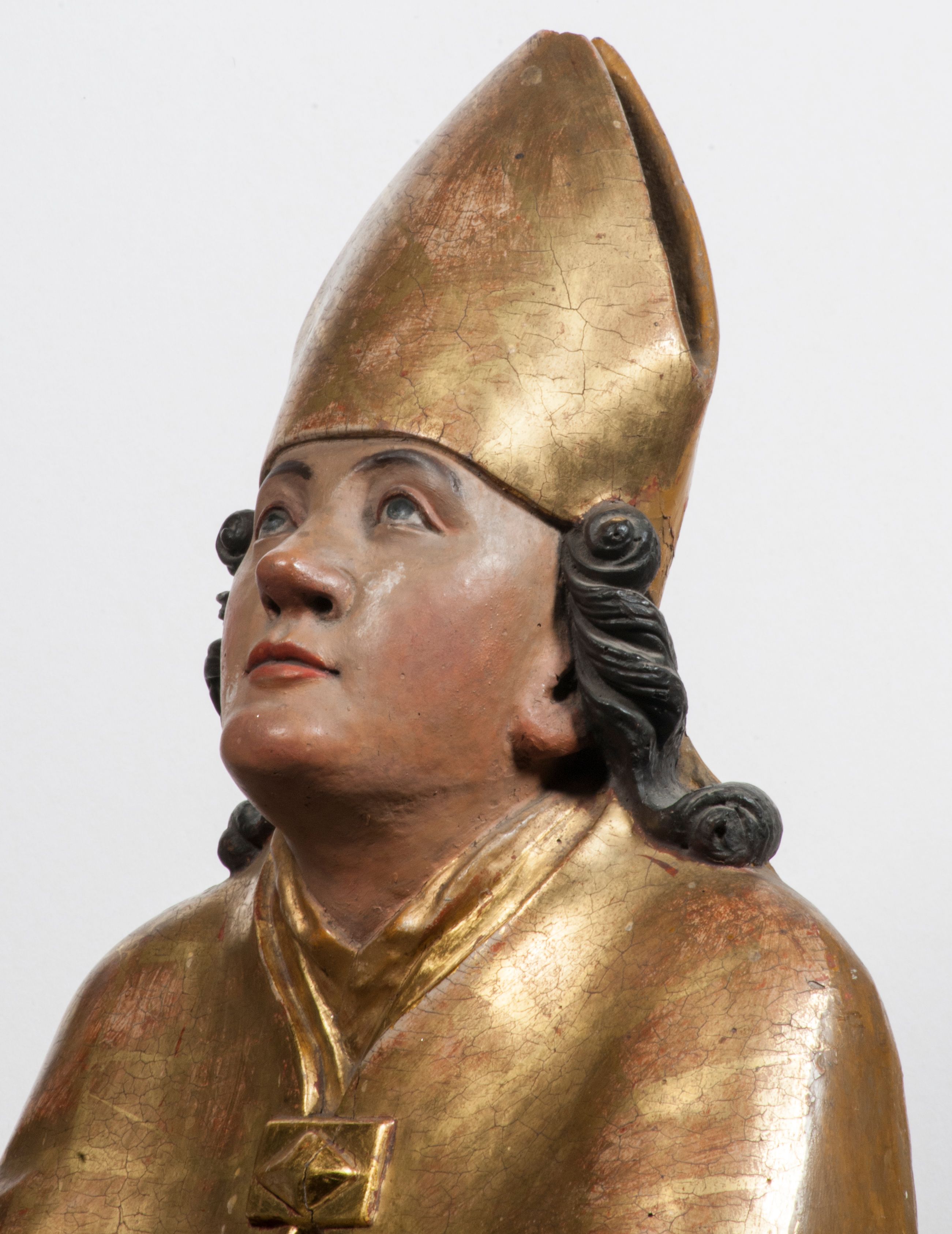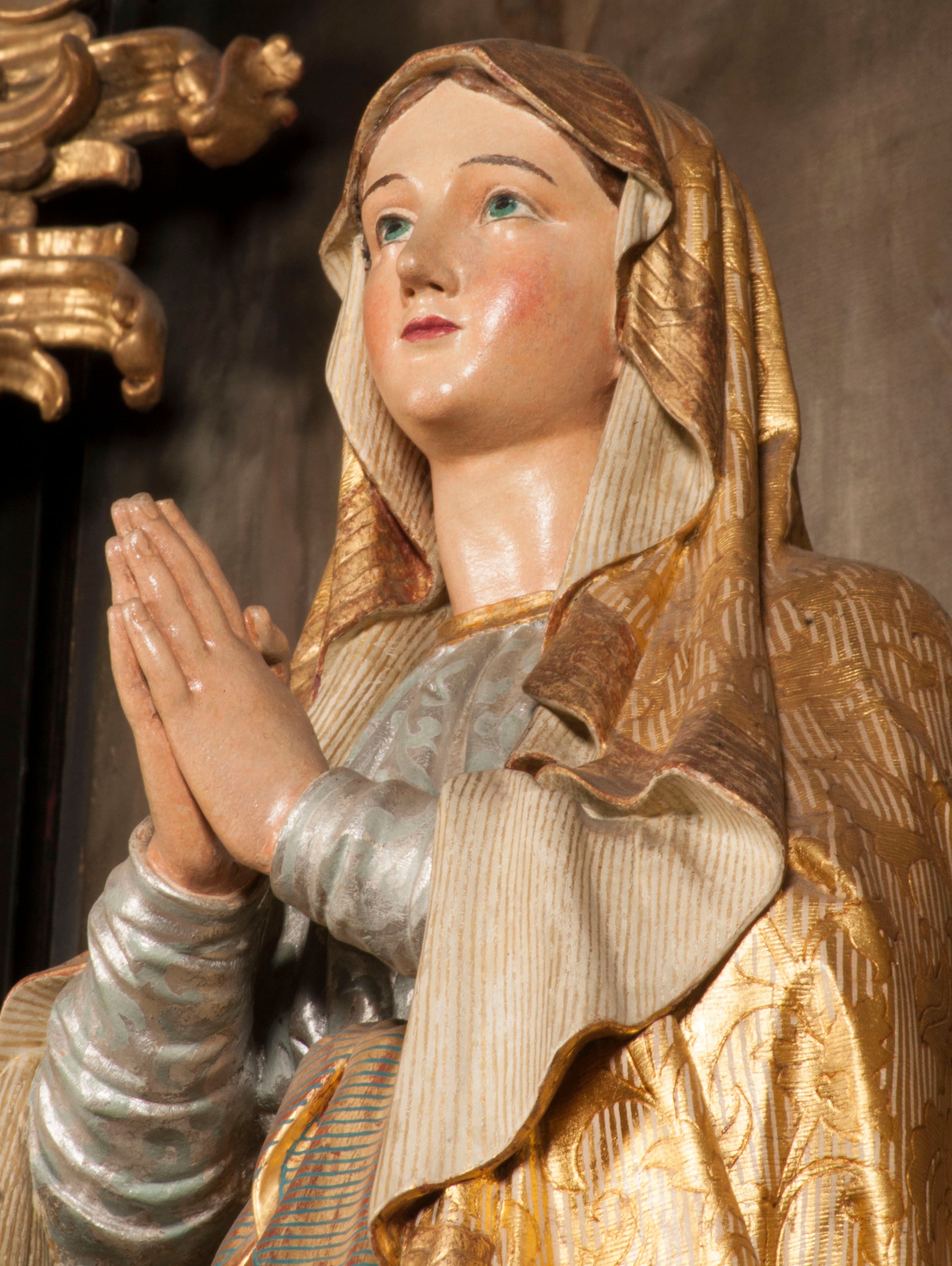 Tabernakulum w formie Arki Przymierza, adorowanej przez dwie klęczące figury starotestamentowego arcykapłana i biskupa oraz dwie stojące postacie lewitów oraz klęczące aniołów, zwieńczonej glorią promienistą z okiem Opatrzności. Wsparte na ośmiu cylindrycznych nóżkach prostopadłościenne tabernakulum jest od frontu podzielone na trzy pola wyznaczone kanelowanymi listwami. Pole środkowe stanowią drzwiczki z rytymi cyframi Dekalogu z ukrzyżowanym Chrystusem, pola boczne z wiązką pałek wodnych z jednej i winnym gronem z drugiej strony. Na skłębionych chmurach z podestem leży Baranek (obecnie w jego miejscu znajduje się figura Matki Boskiej). W tle znacznej wielkości gloria promienista z wieńcem chmur i umieszczonym w nim okiem Opatrzności oraz dwie uskrzydlone główki, nad którymi papieska tiara ze skrzyżowanymi kluczami. Po bokach Baranka dwa klęczące, uskrzydlone nagie aniołki. Obok tabernakulum dwie klęczące postacie z kadzielnicami w rękach. Postać po lewej w stroju biskupim, w albie, stule i kapie oraz infule z dwiema taśmami. Postać po prawej stronie jest ubrany w tradycyjny starotestamentowy strój – efod czyli tunikę i płaszcz wierzchni przepasany na biodrach, pektorał na piersi i zawój na głowie. Za nimi dwaj stojący lewici w tunikach przepasanych na biodrach i wysokich butach. Adorujące Baranka anioły w pozycji klęczącej z rękami skrzyżowanymi na piersi, ze skrzydłami na plecach i nogami w połowie utworzonymi ze skrzydeł.