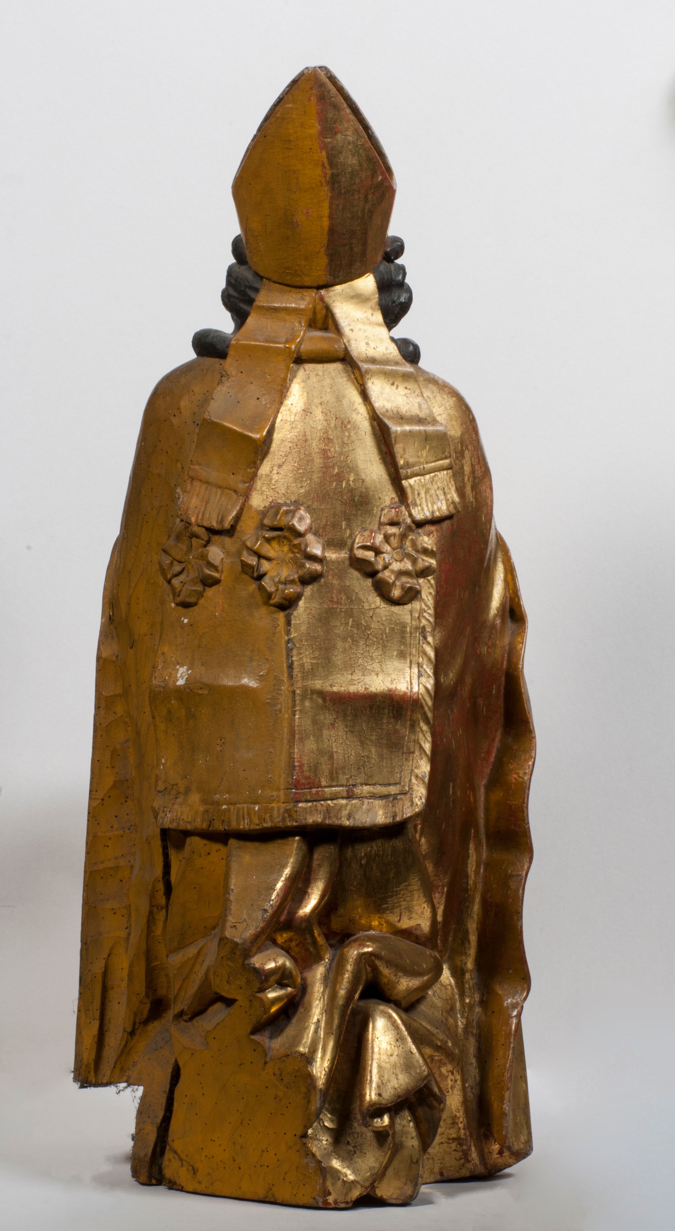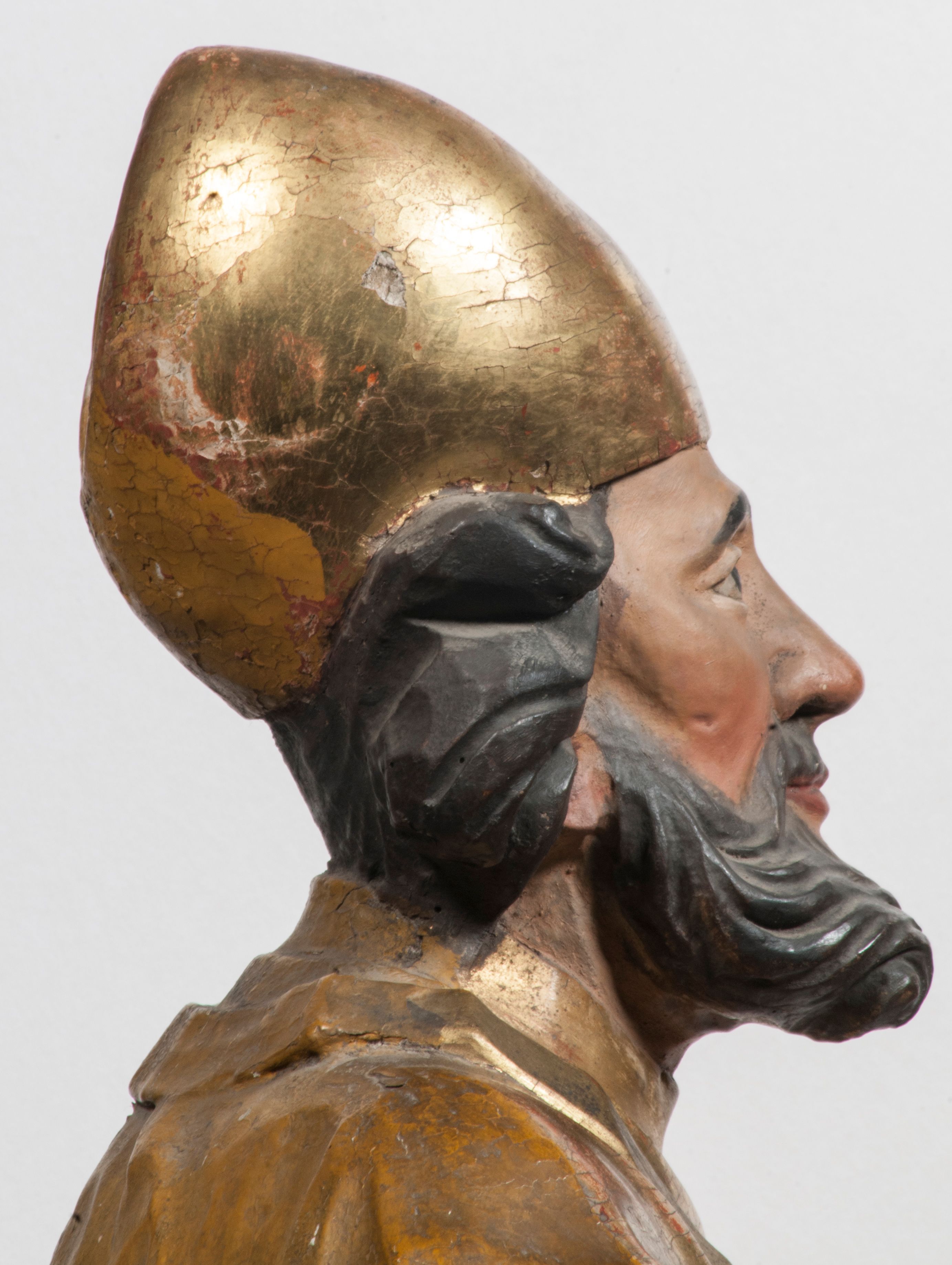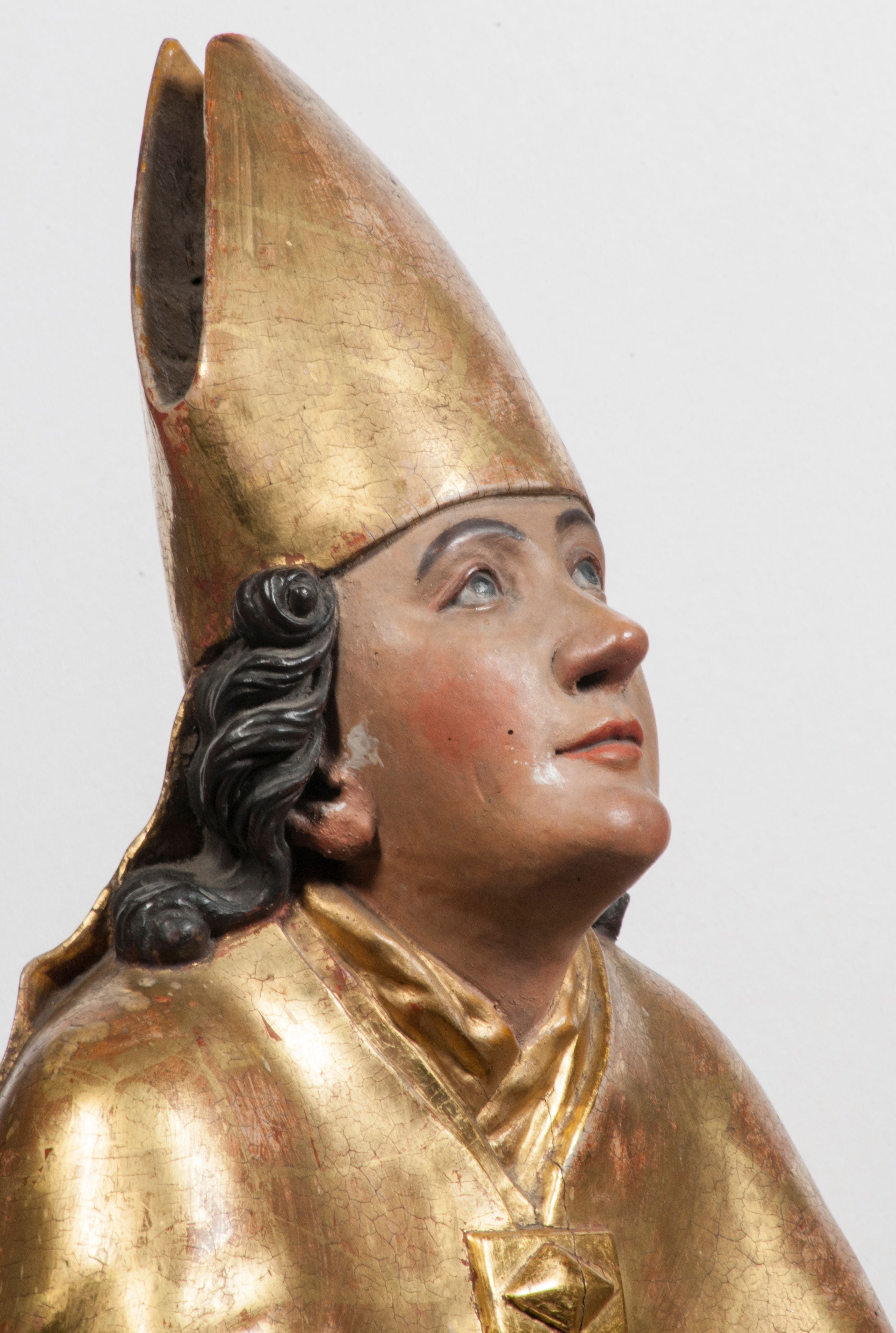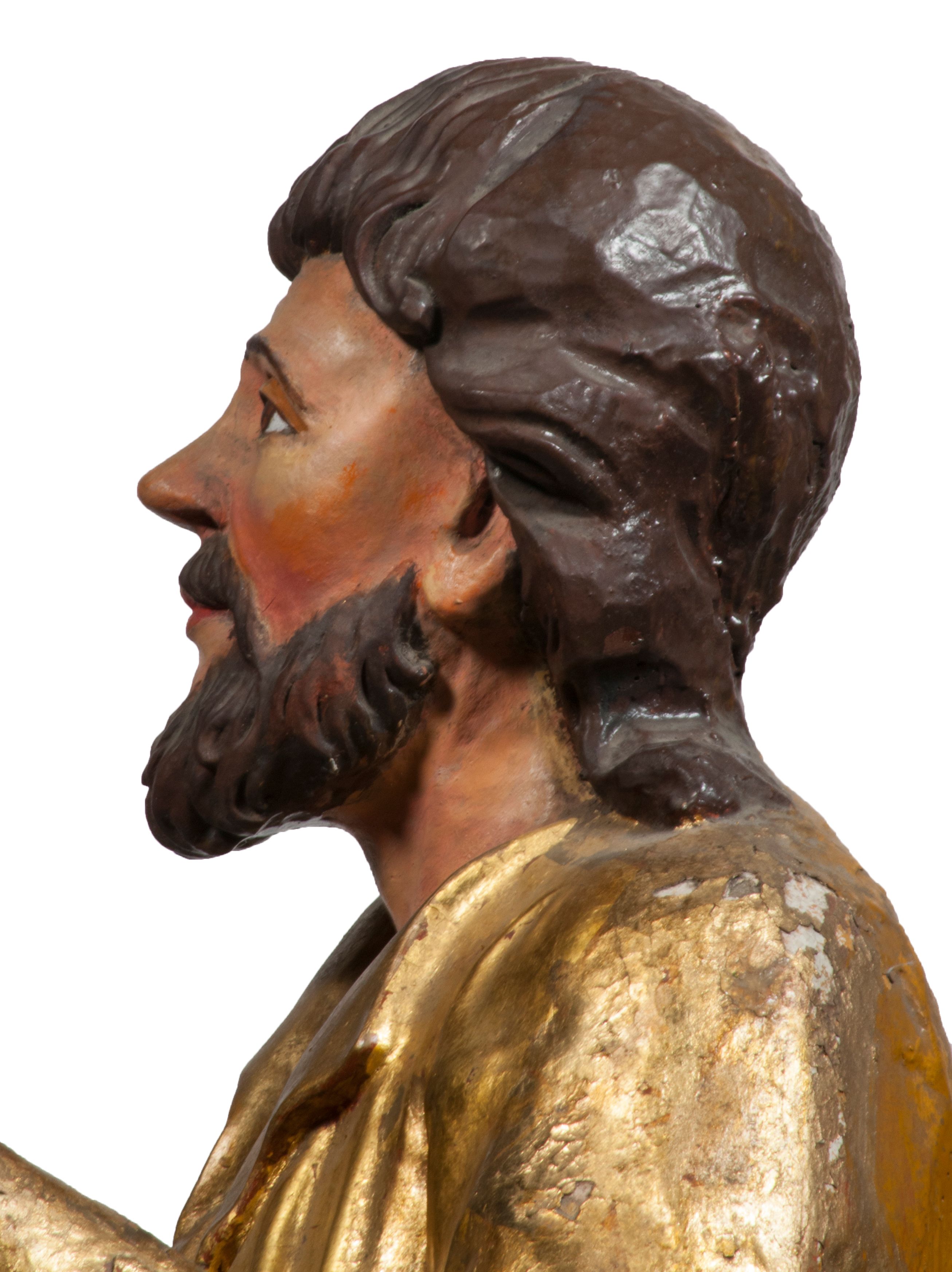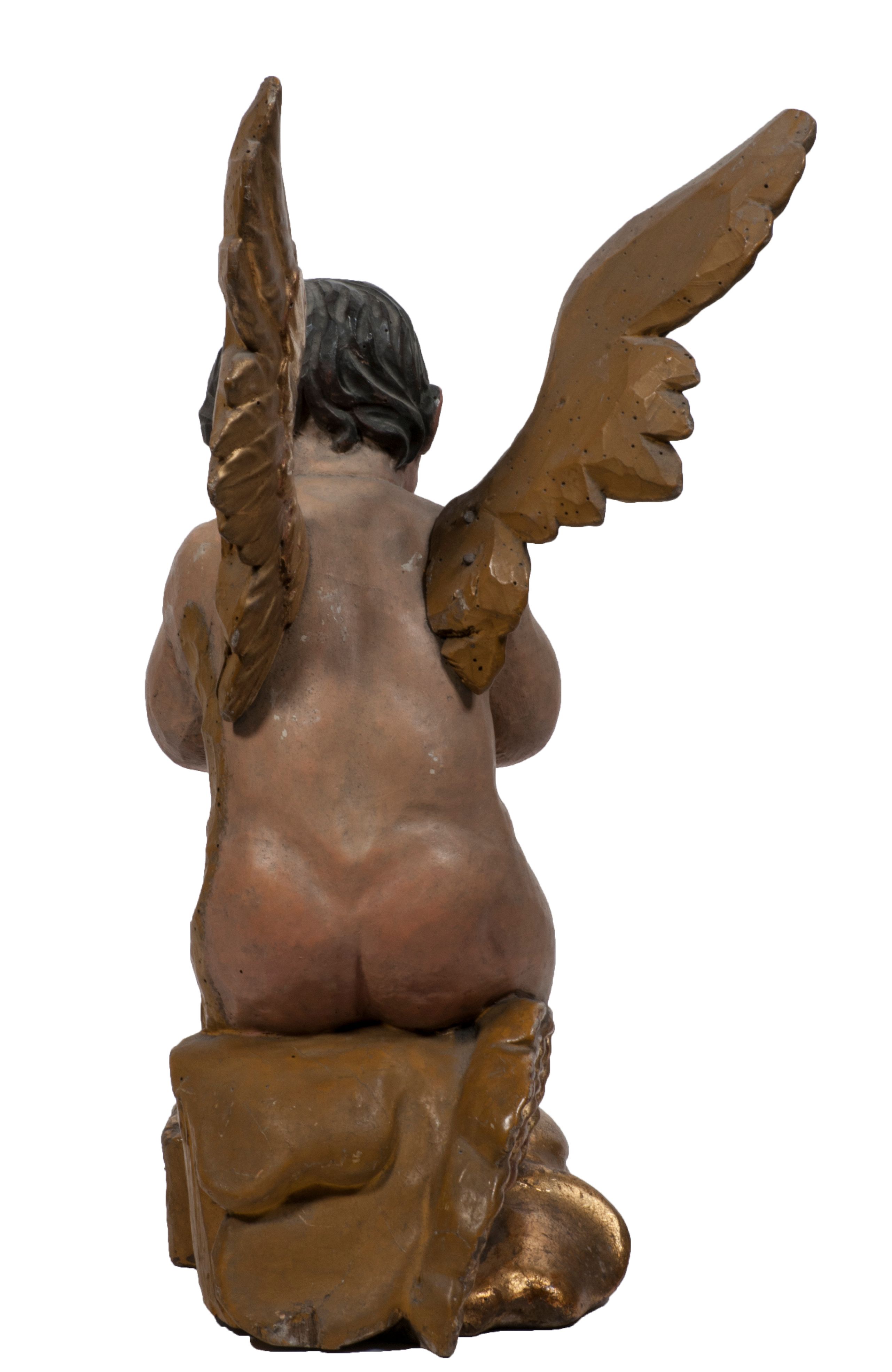 Tabernakulum w formie Arki Przymierza, adorowanej przez dwie klęczące figury starotestamentowego arcykapłana i biskupa oraz dwie stojące postacie lewitów oraz klęczące aniołów, zwieńczonej glorią promienistą z okiem Opatrzności. Wsparte na ośmiu cylindrycznych nóżkach prostopadłościenne tabernakulum jest od frontu podzielone na trzy pola wyznaczone kanelowanymi listwami. Pole środkowe stanowią drzwiczki z rytymi cyframi Dekalogu z ukrzyżowanym Chrystusem, pola boczne z wiązką pałek wodnych z jednej i winnym gronem z drugiej strony. Na skłębionych chmurach z podestem leży Baranek (obecnie w jego miejscu znajduje się figura Matki Boskiej). W tle znacznej wielkości gloria promienista z wieńcem chmur i umieszczonym w nim okiem Opatrzności oraz dwie uskrzydlone główki, nad którymi papieska tiara ze skrzyżowanymi kluczami. Po bokach Baranka dwa klęczące, uskrzydlone nagie aniołki. Obok tabernakulum dwie klęczące postacie z kadzielnicami w rękach. Postać po lewej w stroju biskupim, w albie, stule i kapie oraz infule z dwiema taśmami. Postać po prawej stronie jest ubrany w tradycyjny starotestamentowy strój – efod czyli tunikę i płaszcz wierzchni przepasany na biodrach, pektorał na piersi i zawój na głowie. Za nimi dwaj stojący lewici w tunikach przepasanych na biodrach i wysokich butach. Adorujące Baranka anioły w pozycji klęczącej z rękami skrzyżowanymi na piersi, ze skrzydłami na plecach i nogami w połowie utworzonymi ze skrzydeł.