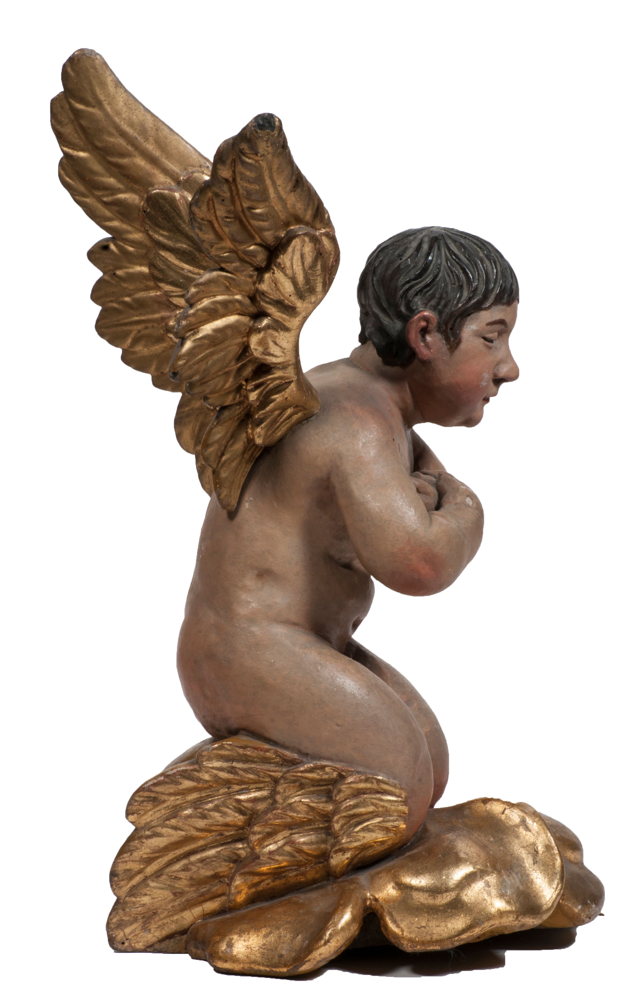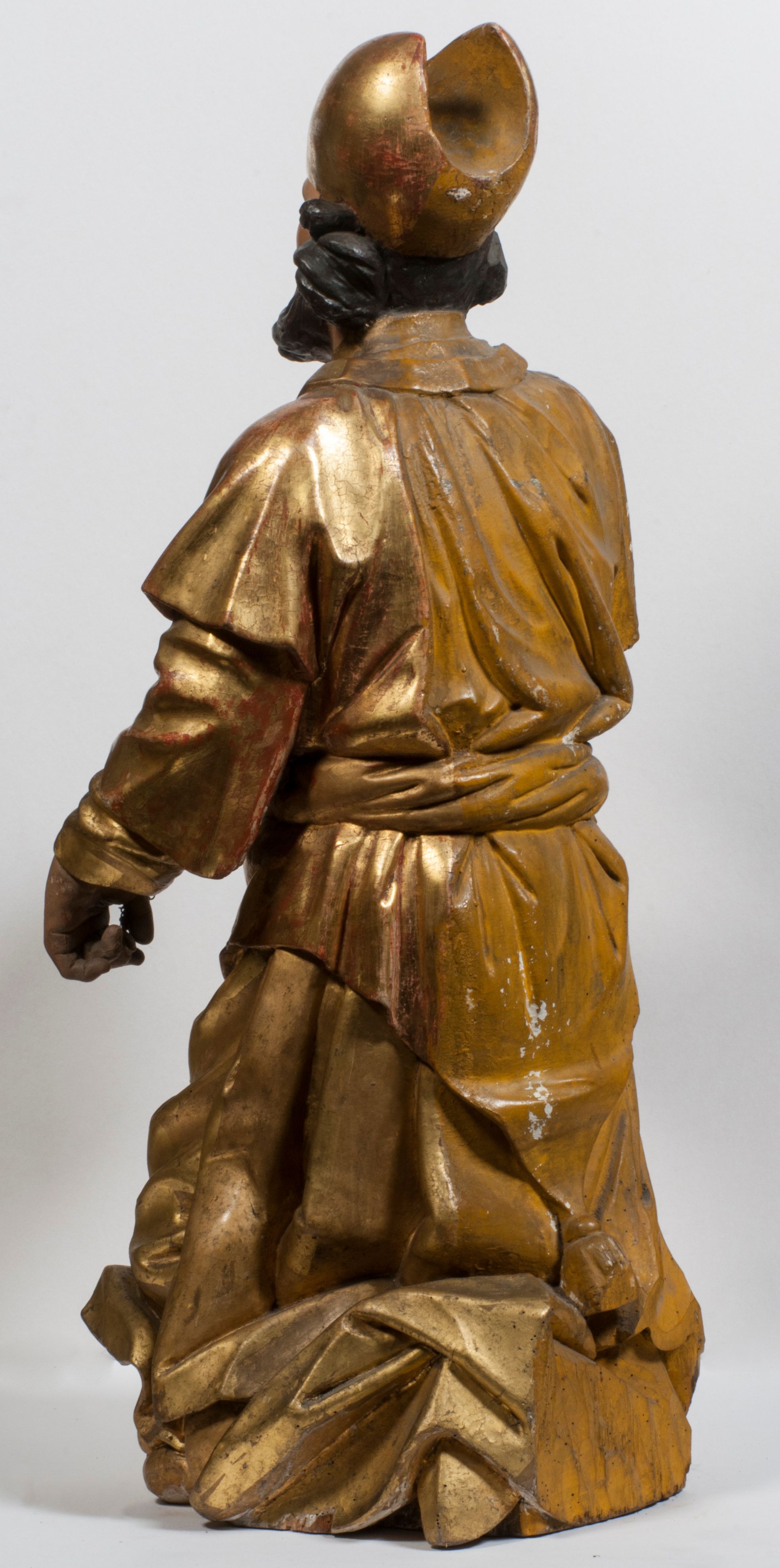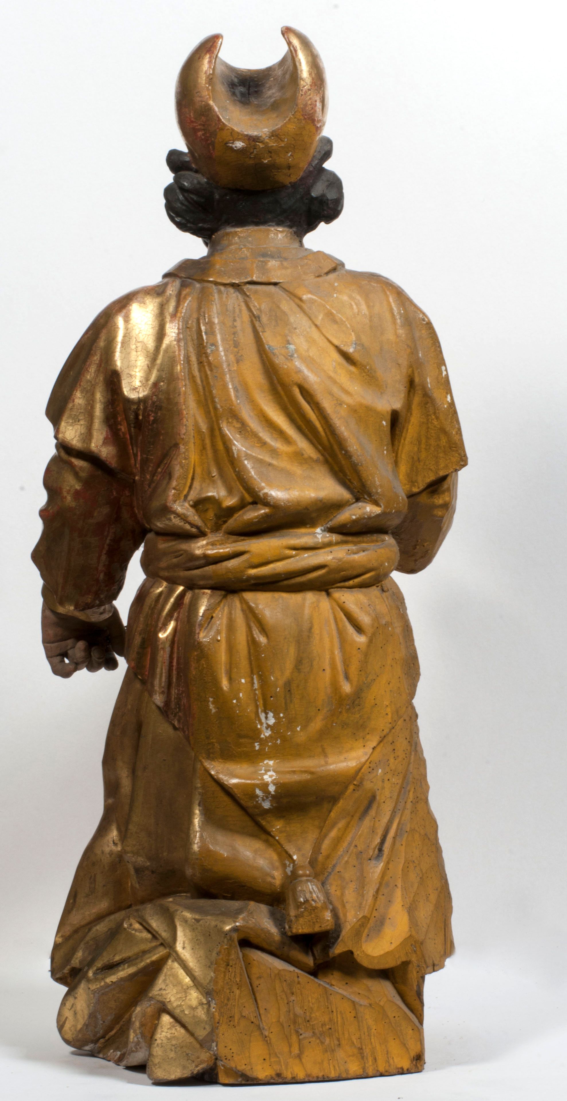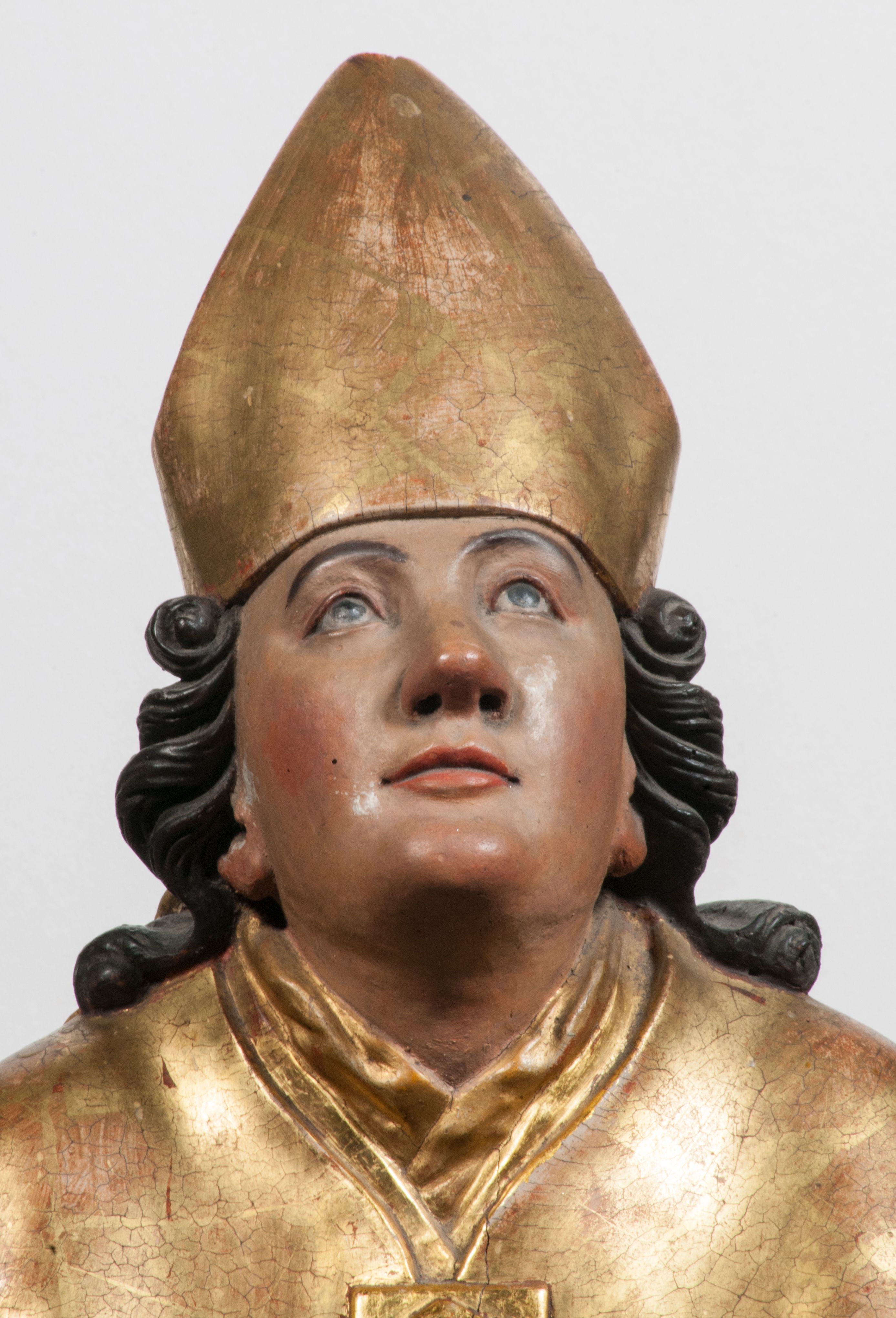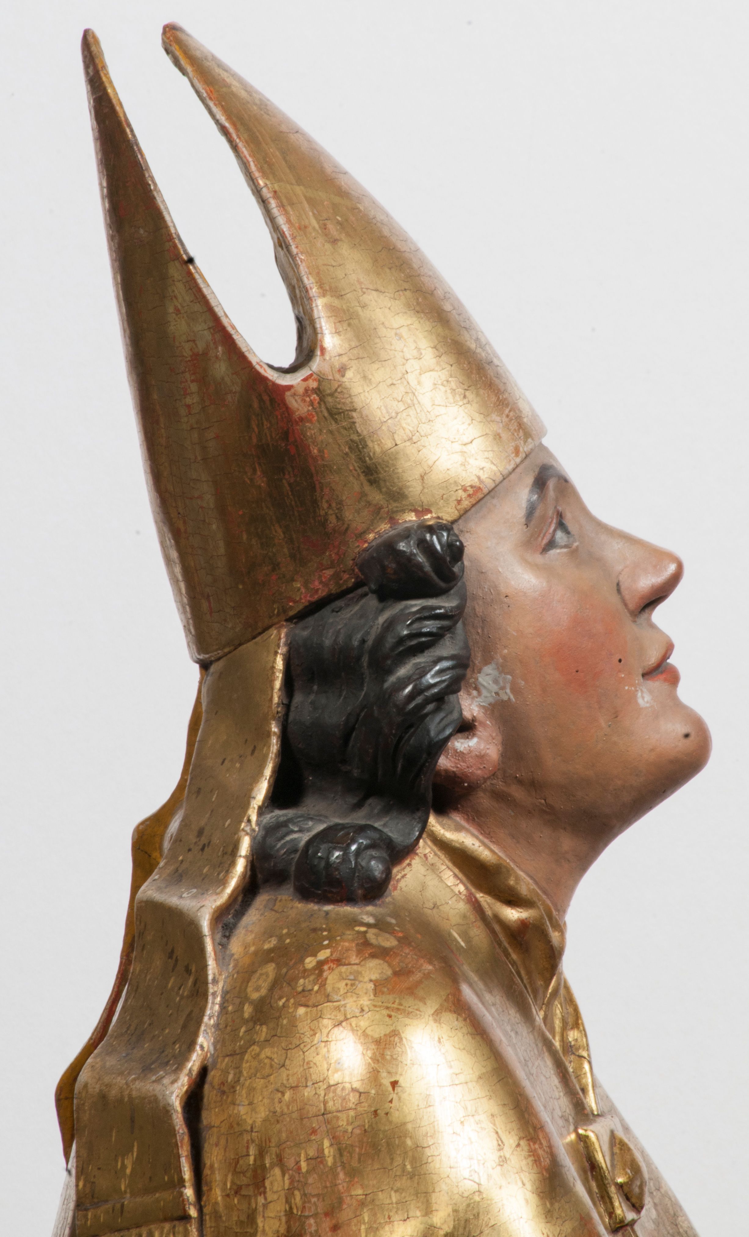 Tabernakulum w formie Arki Przymierza, adorowanej przez dwie klęczące figury starotestamentowego arcykapłana i biskupa oraz dwie stojące postacie lewitów oraz klęczące aniołów, zwieńczonej glorią promienistą z okiem Opatrzności. Wsparte na ośmiu cylindrycznych nóżkach prostopadłościenne tabernakulum jest od frontu podzielone na trzy pola wyznaczone kanelowanymi listwami. Pole środkowe stanowią drzwiczki z rytymi cyframi Dekalogu z ukrzyżowanym Chrystusem, pola boczne z wiązką pałek wodnych z jednej i winnym gronem z drugiej strony. Na skłębionych chmurach z podestem leży Baranek (obecnie w jego miejscu znajduje się figura Matki Boskiej). W tle znacznej wielkości gloria promienista z wieńcem chmur i umieszczonym w nim okiem Opatrzności oraz dwie uskrzydlone główki, nad którymi papieska tiara ze skrzyżowanymi kluczami. Po bokach Baranka dwa klęczące, uskrzydlone nagie aniołki. Obok tabernakulum dwie klęczące postacie z kadzielnicami w rękach. Postać po lewej w stroju biskupim, w albie, stule i kapie oraz infule z dwiema taśmami. Postać po prawej stronie jest ubrany w tradycyjny starotestamentowy strój – efod czyli tunikę i płaszcz wierzchni przepasany na biodrach, pektorał na piersi i zawój na głowie. Za nimi dwaj stojący lewici w tunikach przepasanych na biodrach i wysokich butach. Adorujące Baranka anioły w pozycji klęczącej z rękami skrzyżowanymi na piersi, ze skrzydłami na plecach i nogami w połowie utworzonymi ze skrzydeł.