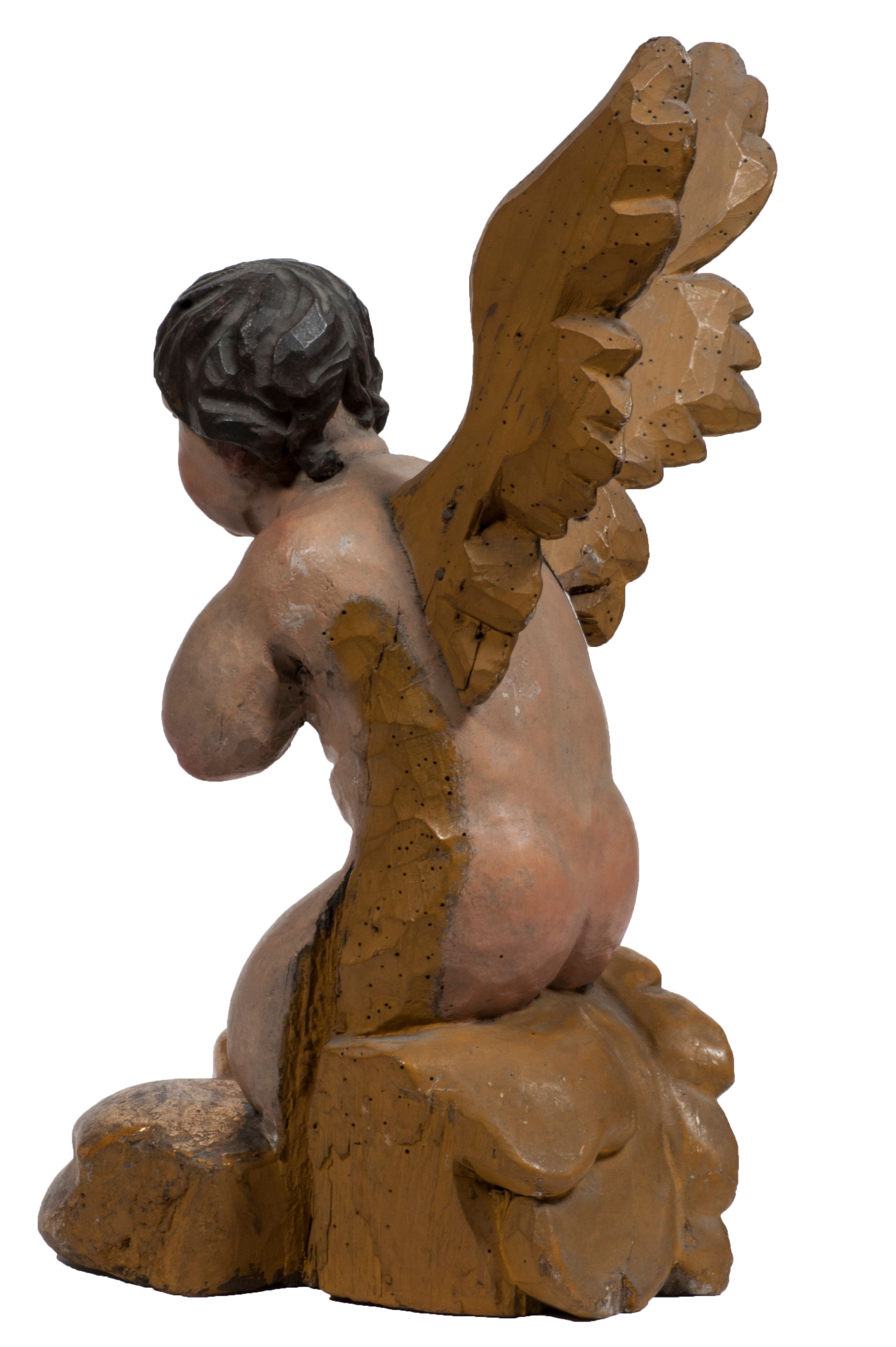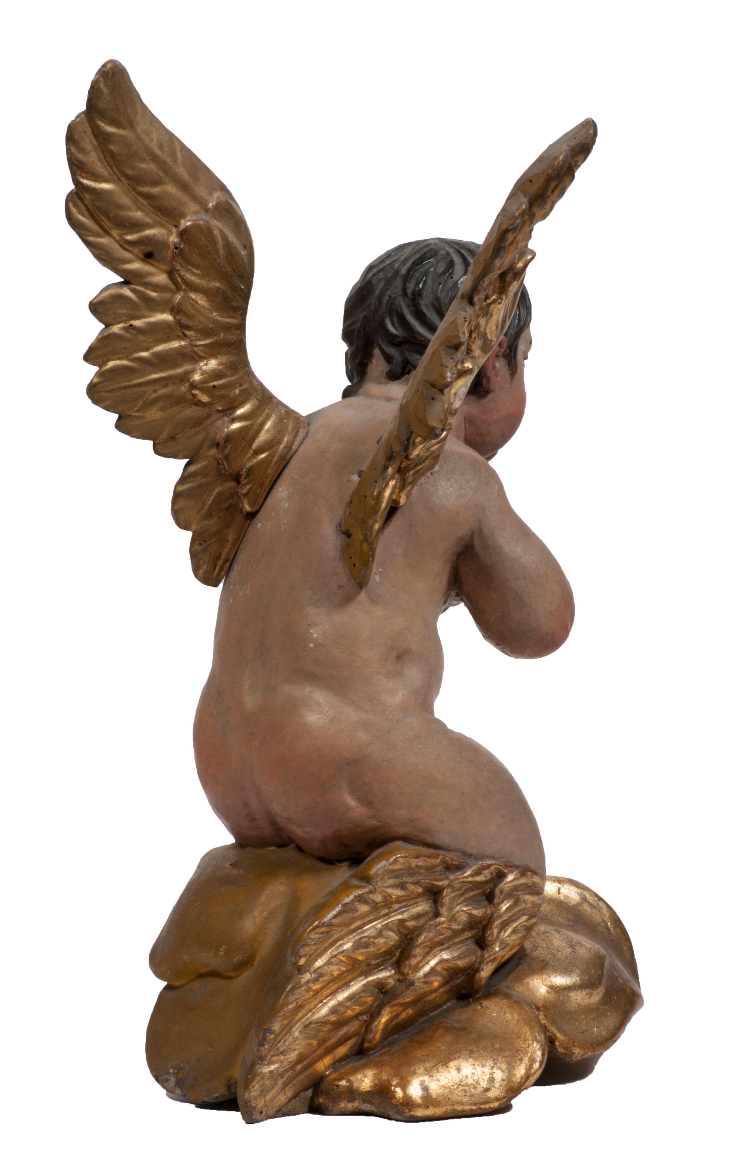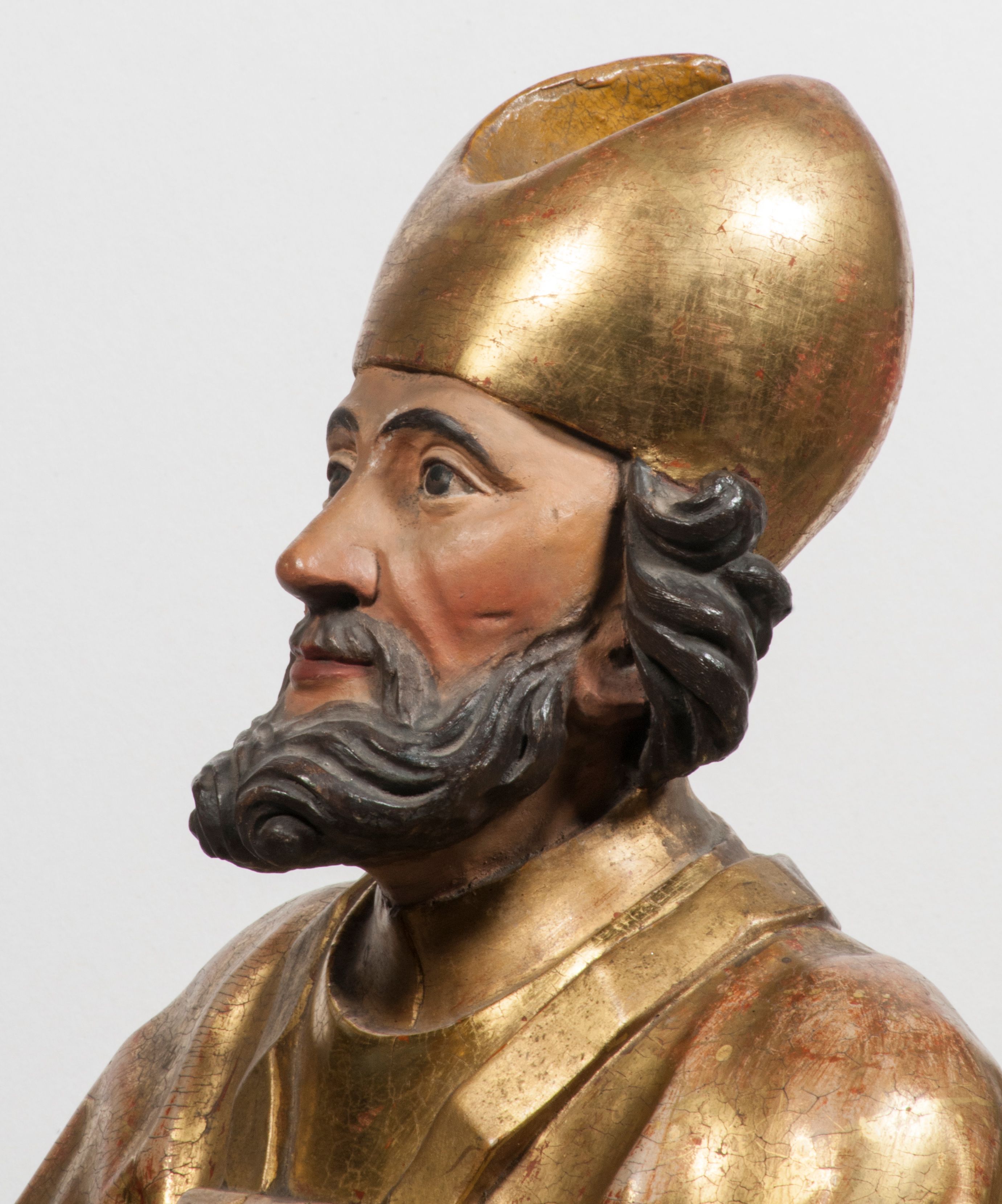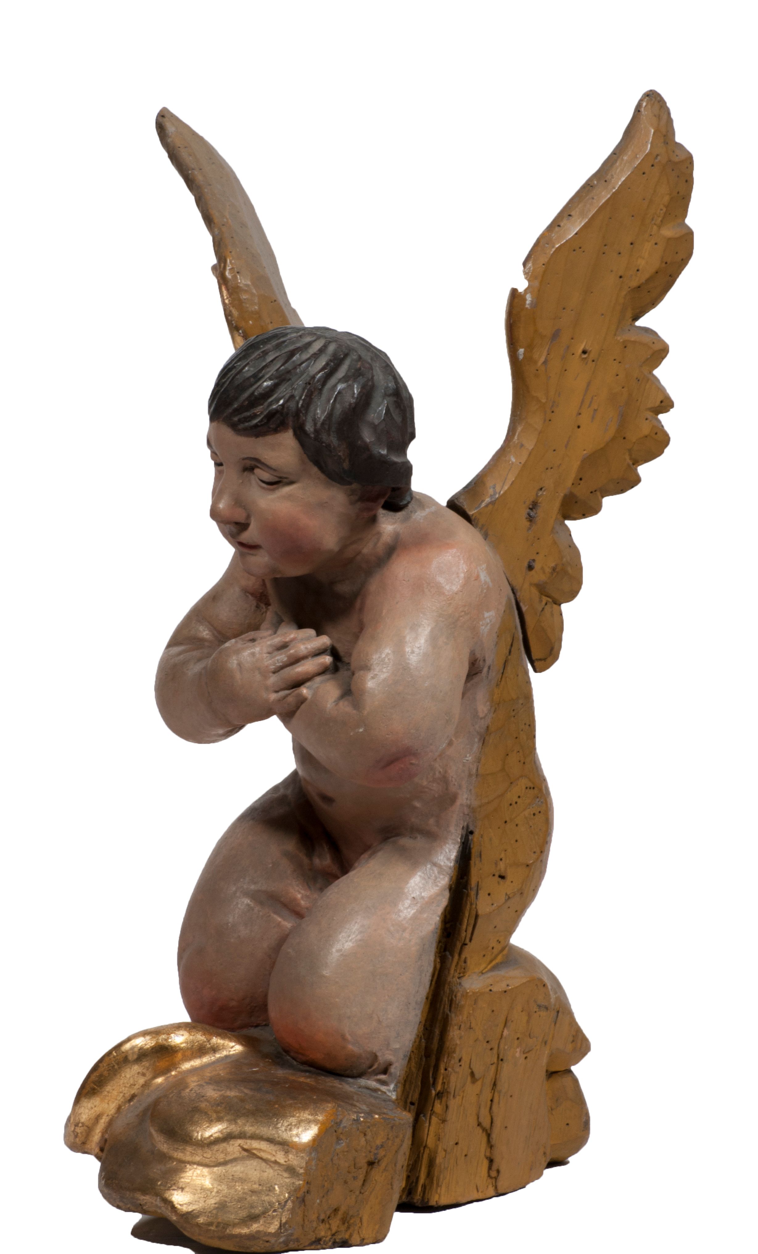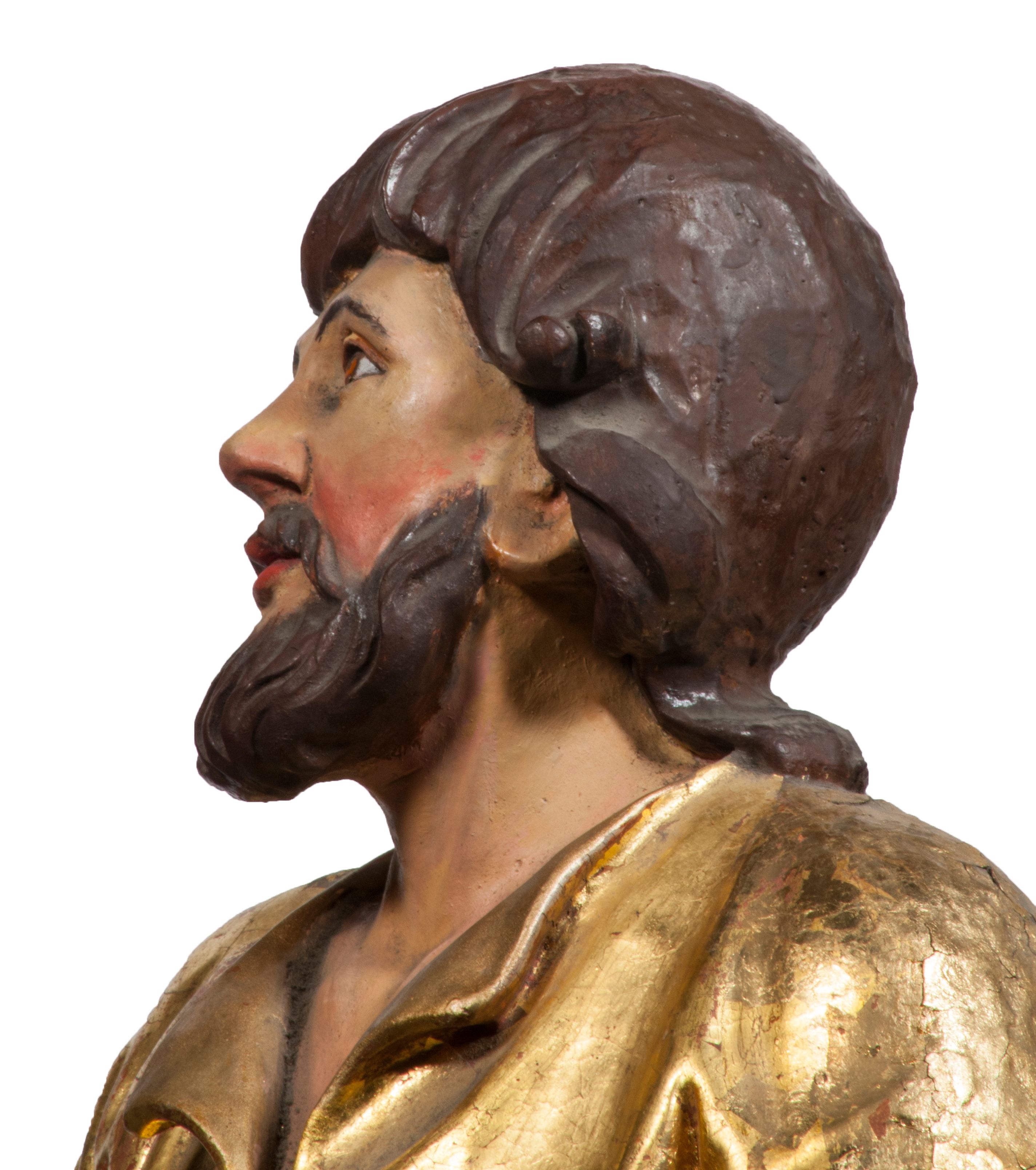 Tabernakulum w formie Arki Przymierza, adorowanej przez dwie klęczące figury starotestamentowego arcykapłana i biskupa oraz dwie stojące postacie lewitów oraz klęczące aniołów, zwieńczonej glorią promienistą z okiem Opatrzności. Wsparte na ośmiu cylindrycznych nóżkach prostopadłościenne tabernakulum jest od frontu podzielone na trzy pola wyznaczone kanelowanymi listwami. Pole środkowe stanowią drzwiczki z rytymi cyframi Dekalogu z ukrzyżowanym Chrystusem, pola boczne z wiązką pałek wodnych z jednej i winnym gronem z drugiej strony. Na skłębionych chmurach z podestem leży Baranek (obecnie w jego miejscu znajduje się figura Matki Boskiej). W tle znacznej wielkości gloria promienista z wieńcem chmur i umieszczonym w nim okiem Opatrzności oraz dwie uskrzydlone główki, nad którymi papieska tiara ze skrzyżowanymi kluczami. Po bokach Baranka dwa klęczące, uskrzydlone nagie aniołki. Obok tabernakulum dwie klęczące postacie z kadzielnicami w rękach. Postać po lewej w stroju biskupim, w albie, stule i kapie oraz infule z dwiema taśmami. Postać po prawej stronie jest ubrany w tradycyjny starotestamentowy strój – efod czyli tunikę i płaszcz wierzchni przepasany na biodrach, pektorał na piersi i zawój na głowie. Za nimi dwaj stojący lewici w tunikach przepasanych na biodrach i wysokich butach. Adorujące Baranka anioły w pozycji klęczącej z rękami skrzyżowanymi na piersi, ze skrzydłami na plecach i nogami w połowie utworzonymi ze skrzydeł.
