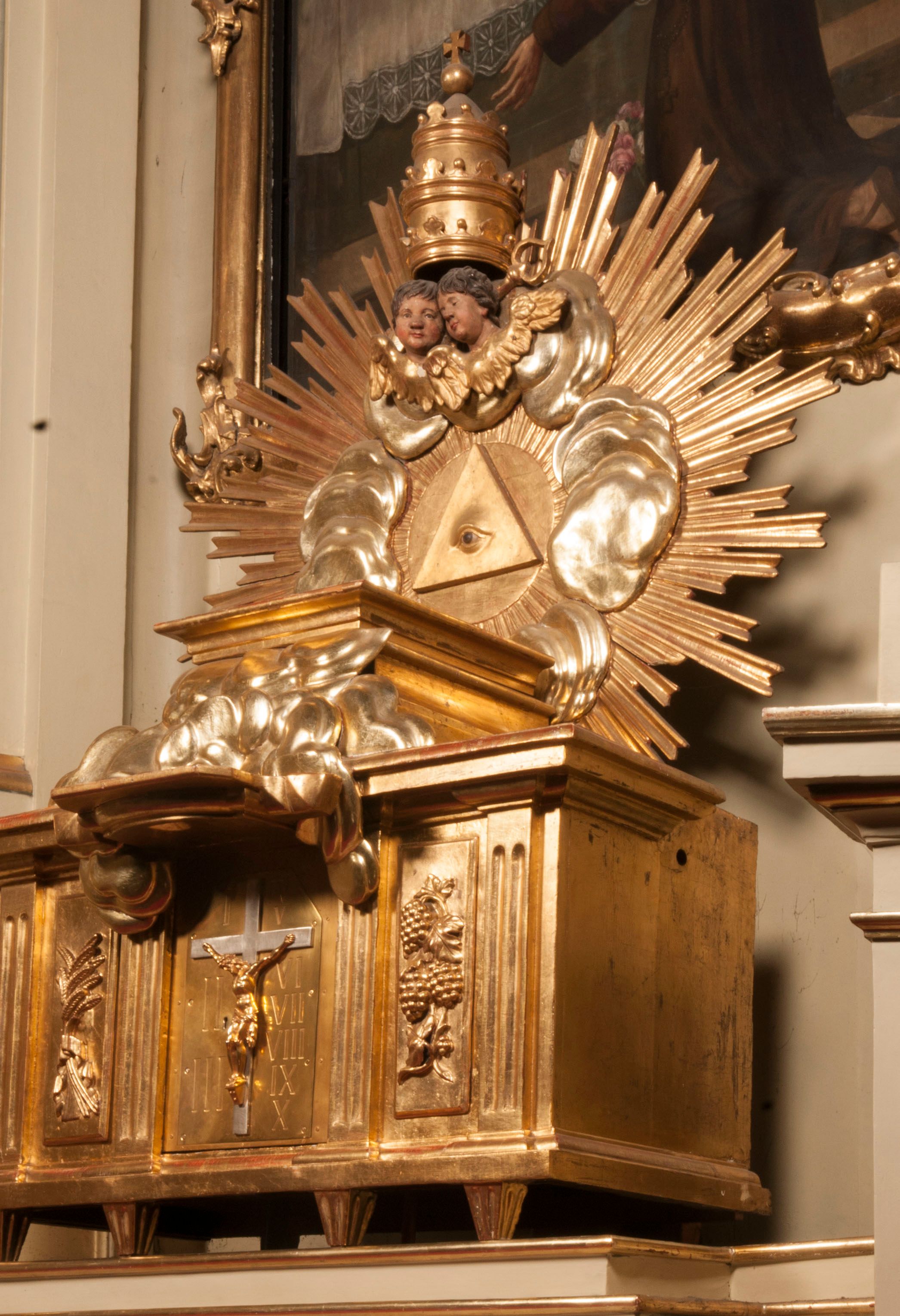 Tabernakulum powstało w 1797 roku i ma kształt Arki Przymierza adorowanej przez klęczących przedstawicieli Starego Testamentu – starotestamentowego kapłana i Nowego Testamentu – biskupa. W tle zlokalizowano dwóch lewitów oraz dwa klęczące aniołki. Uosobieniem Chrystusa, którego ciało jest przechowywane w tabernakulum, jest Baranek na chmurach, na tle glorii promienistej z okiem Opatrzności.