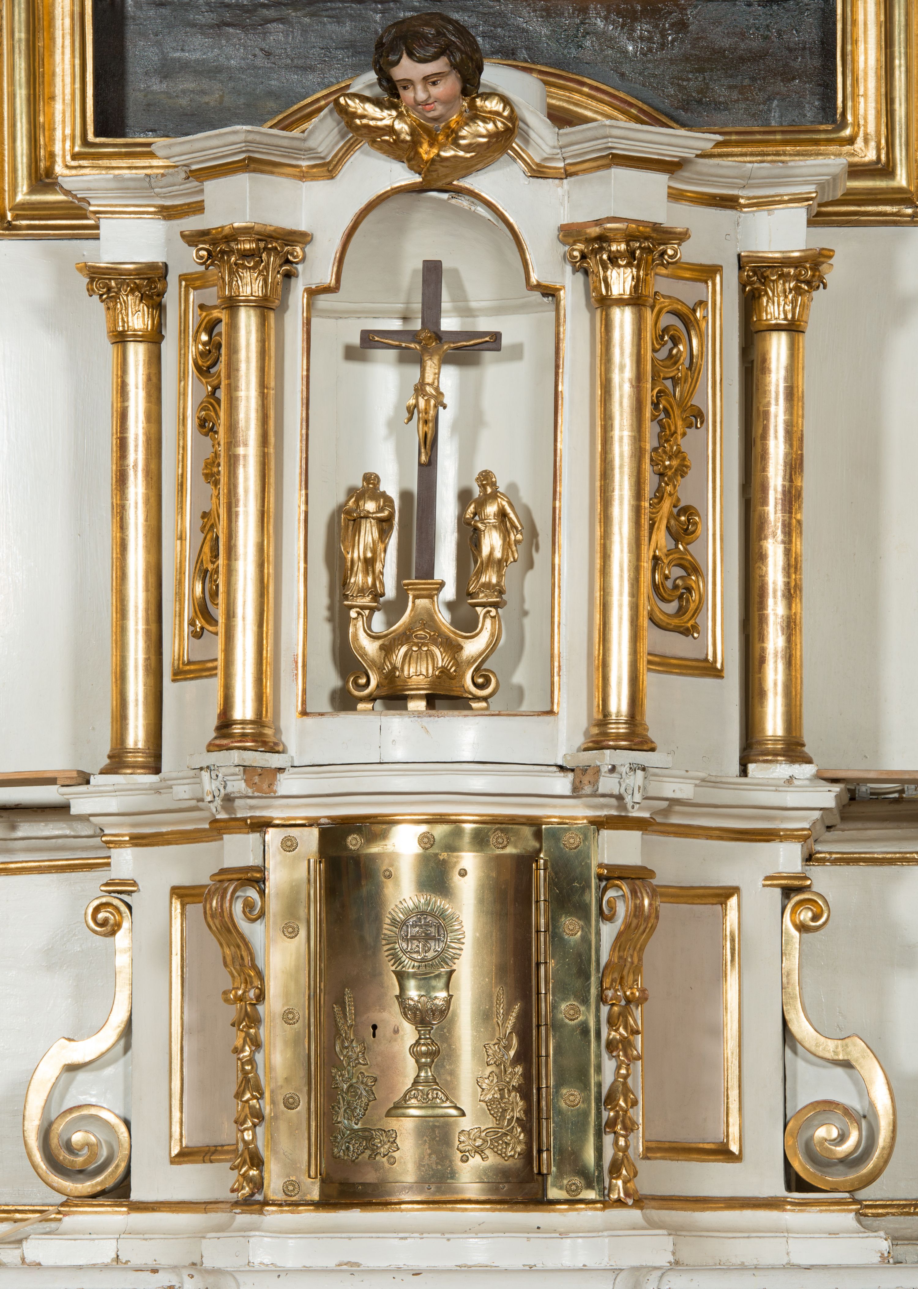 Tabernakulum o kształcie prostopadłościennej skrzynki obitej blachą o wypukłym licu. Drzwiczki w formie stojącego prostokąta z przedstawieniem kielicha z hostią w glorii promienistej oraz winnej latorośli z kłosami zbóż. Tabernakulum w drewnianej obudowie, z dostawionymi po bokach prostopadłościanami, o wklęsłych licach, z parą pilastrów o konsolach z kampanulami w miejscu trzonów, ujęte spływami wolutowymi. Tron wystawienia w formie sześcianu, o ściętych narożach, ujęty czterema kolumienkami podtrzymującymi imposty oraz gzyms wyłamujący się pośrodku na kształt łuku odcinkowego. W polu środkowym obrotowa nisza o wykroju stojącego prostokąta zamkniętego łukiem półkolistym nadwieszonym. Na osiach bocznych płyciny z ornamentem roślinnym. Całość zwieńczona uskrzydloną główką anielską. Struktura polichromowana w kolorze białym, kolumienki, profile i ornamentyka złocone.