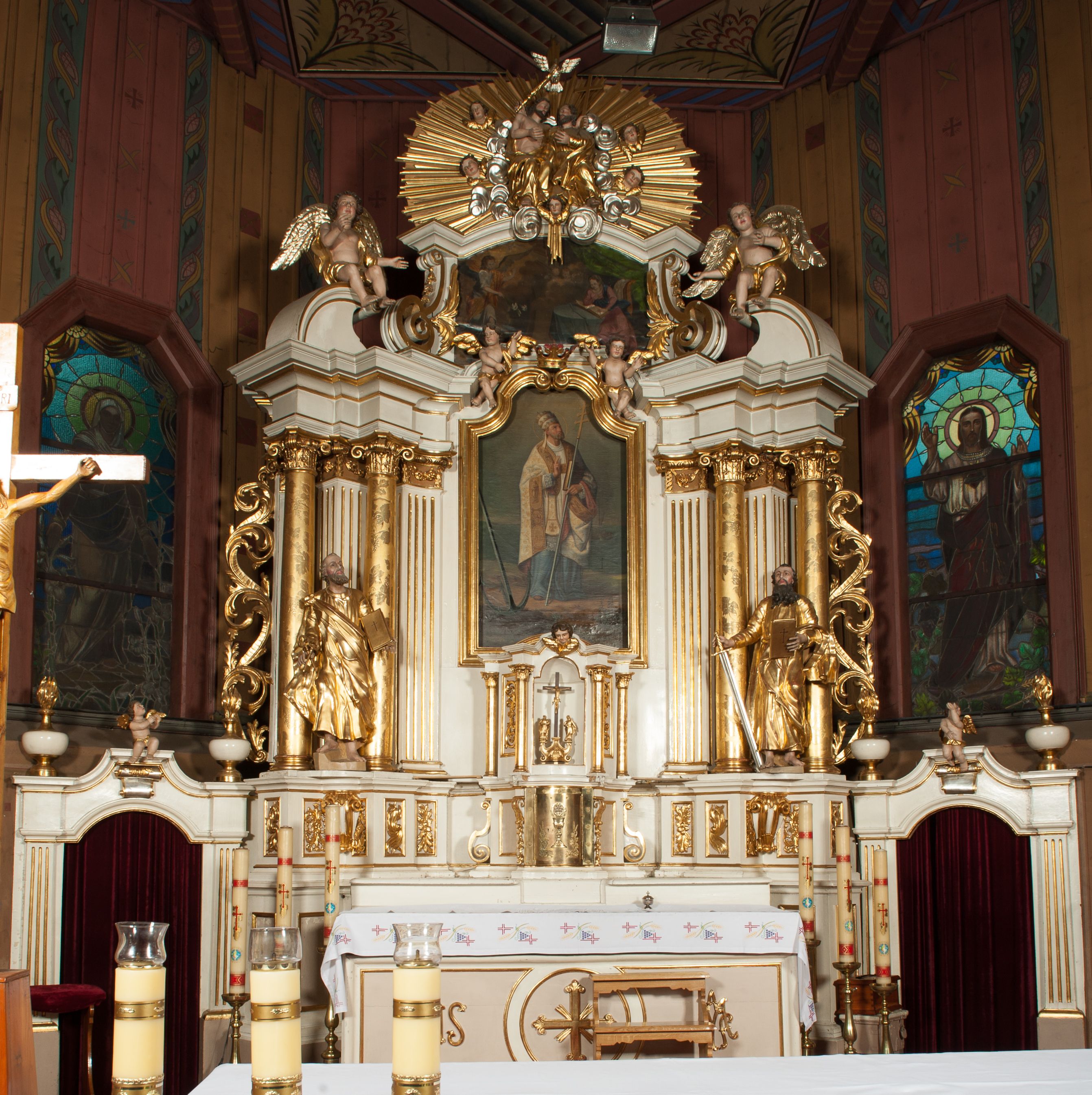 Zawojskie tabernakulum z ołtarza głównego przyjmuje typową dla XVIII wieku formę skrzynki rozbudowywanej o kolejne podpory i spływy wolutowe. Podobnie tron wystawienia z obrotową niszą. Tabernakulum jest to zamykana szafka umieszczana na ołtarzu głównym, w której przechowywany jest Najświętszy Sakrament.
