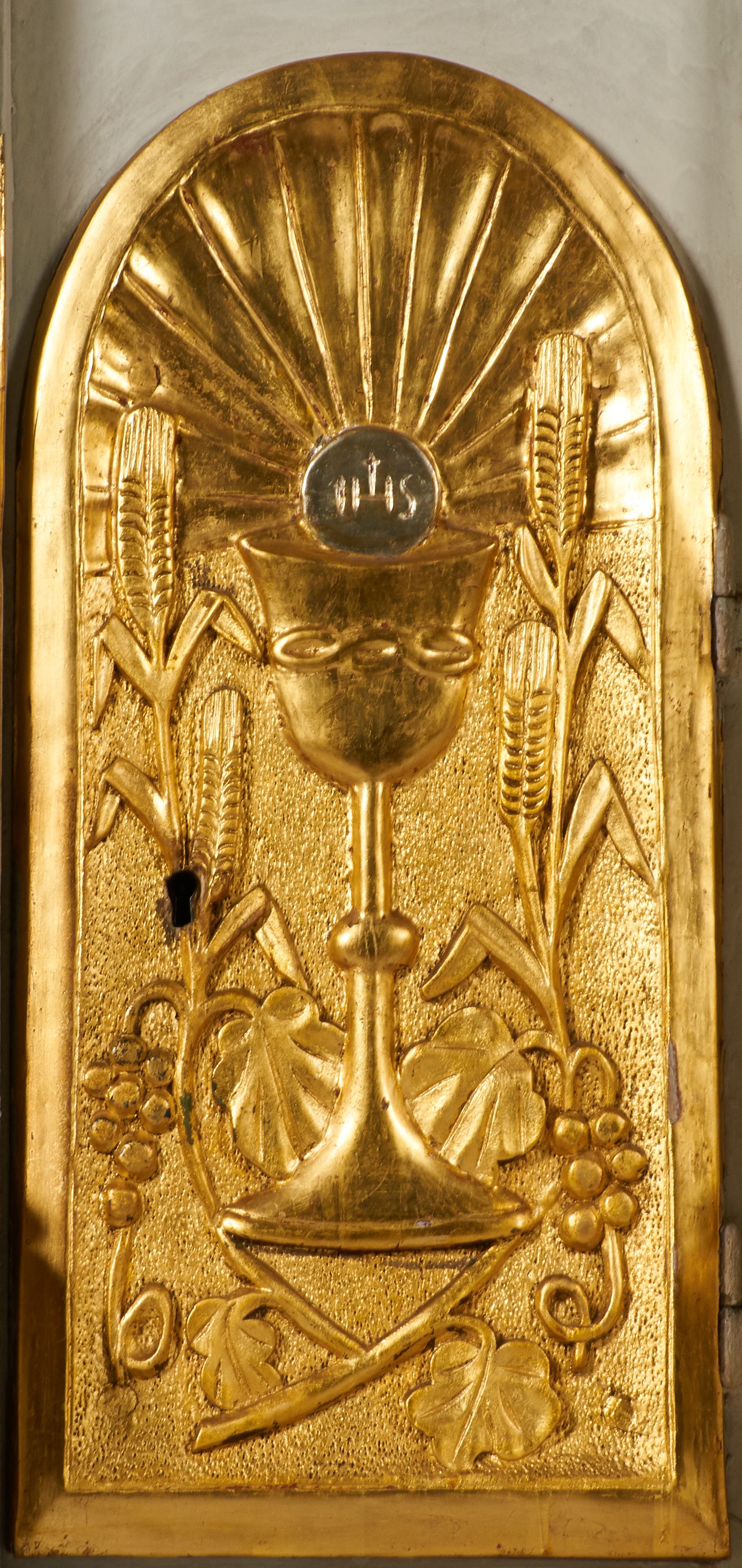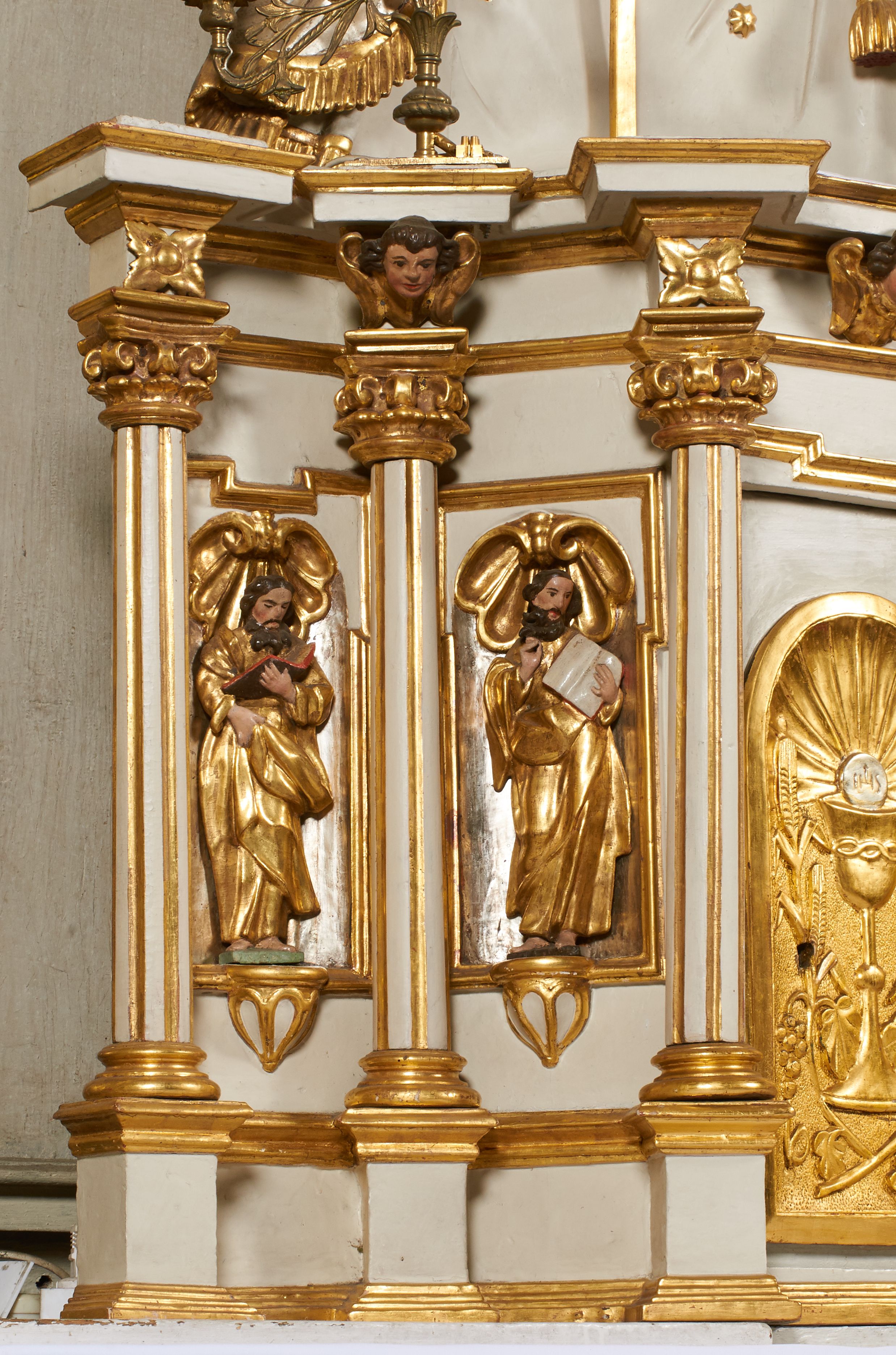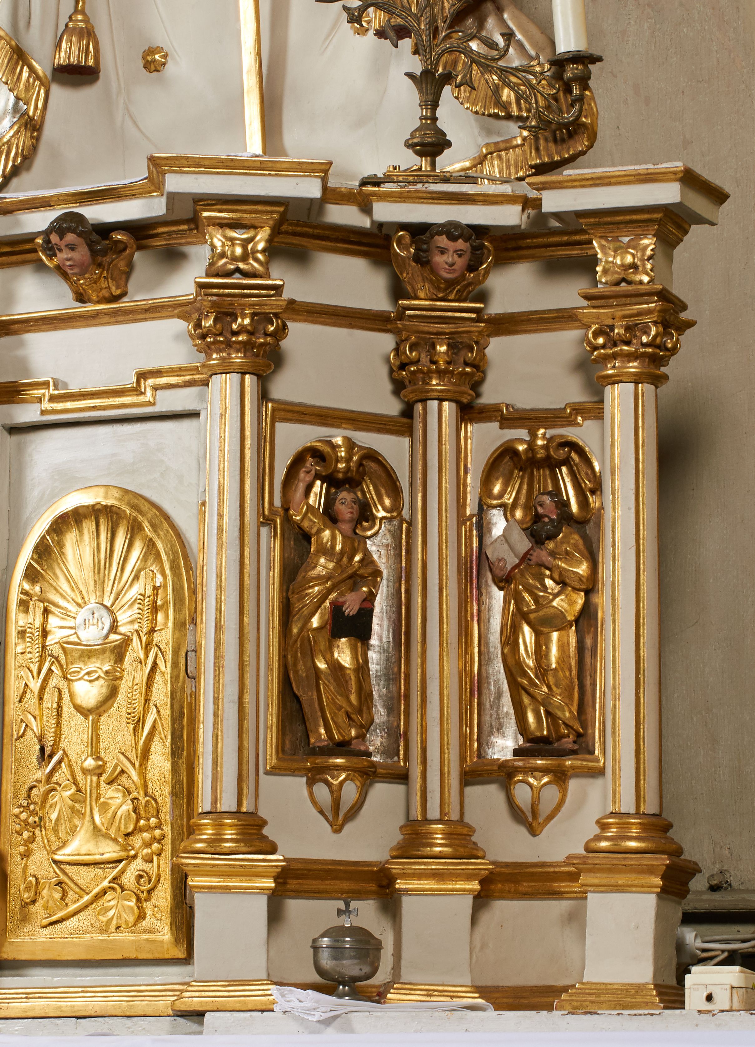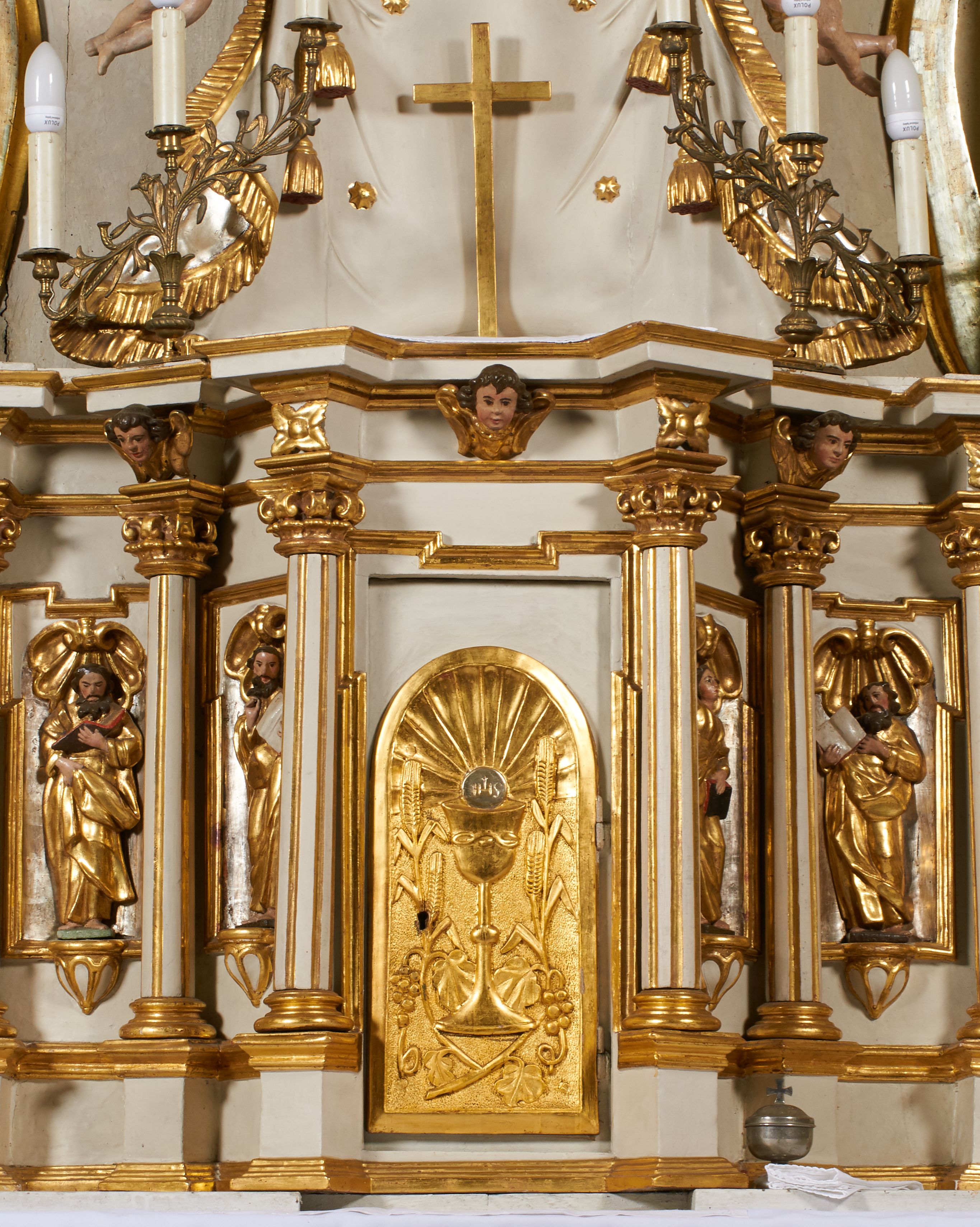 Tron wystawienia grabskiego tabernakulum otrzymał formę nawiązującą do niearchitektonicznego ołtarza głównego. Przed wymianą tabernakulum na wzmocnione, pierwotne drzwiczki dekorowane były niszą z konchą i figurką błogosławiącego Chrystusa, który tworzył ikonograficzną całość z postaciami ewangelistów na osiach bocznych.