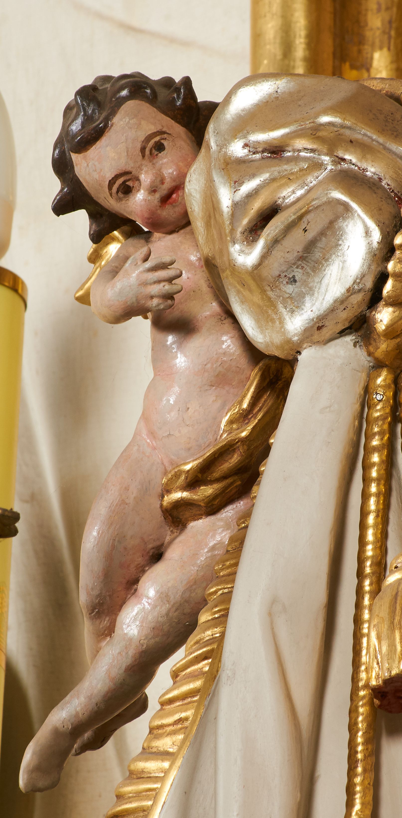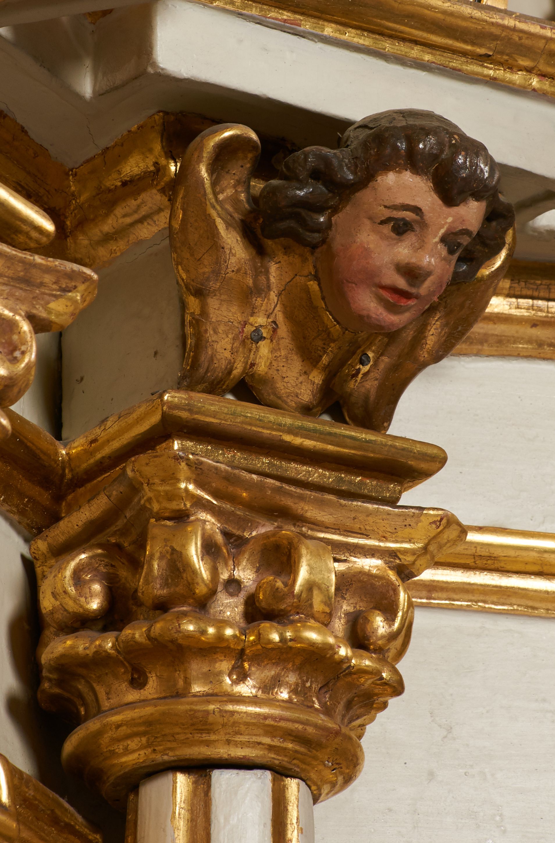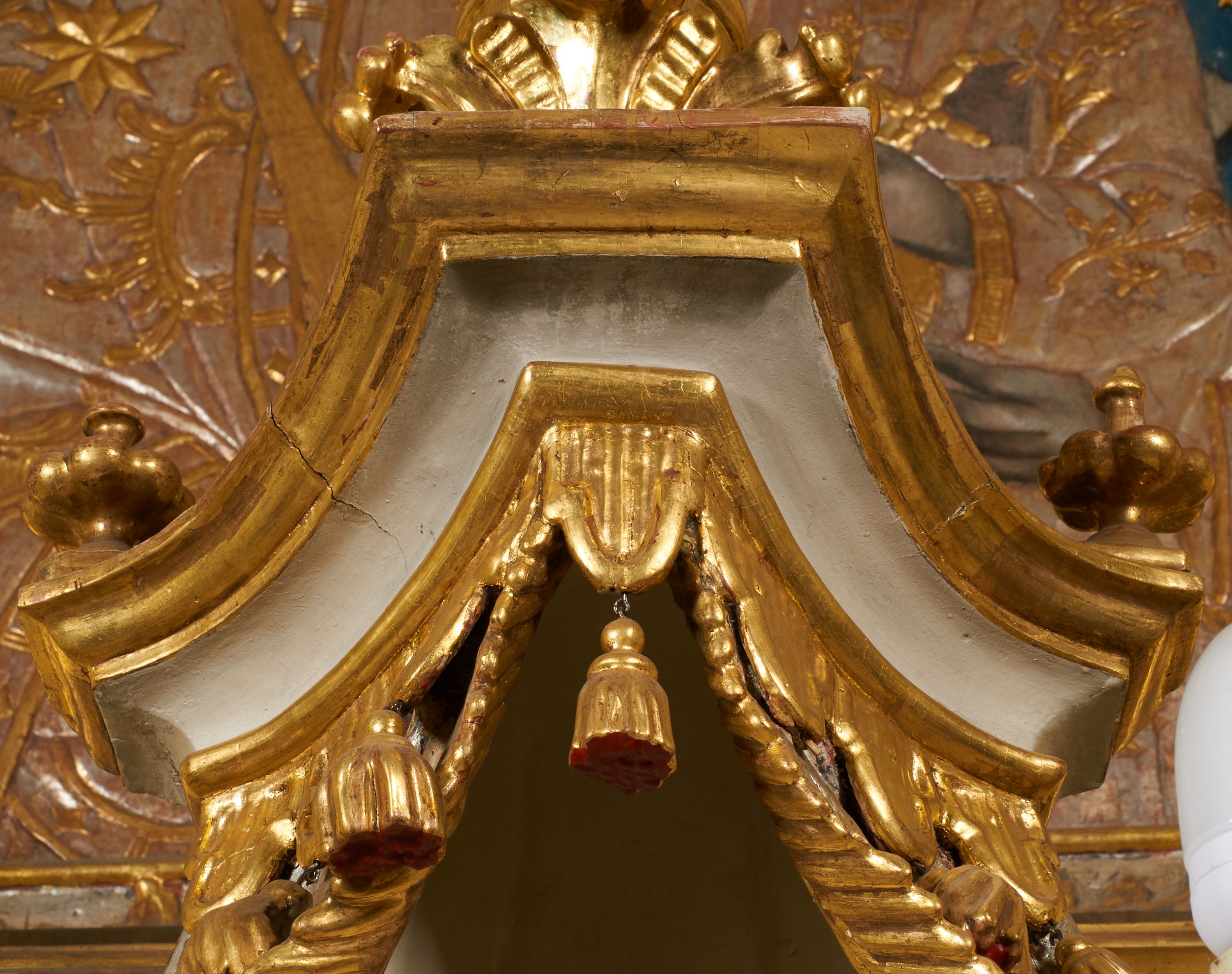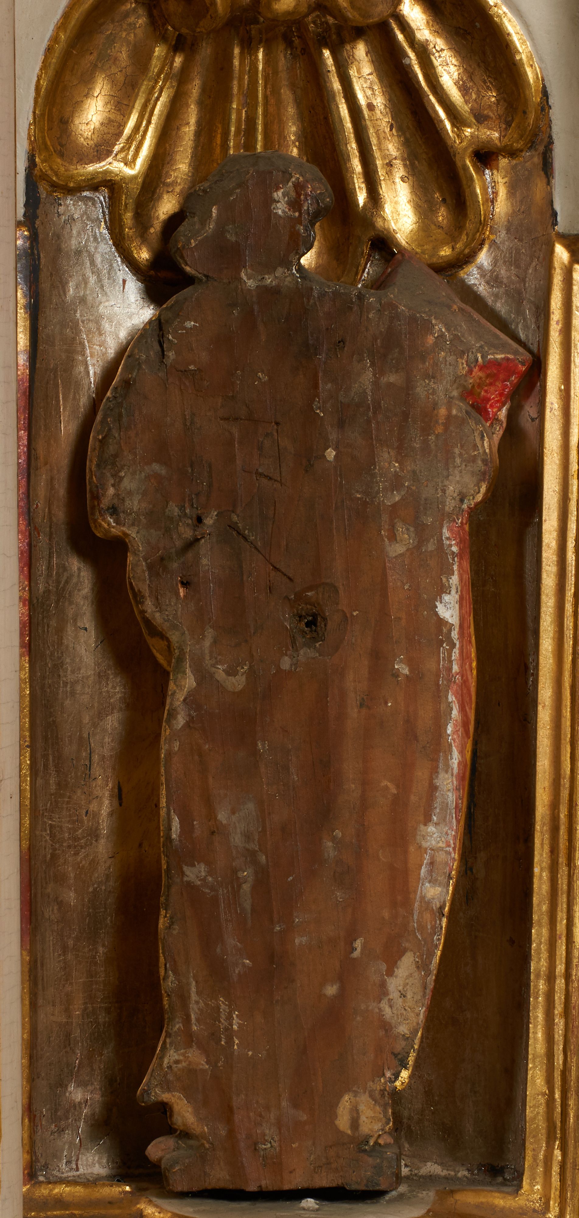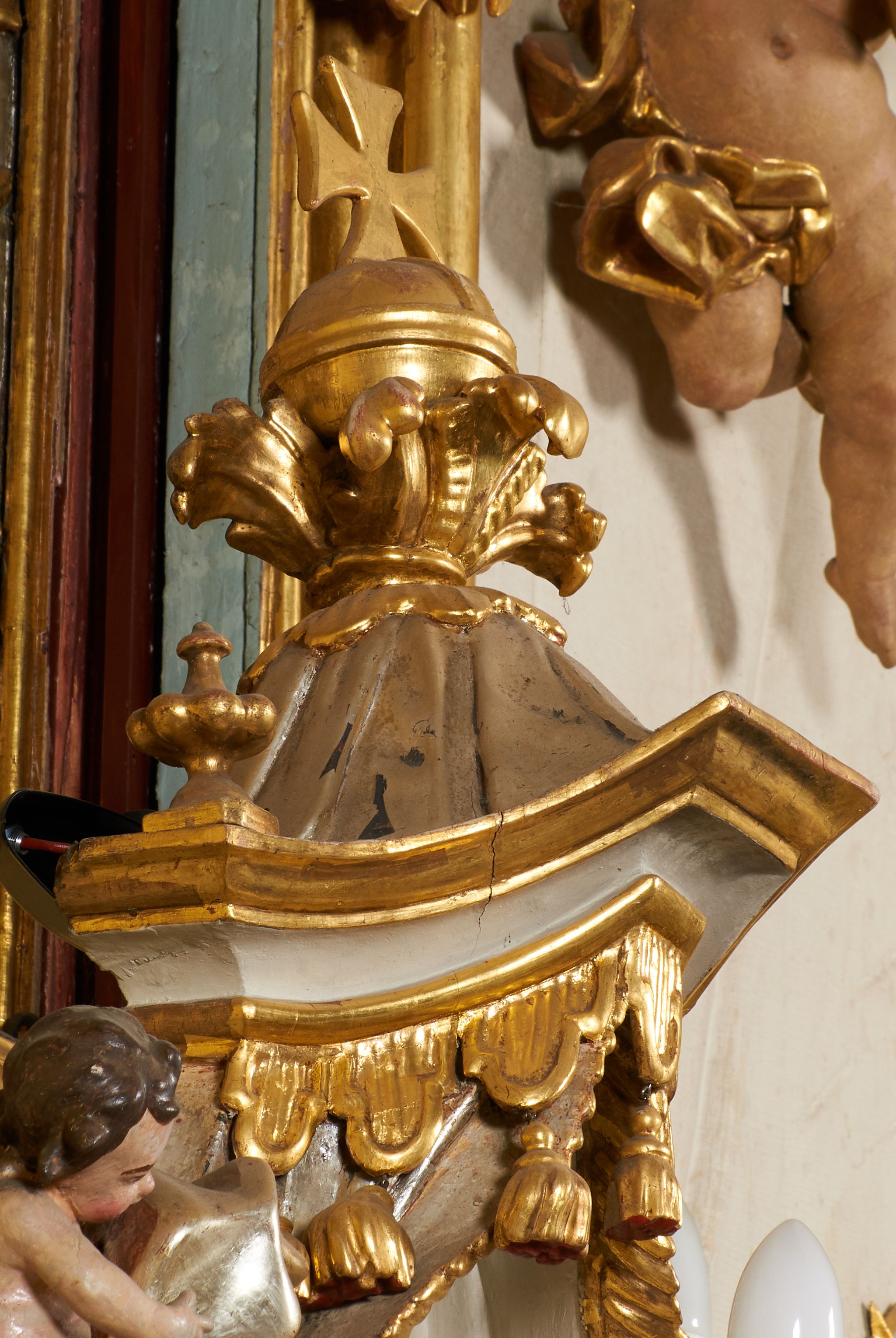 Tron wystawienia grabskiego tabernakulum otrzymał formę nawiązującą do niearchitektonicznego ołtarza głównego. Przed wymianą tabernakulum na wzmocnione, pierwotne drzwiczki dekorowane były niszą z konchą i figurką błogosławiącego Chrystusa, który tworzył ikonograficzną całość z postaciami ewangelistów na osiach bocznych.