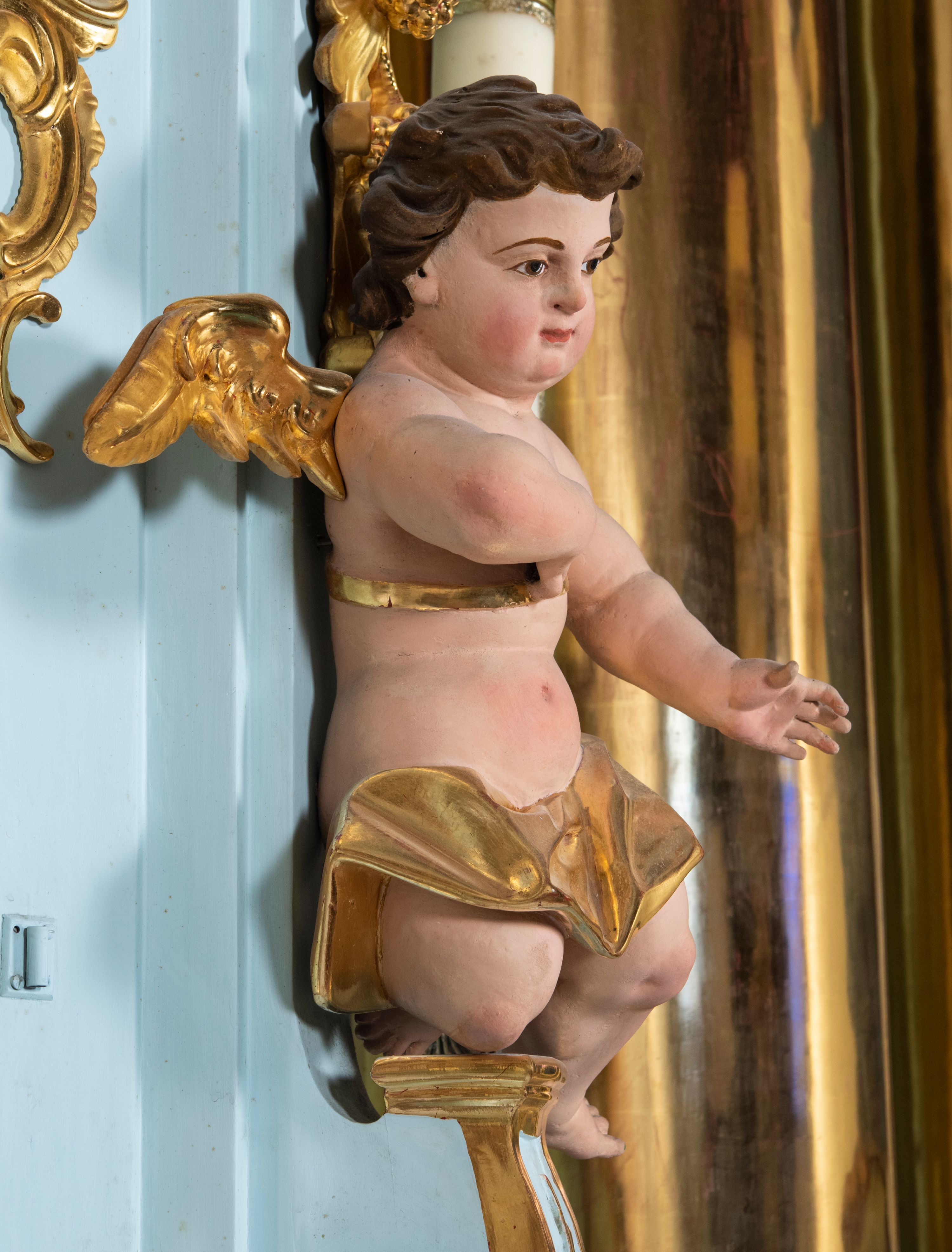 Tabernakulum pancerne, w formie drewnianej, prostopadłościennej skrzynki obitej blachą, o wypukłej ściance frontowej. Drzwiczki w formie kwadratu zamkniętego łukiem półkolistym, ujęte wzorzystym pasem, z trybowanym przedstawieniem baranka z krzyżem, leżącego na księdze, w glorii promienistej. W górnych narożach ścianki frontowej aplikowane elementy ornamentalne. Tabernakulum w drewnianej, architektonicznej obudowie, wpisane w cokół, na którym znajduje się tron wystawienia. Tron w formie niszy, ujęty dwiema parami zdwojonych pilastrów. Wewnętrza para wysunięta jest do przodu, a jej trzony dekorowane rocaille'm, kłosami zbóż, winogronami oraz główkami anielskimi przechodzą w spływy wolutowe, na których klęczą aniołki. Pilastry dźwigają belkowanie, wyłamane na ich osi, częściowo przerwane nad niszą środkową, z wyłamanym odcinkowo gzymsem, z podwieszoną tkaniną. Pilastry zewnętrzne ujęte wolutami spływającymi na wyłamane partie cokołu. Podstawa, pilastry i fryz dekorowane rocaille'm. Struktura polichromowana w kolorze błękitnym, ze złoconymi profilami i ornamentyką, tkanina srebrzona.