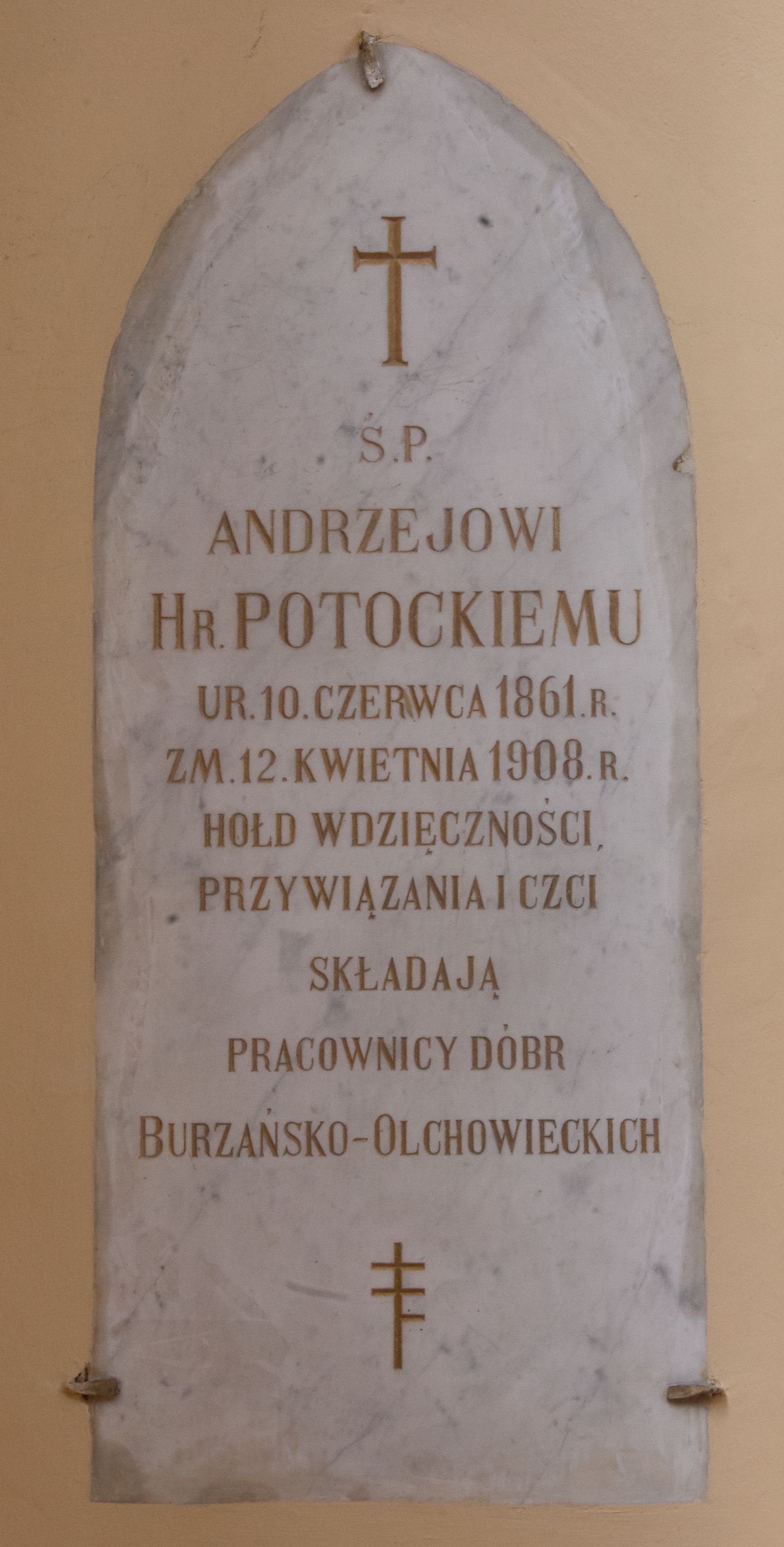 Tablica epitafijna dla upamiętnienia Andrzeja Potockiego, w formie wmurowanej w ścianę płyty kamiennej o kształcie prostokąta zamkniętego łukiem ostrym. W polu tablicy inskrypcja złoconą majuskułą, w języku polskim: Ś. P. / ANDRZEJOWI / HR. POTOCKIEMU / UR.10. CZERWCA 1861. R. / ZM. 12. KWIETNIA 1908. R. / HOŁD WDZIĘCZNOŚCI, / PRZYWIĄZANIA I CZCI / SKŁADAJĄ / PRACOWNICY DÓBR / BURZAŃSKO-OLCHOWIECKICH. Ponad inskrypcją znajduje się wykuty łaciński krzyż, poniżej inskrypcji herb Potockich: Pilawa.