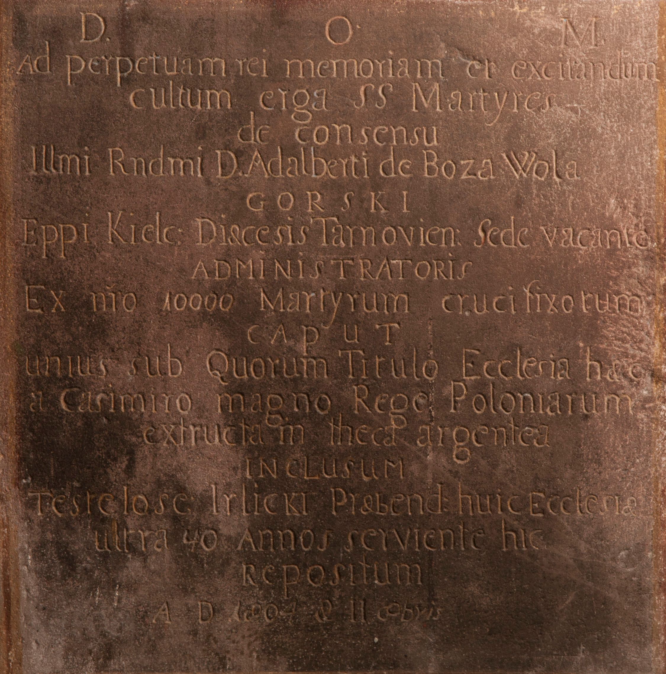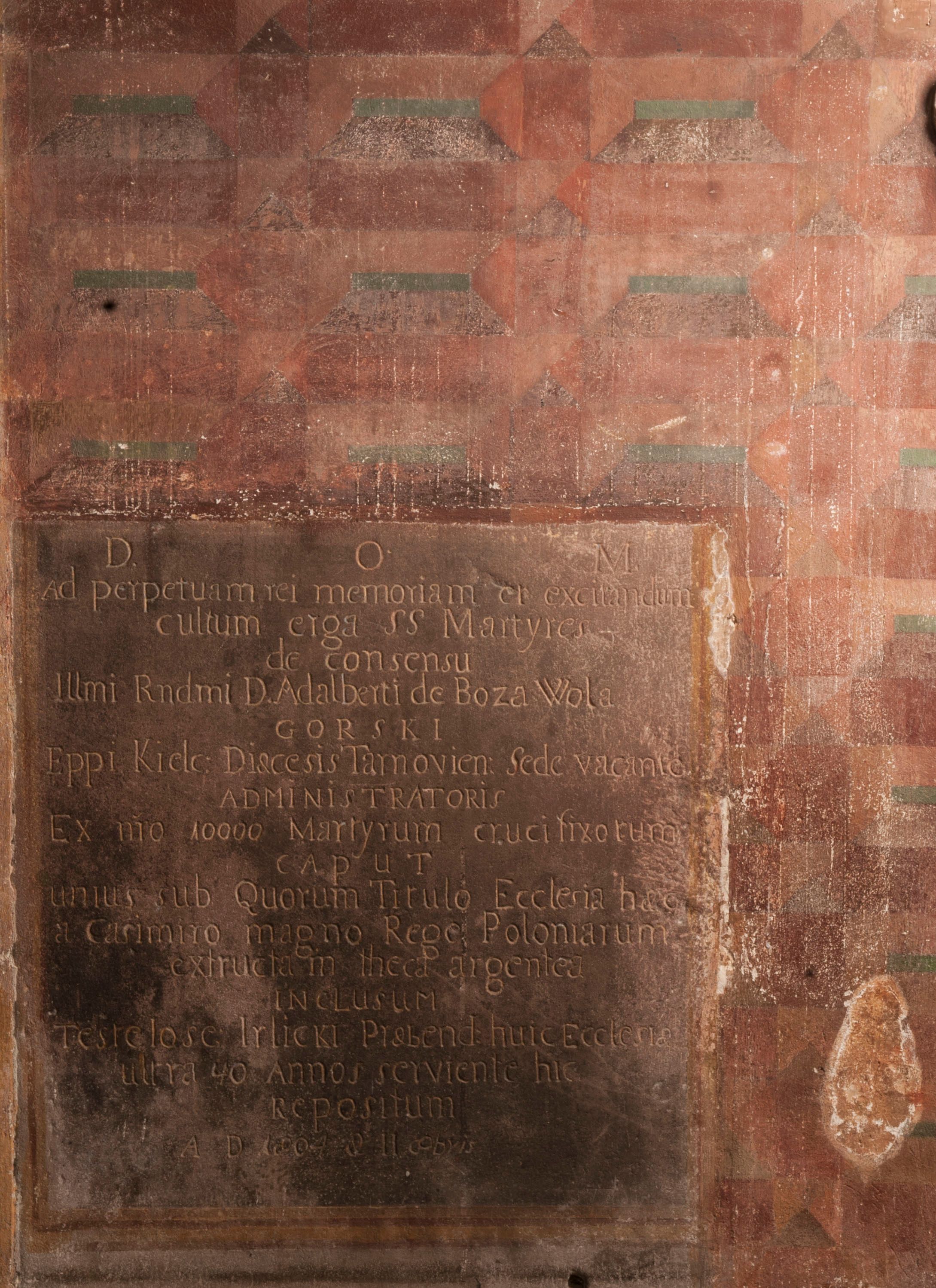 "D[eo]O[ptimo]M[aximo] / Ad perpetuam rei mamoriam et excitandium / cultum erga SS Martyres - / de consensu / Ill[ustrissi]mi R[evere]nd[issi]mi D[omini] Adalberti de Boza Wola / GORSKI/ Eppi[scopi] Kielc[ensi]: Diaecesis Tarnovien[sis]: Sede vacante / ADMINISTRATORIS / Ex n[ume]ro 10000 Martyrum crucifixorum / caput / unius sub Quorum Titulo Ecclesia haec / a Casimiro magno Rege Poloniarum / extructam theca argentea / inclusum / testelose Irlicki Praebend[atur] hic Ecclesiae / ultra 40 Annos serviente hic / Repositum / A[nno] D[omini] 1804 & II 8bris"