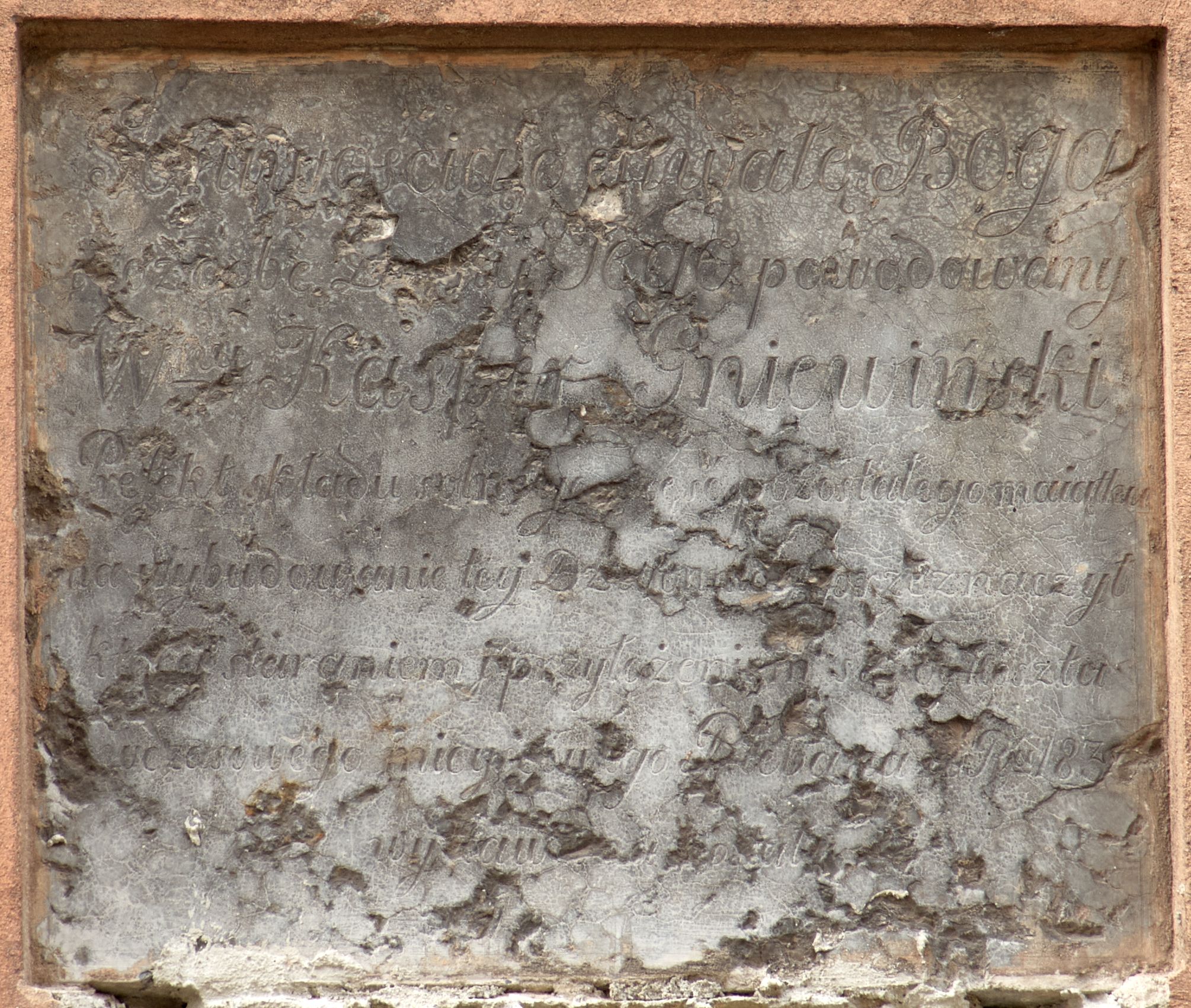 Płyta w formie leżącego prostokąta. W polu inskrypcja „Go[rl]iwoscią o chwałę Boga / i ozdobe Domu Jego powodowany / W[..] Kasper Gniewiński / Prefekt składu solnego [cz]ęść pozostałego maiątku / na wybudowanie tey Dzwon[nicy] przeznaczył / które staraniem i przyłożeniem s[...] koszta / [...]czasowego mieyscowego Plebana R(ok)u 183[6] / wy[b]aw [...]”.