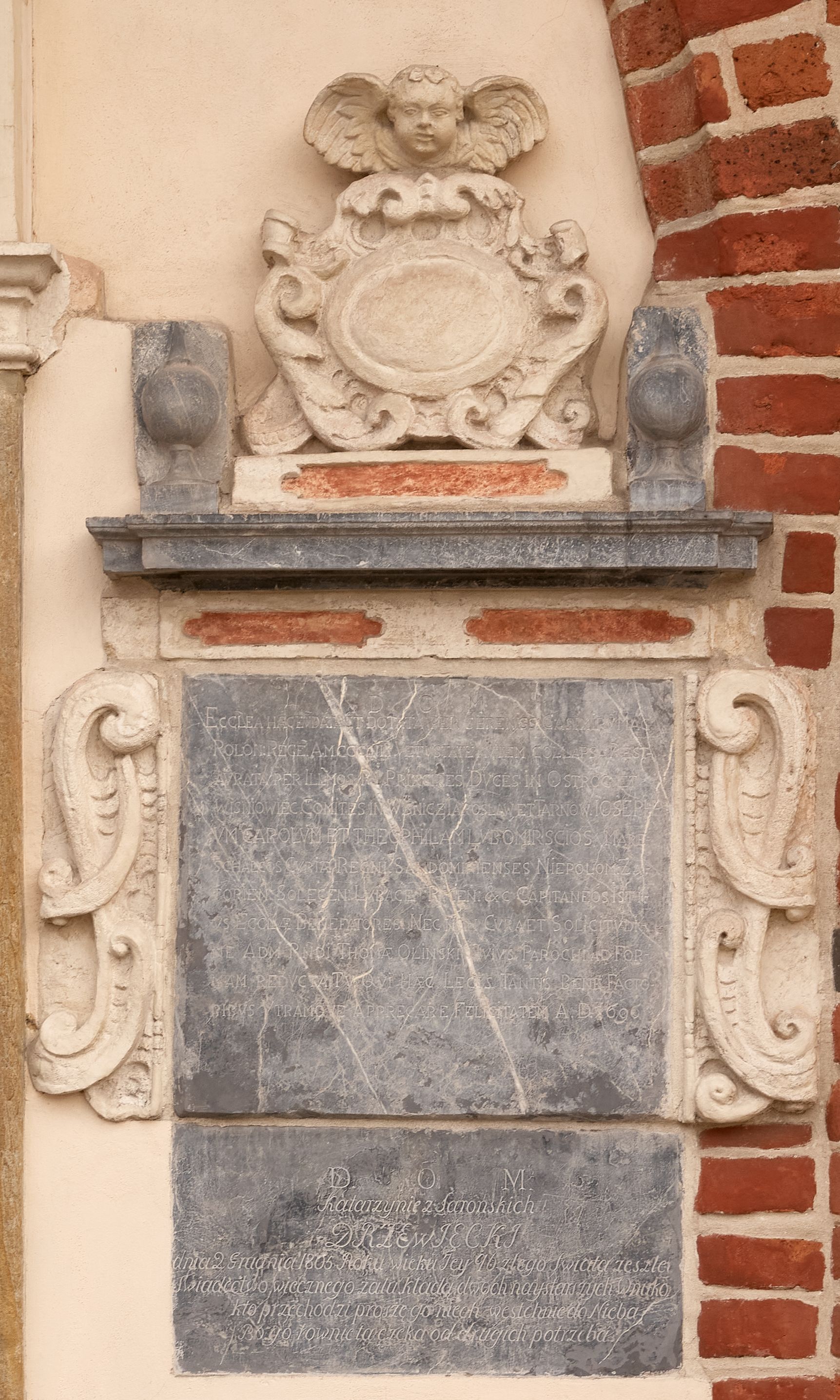 Tablica z wapienia dębnickiego w formie leżącego prostokąta. Flankowana uszakami z wapienia pińczowskiego utworzonymi z ornamentu małżowinowo-chrząstkowego. Wzdłuż górnej krawędzi płyty cokolik z wapienia pińczowskiego z dwiema płycinami polichromowanymi na czerwono. Ponad nim parapet z wapienia dębnickiego w formie gzymsu z dwoma wazonami, na nim mniejszy cokolik z wapienia pińczowskiego z płyciną polichromowaną na czerwono z kartuszem utworzonym z wolut i akantu, zwieńczony uskrzydloną główką anielską. W polu tablicy inskrypcja „D(EO) O(PTIMO) M(AXIMO) / ECCLE(SI)A HAEC EVDATA ET DOTATA PER SERENISS(IMO) CASIMIRVM AC / POLON(IAE) REGE(M) A(NNO) MCCCLIIII VETVSTATE AVTEM COLLAPSA REST/AVRATA PER ILL(USTRISSI)MOS RI PRINCIPES DVCES IN OSTROG ET / WISNIOWIEC COMITES IN WISNICZ IAROSŁAW ET TARNOW IOSEPH/VM CAROLVM ET THEOPHILAM LVBOMIRSCIOS MARE / SCHALCOS CVRIAE REGNI SANDOMIRIENSES NIEPOŁOM(ICENSES) ZA/TORIEN(SES) SOLECEN(SES) LUBACEN(SES) RICEN(SES) & C(ETERA) CAPITANEOS ISTI/VS ECCL(ESI)AE BENEFACTORES NEC NON CVRAET SOLICITVDI/NE ADM(INISTARTORUM) R(EVERE)NDI(SSIMUS) THOMAE OLINSKI [C]VIVS PAROCHI AD FOR/MAM REDVCTATV QVI HAEC LECIS TANTIS BENEFACTO/RIBVS V TRAMQVE APPRECERE FELICITATEM A(NNO) D(OMINI) 1696”.