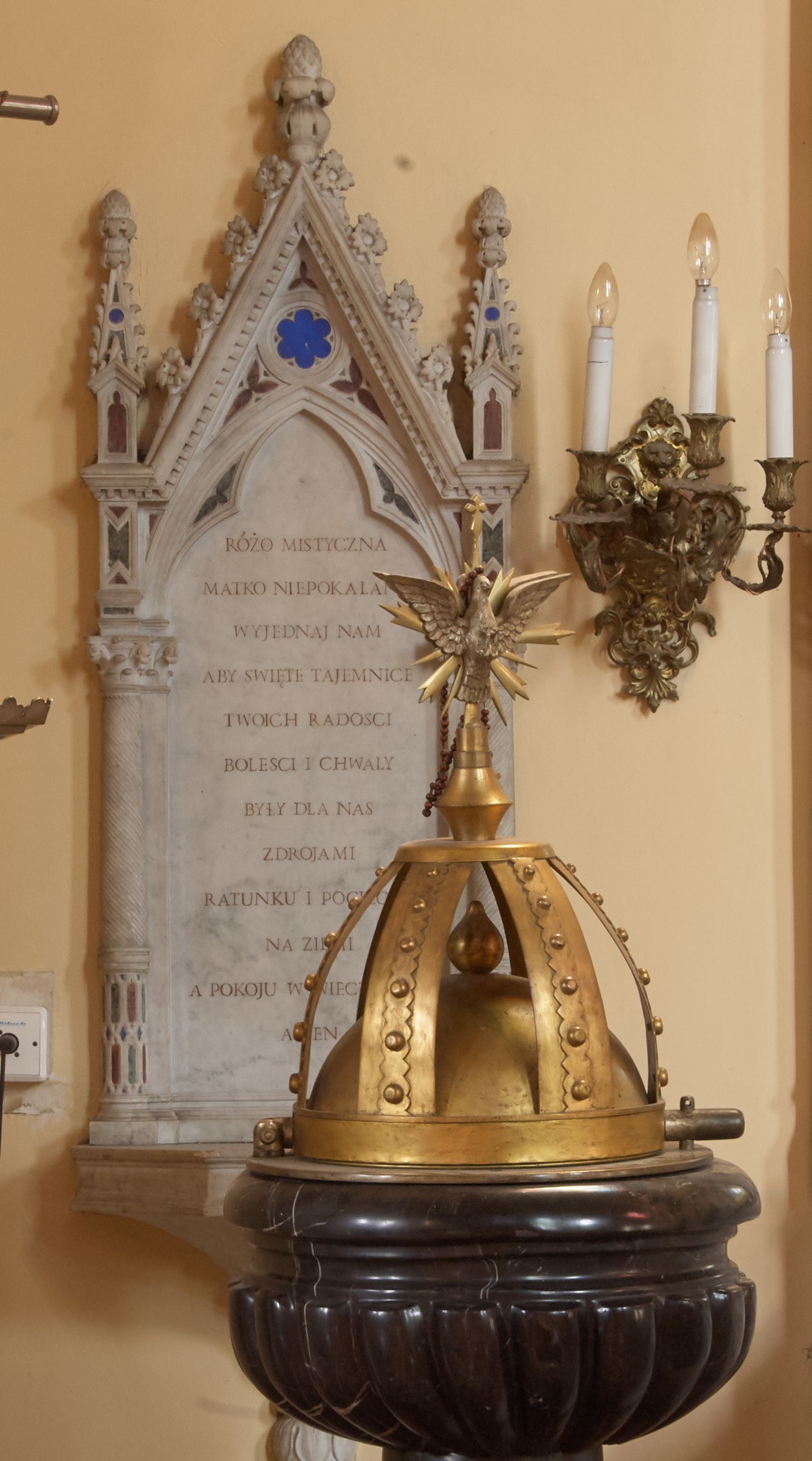 Tablica z inskrypcją upamiętniająca fundację w 1872 roku ołtarza Matki Boskiej Różańcowej, w ozdobnym neogotyckim obramieniu rzeźbionym z piaskowca, z użyciem barwnych marmurów.