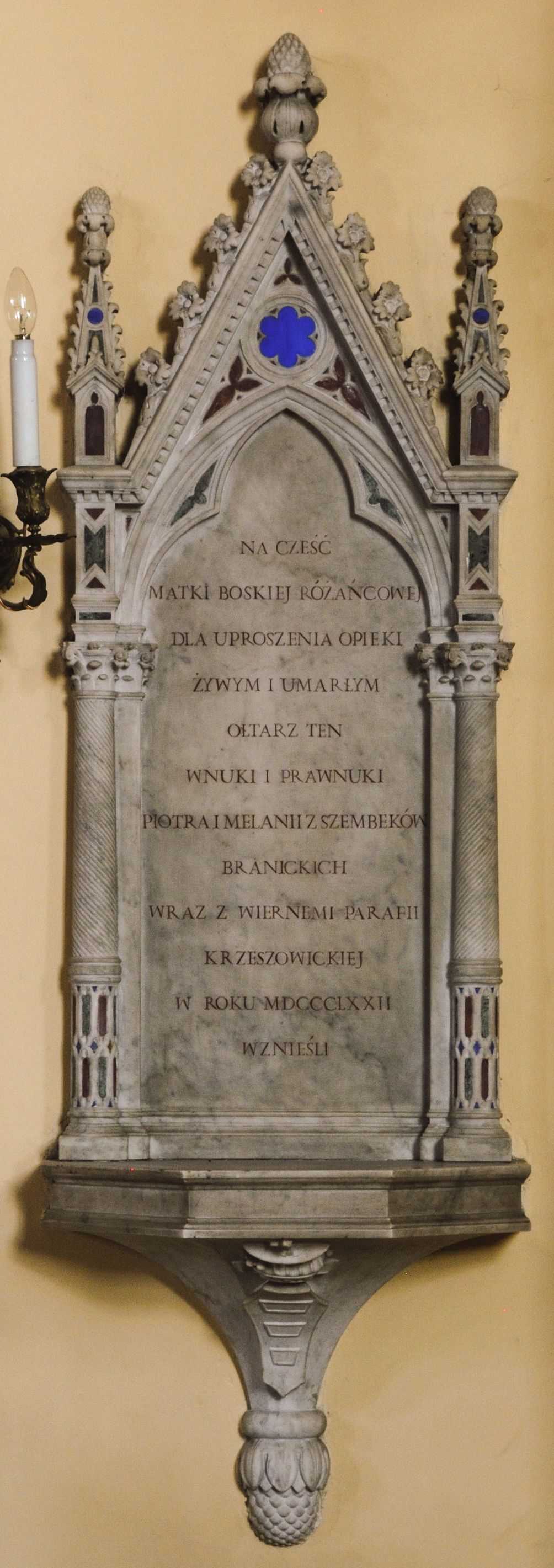 Tablica pamiątkowa w obramieniu w formie neogotyckiej aedikuli ustawionej na konsoli z herbem Branickich. Aedikula jednoosiowa, ujęta kolumnami o kompozytowych kapitelach, ustawionymi na tle pilastrów. Trzony kolumn dołem inkrustowane kolorowym marmurem, wyżej kanelowane. Na kolumnach wsparta trójkątna wimperga zdobiona żabkami i zwieńczona okazałym kwiatonem, flankowana pinaklami. W polu wimpergi dekoracja maswerkowa inkrustowana barwnym marmurem. Na tablicy kuta inskrypcja majuskułowa w języku polskimi: NA CZEŚĆ / MATKI BOSKIEJ / RÓŻAŃCOWEJ / DLA UPROSZENIA OPIEKI / ŻYWYM I UMARŁYM / OŁTARZ TEN / WNUKI I PRAWNUKI / PIOTRA I MELANII / Z SZEMBEKÓW / BRANICKICH / WRAZ Z WIERNEMI PARAFII / KRZESZOWICKIEJ / W ROKU MDCCCLXXII / WZNIEŚLI.